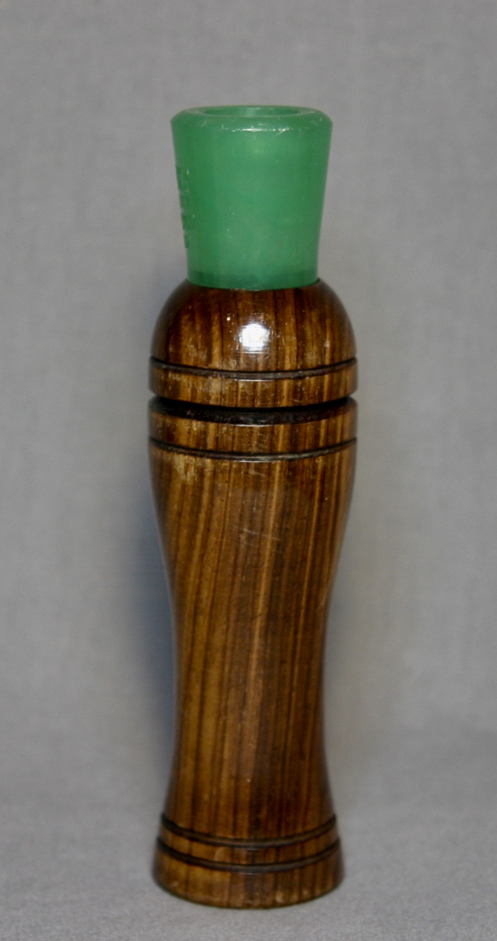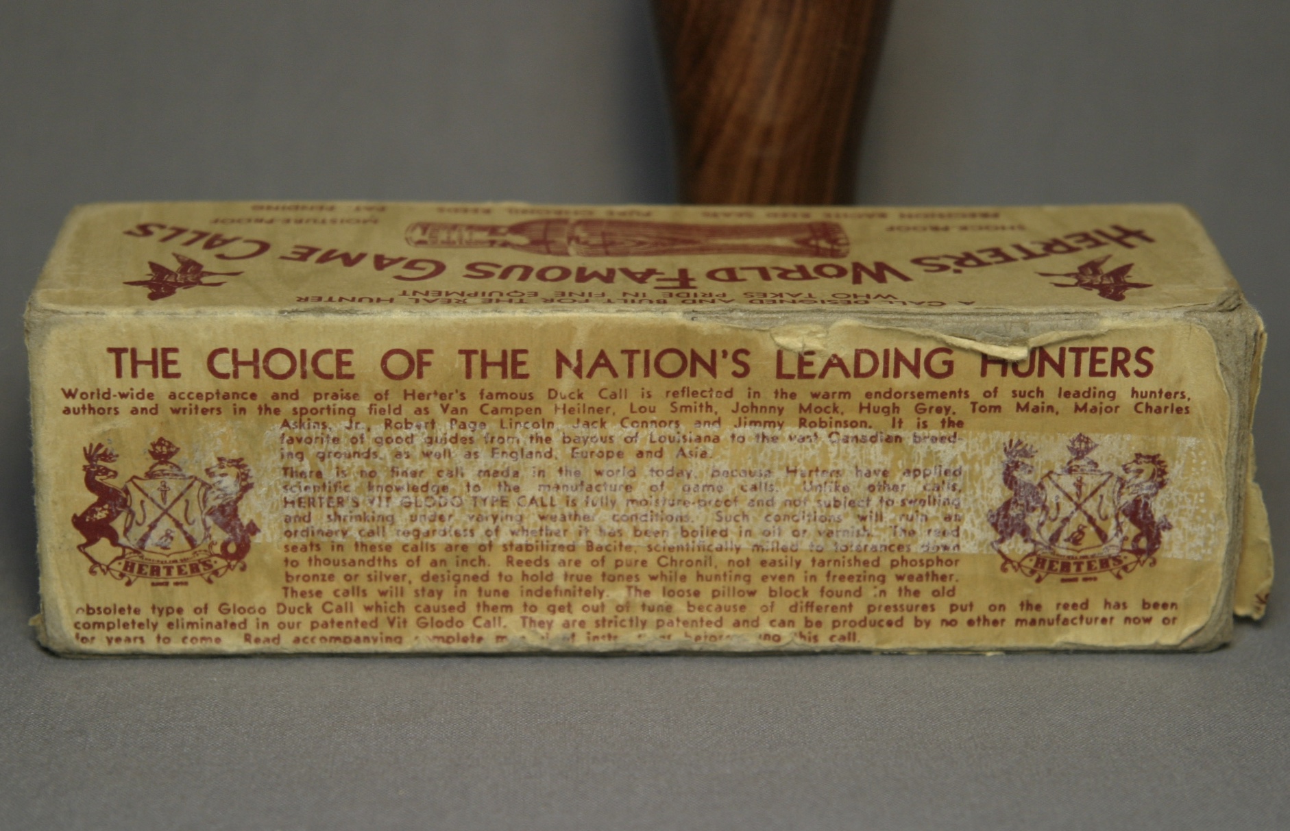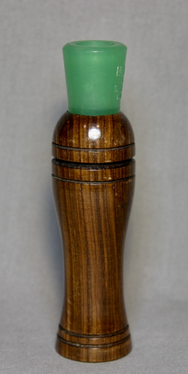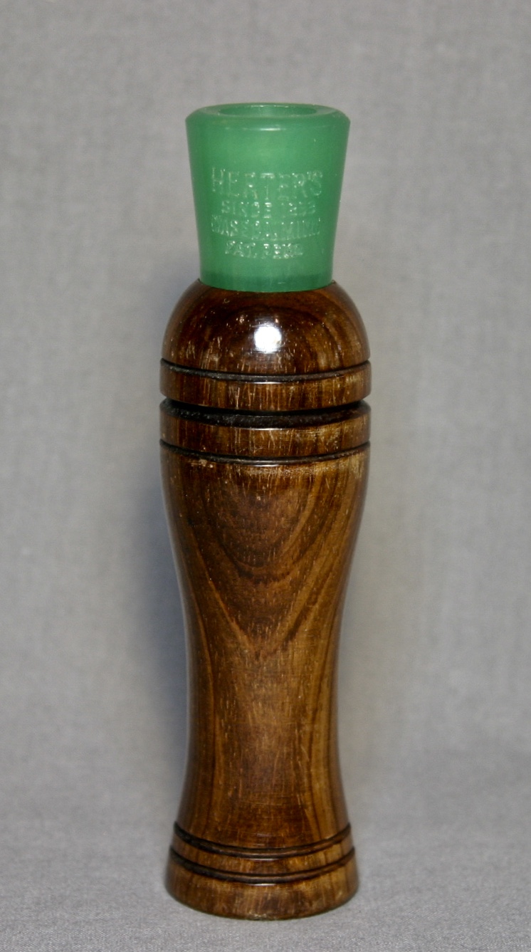 This is a Herter’s call with it’s original box and paperwork. The call is walnut with a lacquer finish, the stopper is green plastic and has a metal reed.
