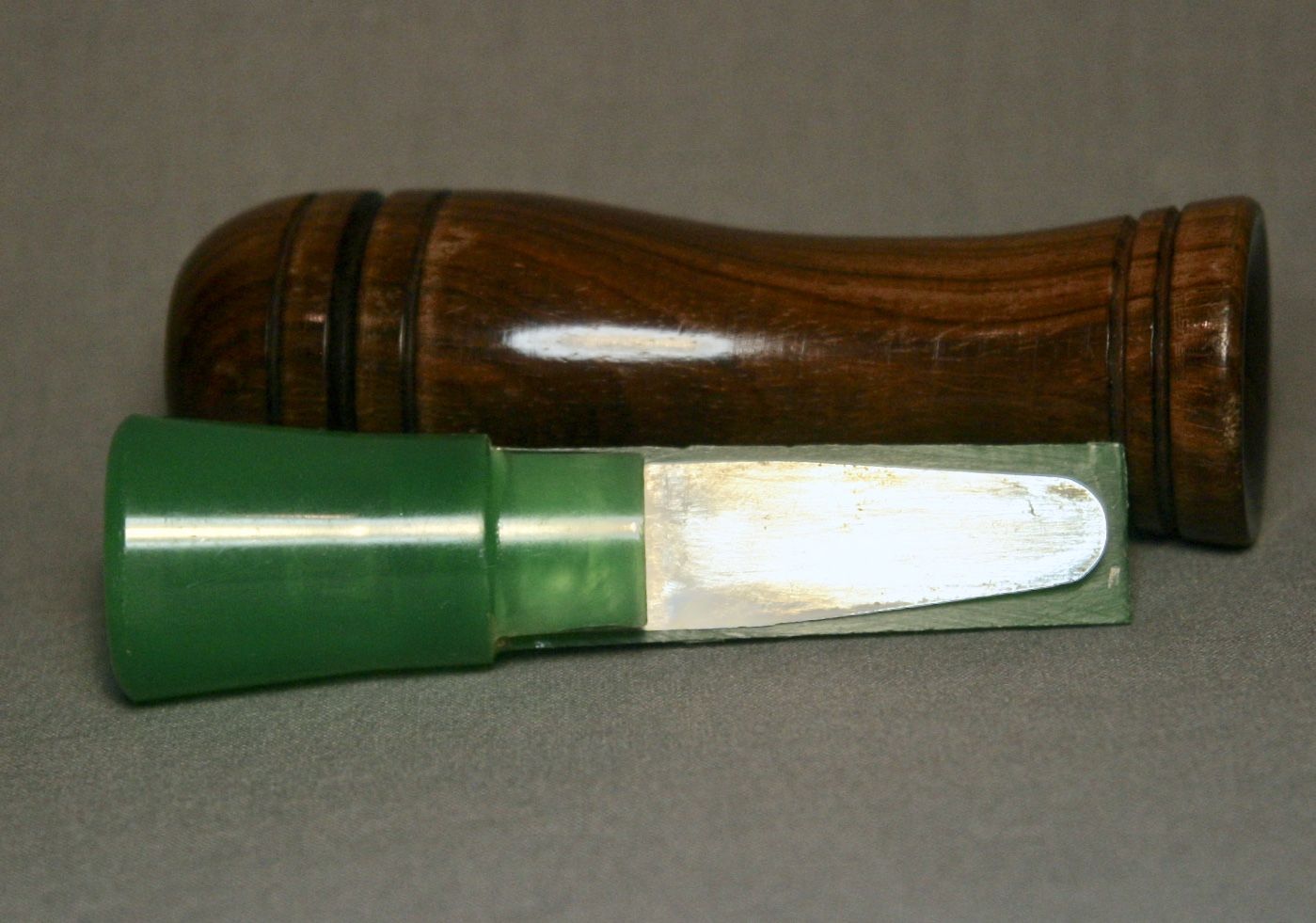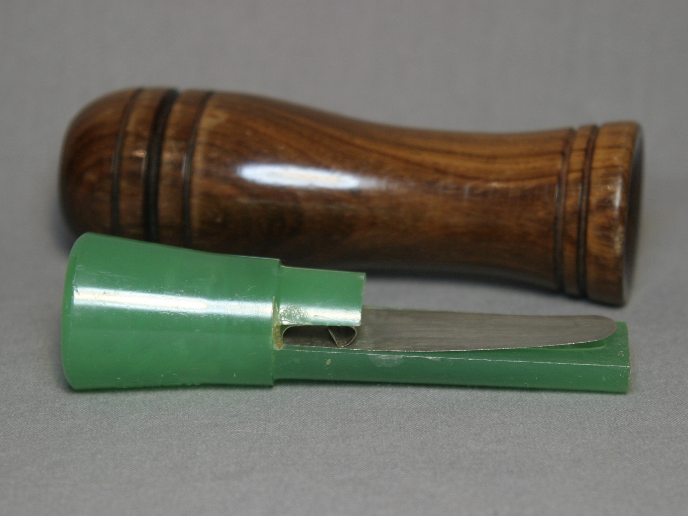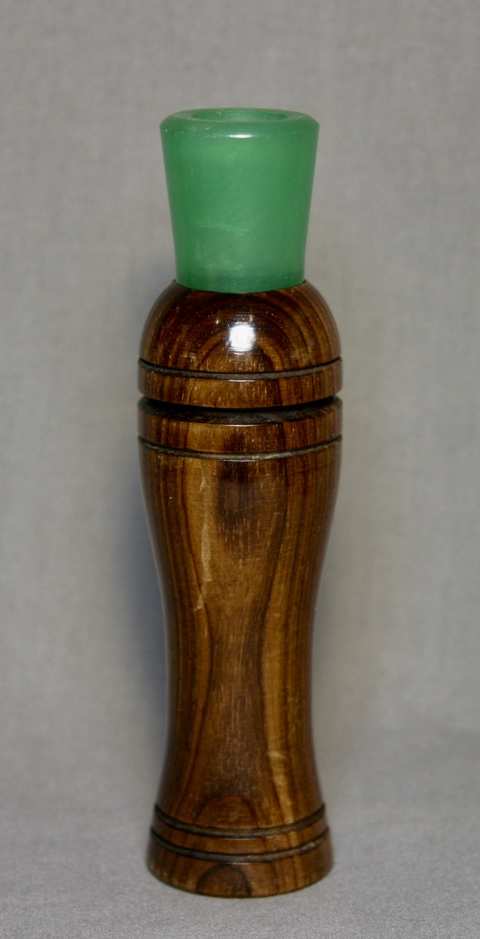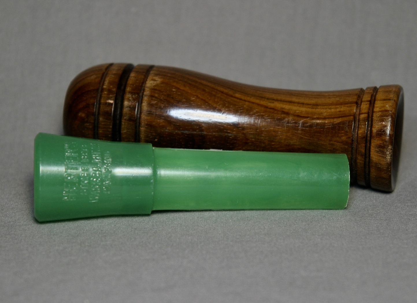This is a Herter’s call with it’s original box and paperwork. The call is walnut with a lacquer finish, the stopper is green plastic and has a metal reed.