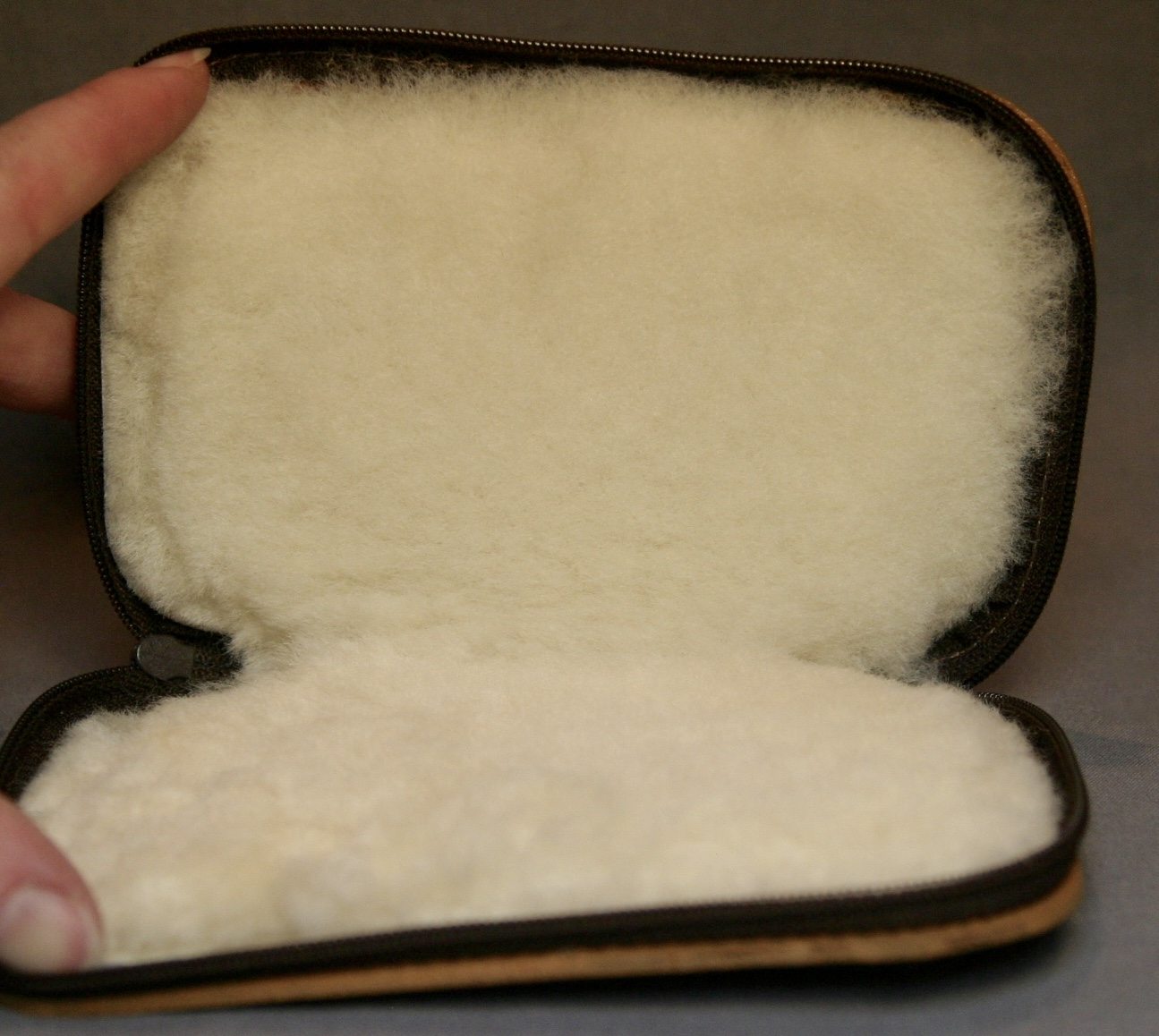 An incredibly nice, like-new, fly wallet from House Of Hardy, stamped in gold on the wallet. The leather is sturdy and the zipper is smooth. It’s lined with lamb’s wool.