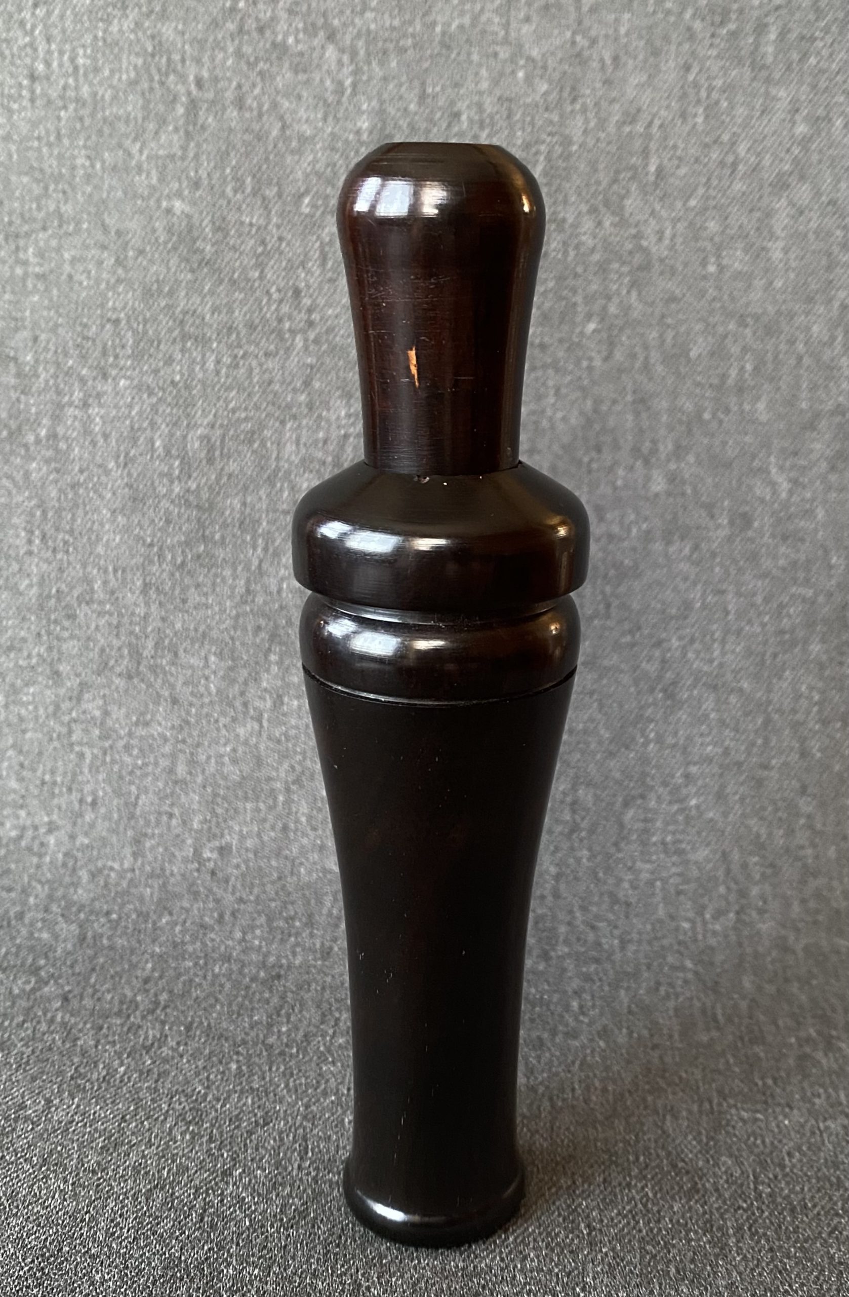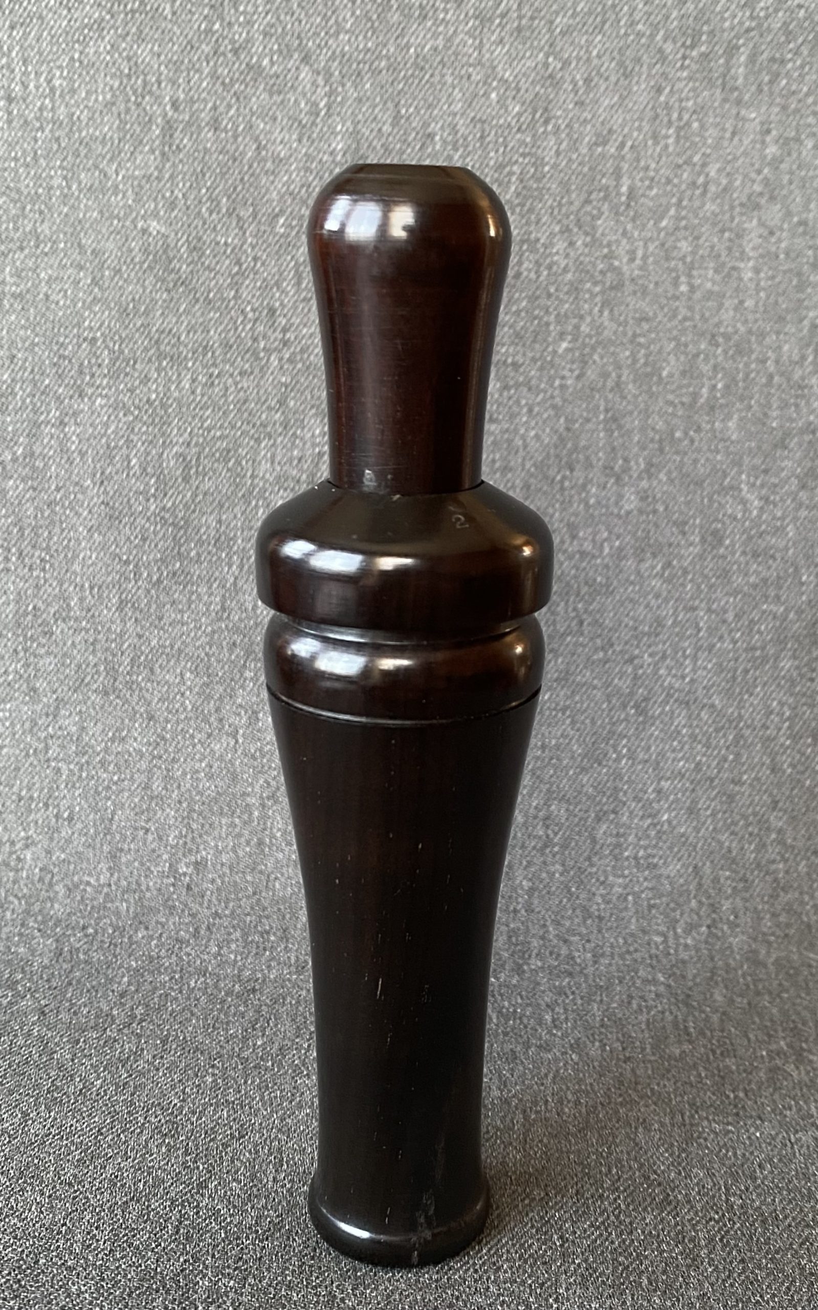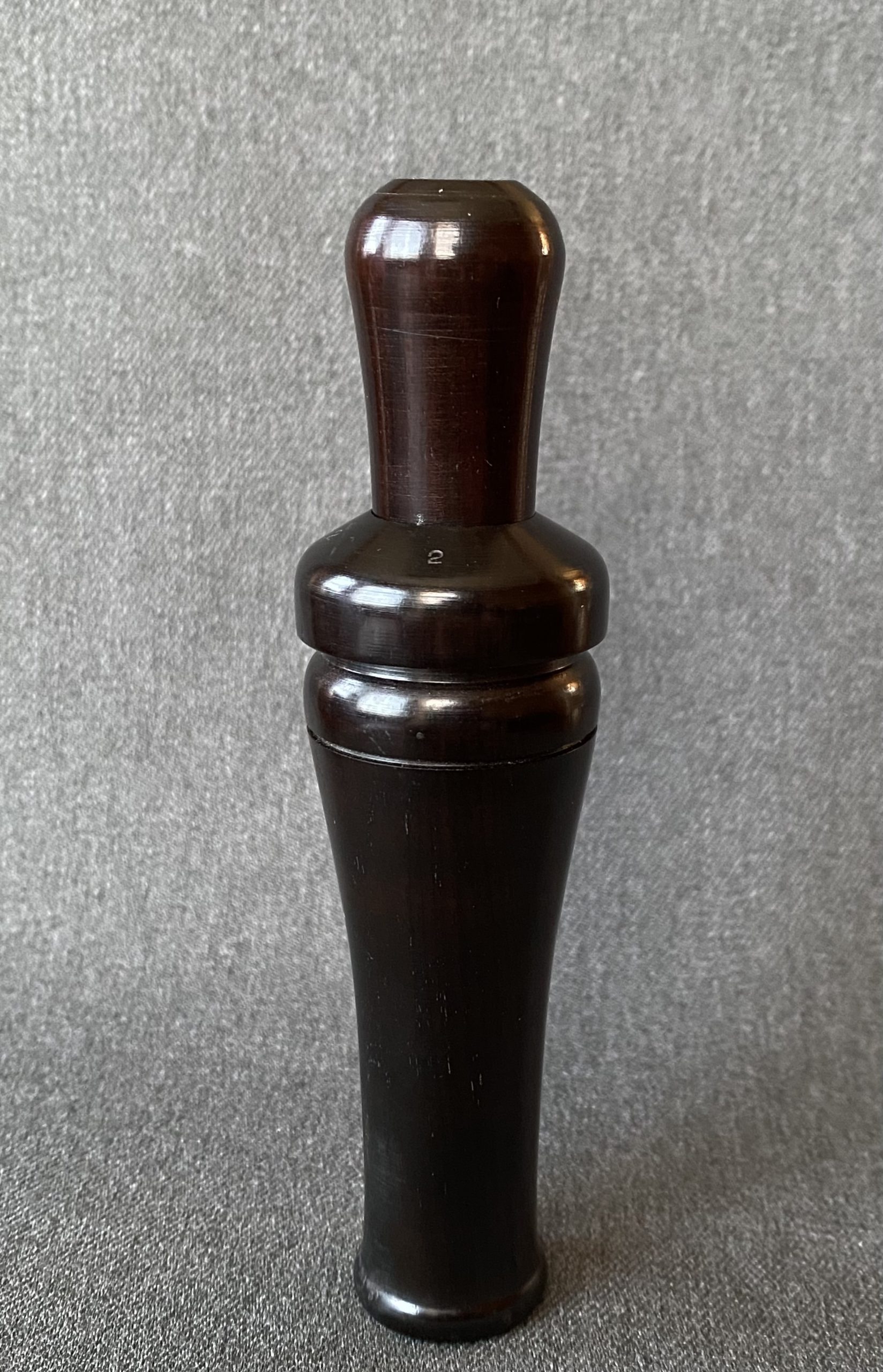 This is really nice New York call from E.V. Iverson. The call is turned from African Blackwood. The stopper is stamped 6YO indicating this is an early call from the late 1940s, and 2 on the collar.