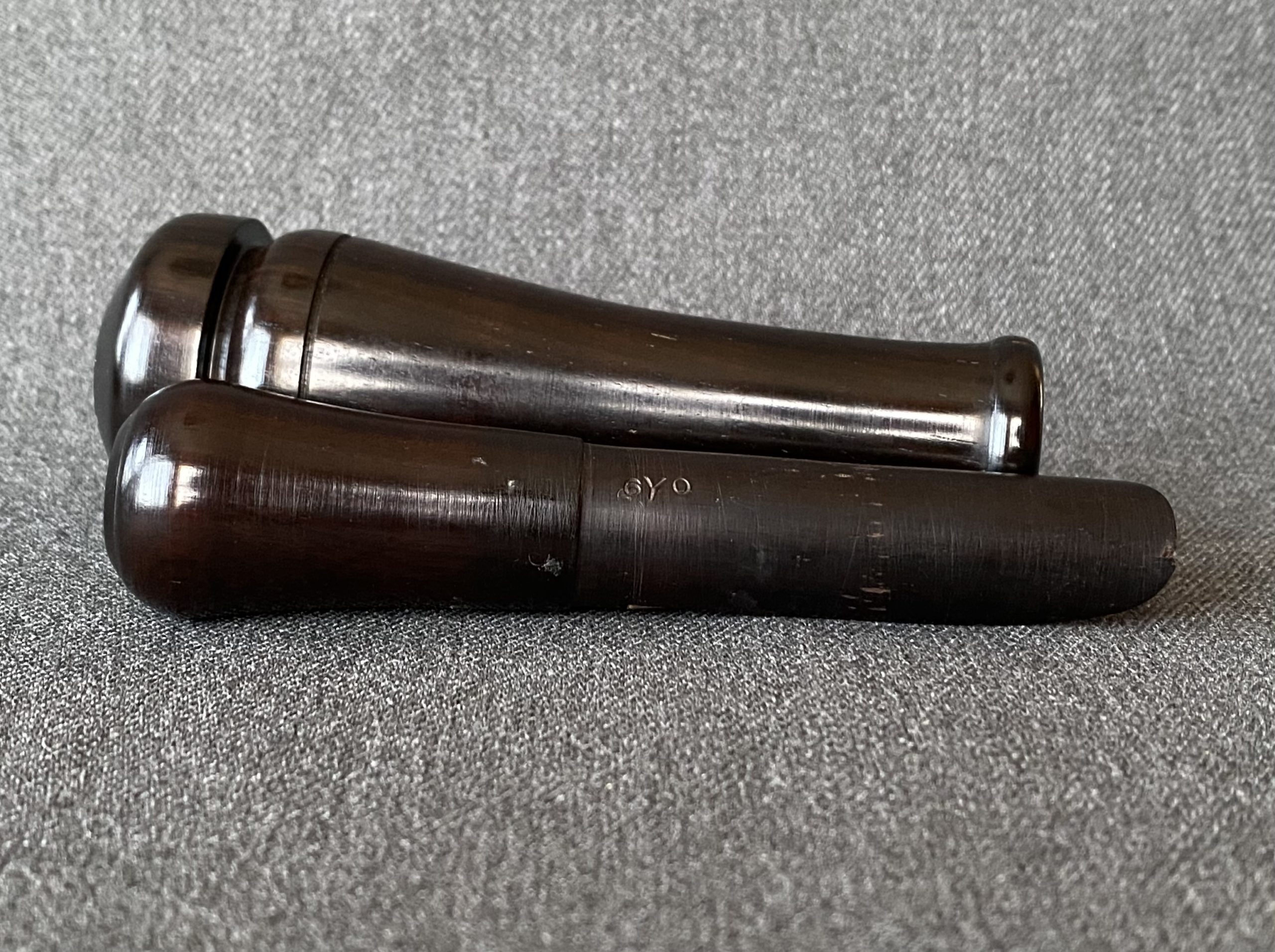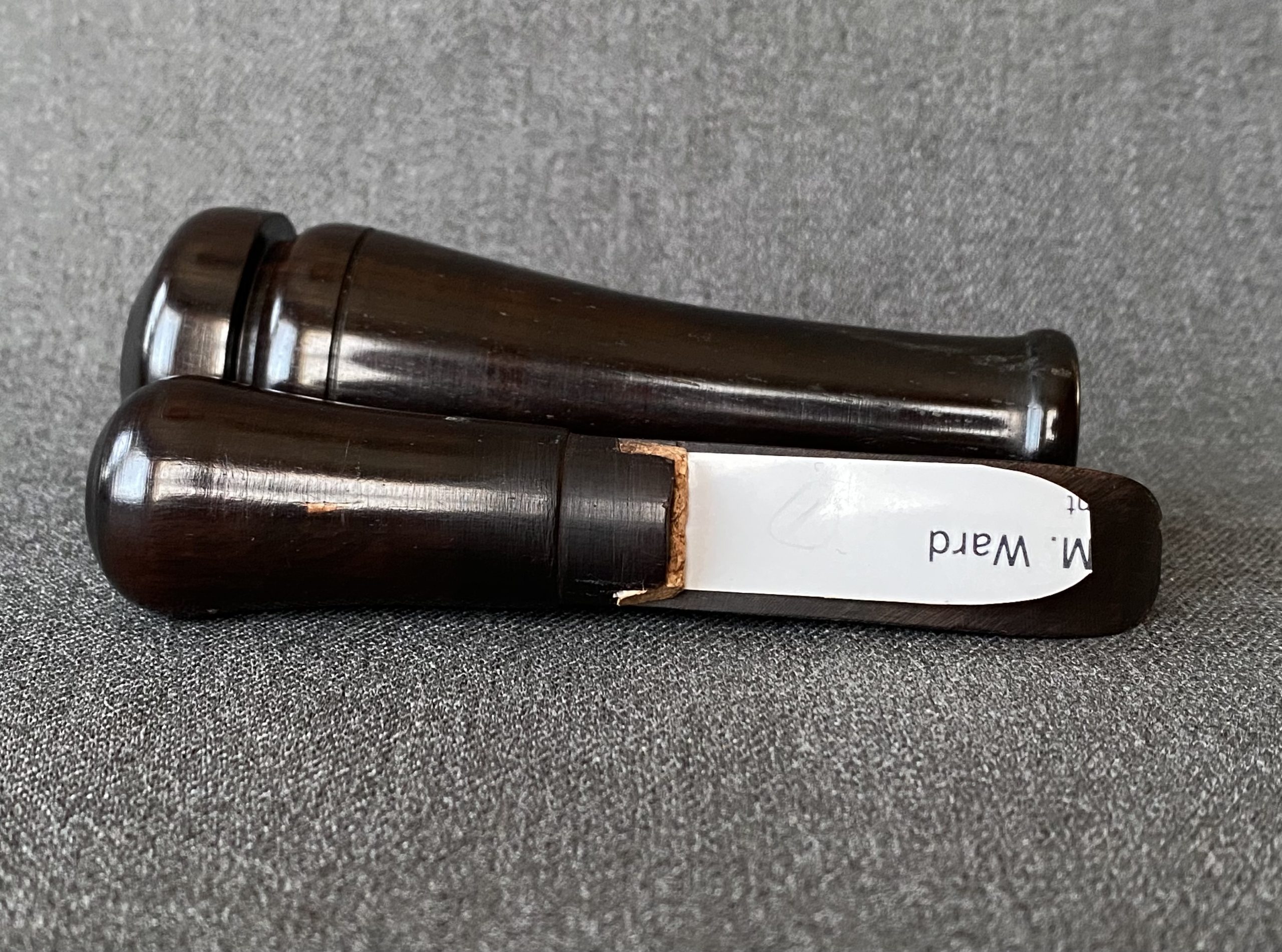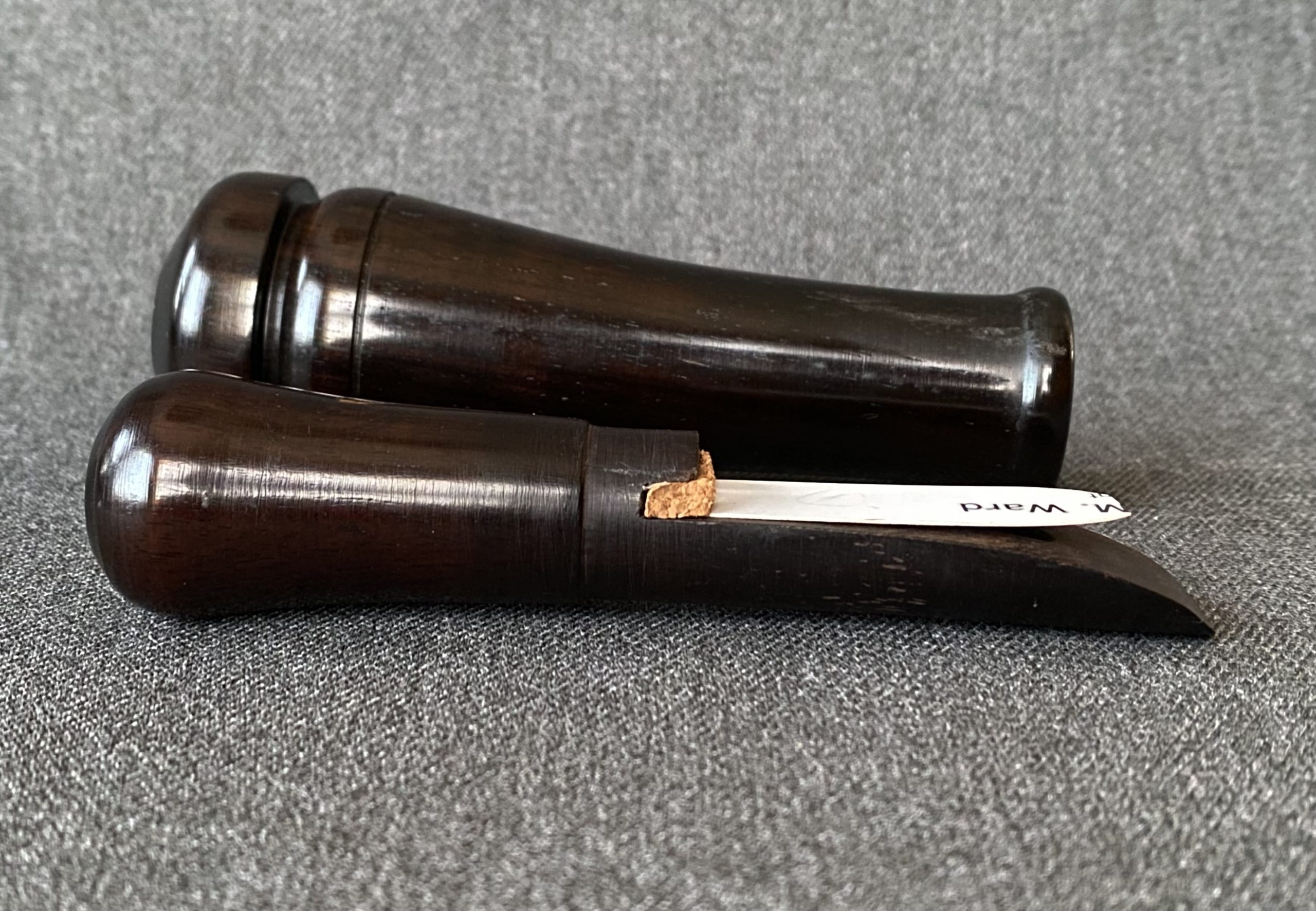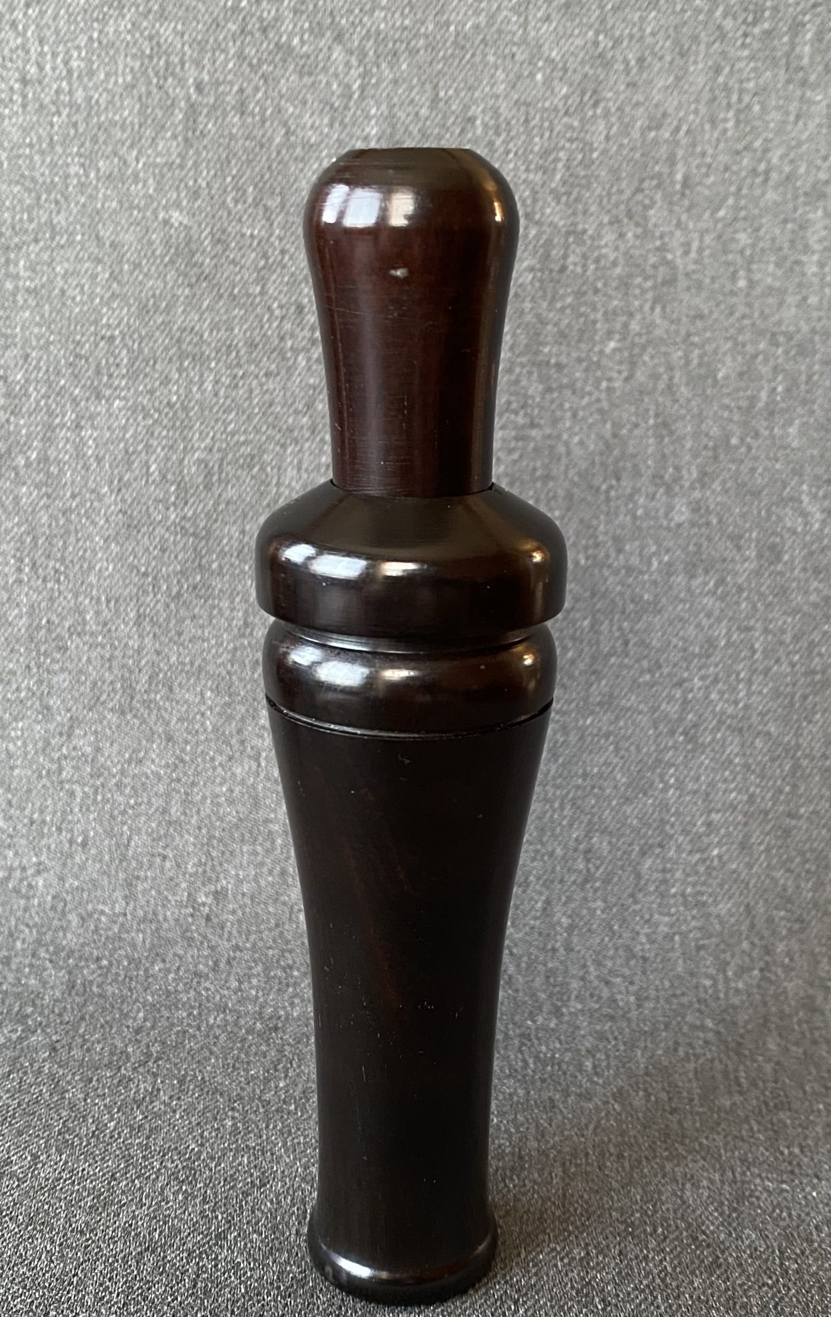 This is really nice New York call from E.V. Iverson. The call is turned from African Blackwood. The stopper is stamped 6YO indicating this is an early call from the late 1940s, and 2 on the collar.