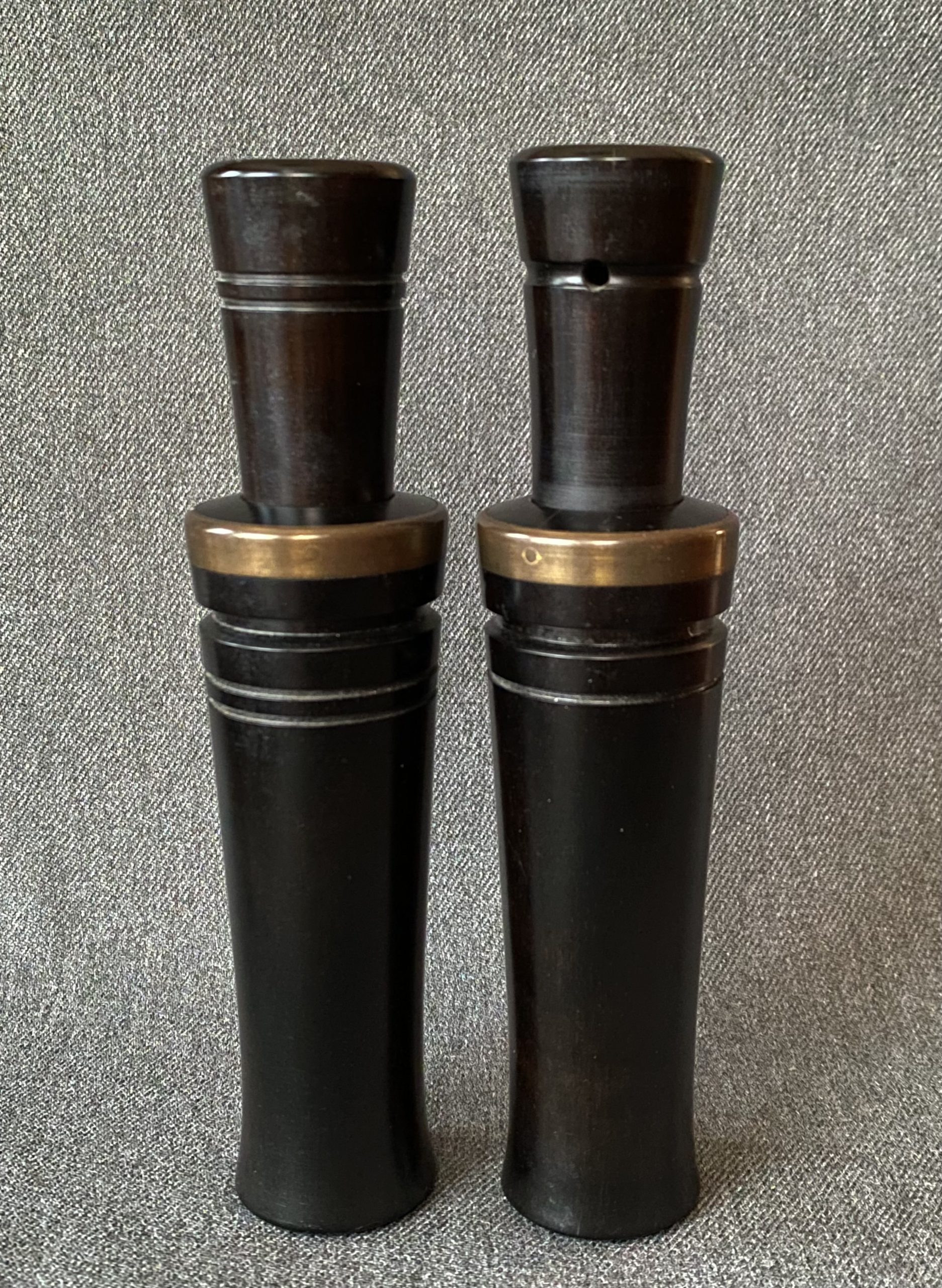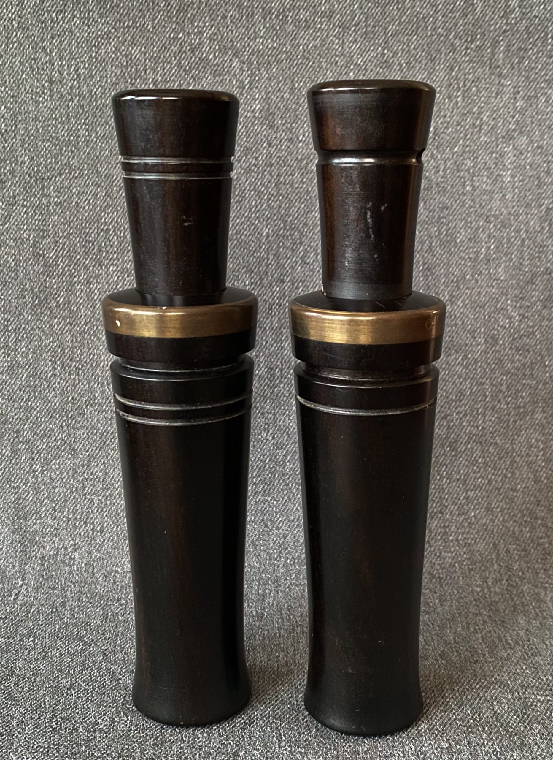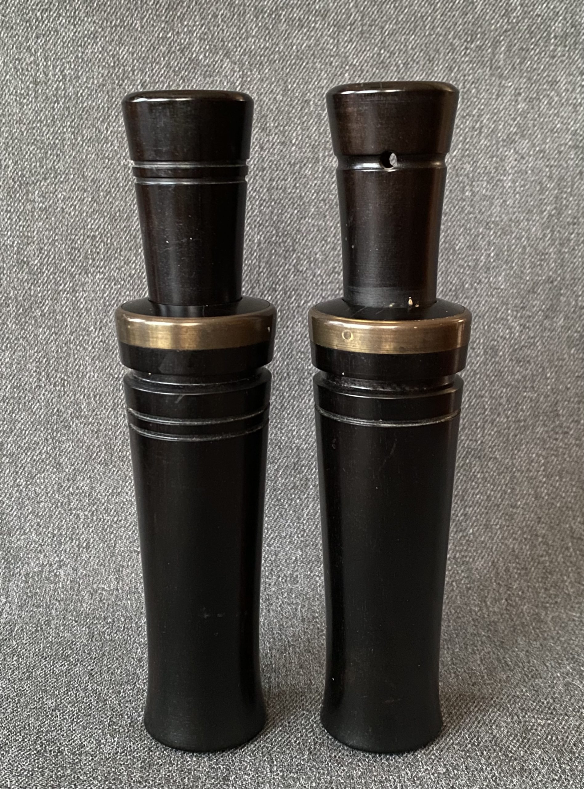 This is a great pair of calls by EV Iverson from the early 1950s. They are Arkansas and Louisiana style duck and goose calls. They are both in excellent condition, although the stopper is stuck in one call. Rare gold band at the top of the barrel.