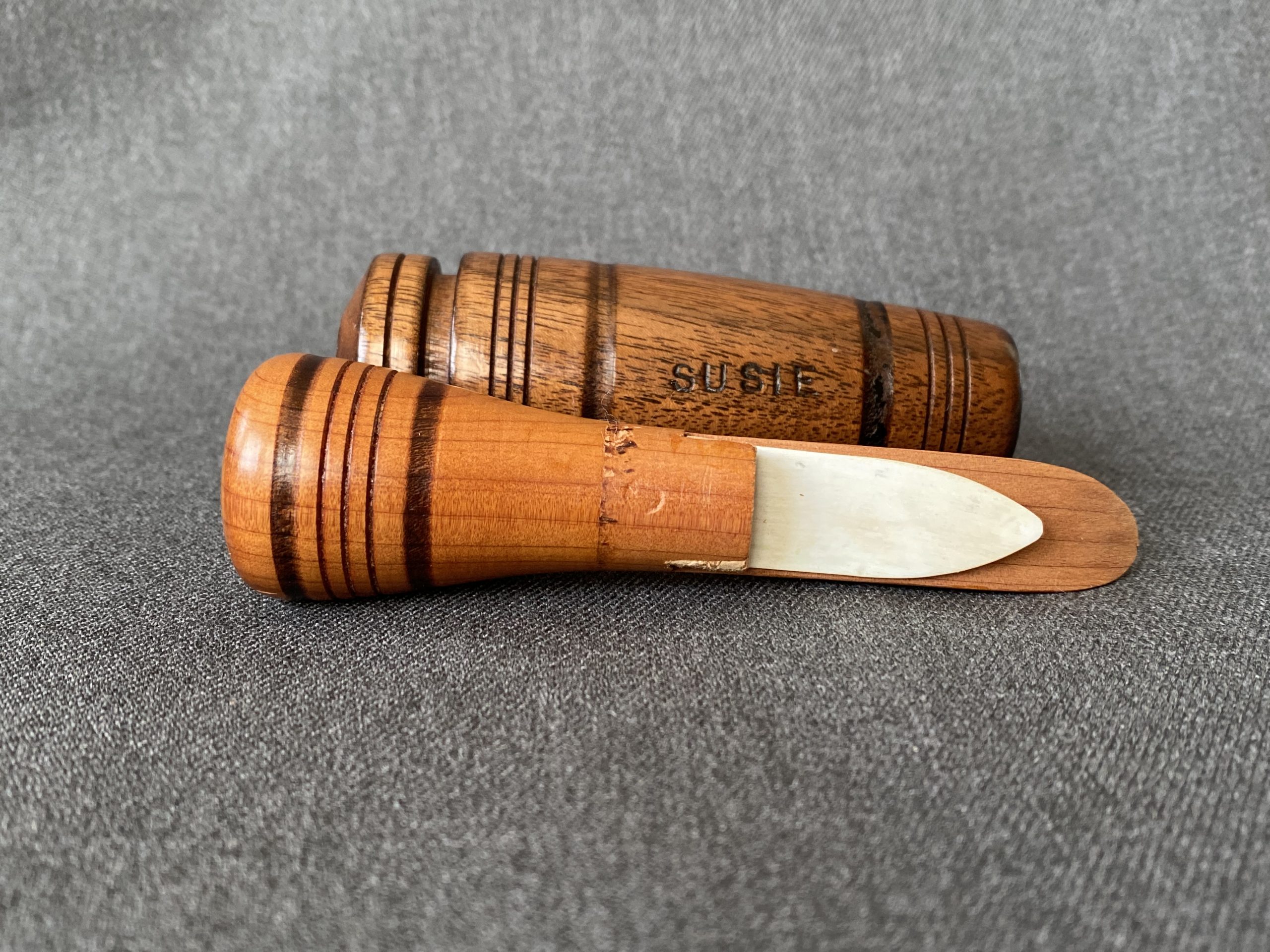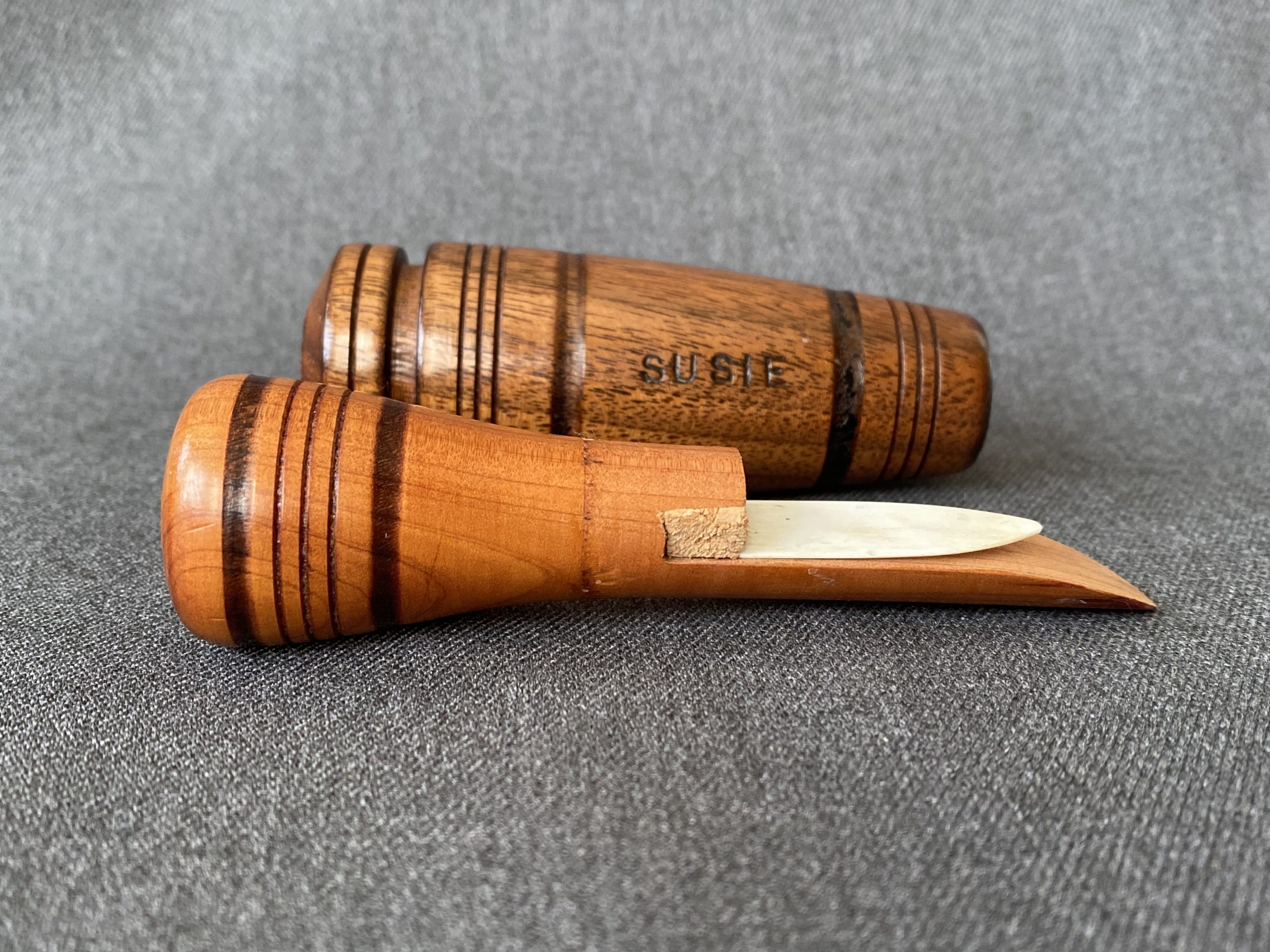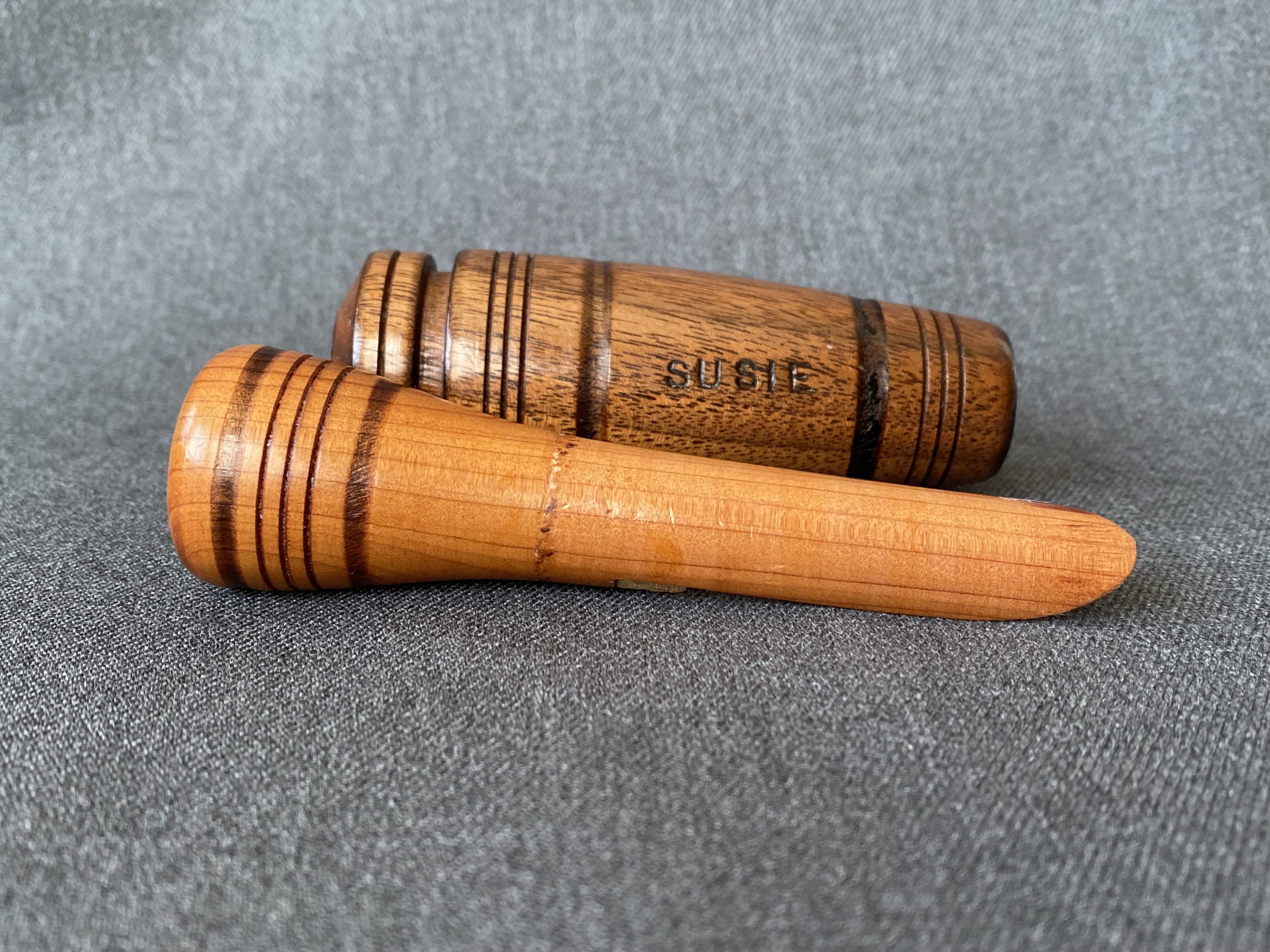 This is a nice, small, turned duck call from J.C. Keys. The call is Arkansas style with a white plastic reed. Susie is stamped into the barrel.