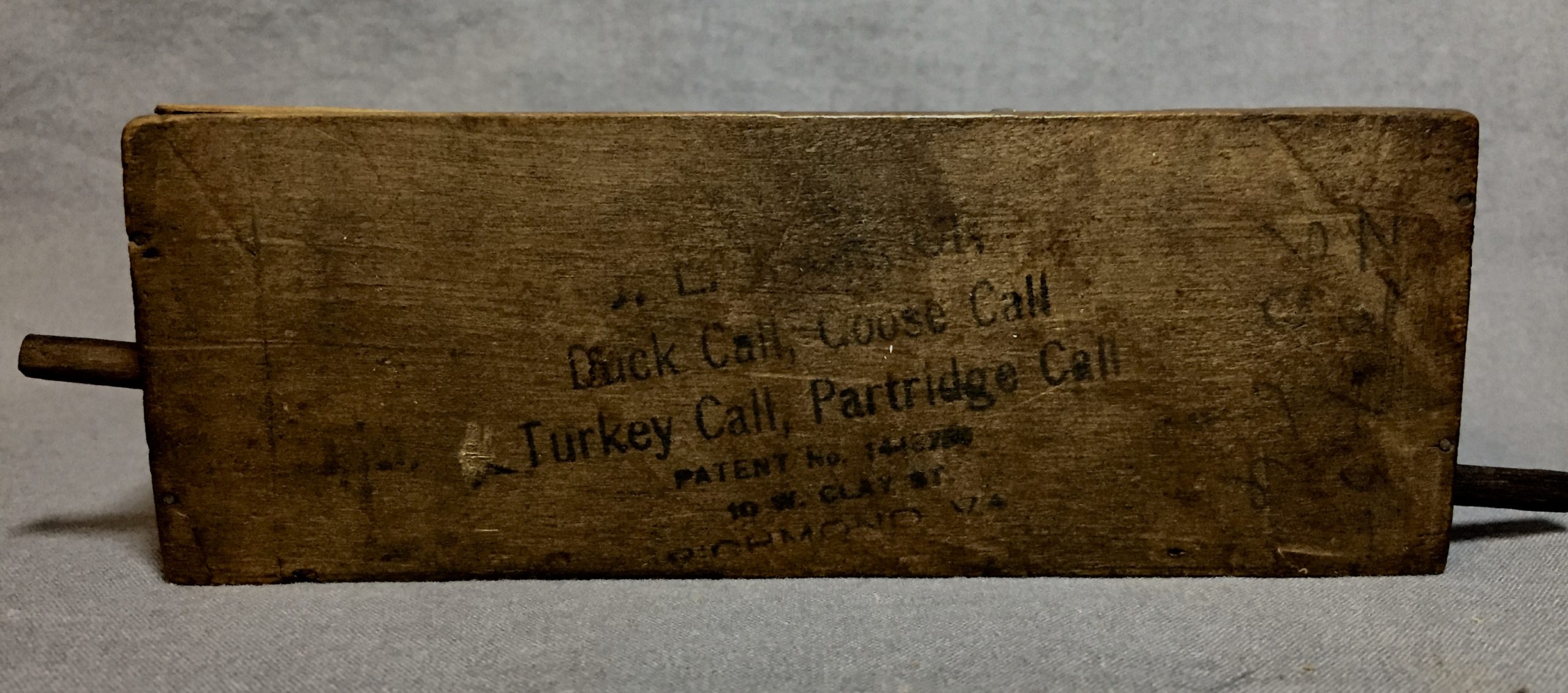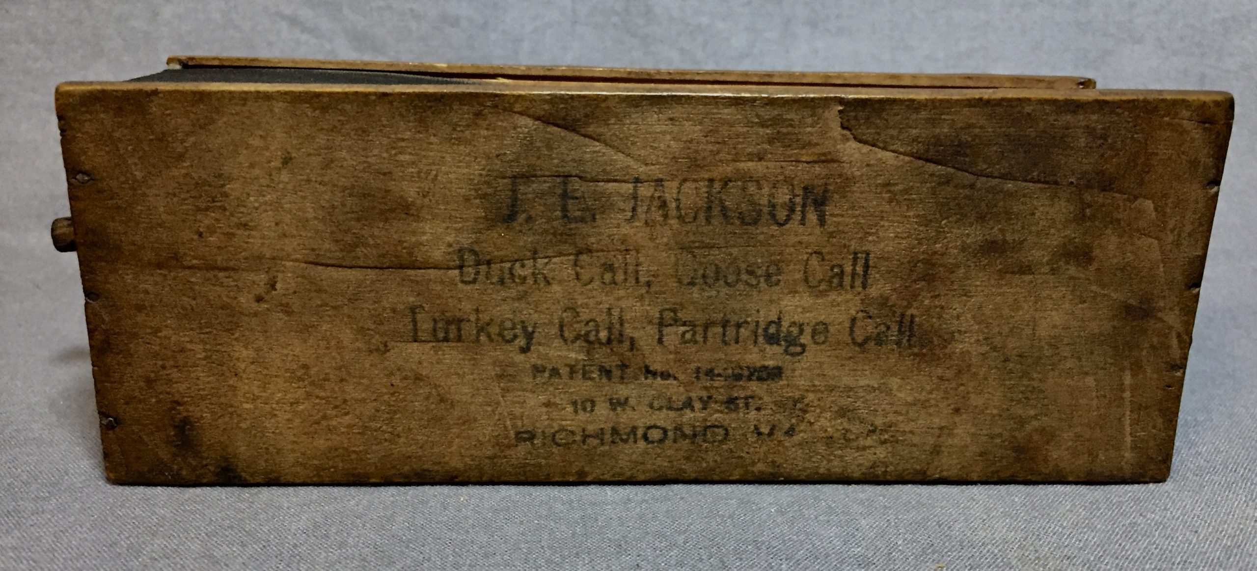 Stamped on the call: J.E. Jackson, Duck Call, Goose Call, Turkey Call Partridge Call, Patent No.1446750, 10 W Clay St, Richmond VA.