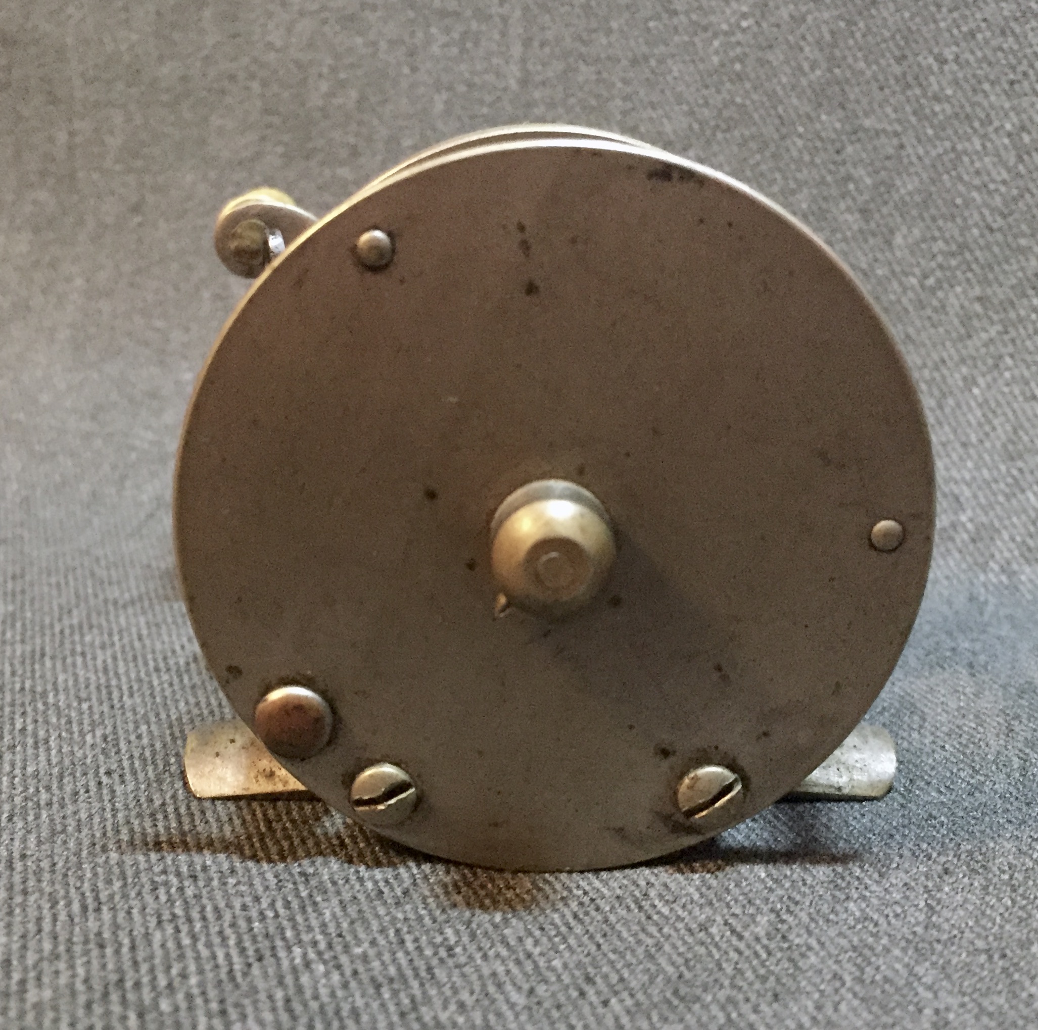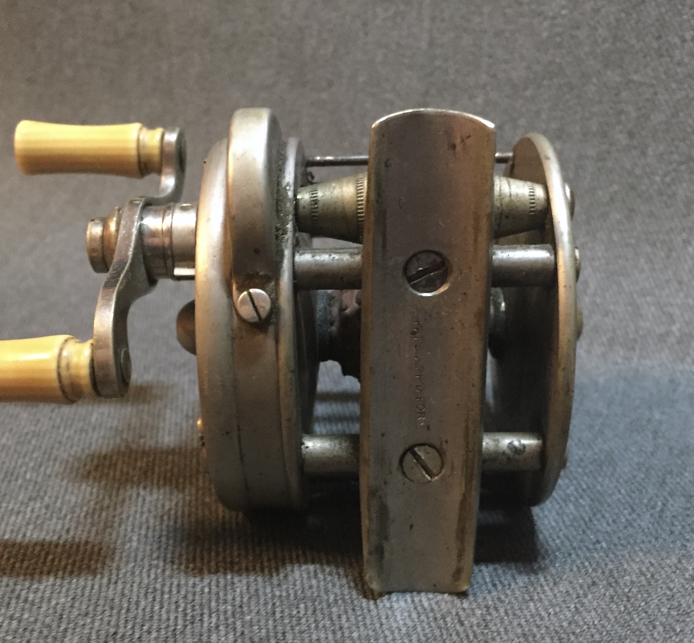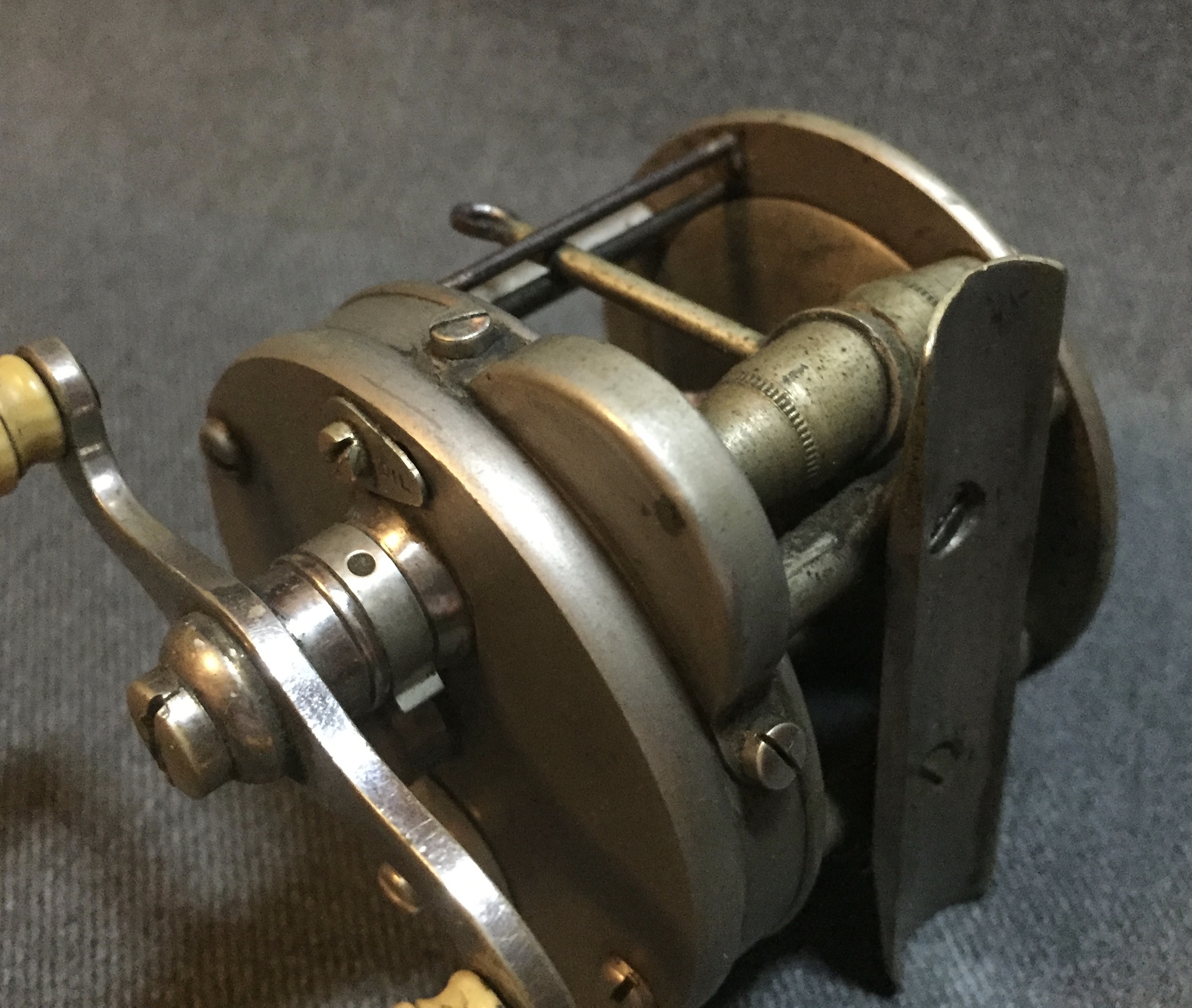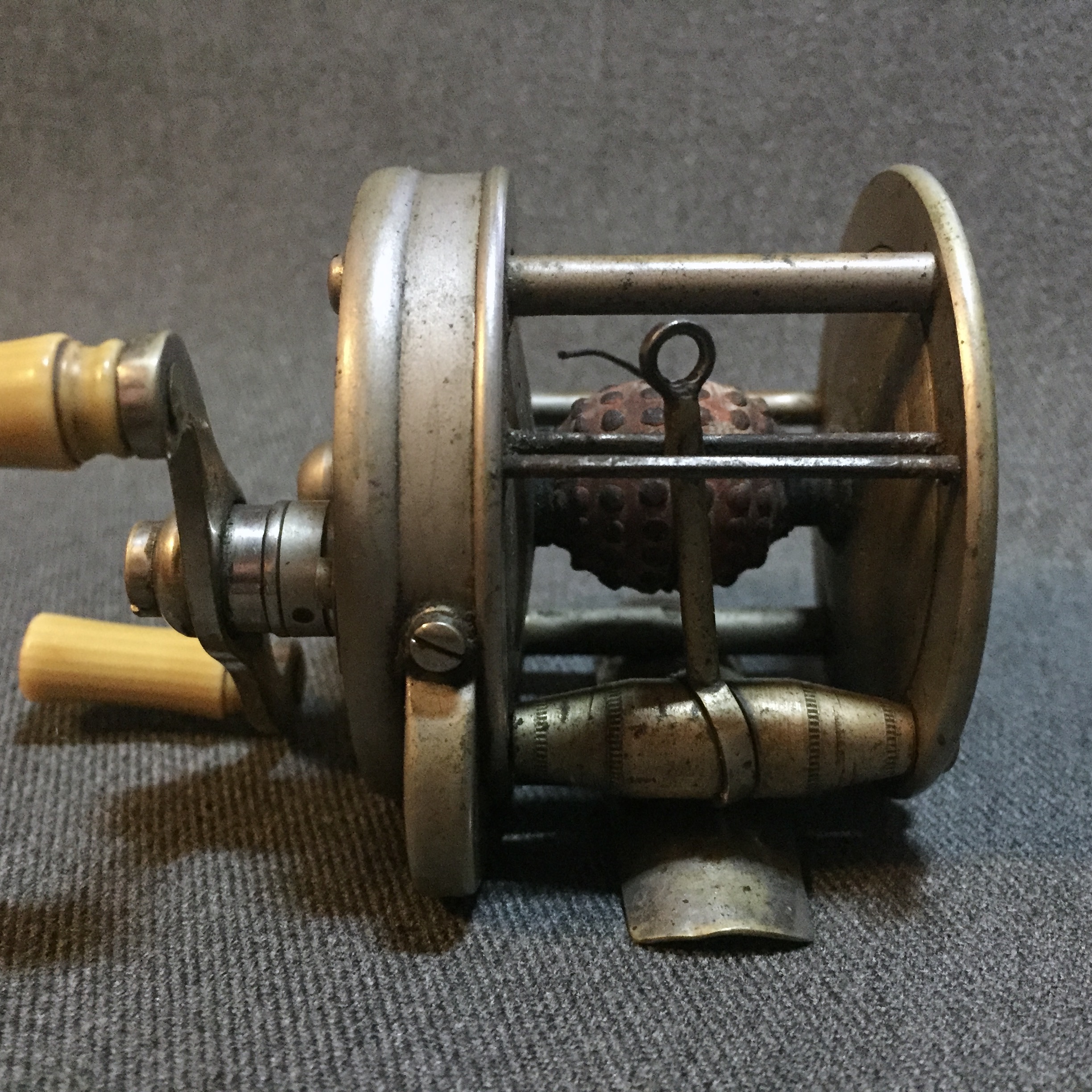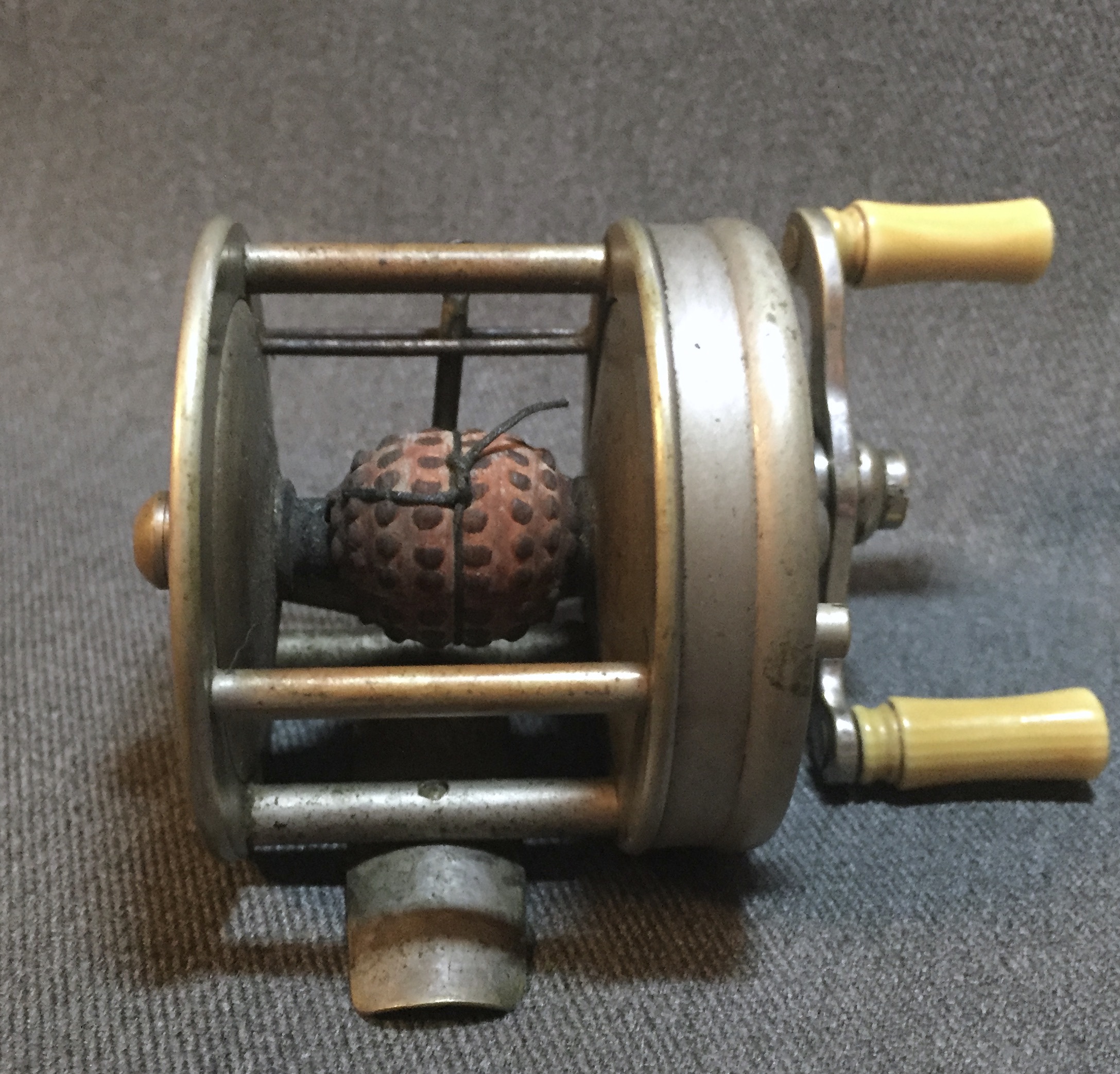 From James Heddon’s Sons, a very rare reel with a bulb on the spindle spool. This is a moving single line feeder that makes the reel a level wind. The reel has a single drag click knob with a double handle.