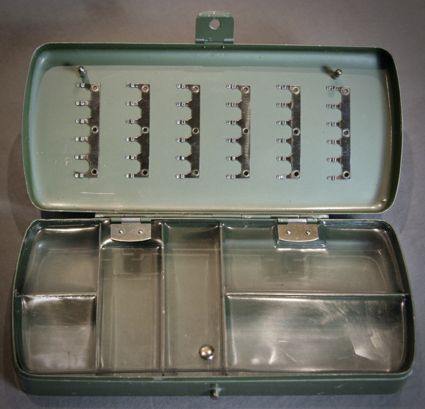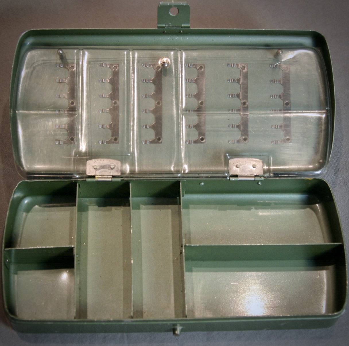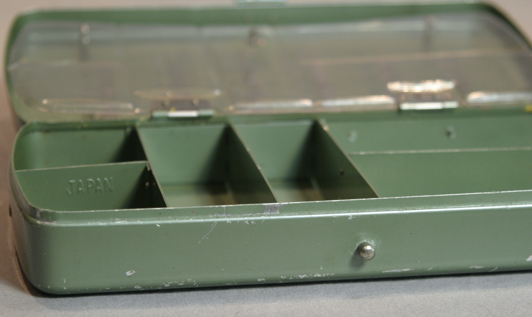 This is a nice green fly box from Japan. The holes are reinforced by metal grommets which also attach the metal clip strips on the inside of the box. The box has compartments with a see through lid. Please note that the plastic lid has a crack in it.