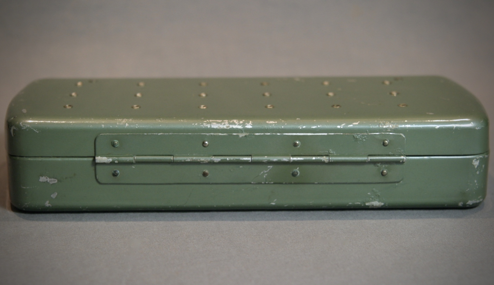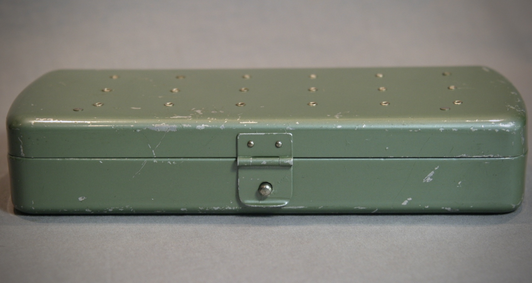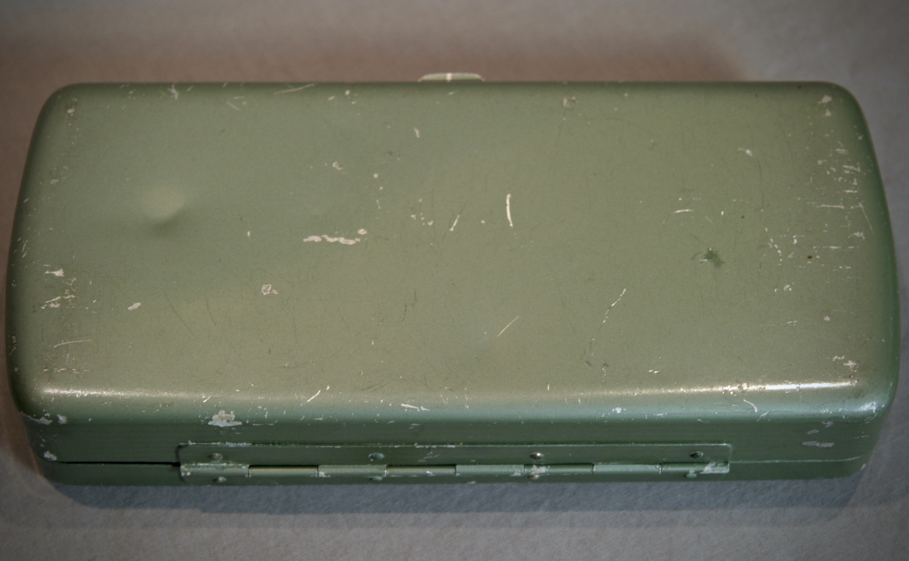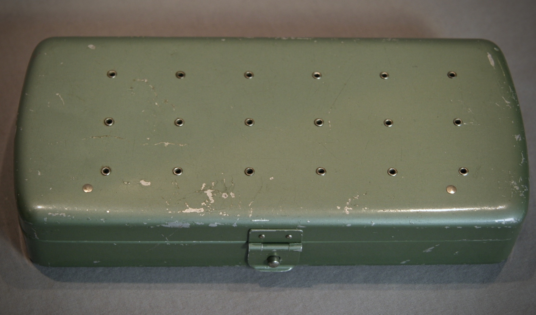 This is a nice green fly box from Japan. The holes are reinforced by metal grommets which also attach the metal clip strips on the inside of the box. The box has compartments with a see through lid. Please note that the plastic lid has a crack in it.
