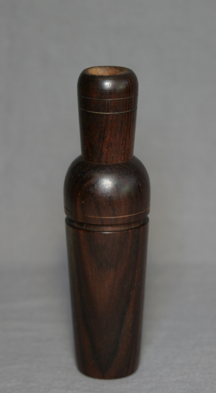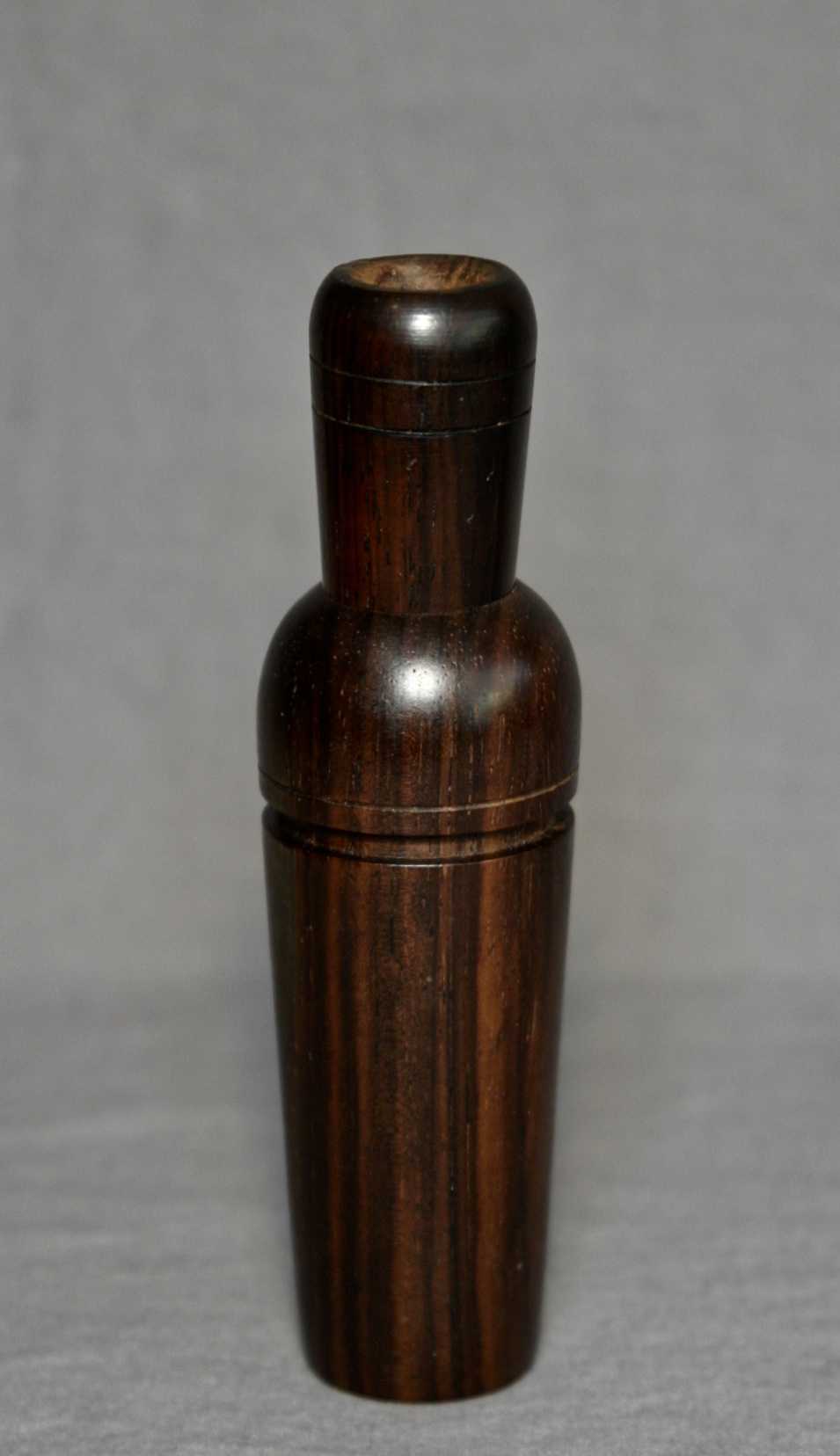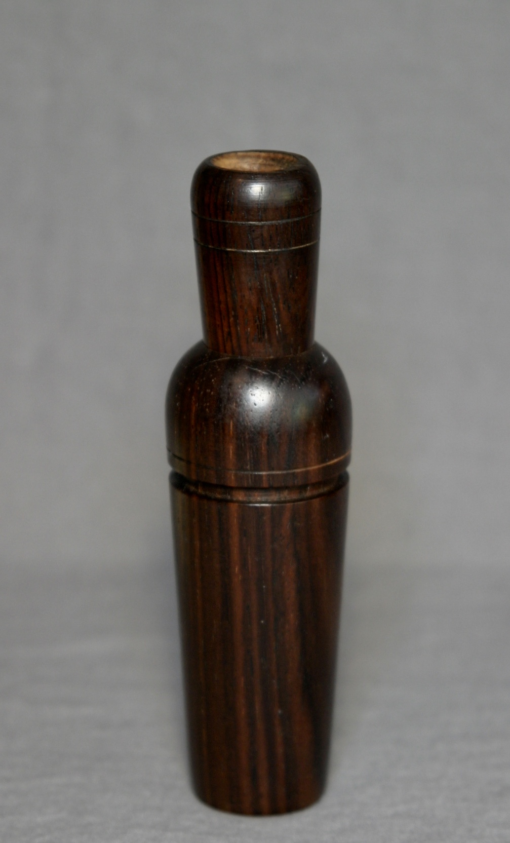 A nice call from famous Tennessee call maker Johnny Cochran, the son of Sundown Cochran. A beautiful Reelfoot style call with a copper reed and beautiful, rich red hued walnut.