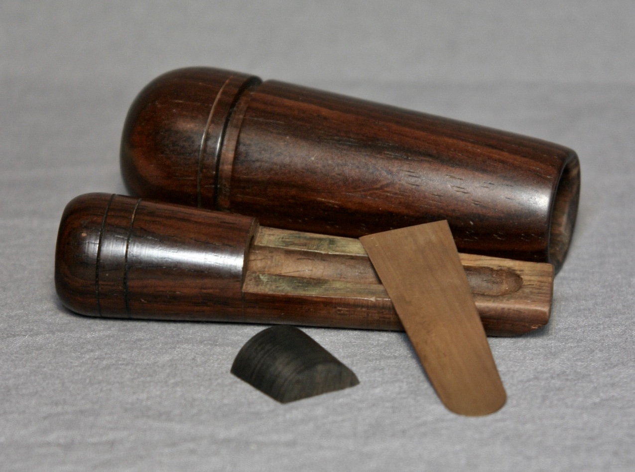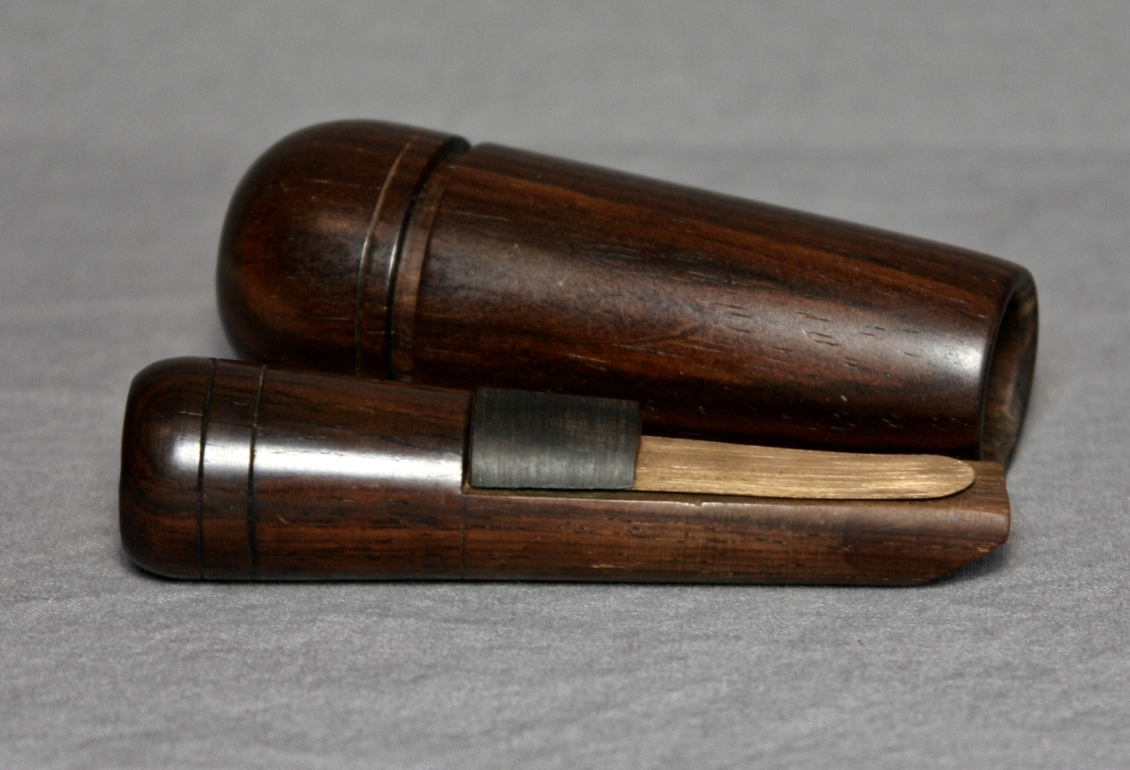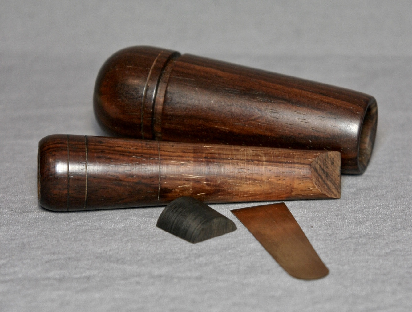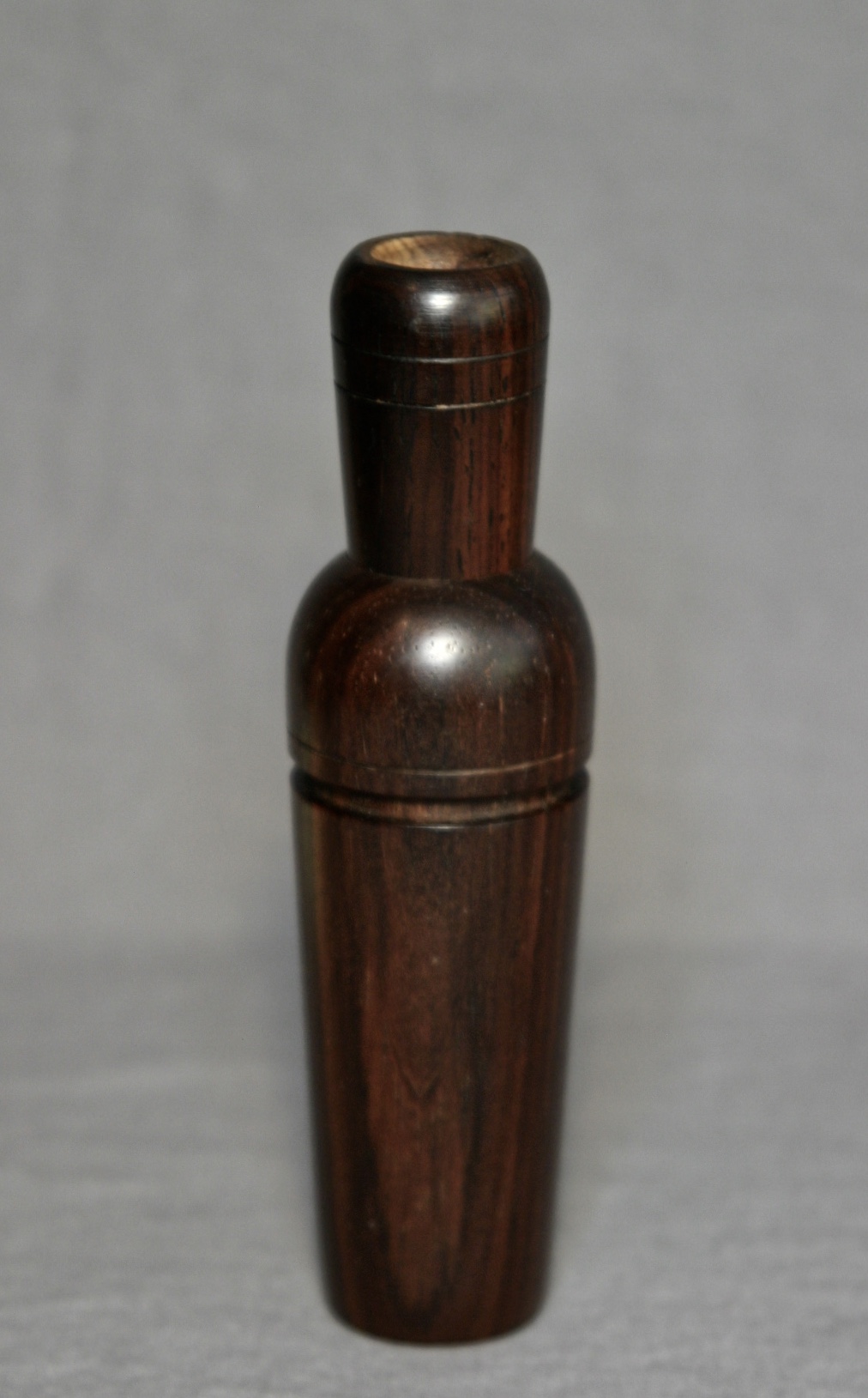 A nice call from famous Tennessee call maker Johnny Cochran, the son of Sundown Cochran. A beautiful Reelfoot style call with a copper reed and beautiful, rich red hued walnut.