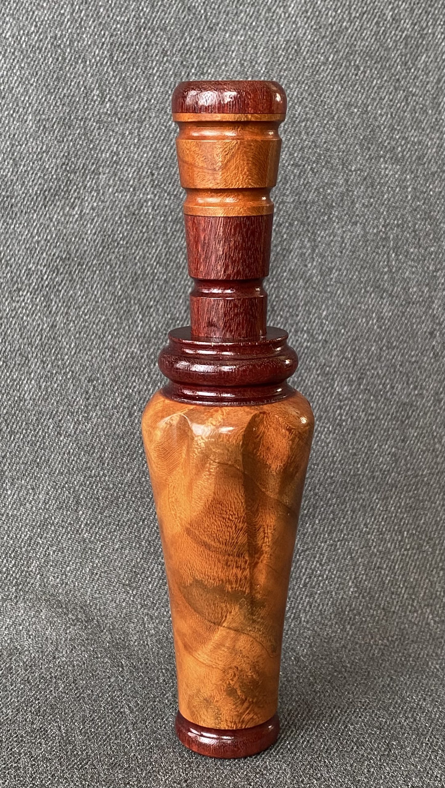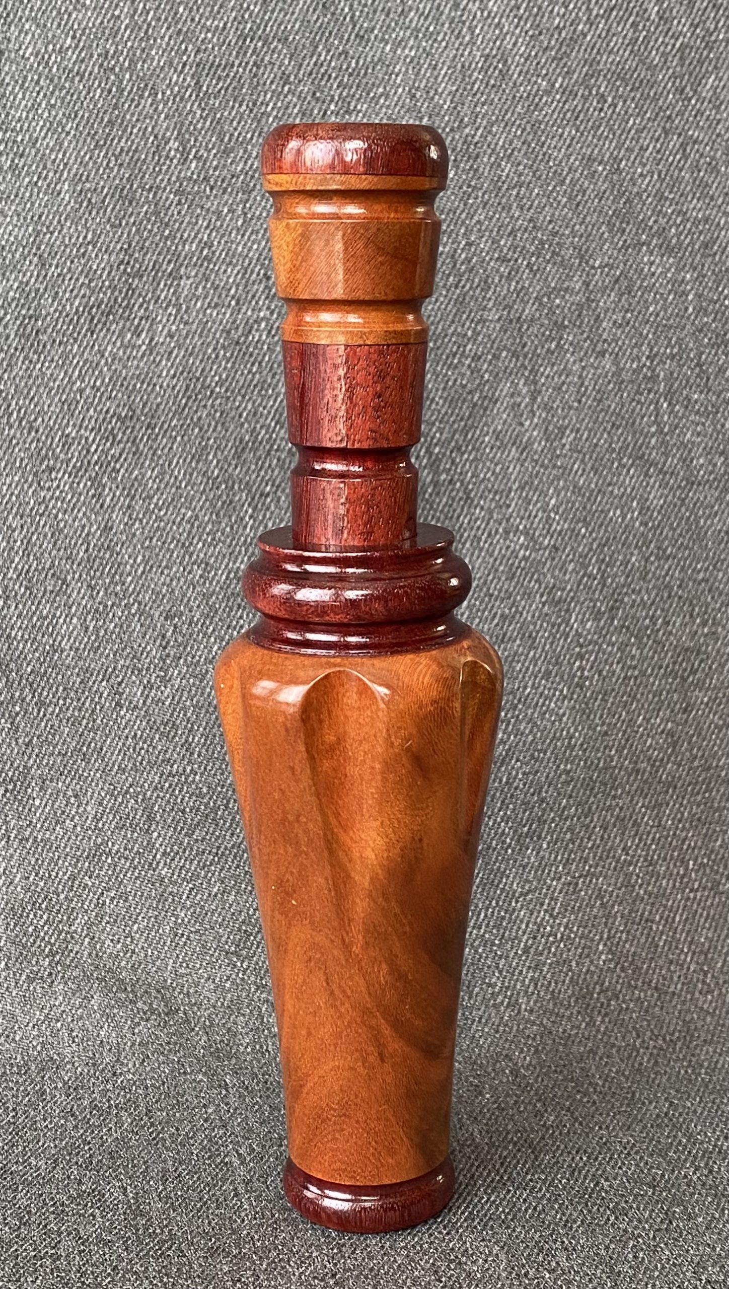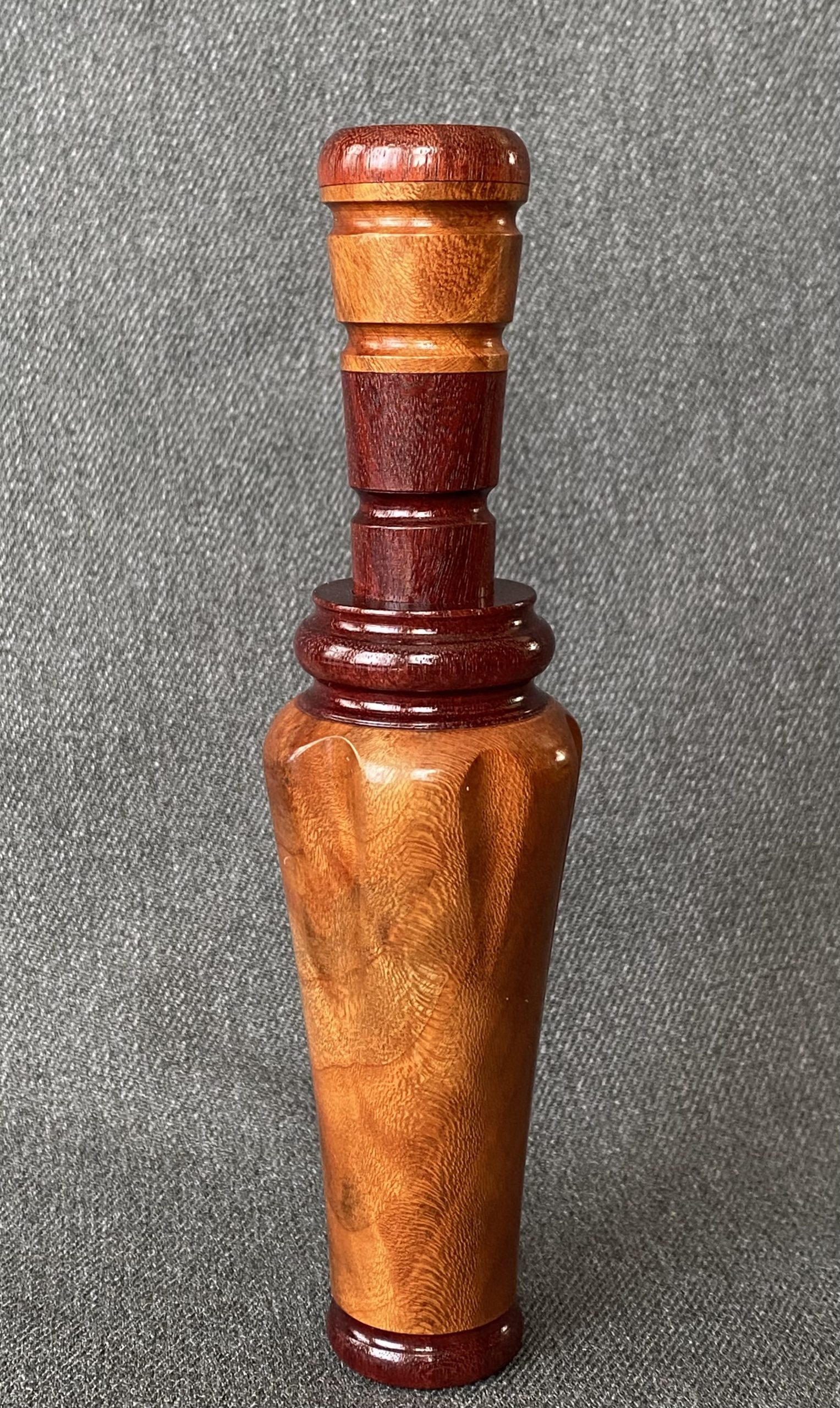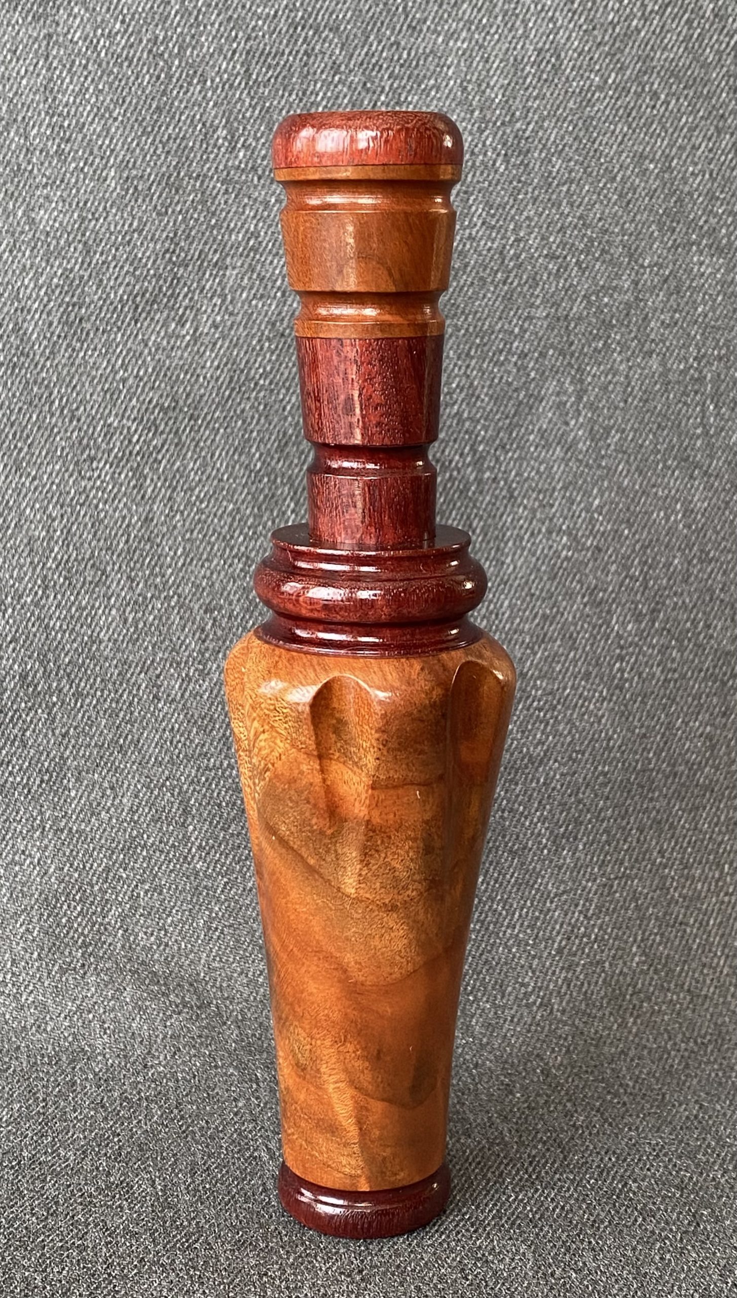 This is a very nice laminated call with round cut outs forming 6 shoulder. The call is Arkansas style with a plastic reed.