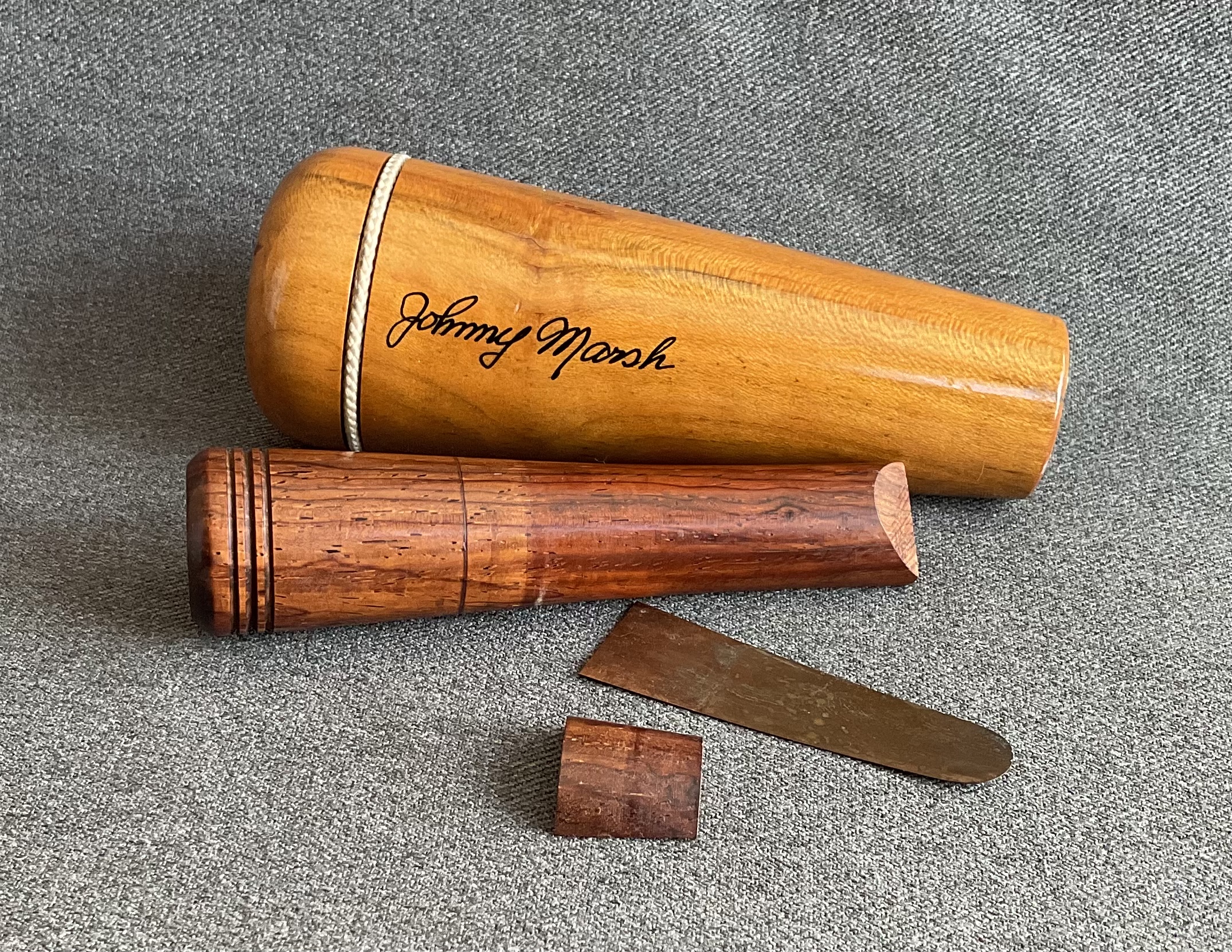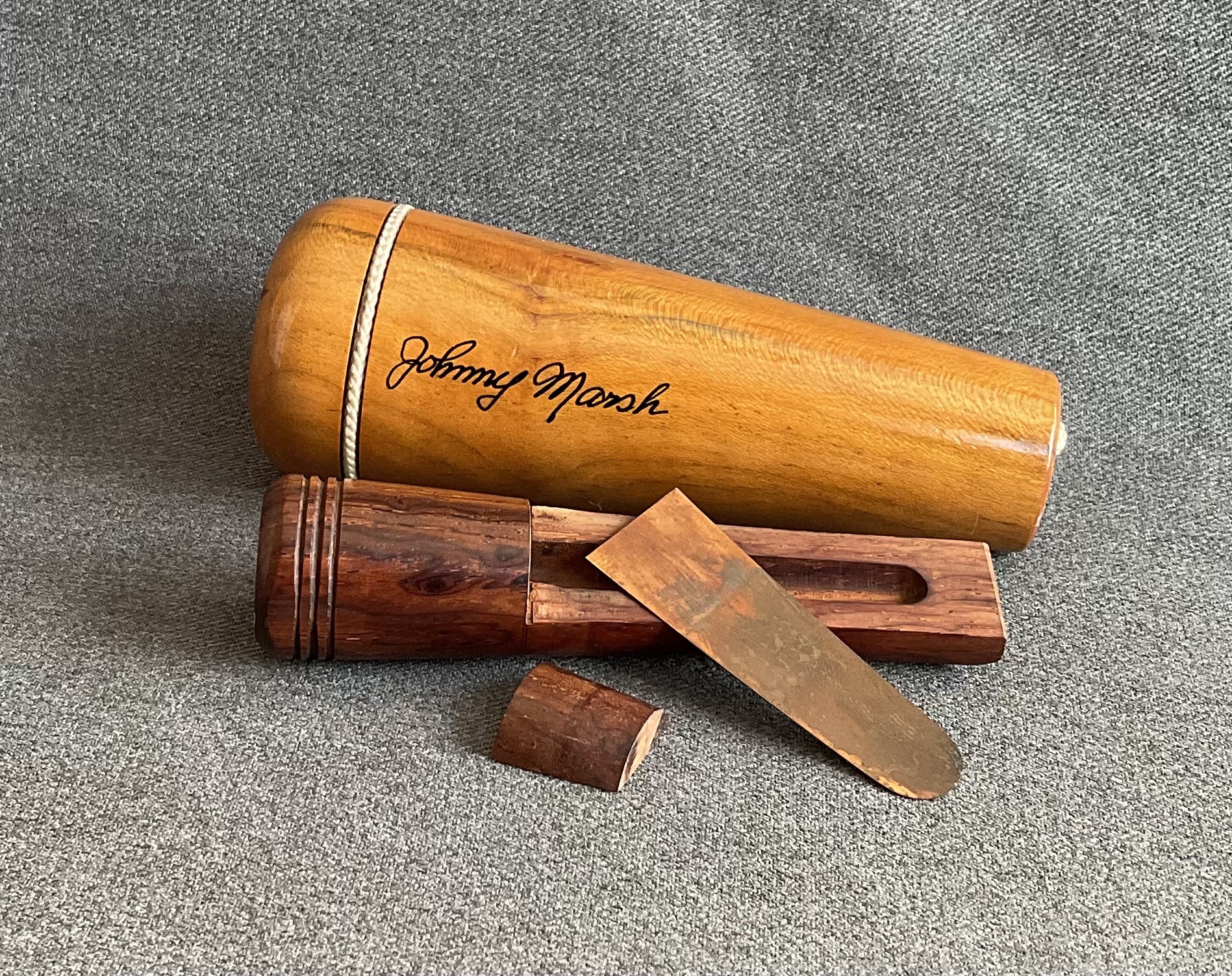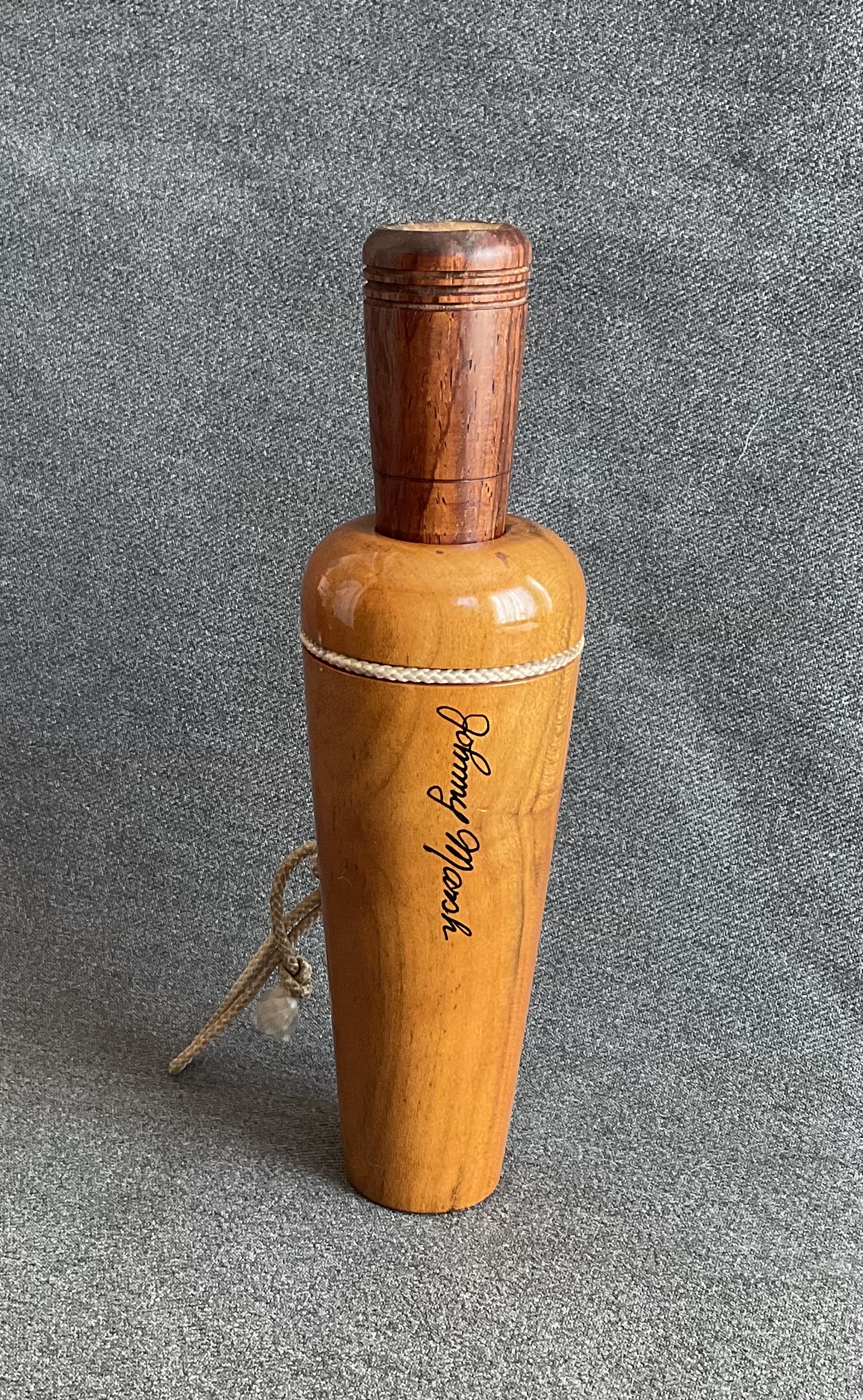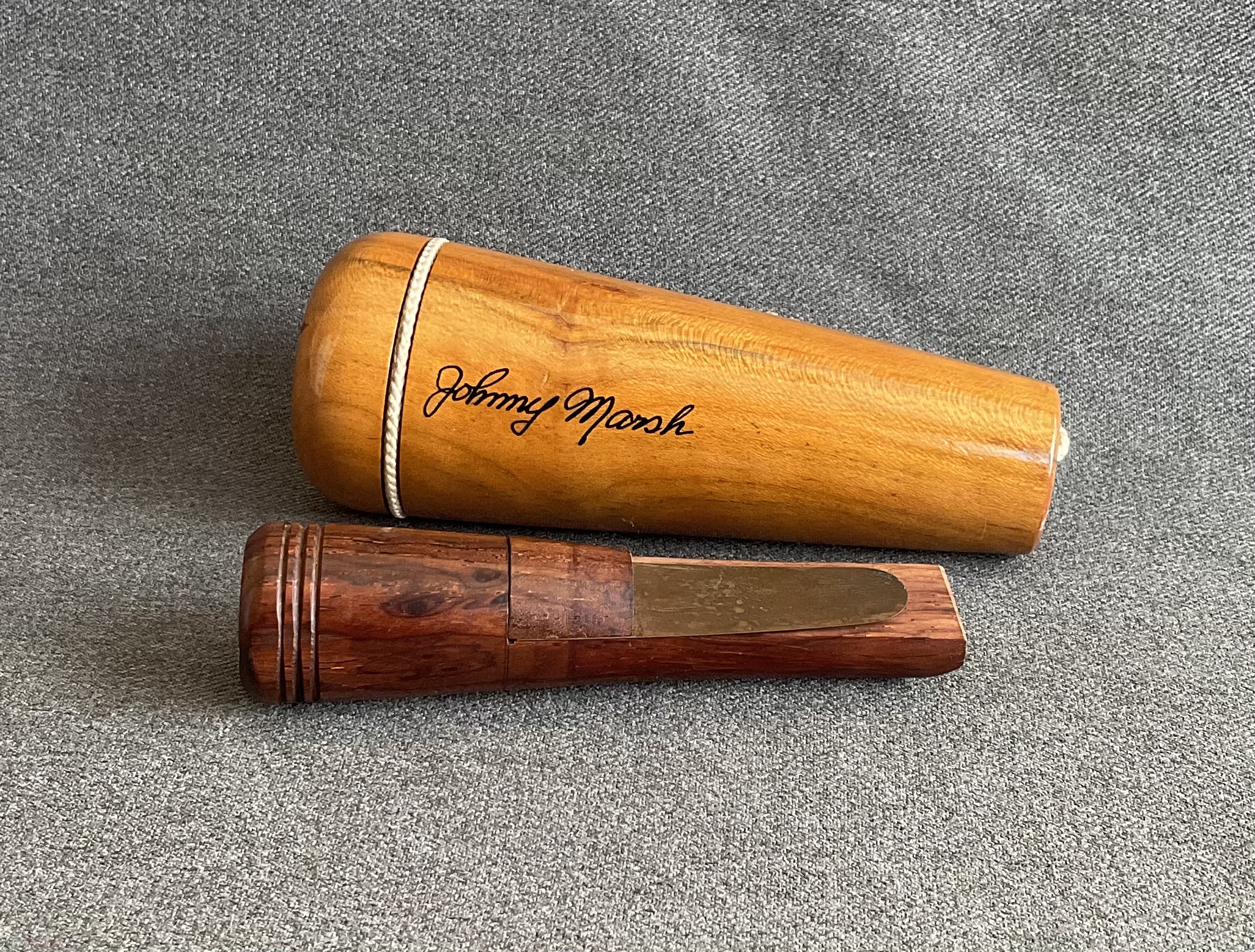 A great call Reelfoot style duck call from Johnny Marsh. The call has a metal reed.