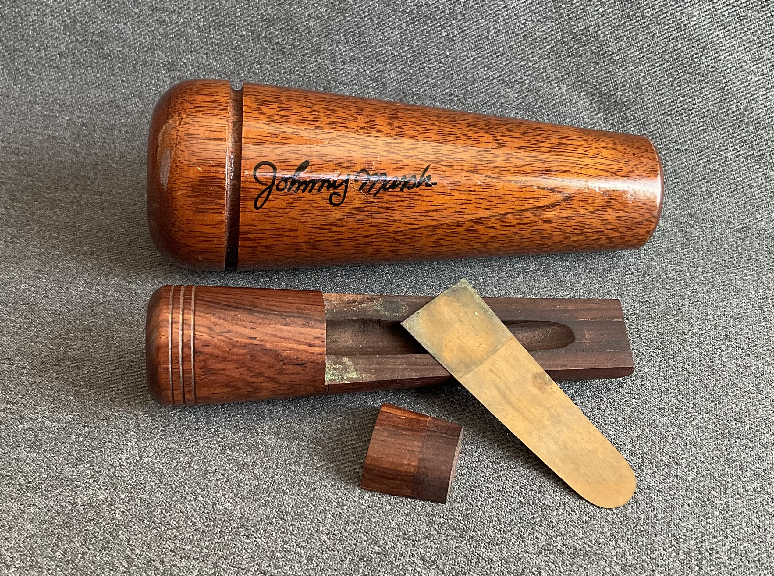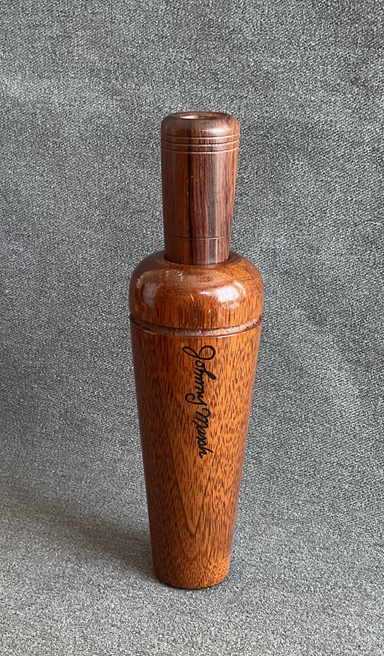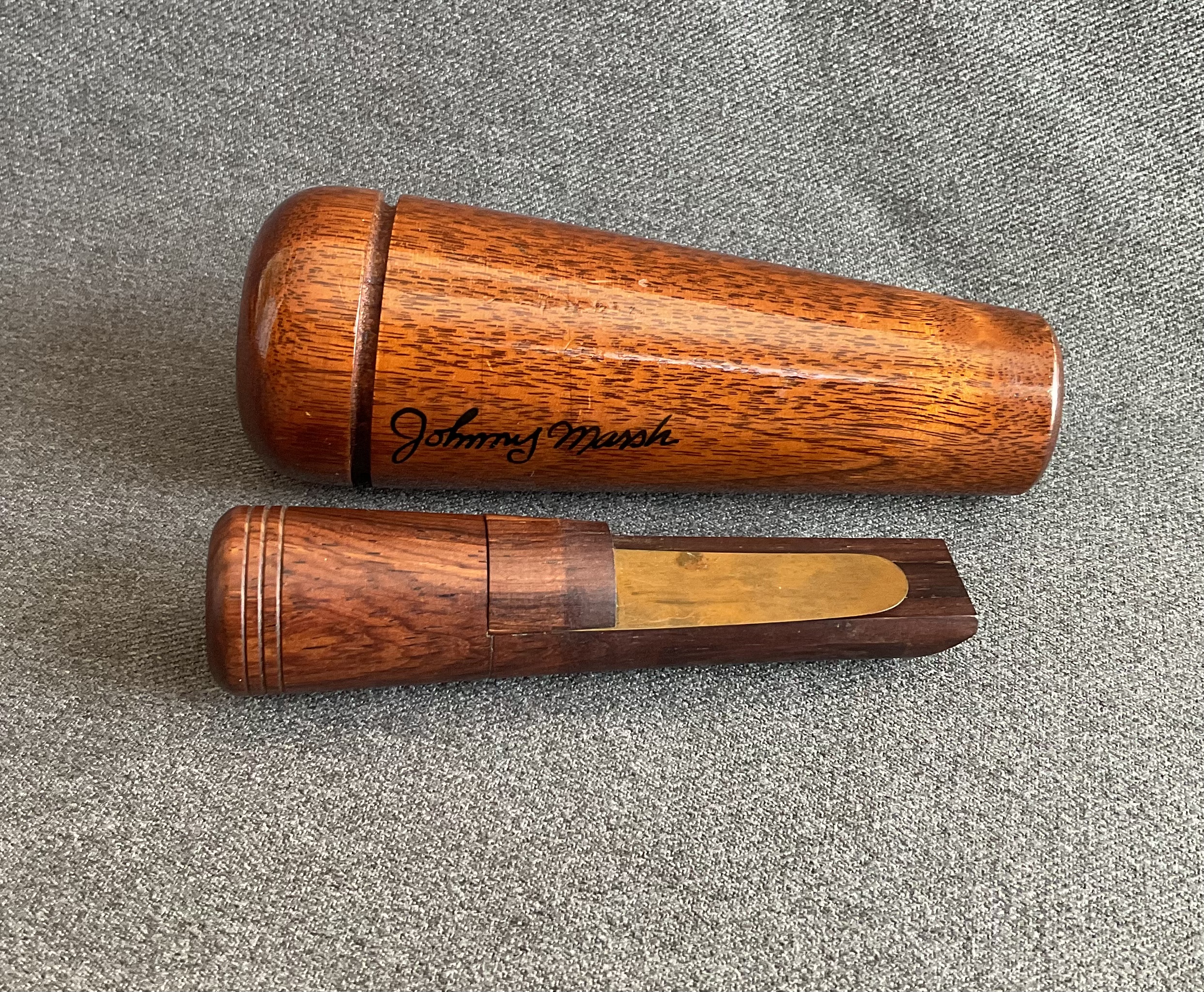 A beautiful walnut call from Johnny Marsh. This 1980s call is Reelfoot style and has a brass reed.