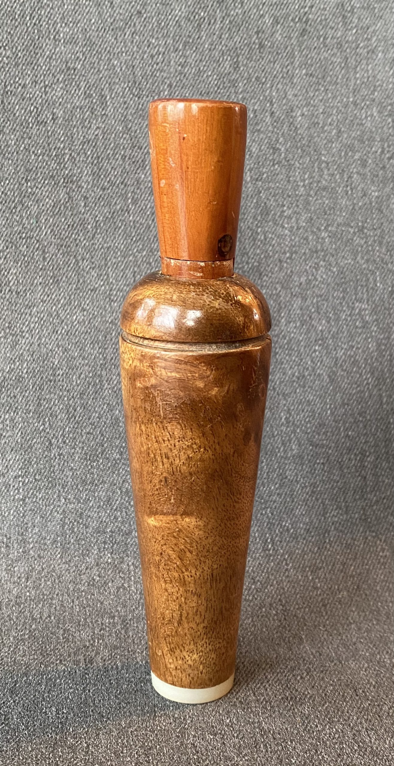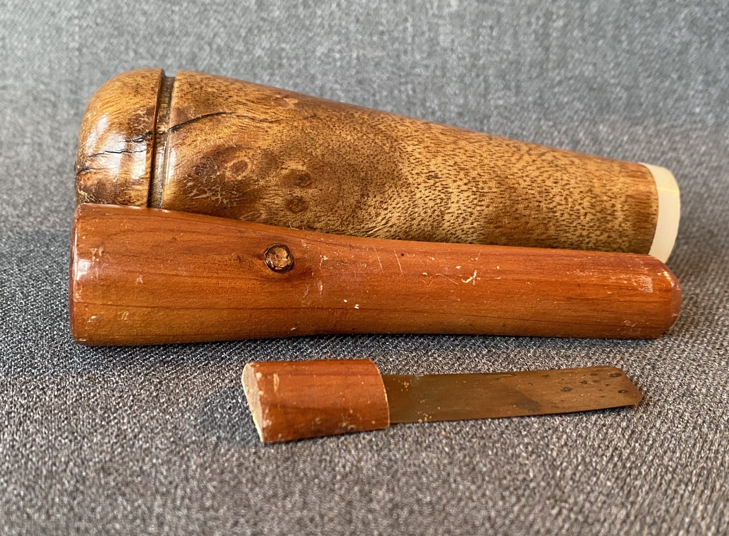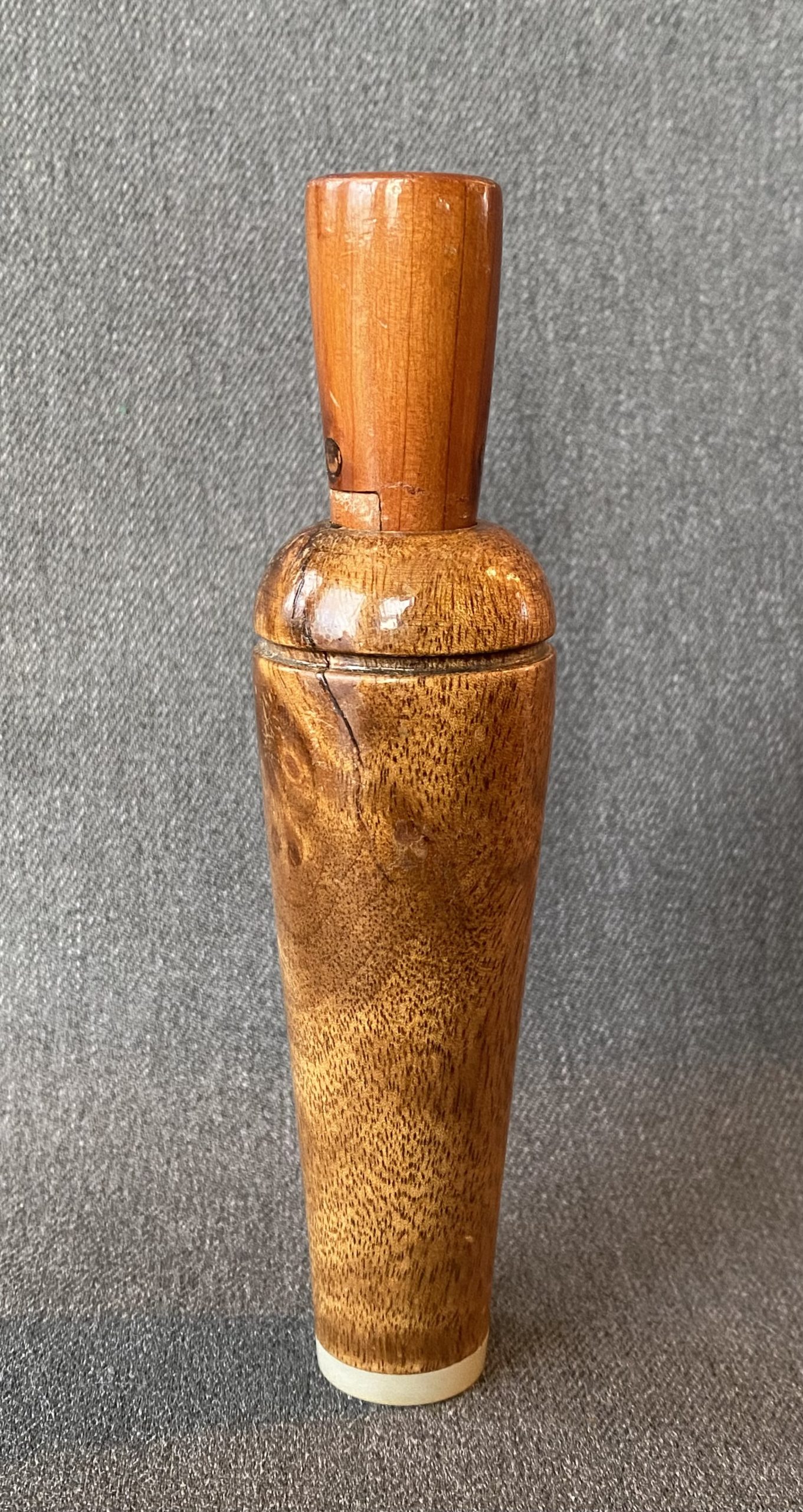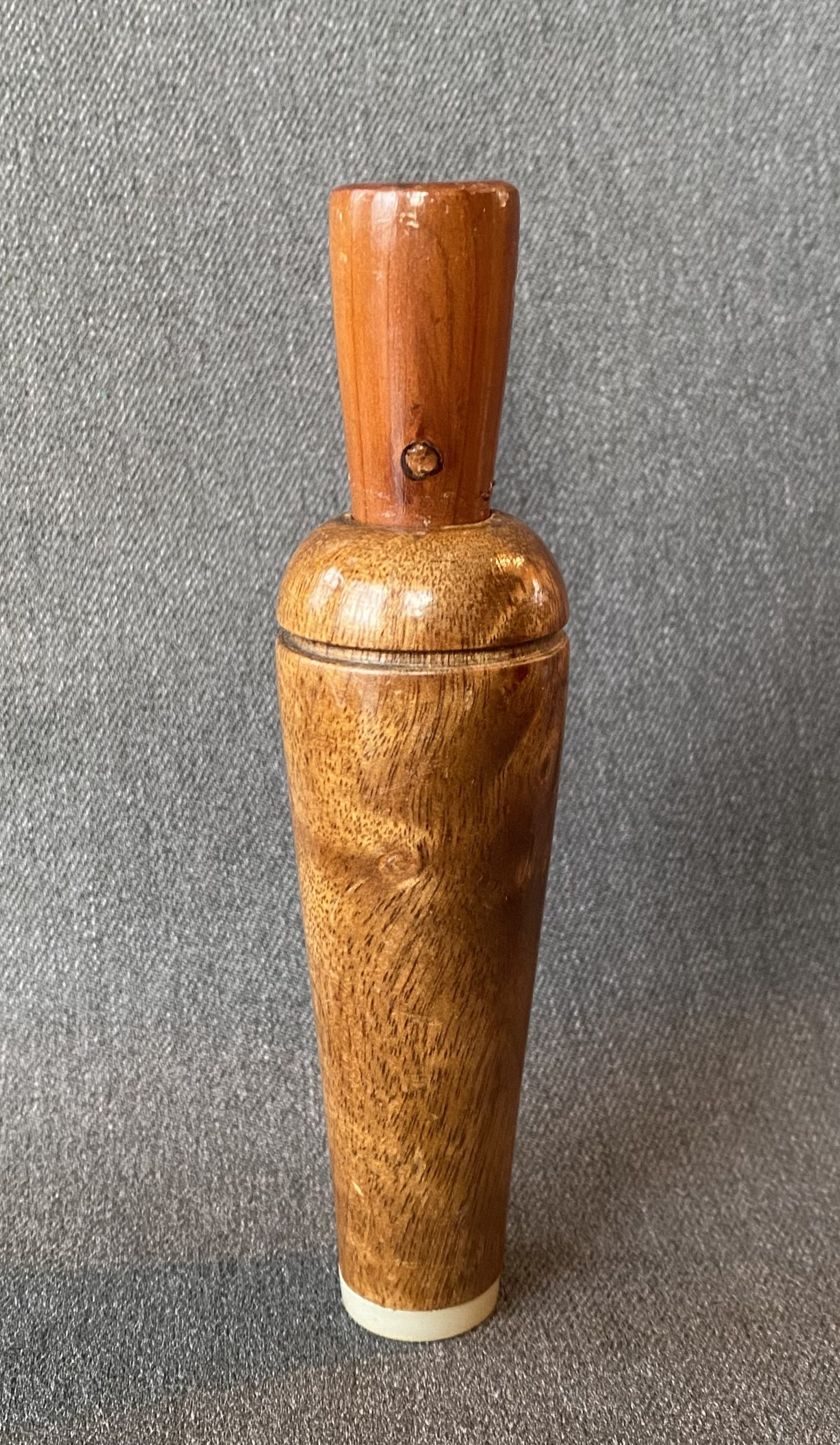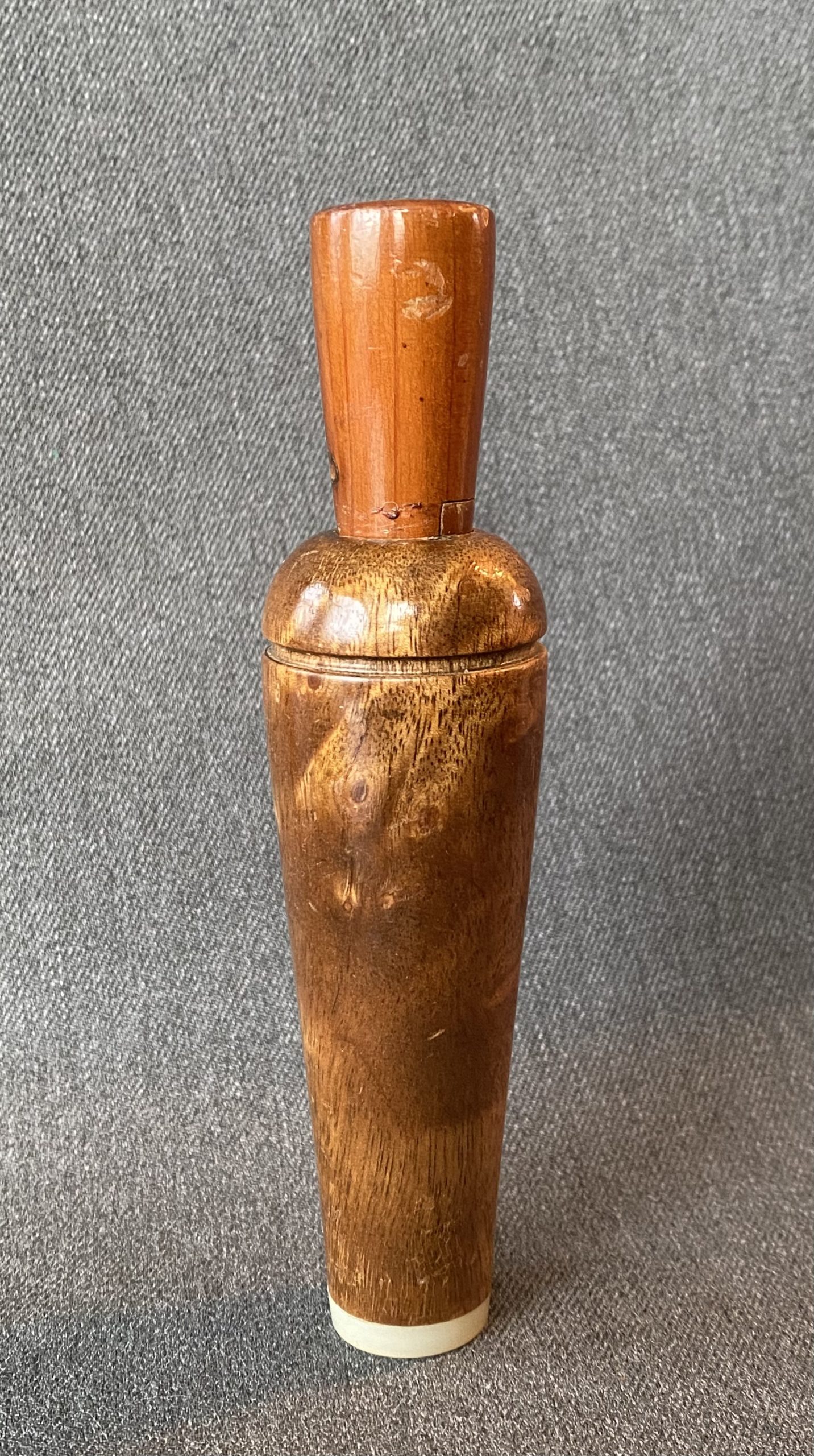 This is a really nice burled wood Reelfoot style call from Red McDaniels. The call is Reelfoot style with a copper reed and has a plastic mouthpiece.