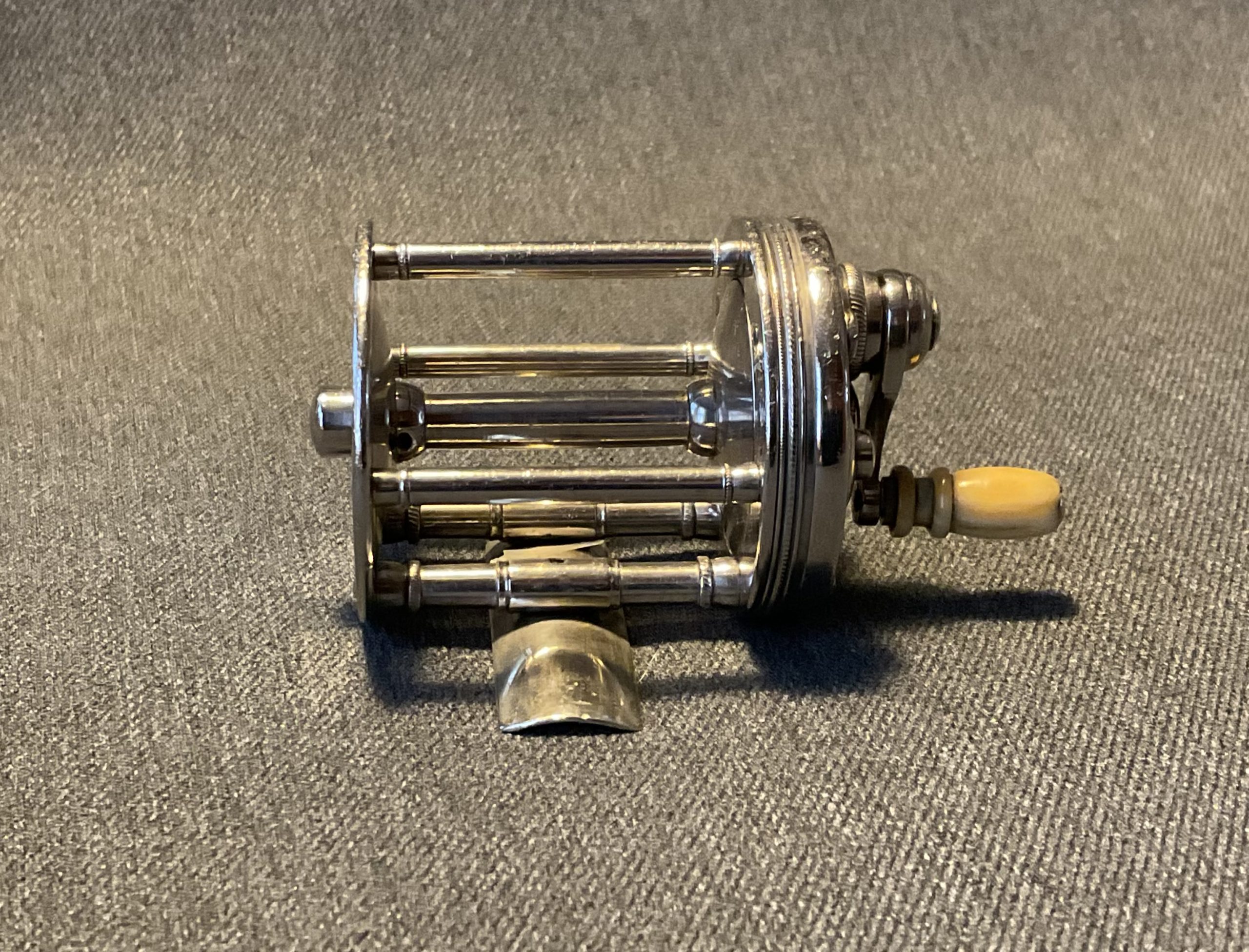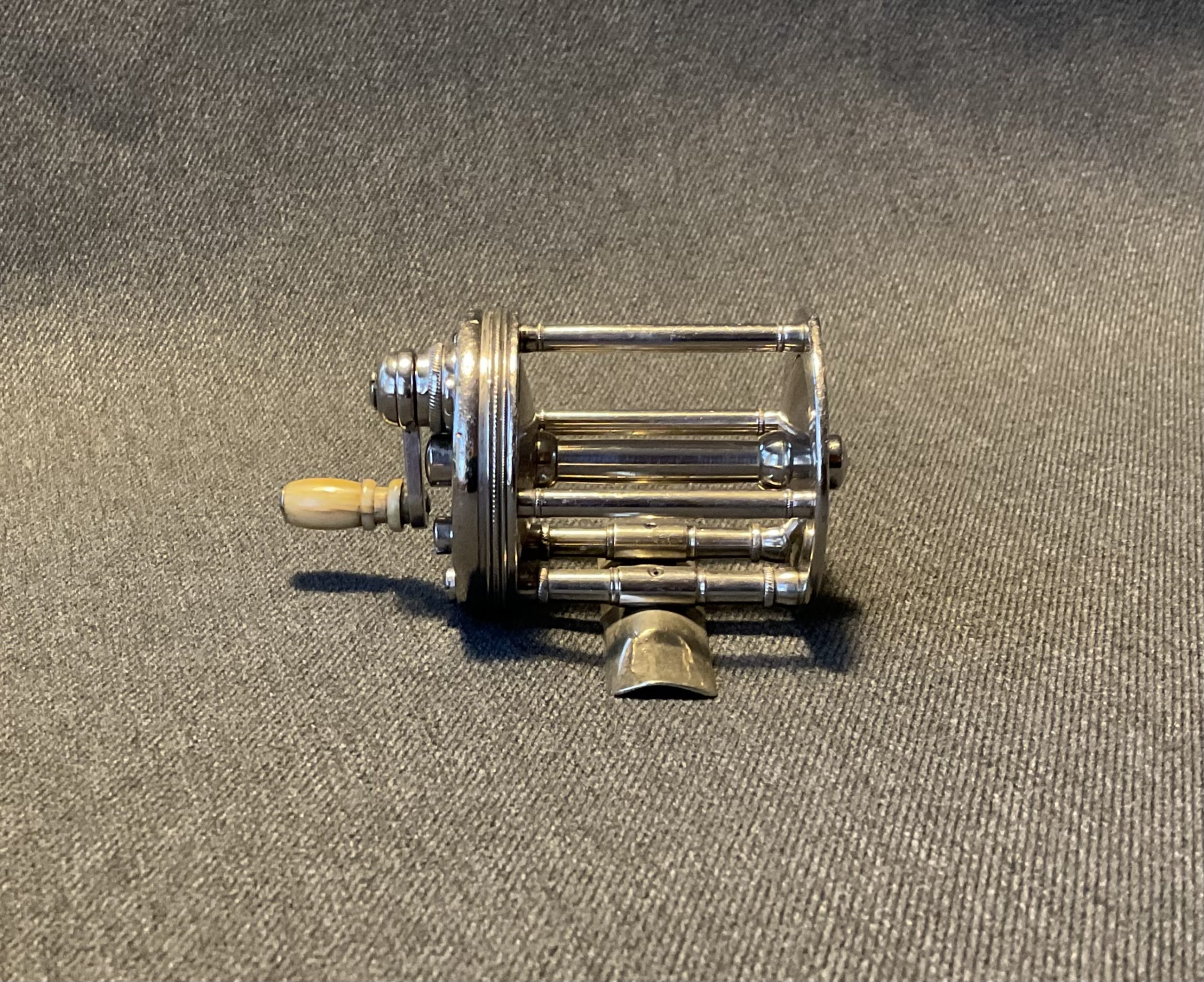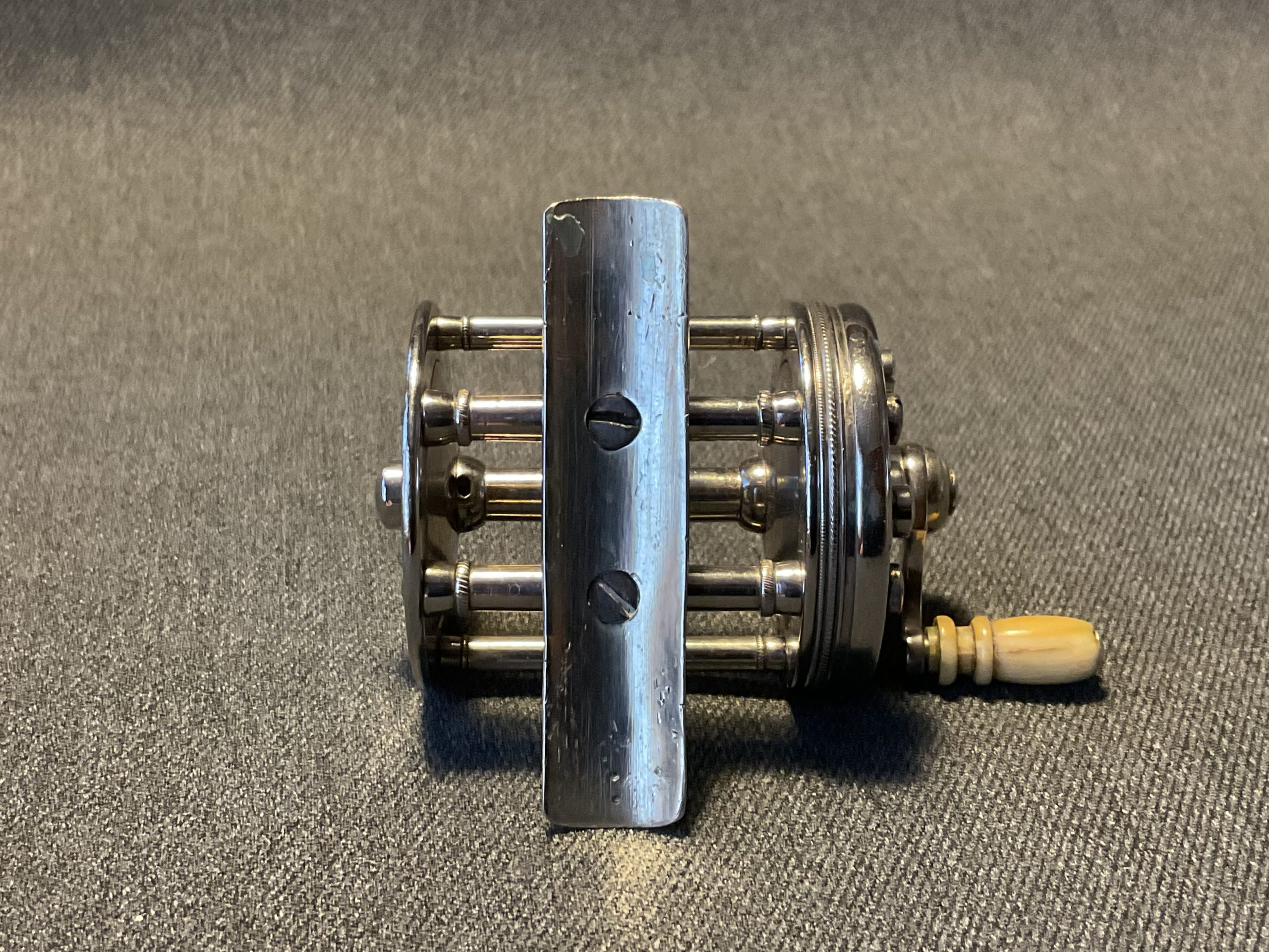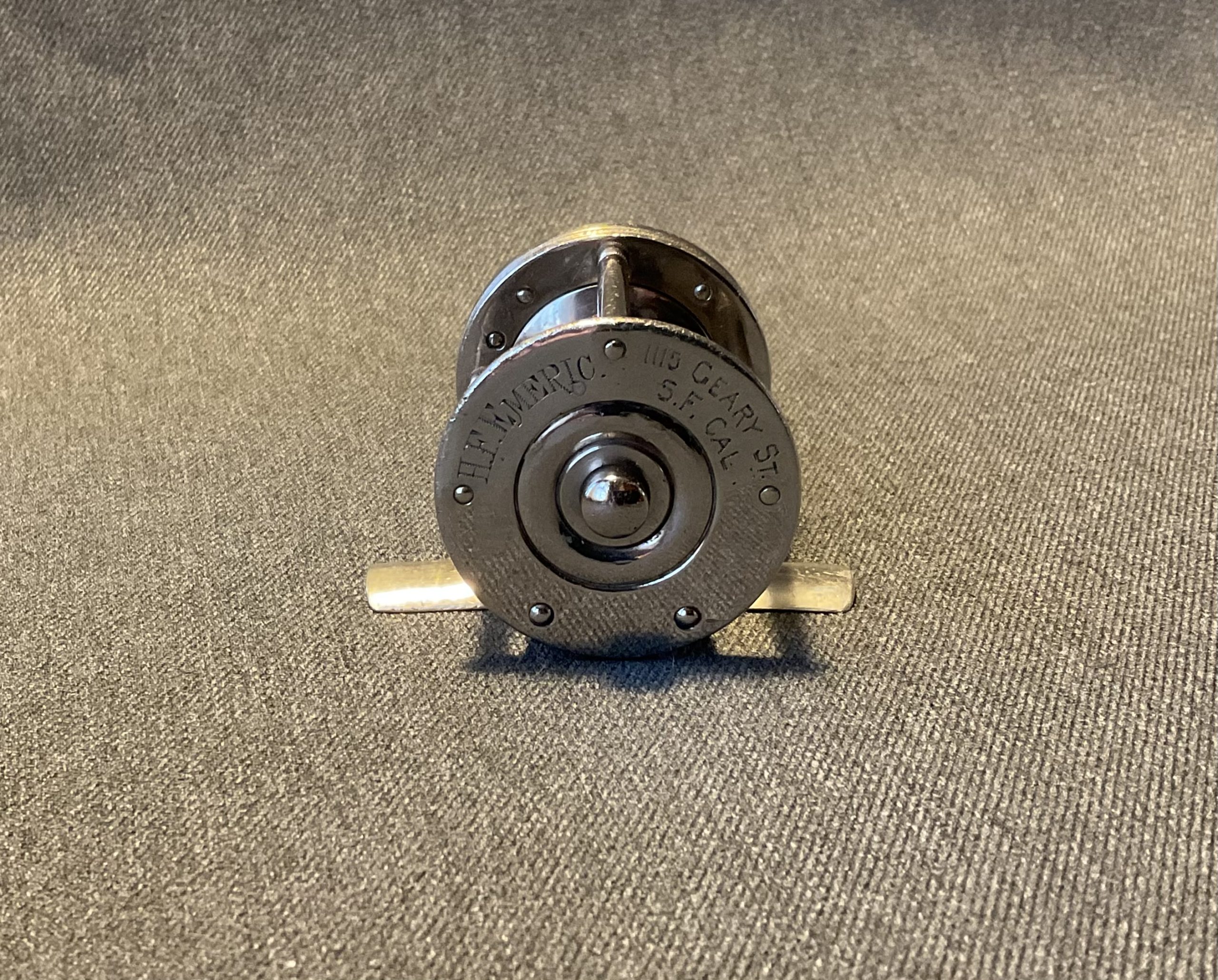 A very rare reel from Meek & Milam. Hand made from German silver, the reel has a nice weight and feel. The reel has the original owner’s name and address engraved into one end, H.F. Em Eric. 1115 Geary St. S.F. Cal.