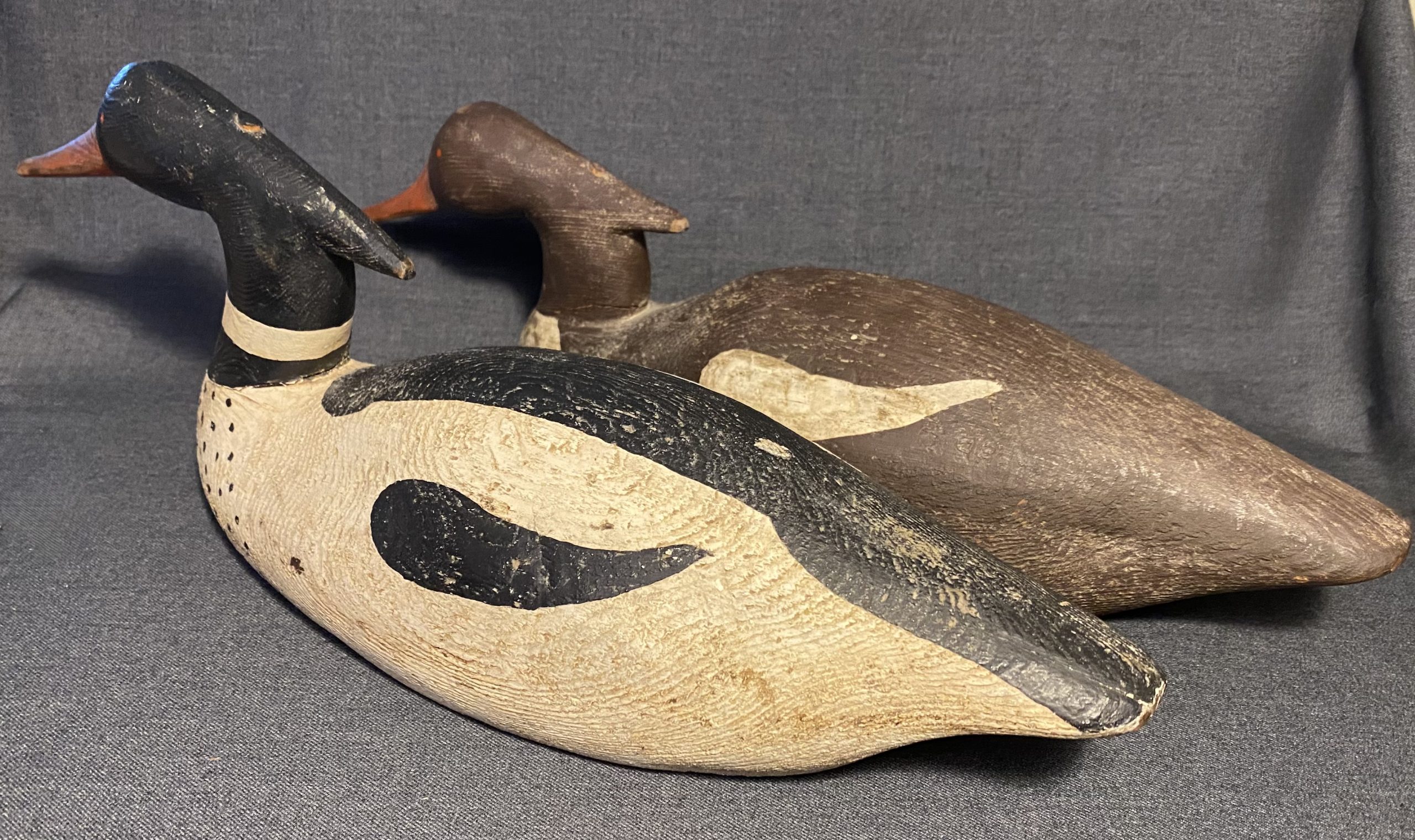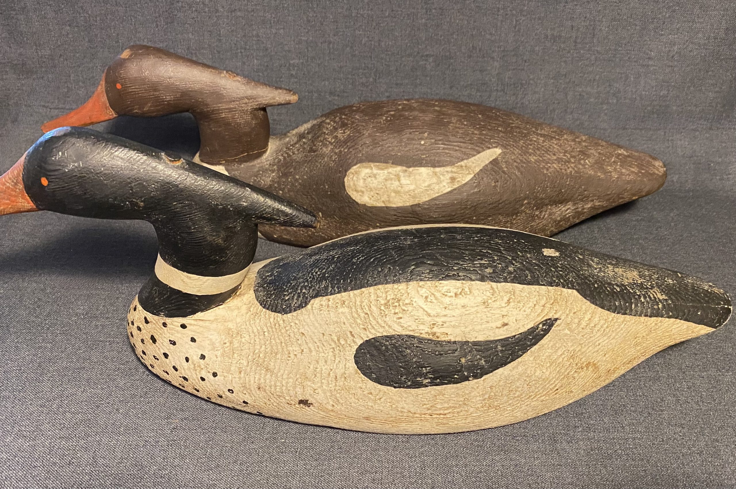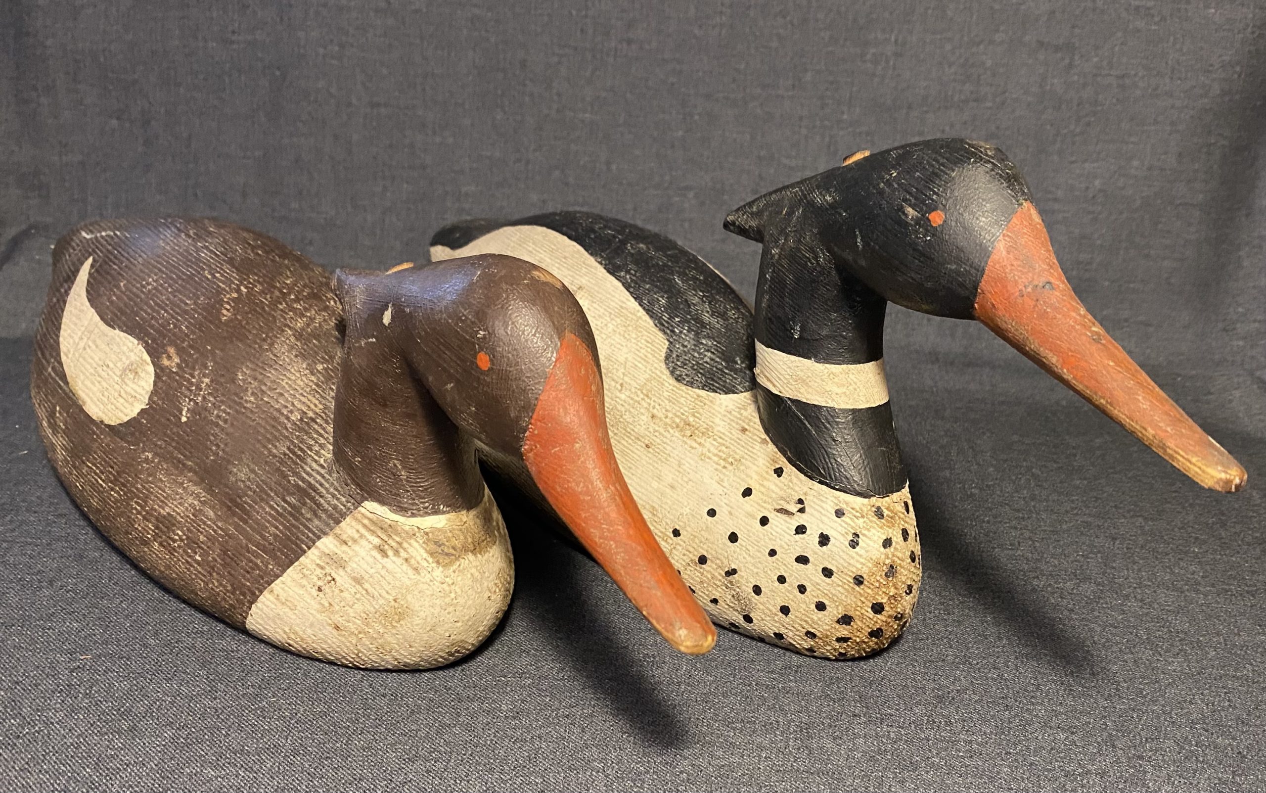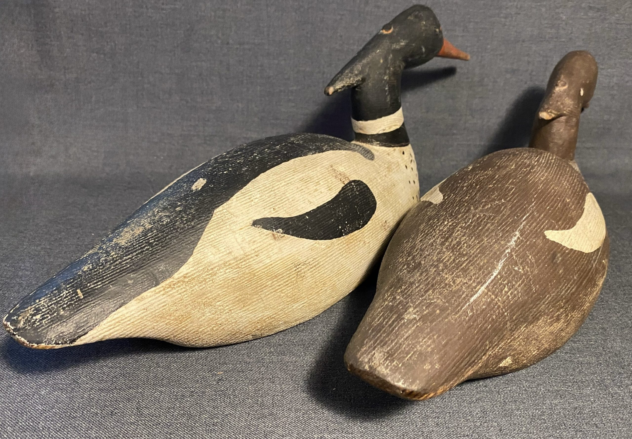 A nice, very old working pair of Merganser decoys. They have a heavy duty construction with dowels through the head atttaching it to the body.