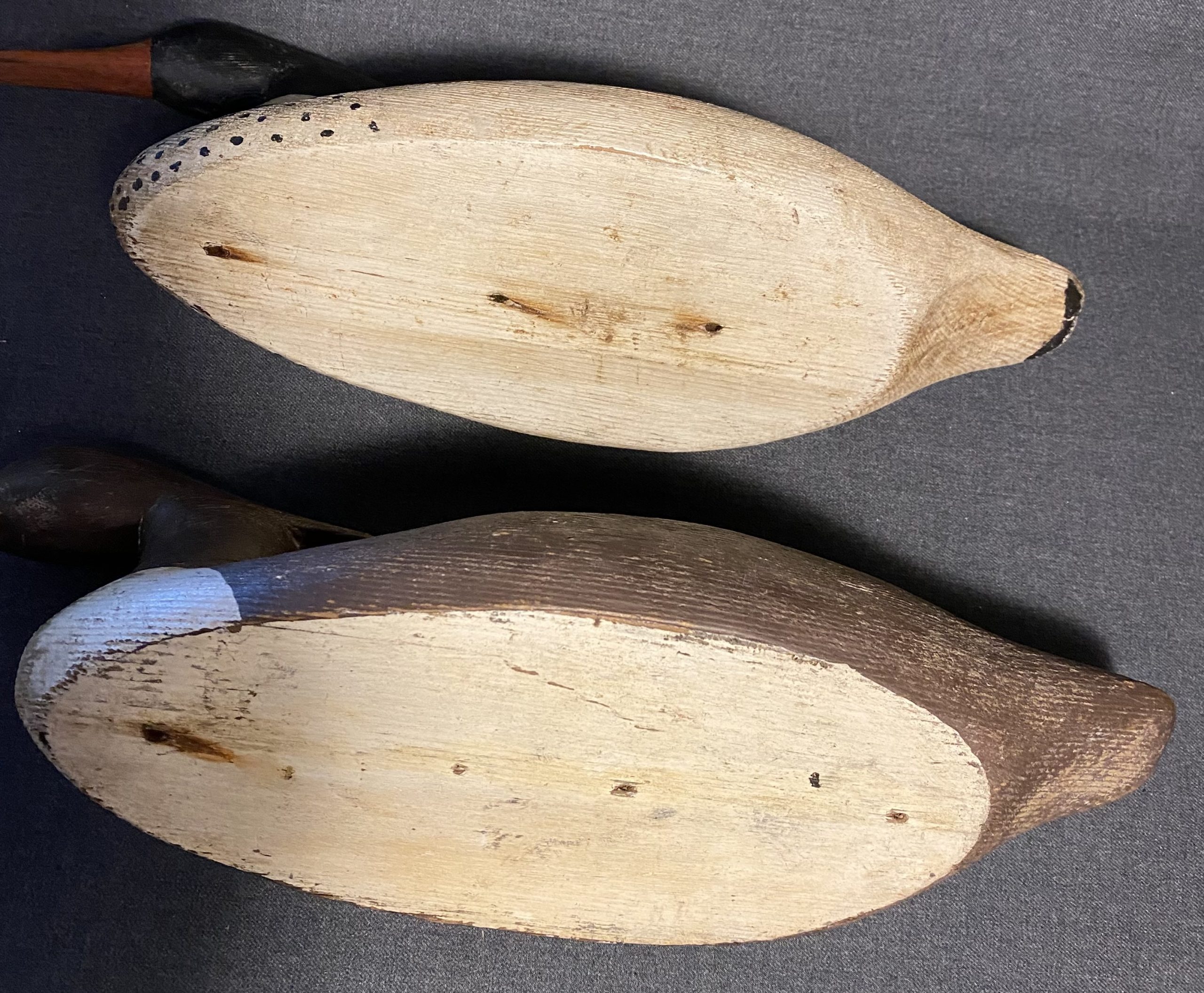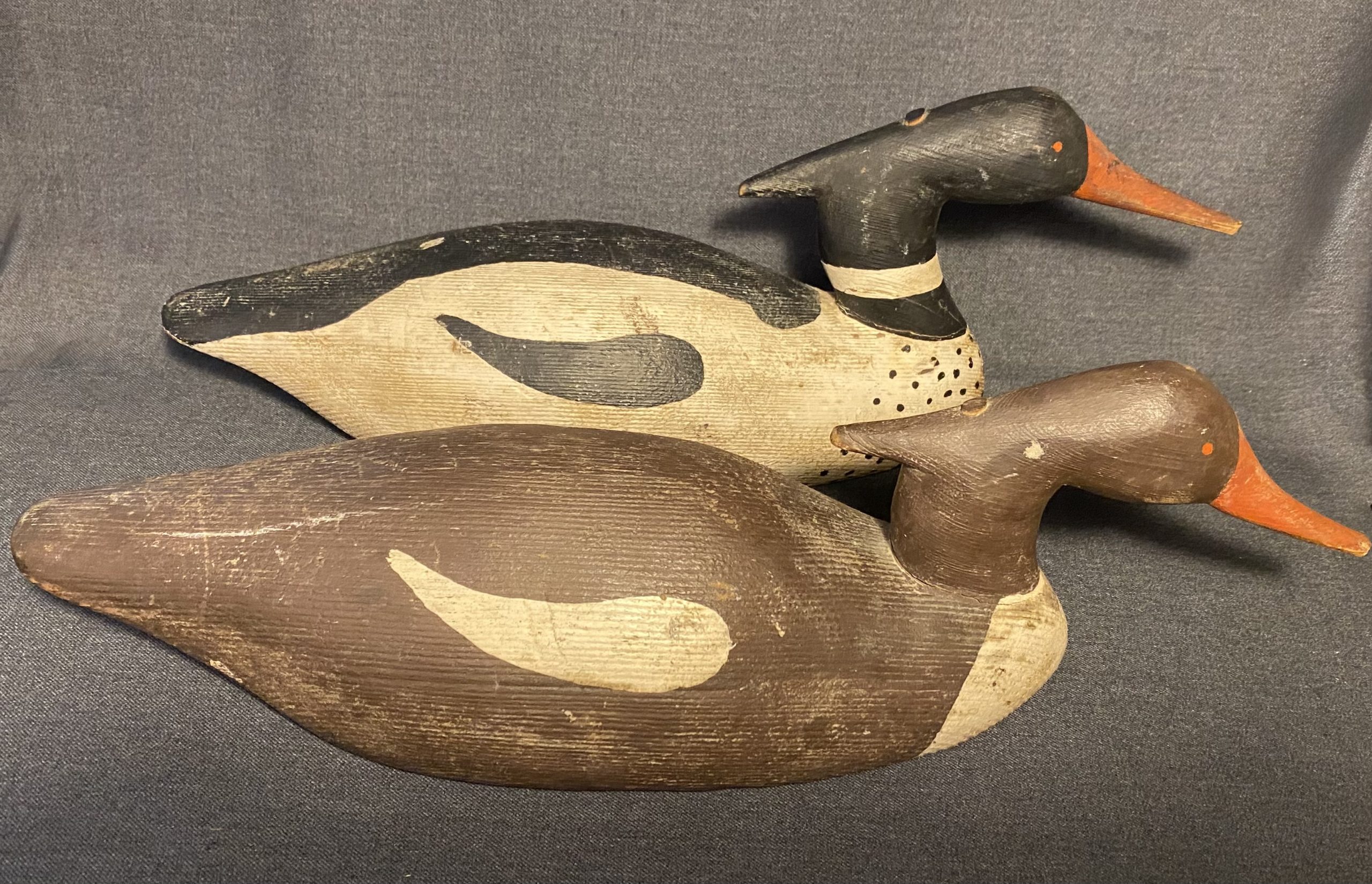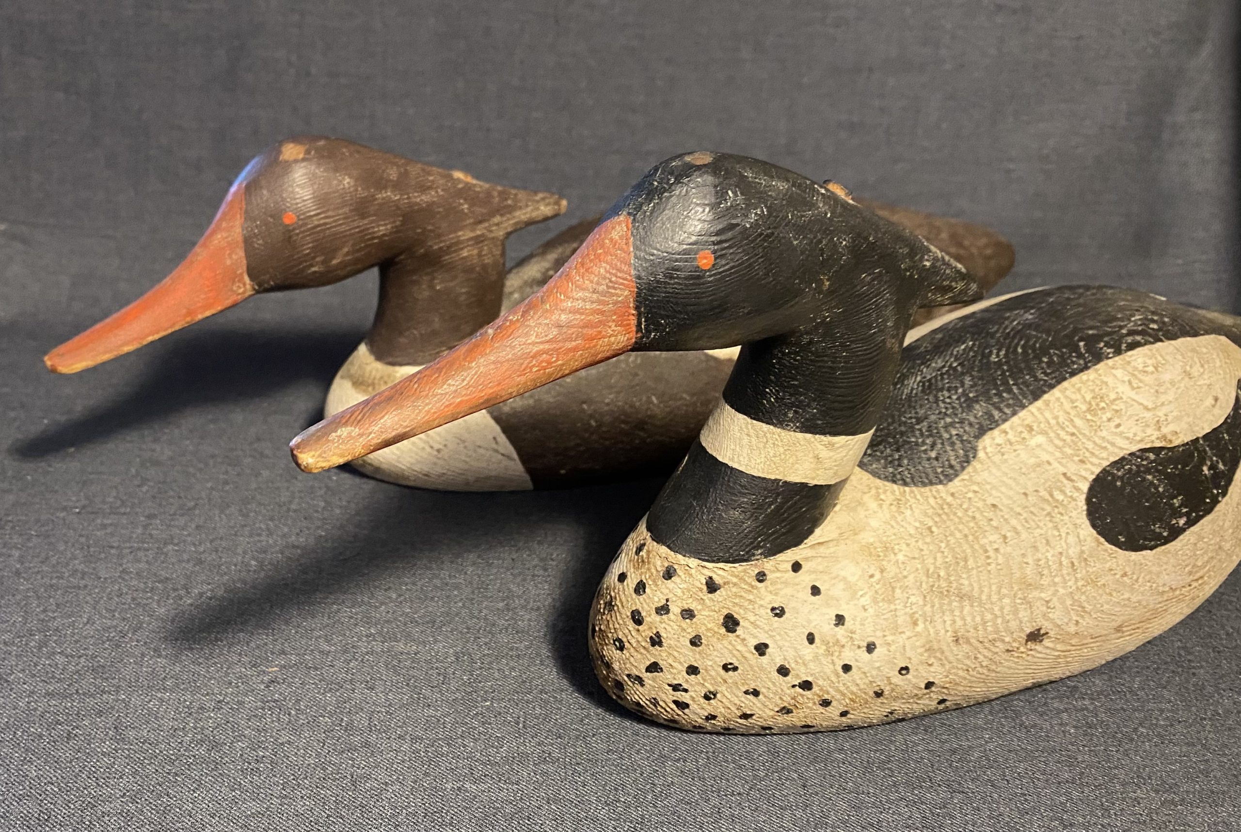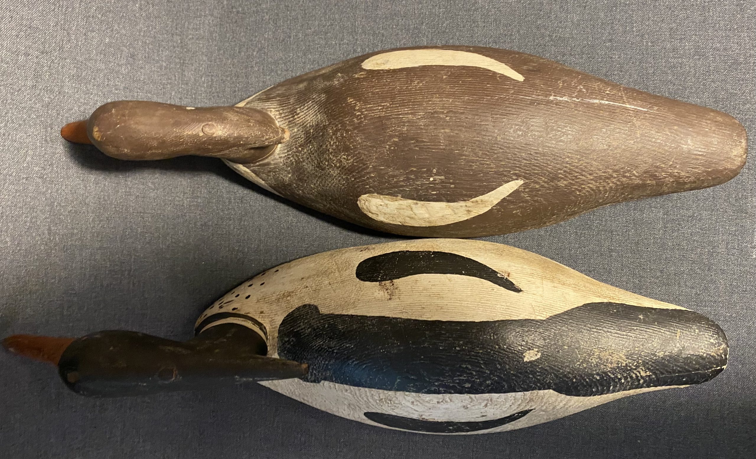 A nice, very old working pair of Merganser decoys. They have a heavy duty construction with dowels through the head atttaching it to the body.