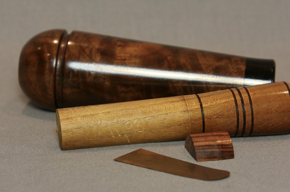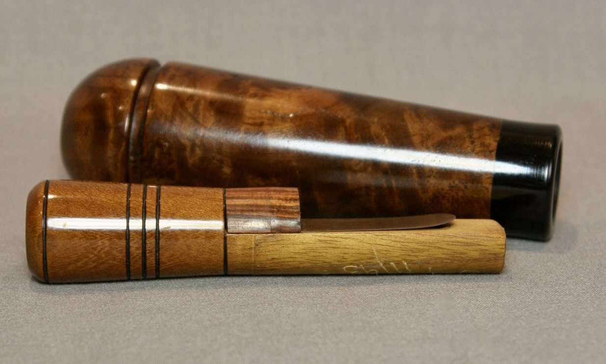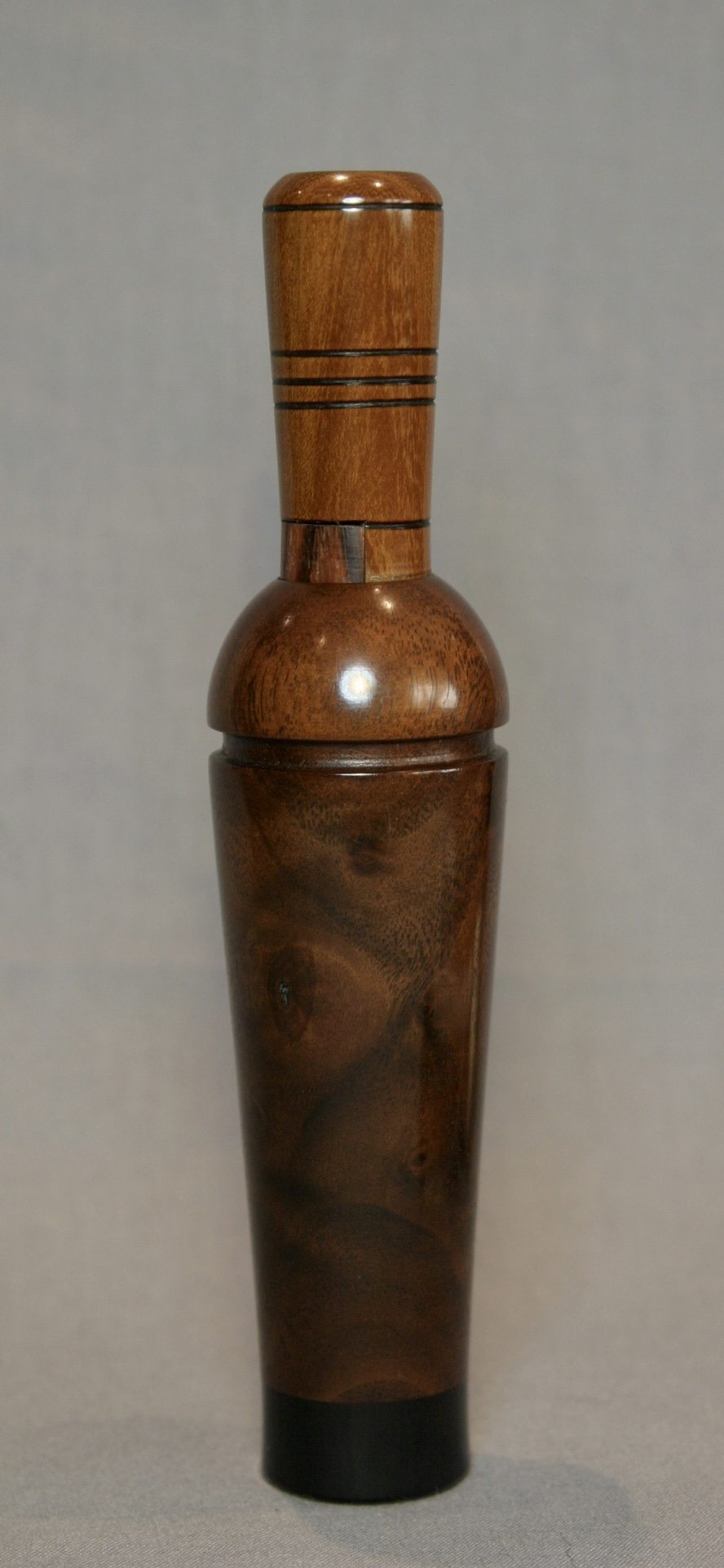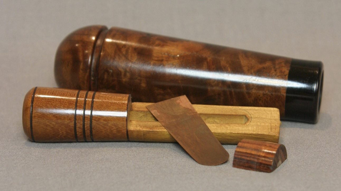 A beautiful laminated burl call from this excellent craftsman! Mike Fixter was the first to make laminated barrel calls on the West Coast. The call is reelfoot style, the stopper has a copper reed