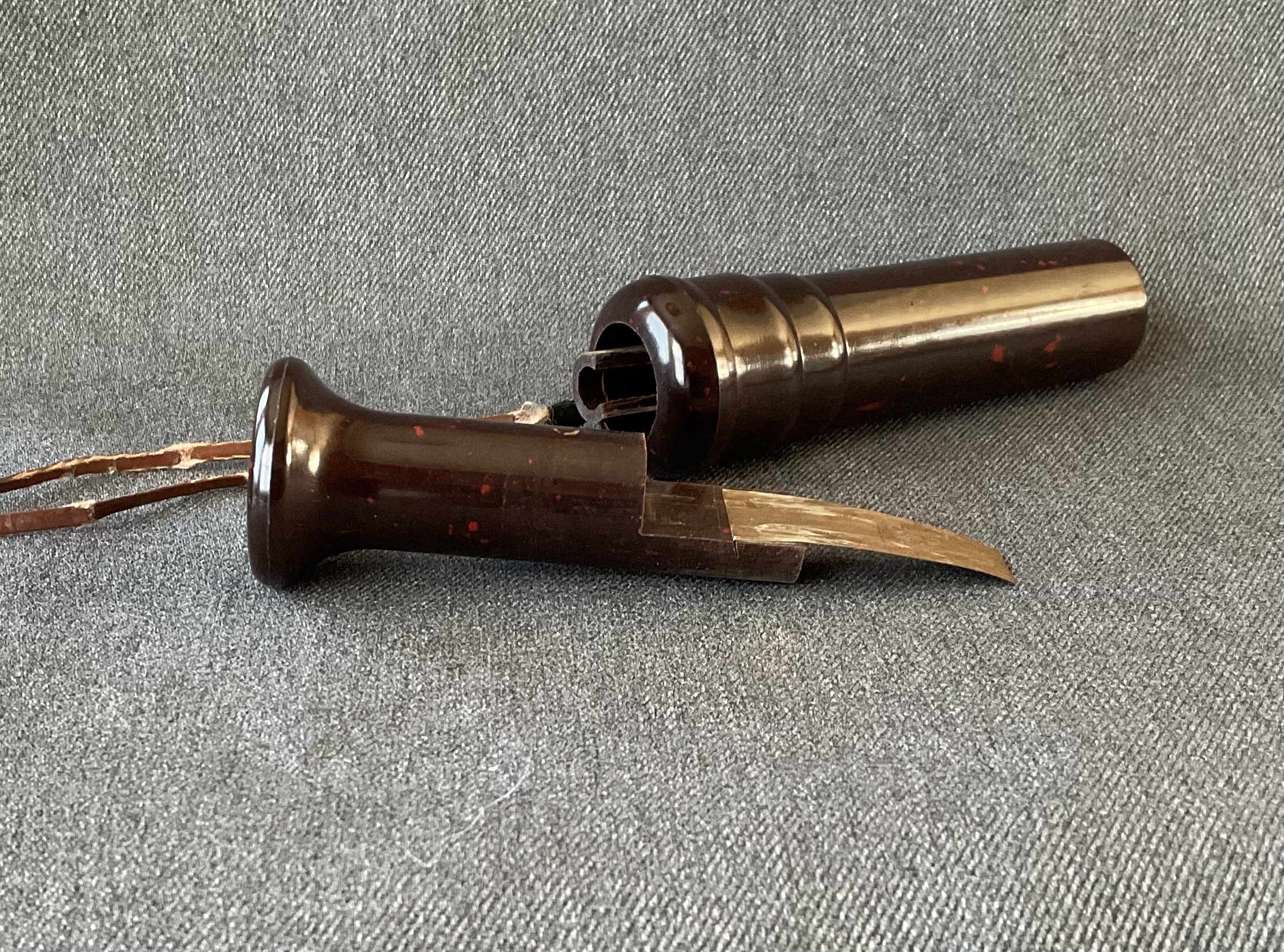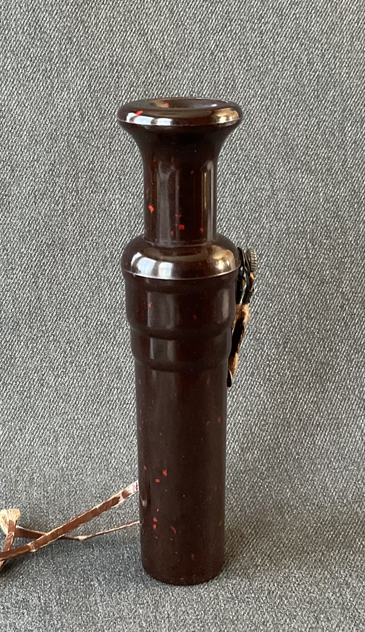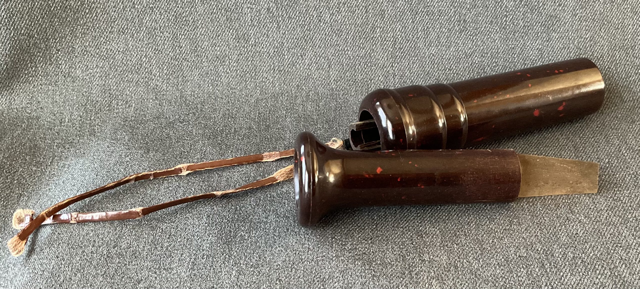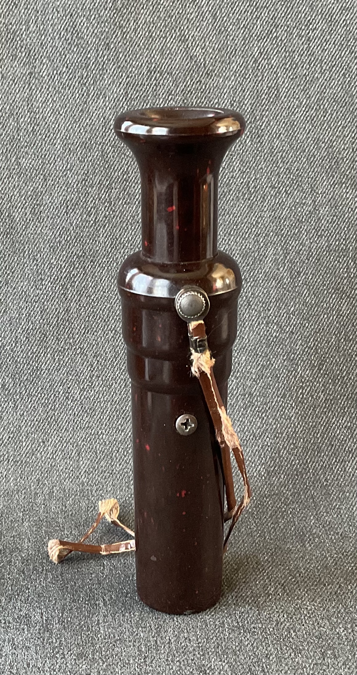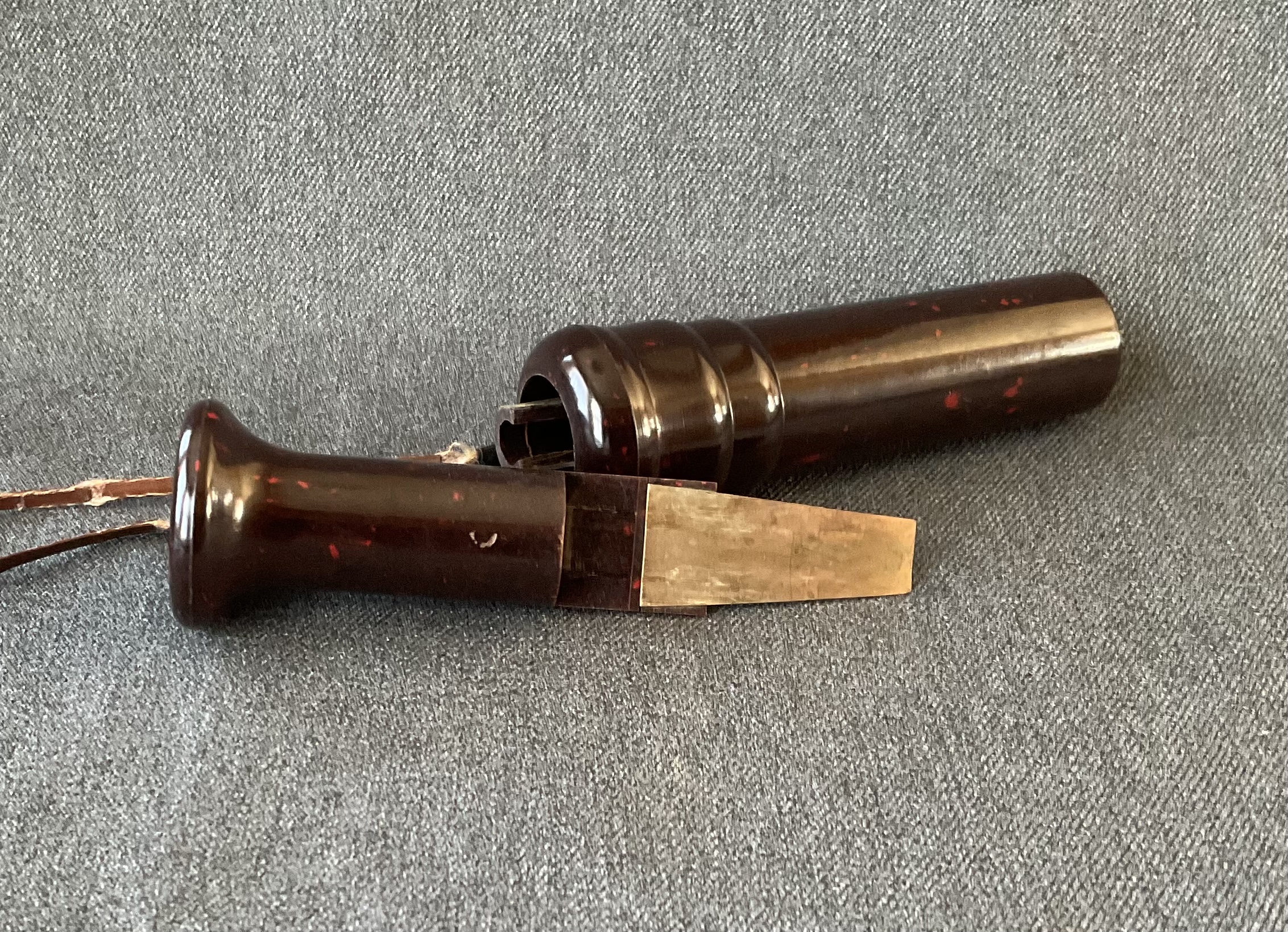 An early Illinois call, Mutone calls were made by William J. “Red” Meucci. Meucci patented the calls, patent number 2,604,731. He also made pool and billiard cues.
