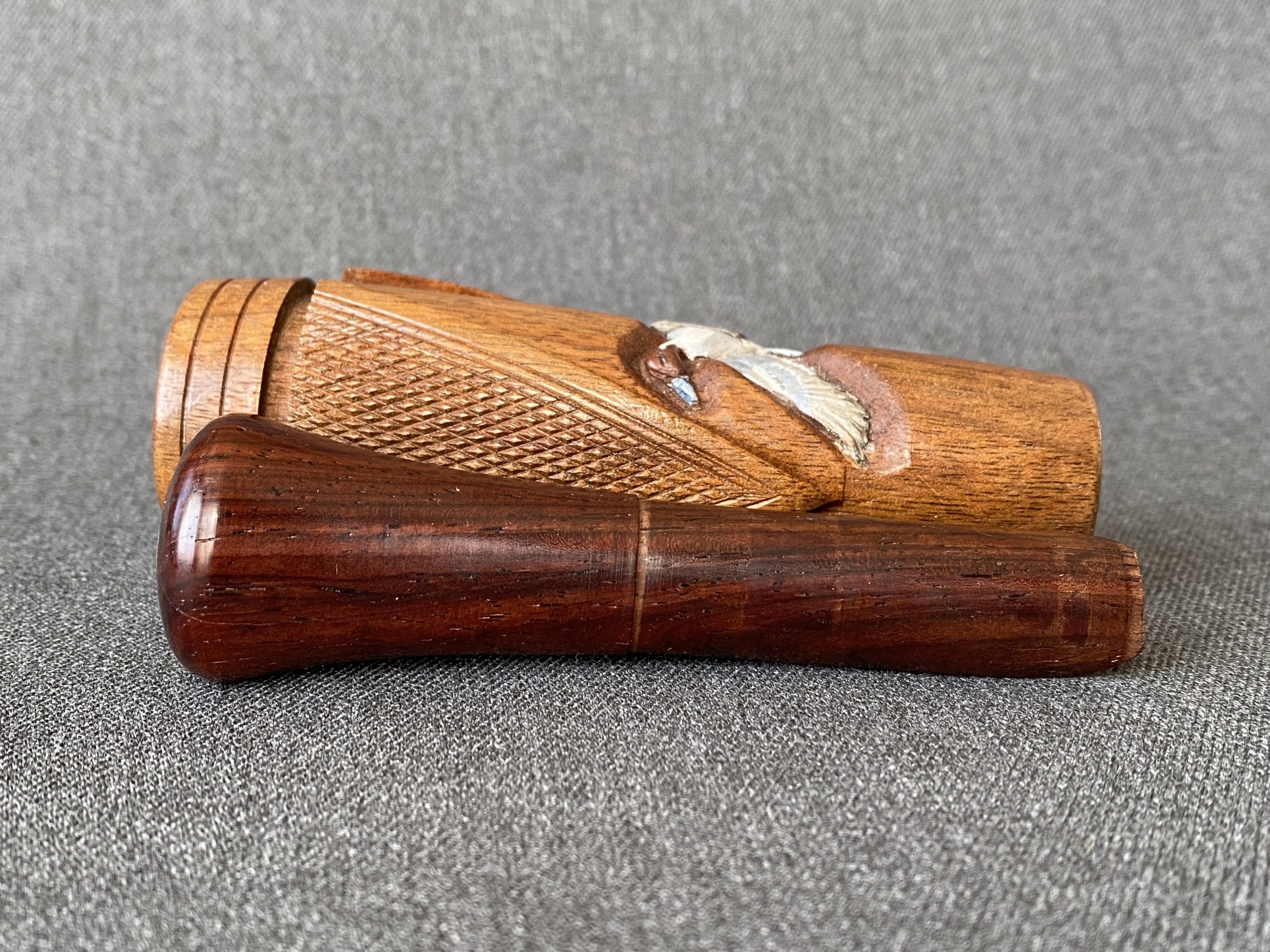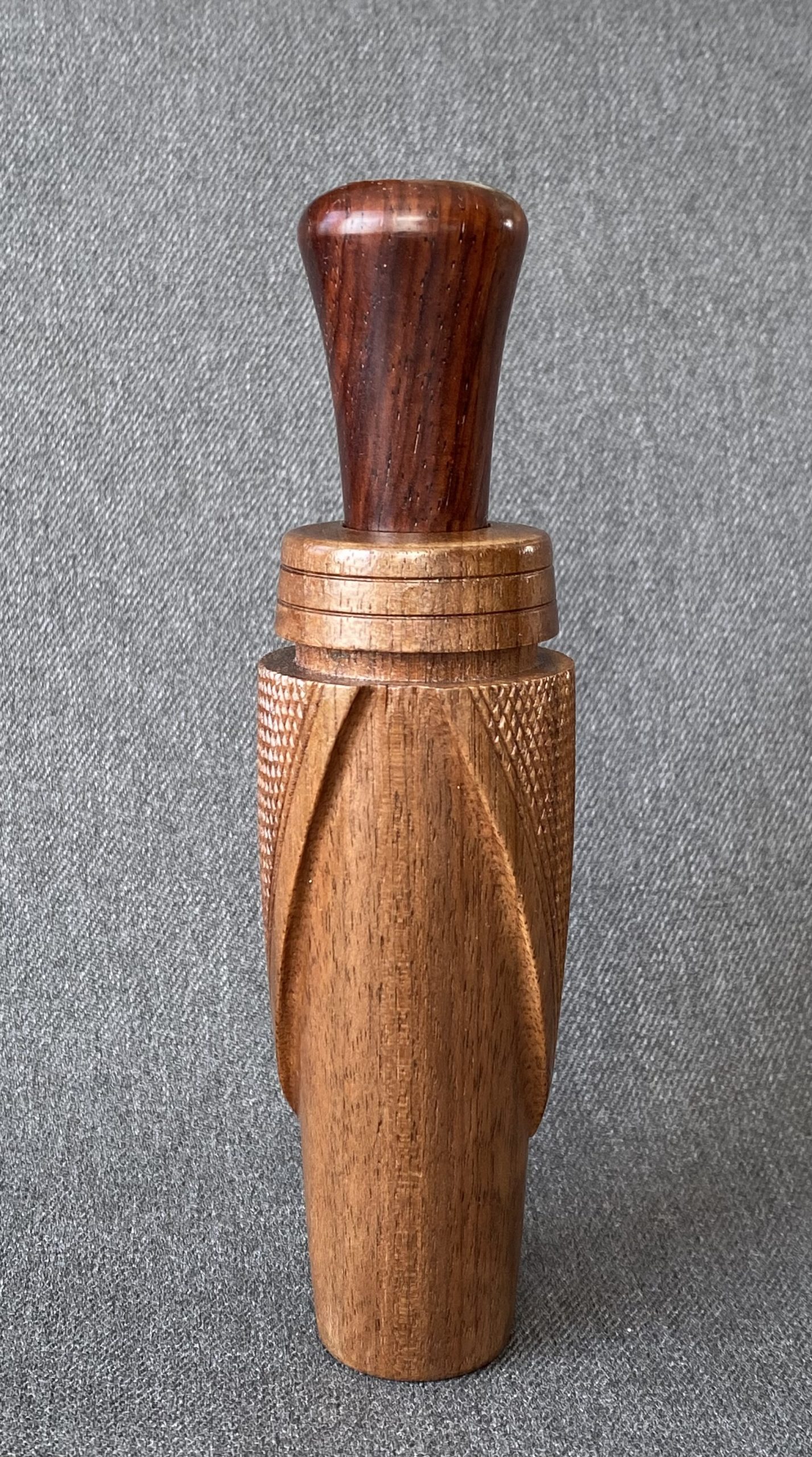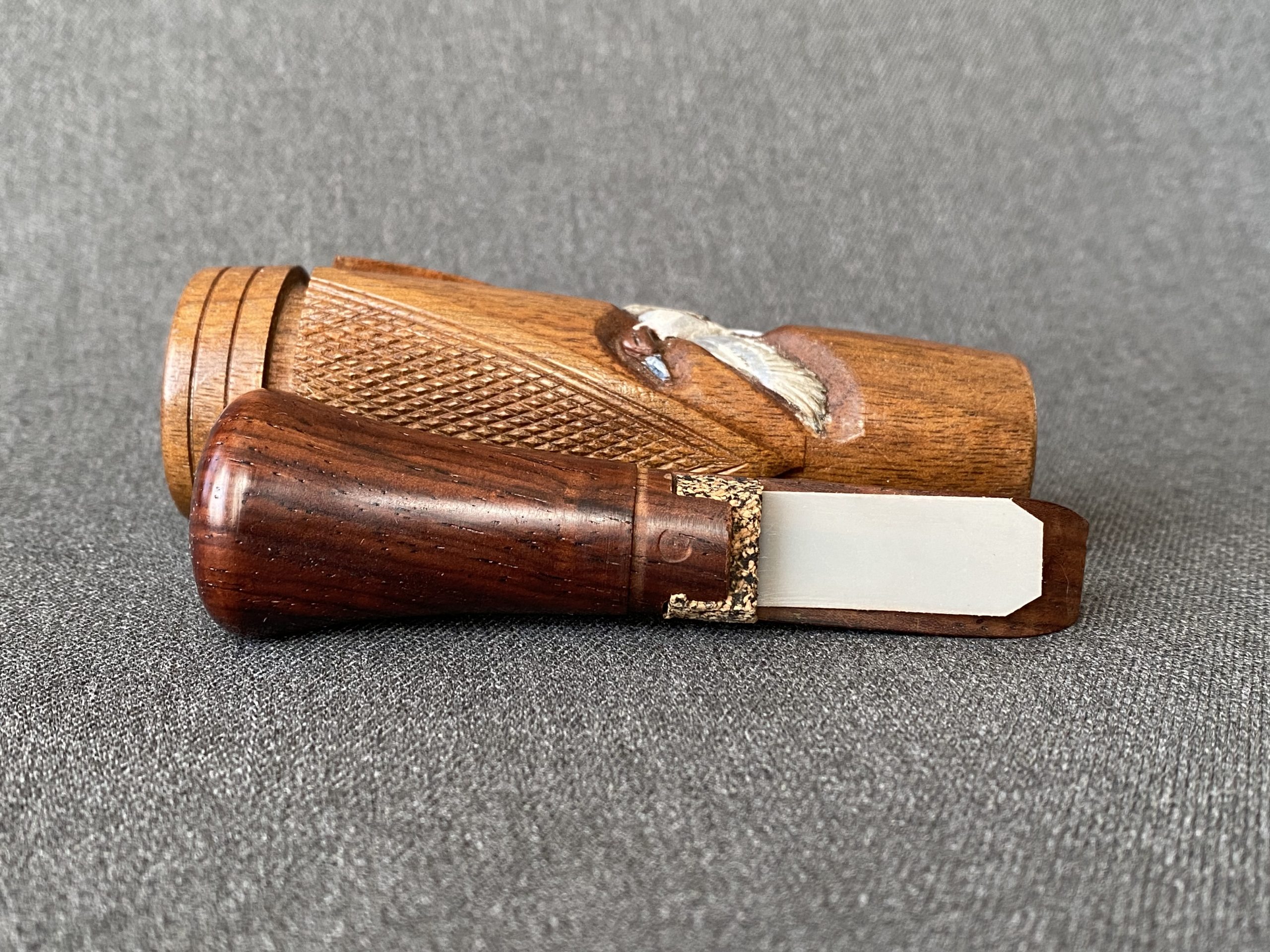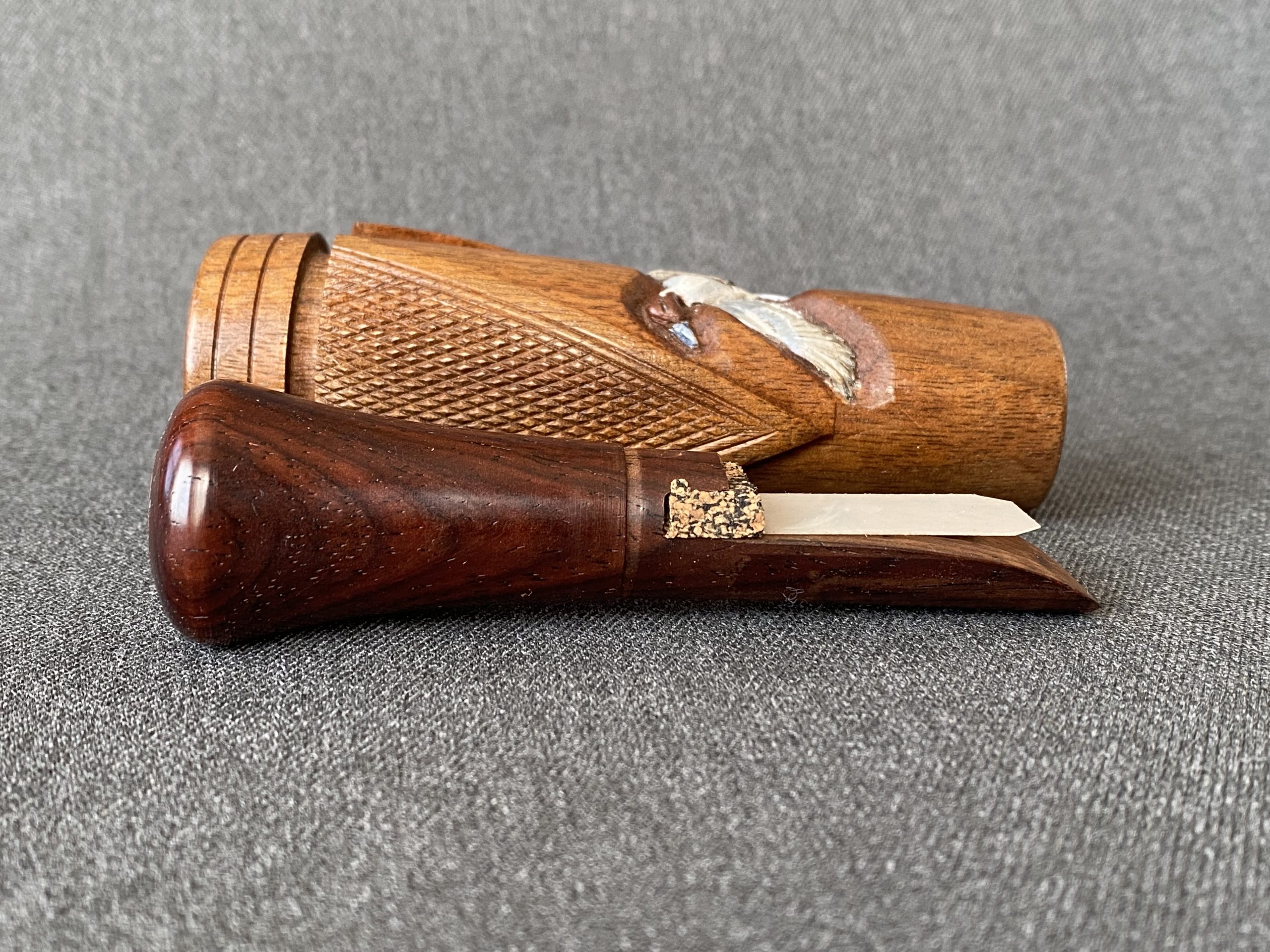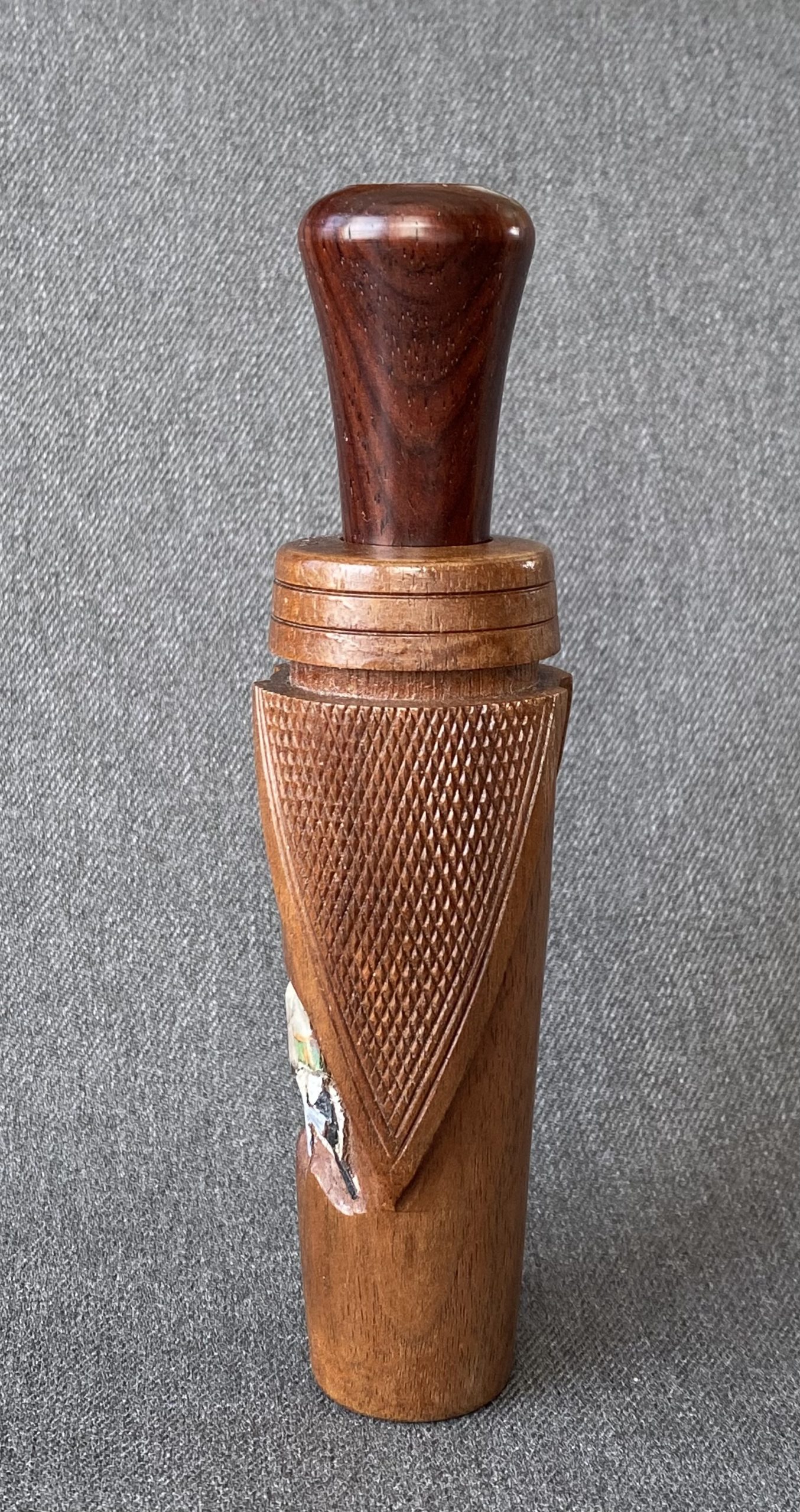 A very rare carved pintail call from Lenus O’Dean. It also has three intricately carved checkered panels This laquered walnut call is Arkansas style with a plastic reed. O’Dean’s initials are carved into the top of the barrel.