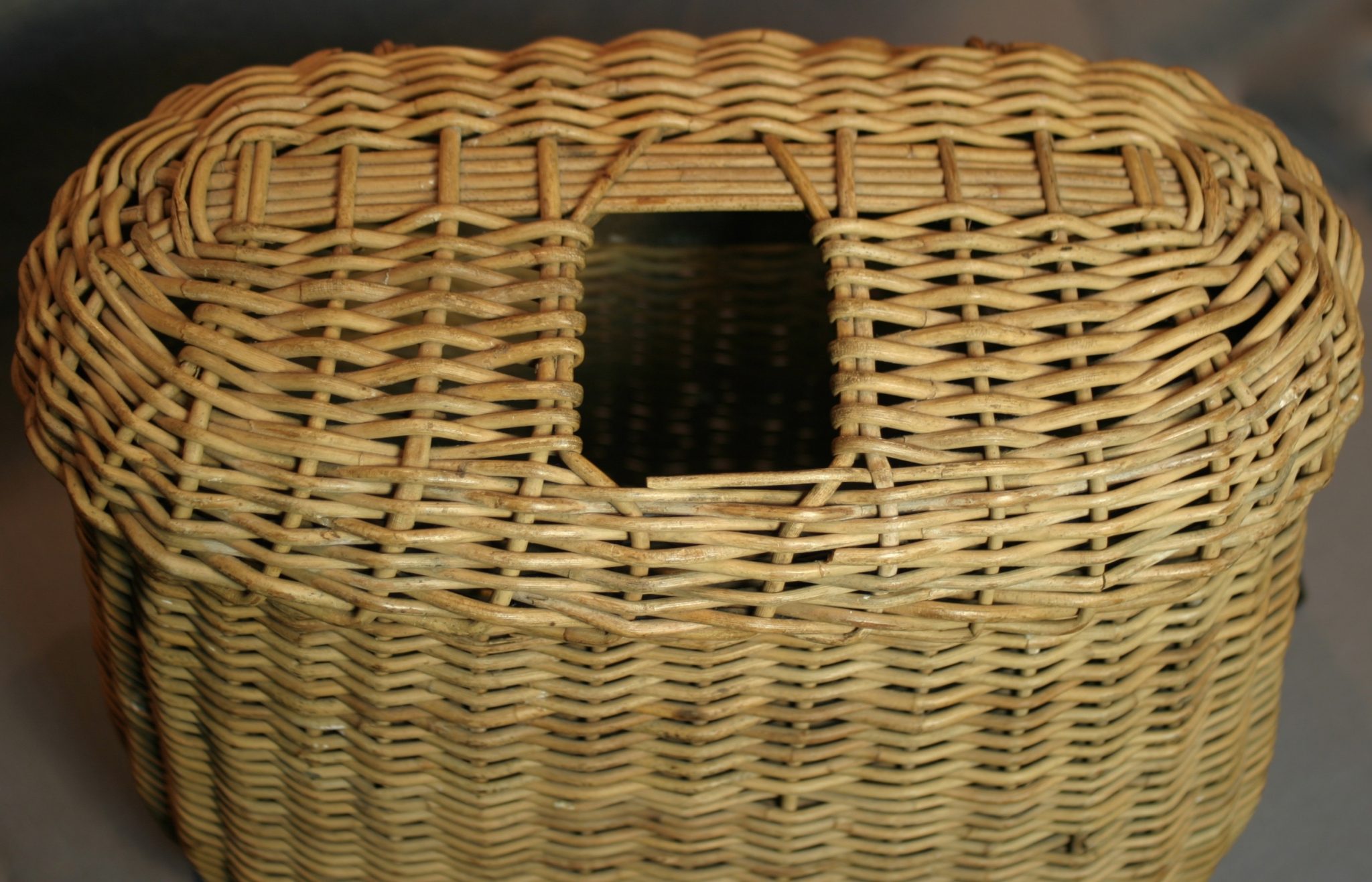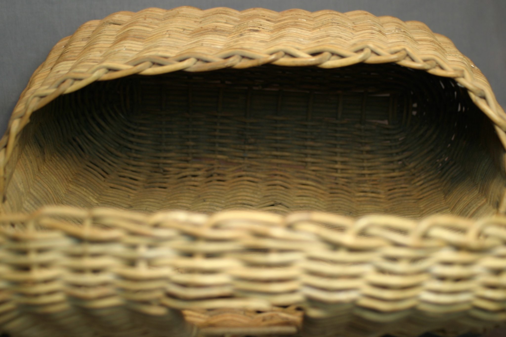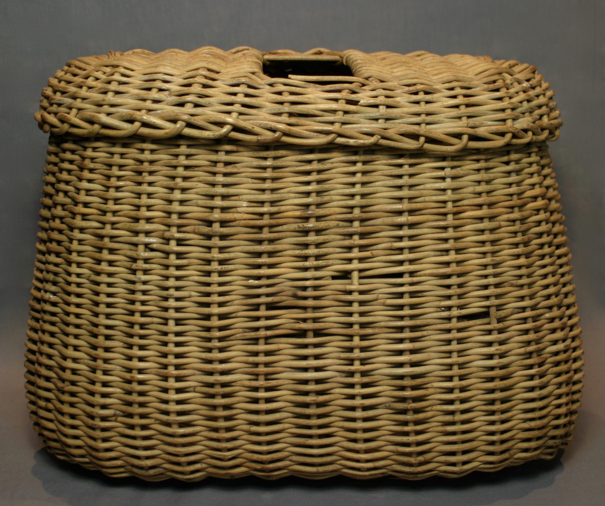 A rare center hole creel from Orvis! They were built so sturdy, advertisements stated you could drive a car over an Orvis creel and it wouldn’t crush.The creel has a leather strap held together with leather thong. The basket is in very good condition with the exception of a few small breaks in the wicker. 30Lb creel