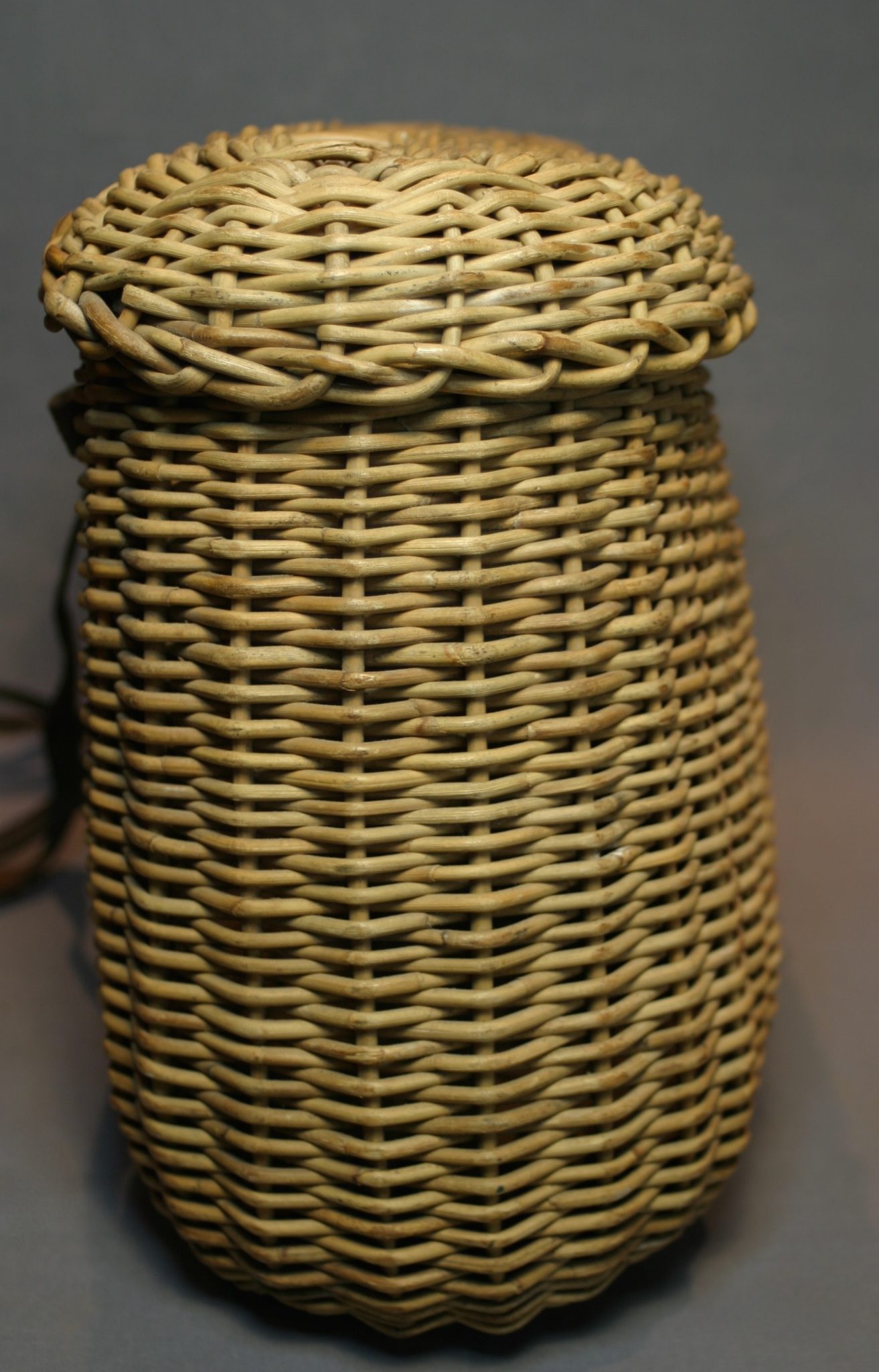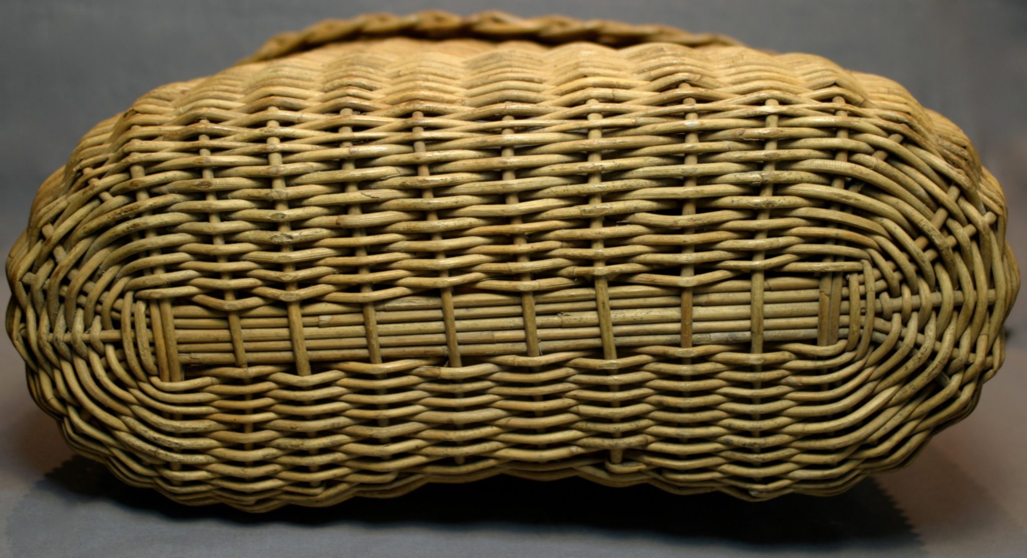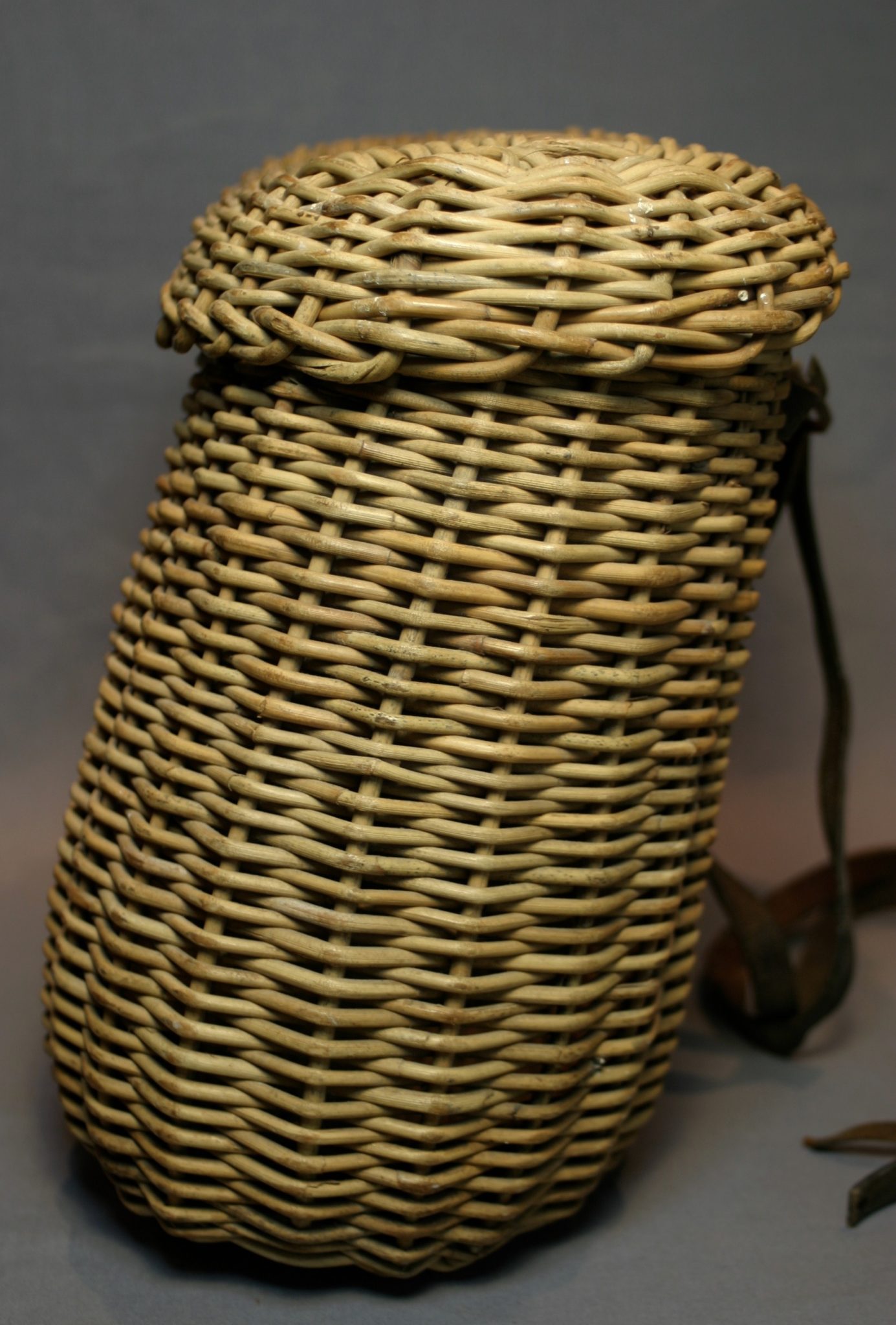 A rare center hole creel from Orvis! They were built so sturdy, advertisements stated you could drive a car over an Orvis creel and it wouldn’t crush.The creel has a leather strap held together with leather thong. The basket is in very good condition with the exception of a few small breaks in the wicker. 30Lb creel