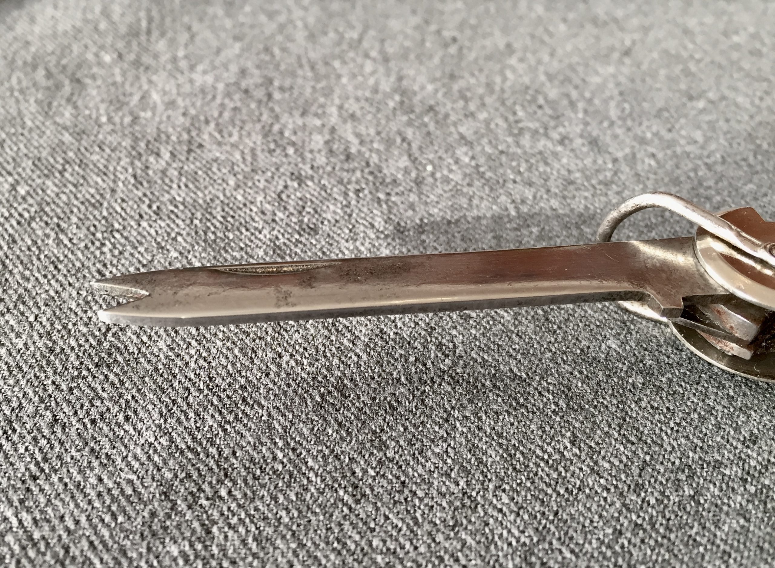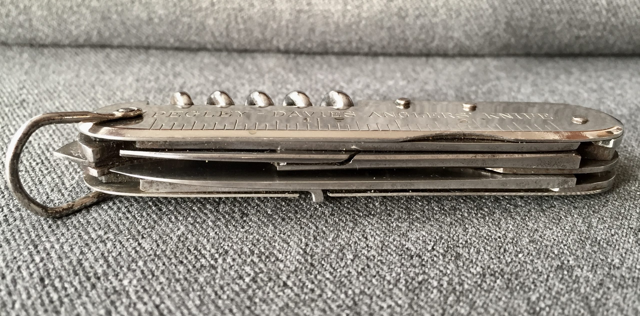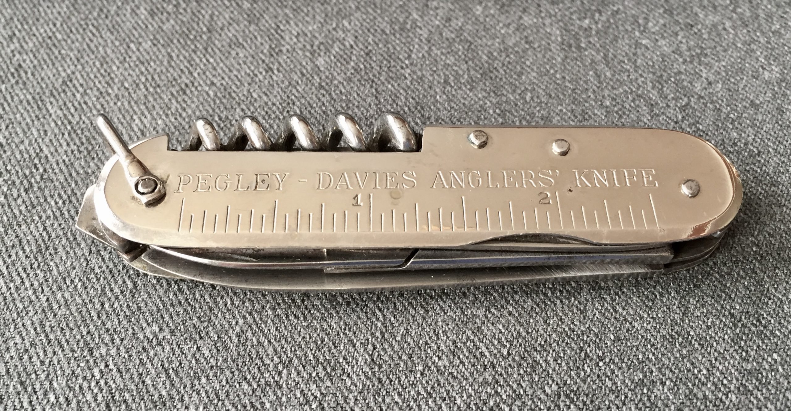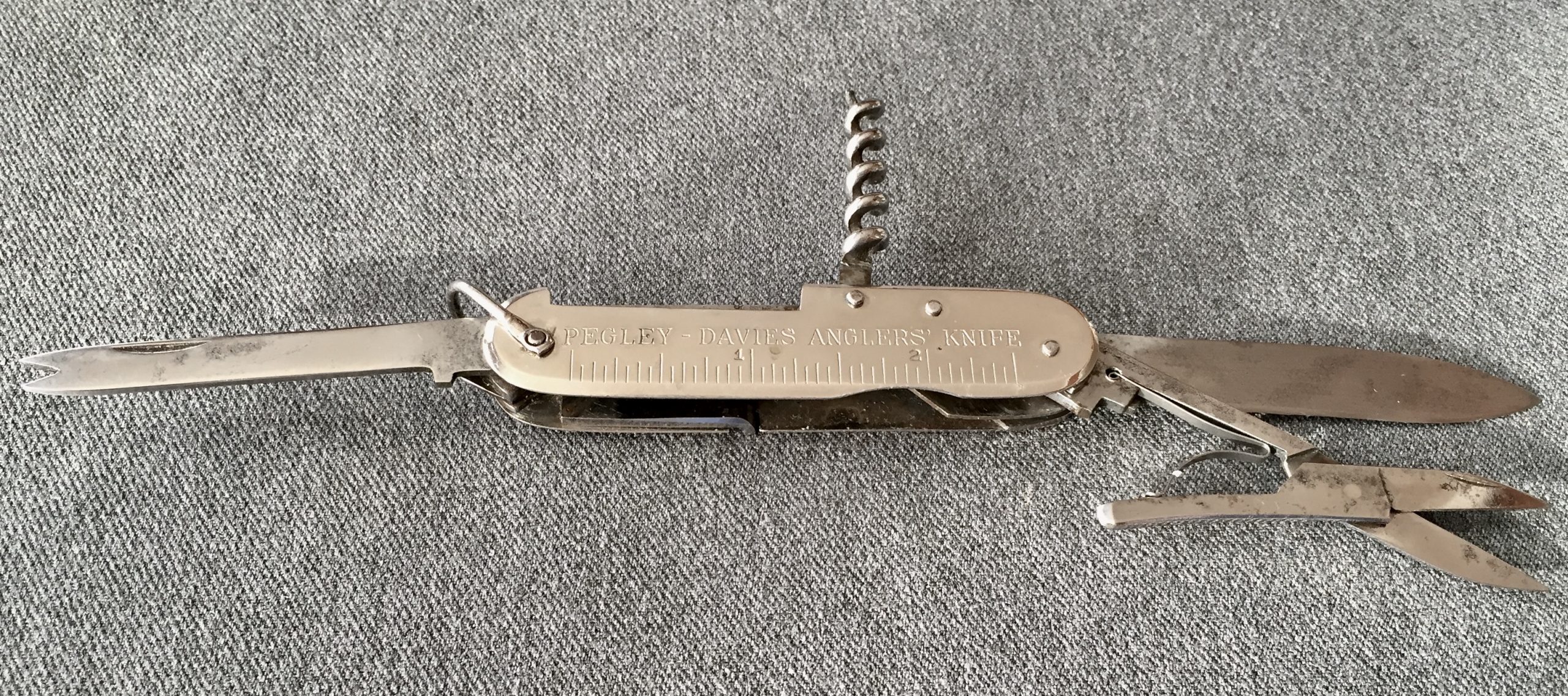 This is a great looking knife, a Pegly-Davies Angler’s knife. It’s in excellent condition! The knife has a corkscrew, blade, file, scissors, and gouger. It operates smoothly and has a good weight in hand. The blade is marked, Foreign. There is a ruler on one side and fish hook sizing on the other.