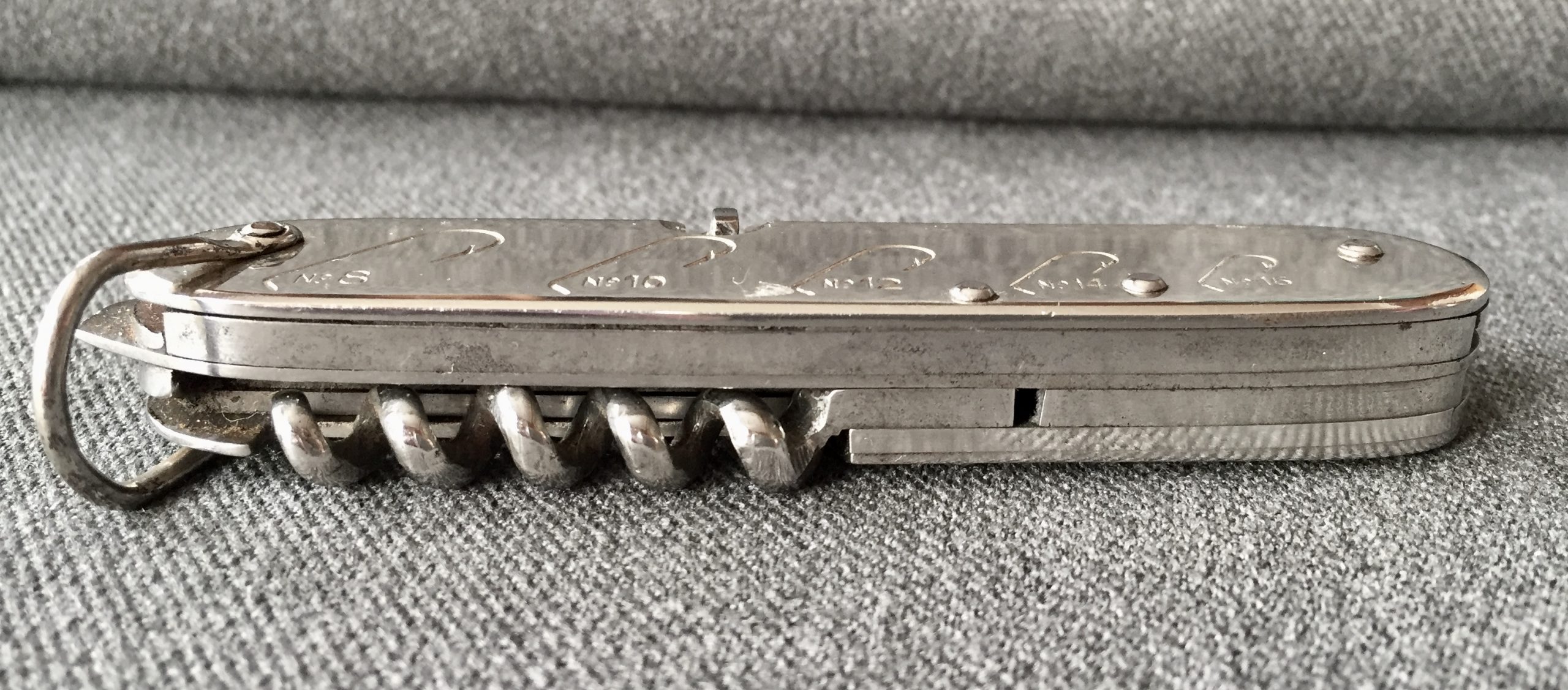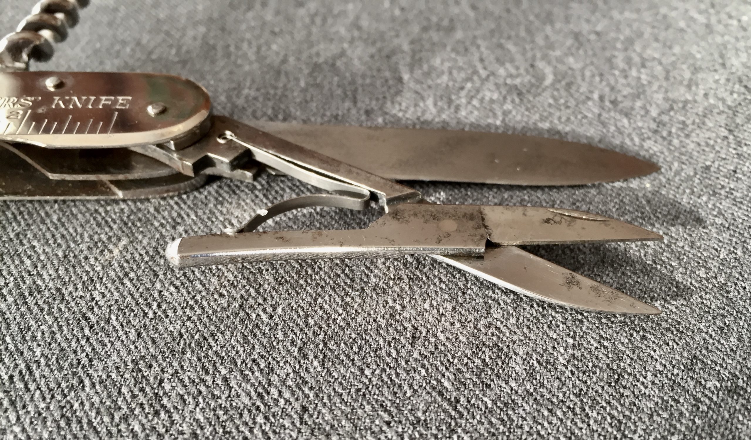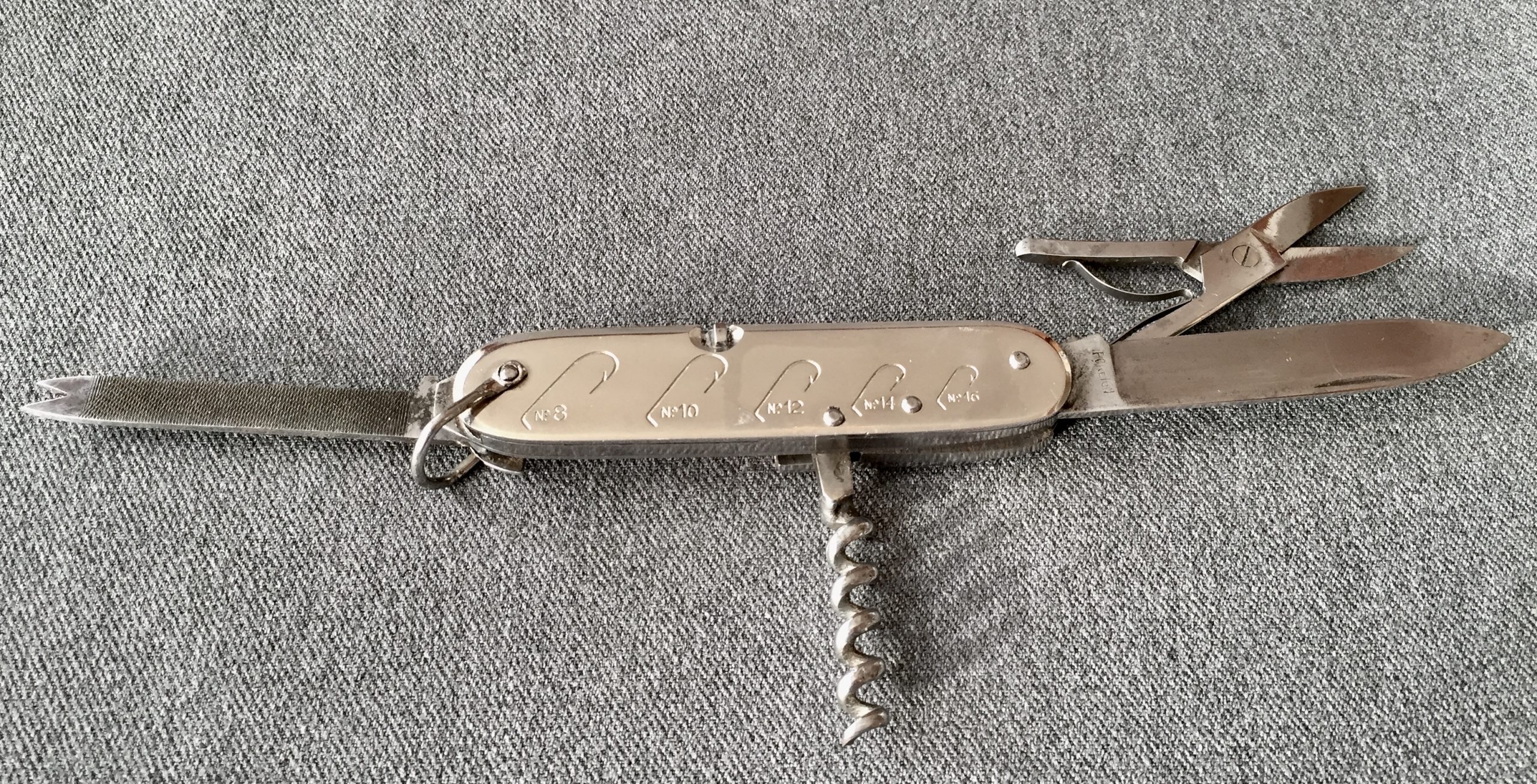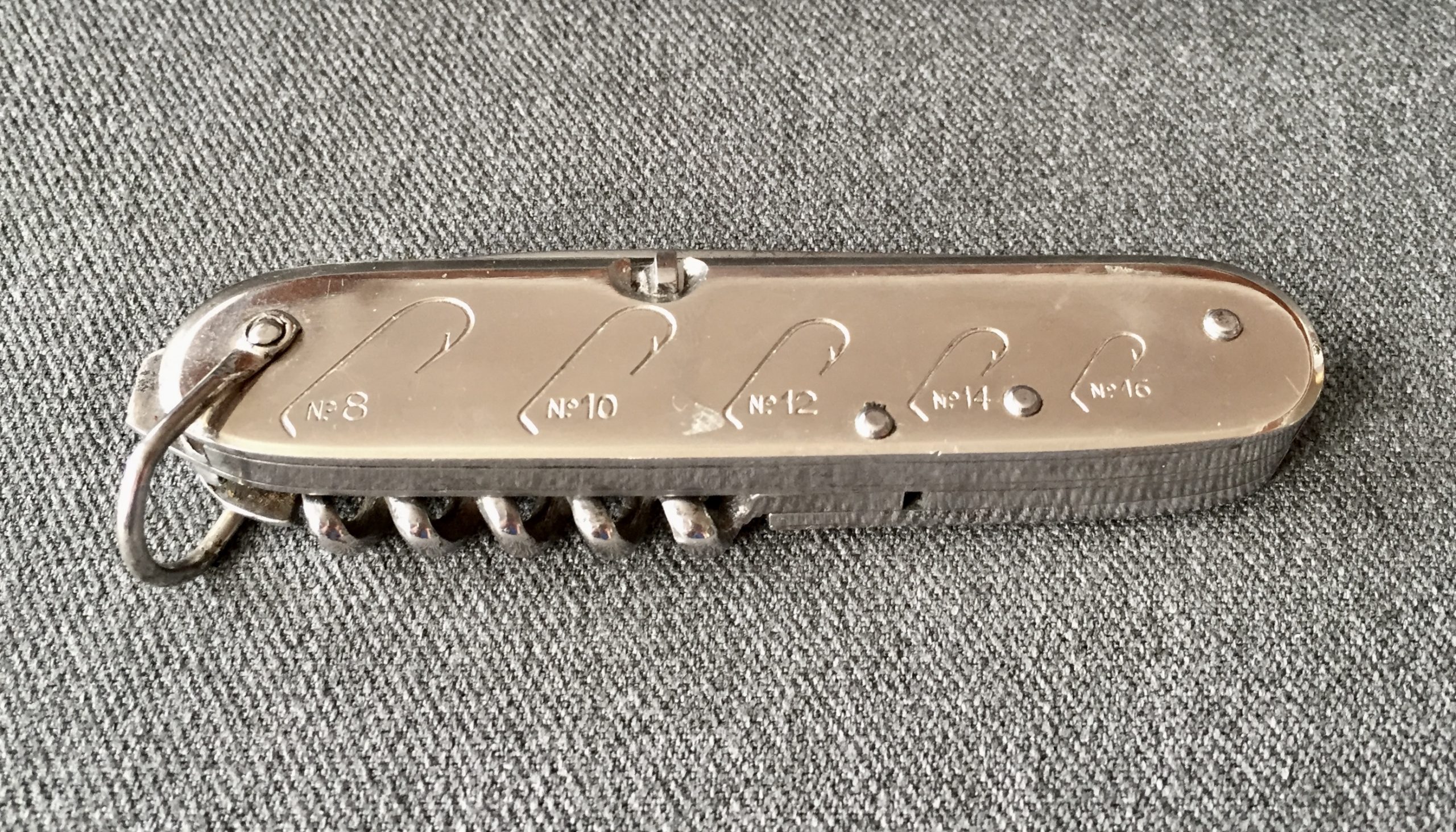 This is a great looking knife, a Pegly-Davies Angler’s knife. It’s in excellent condition! The knife has a corkscrew, blade, file, scissors, and gouger. It operates smoothly and has a good weight in hand. The blade is marked, Foreign. There is a ruler on one side and fish hook sizing on the other.