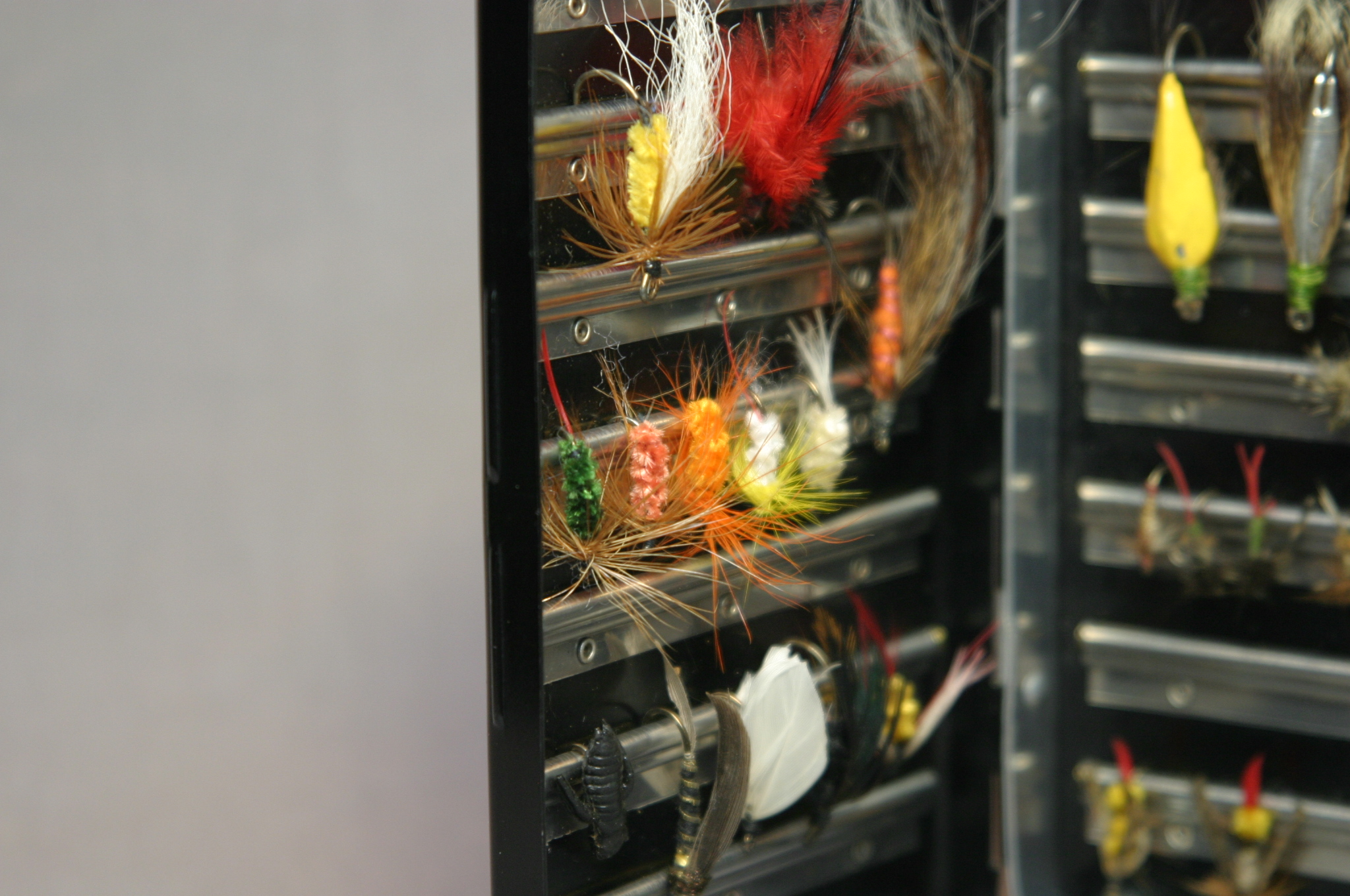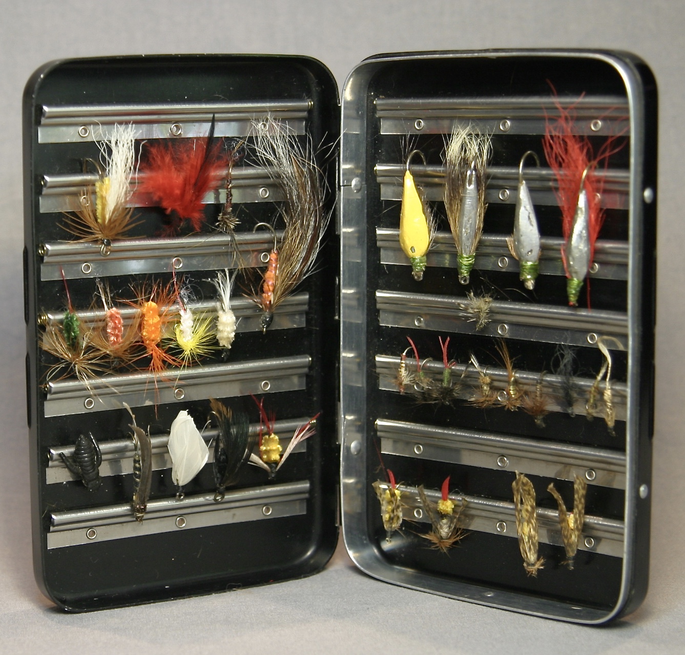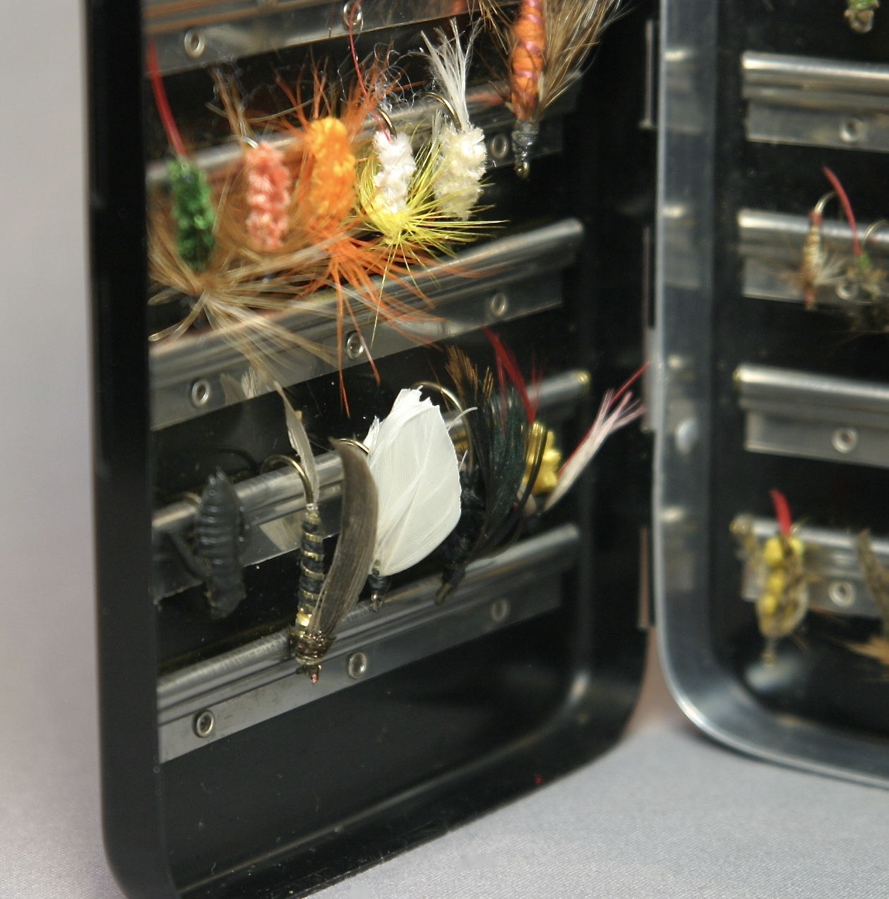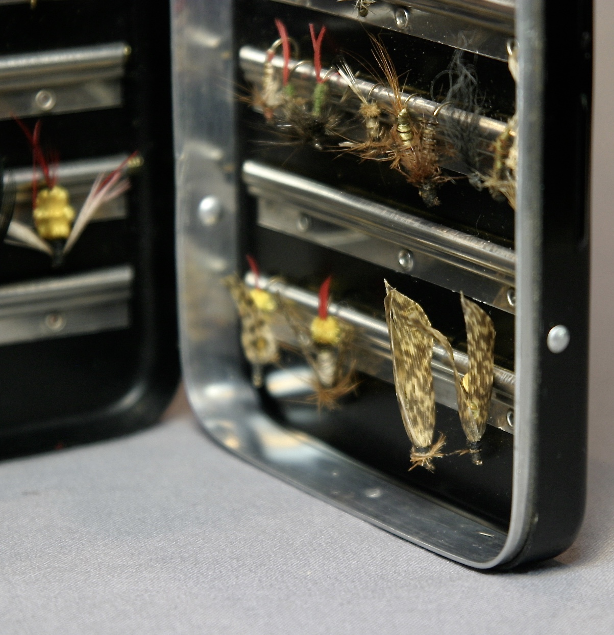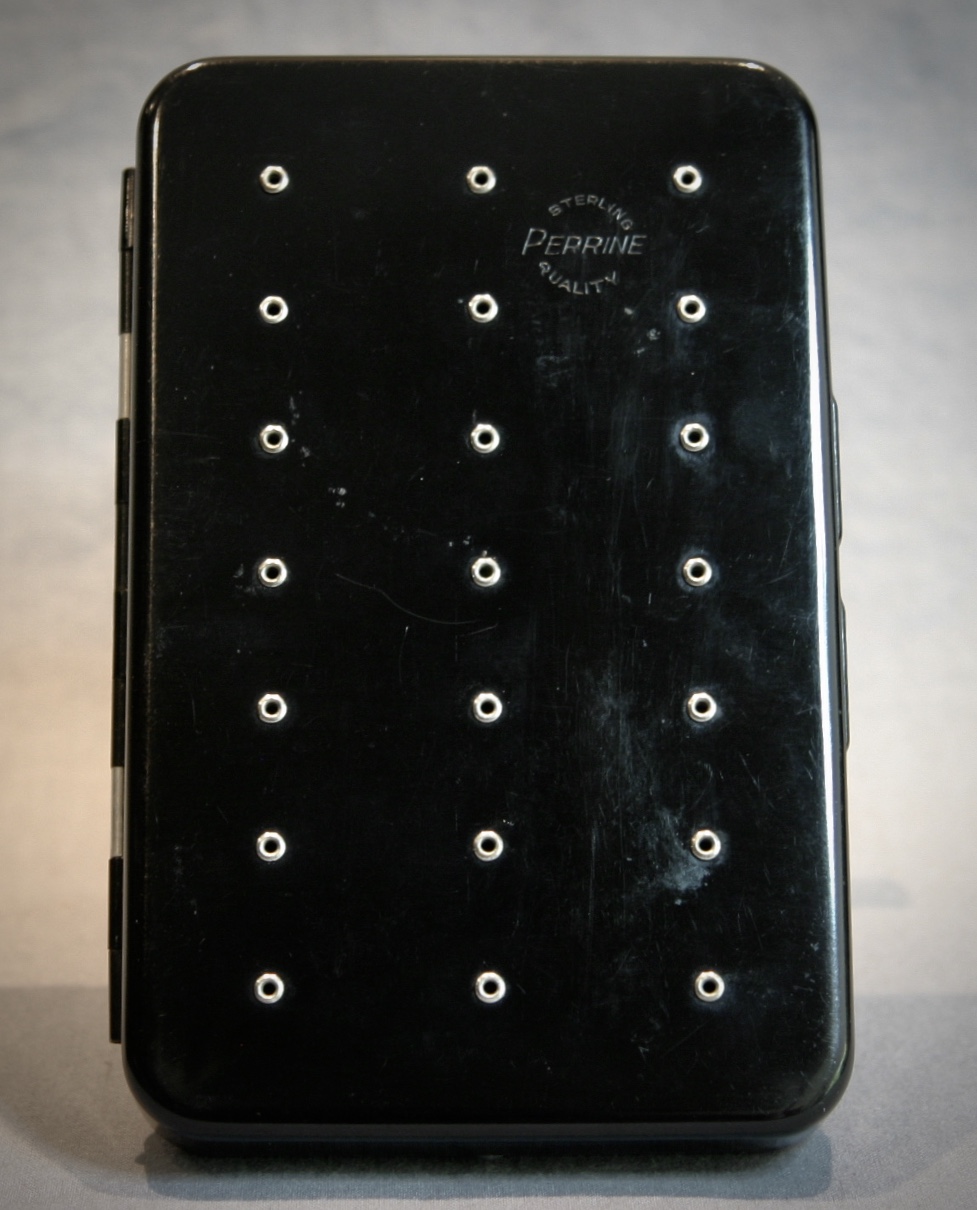 This is a very nice fly box from Perrine. The box is jet black composite with perforations. The holes are reinforced by metal grommets which also attach the metal strips on the inside of the box. The metal strips are like little ledges with spring inserts. The flies stay securely attached and are easy to remove. There is a metal band that reinforces the entire box.