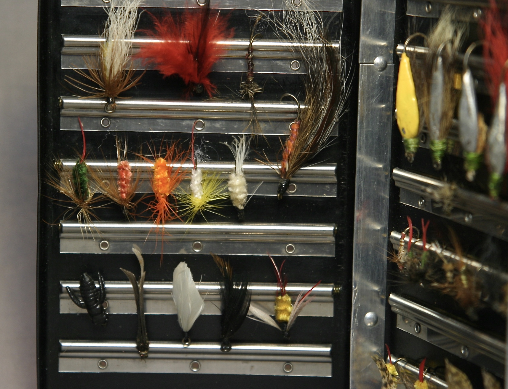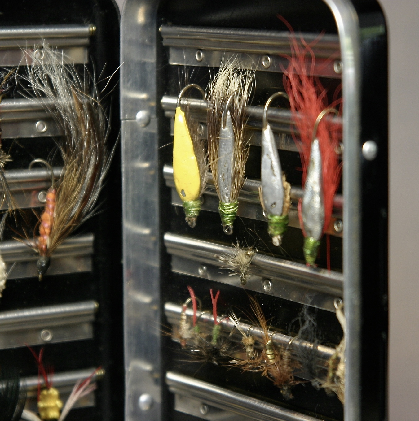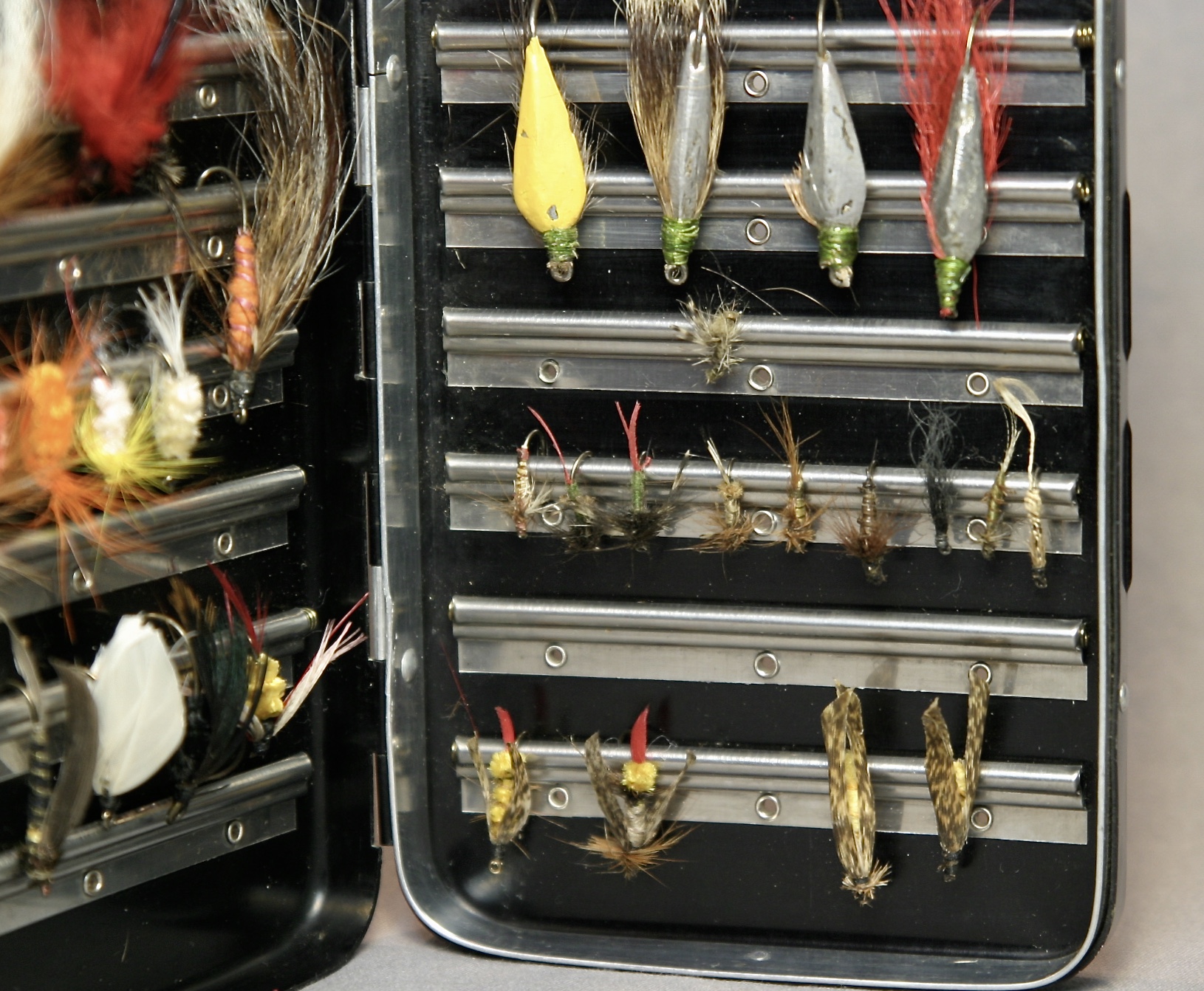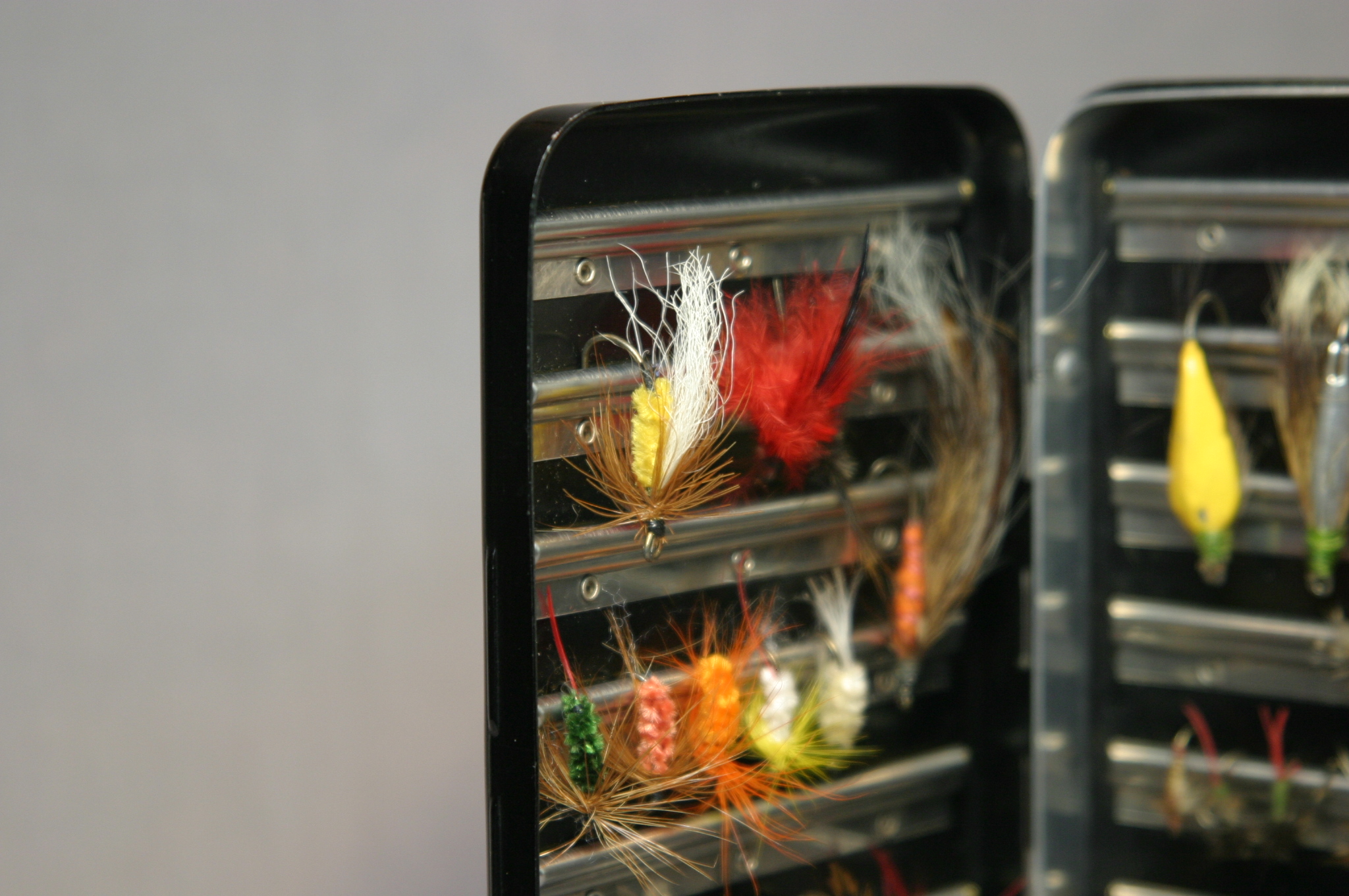 This is a very nice fly box from Perrine. The box is jet black composite with perforations. The holes are reinforced by metal grommets which also attach the metal strips on the inside of the box. The metal strips are like little ledges with spring inserts. The flies stay securely attached and are easy to remove. There is a metal band that reinforces the entire box.