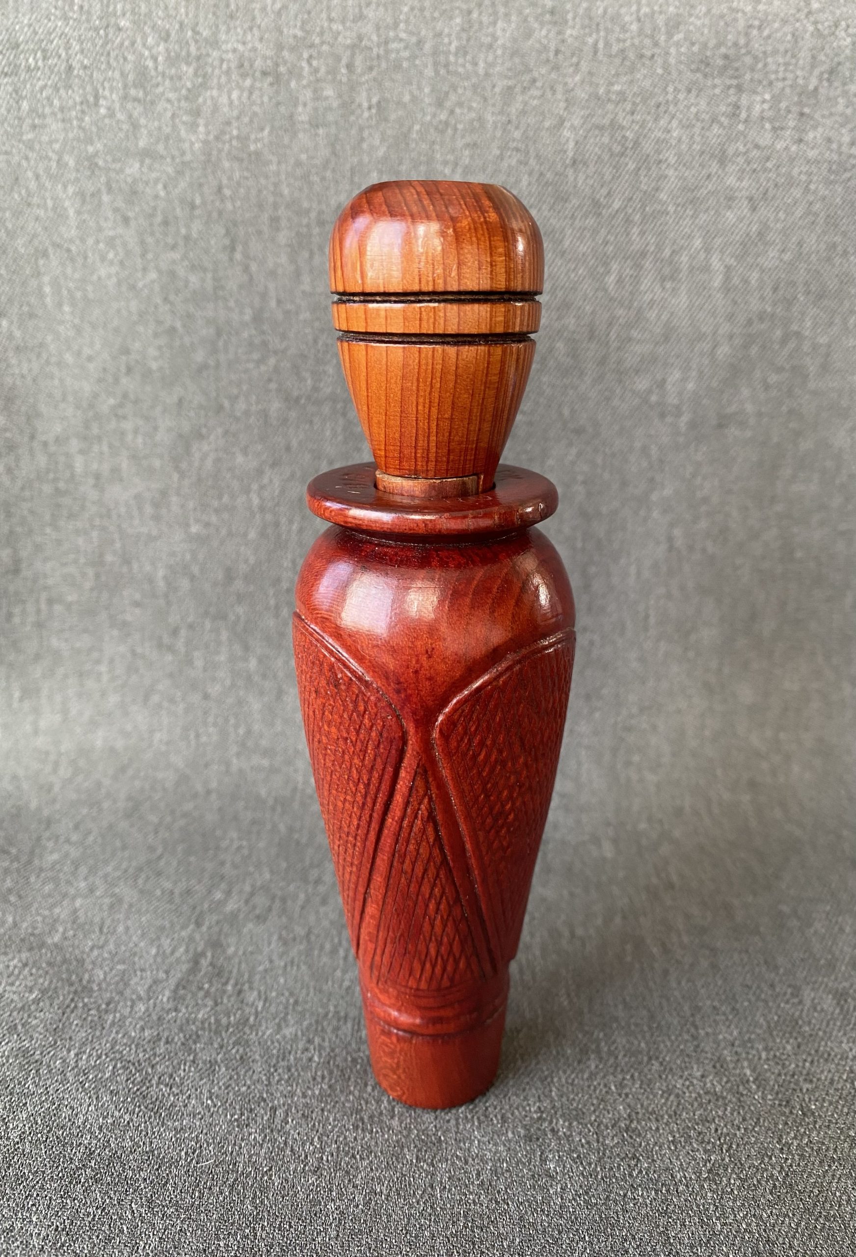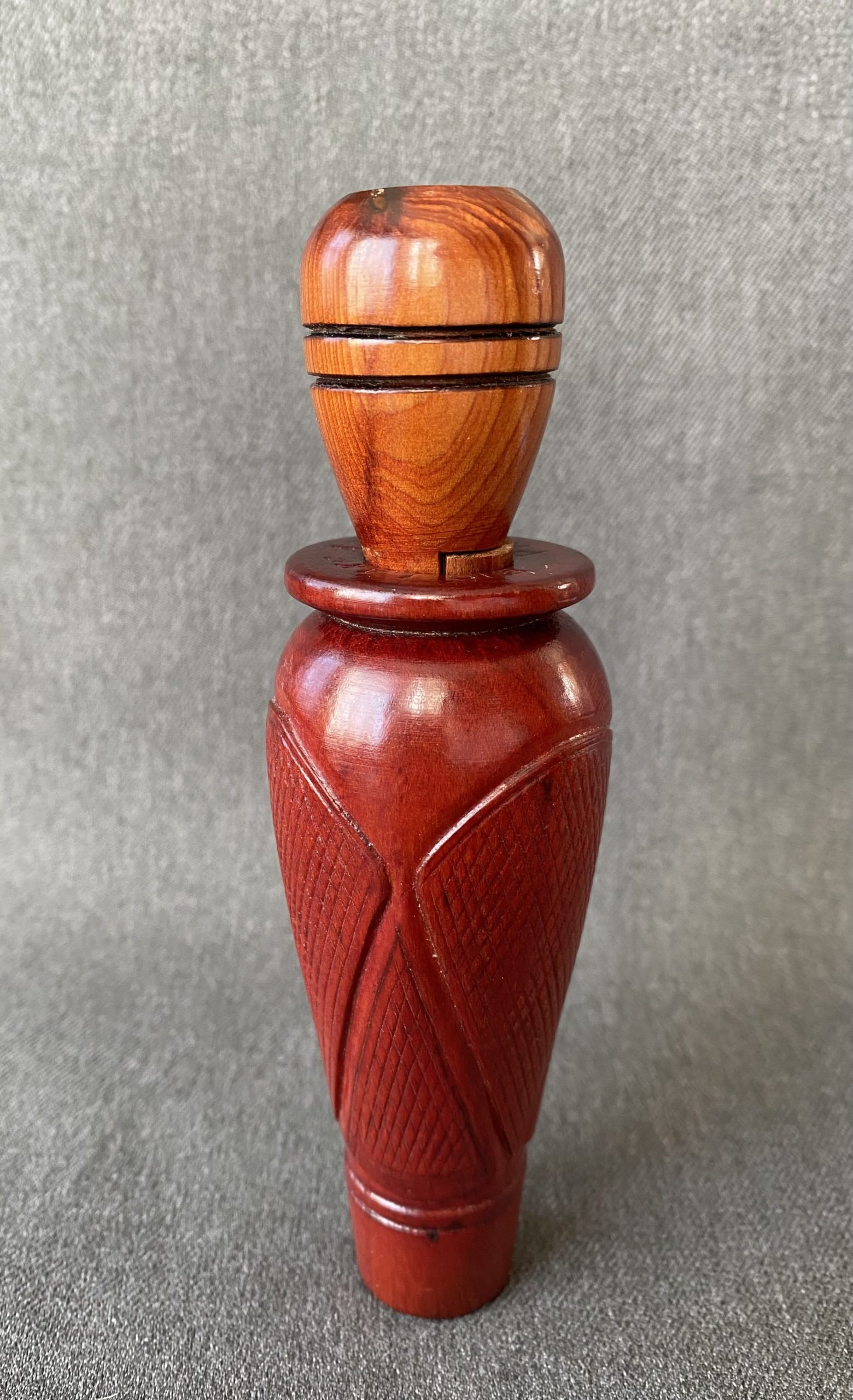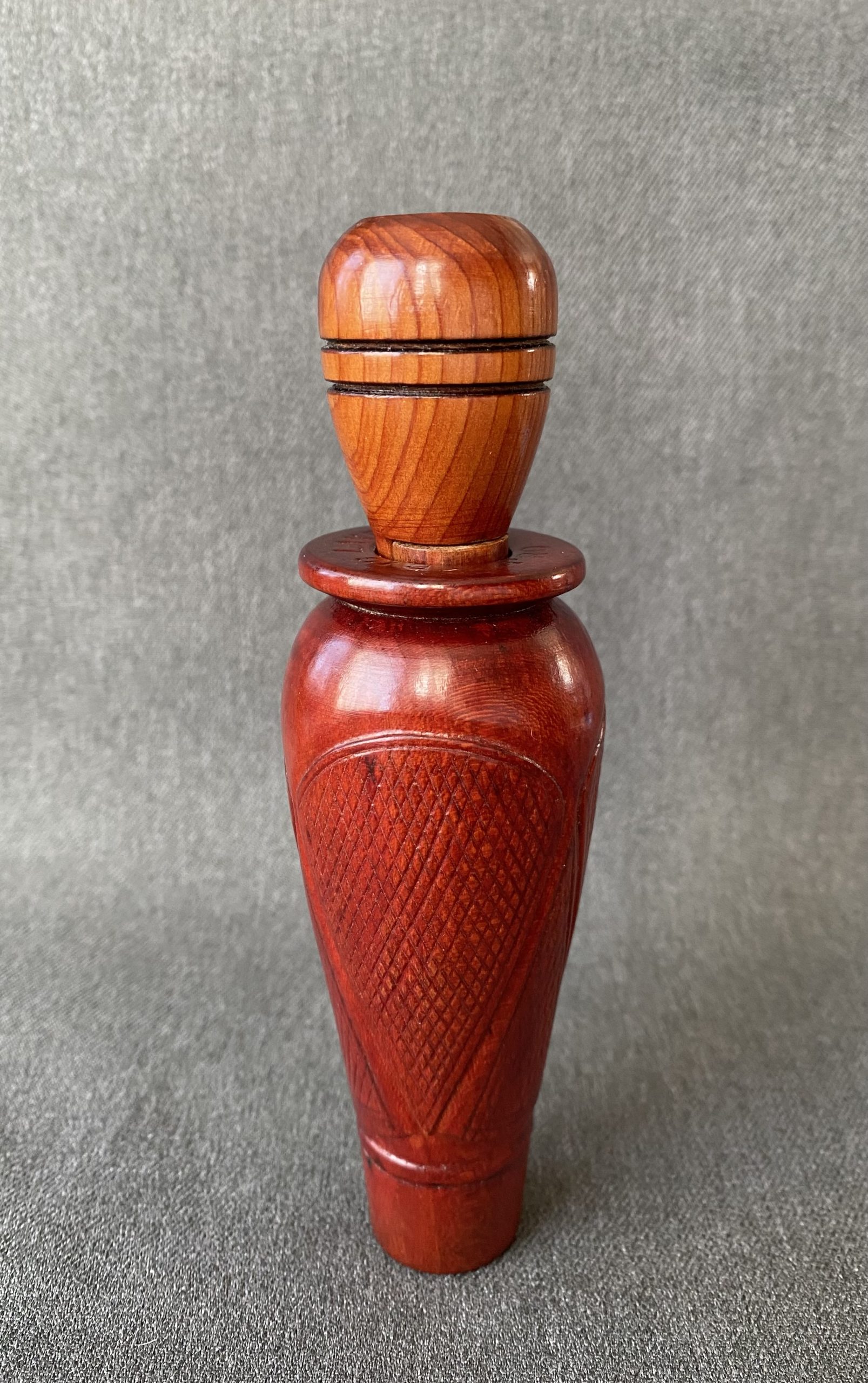A beautiful three paneled checkered call from Lowell Polston. The call is Reelfoot style and has a brass reed.
