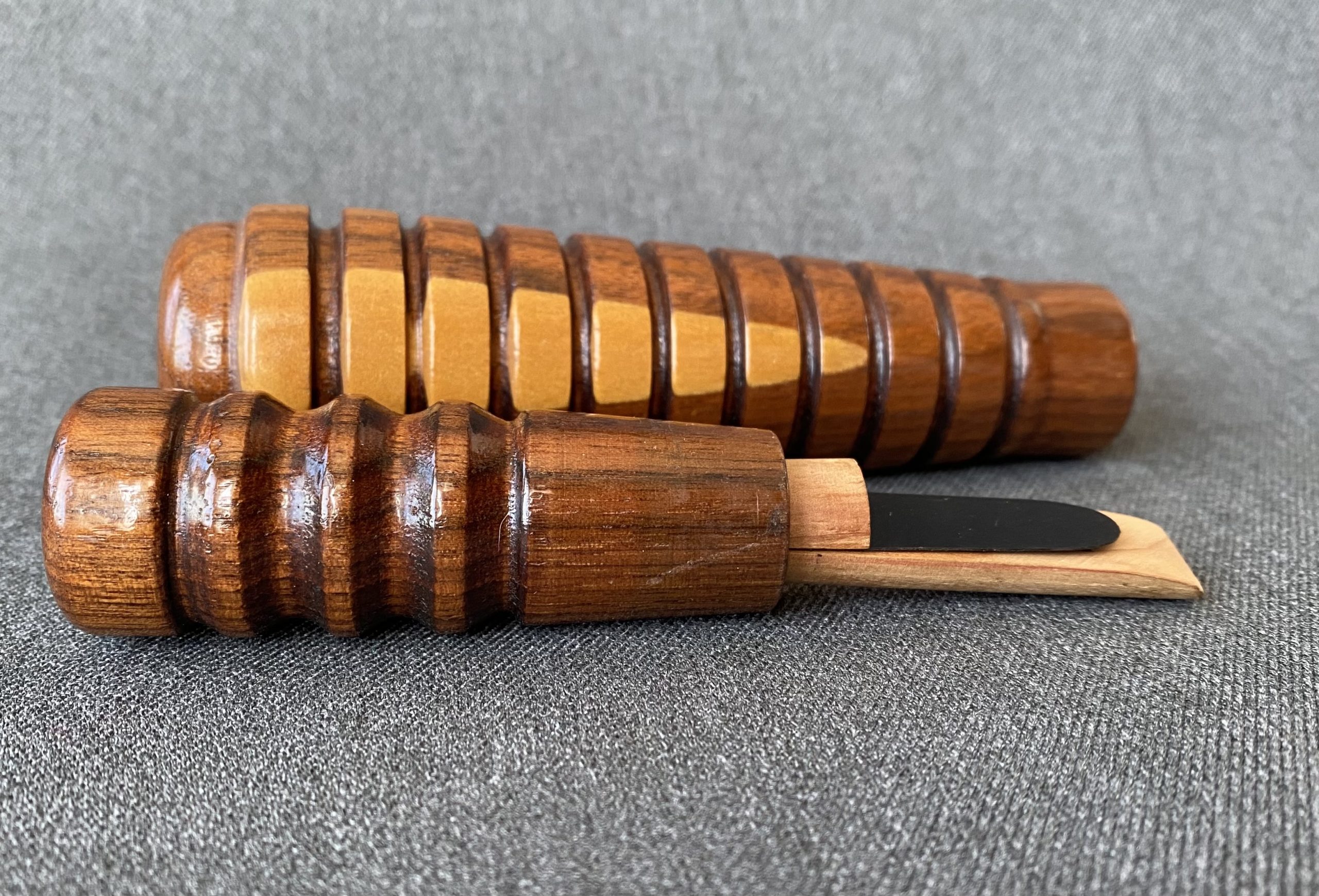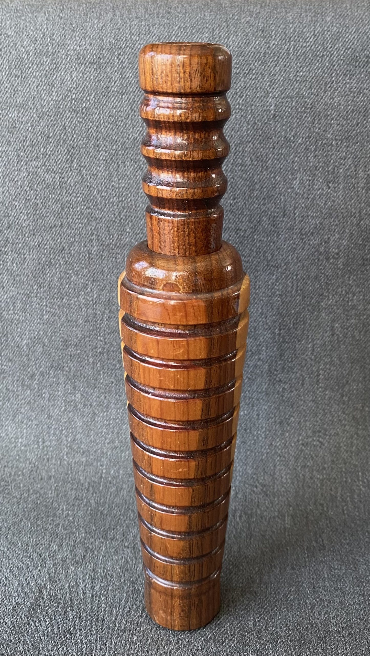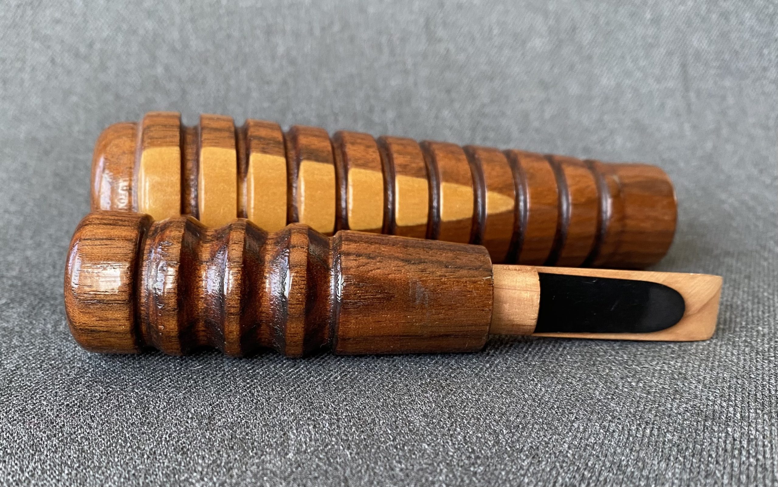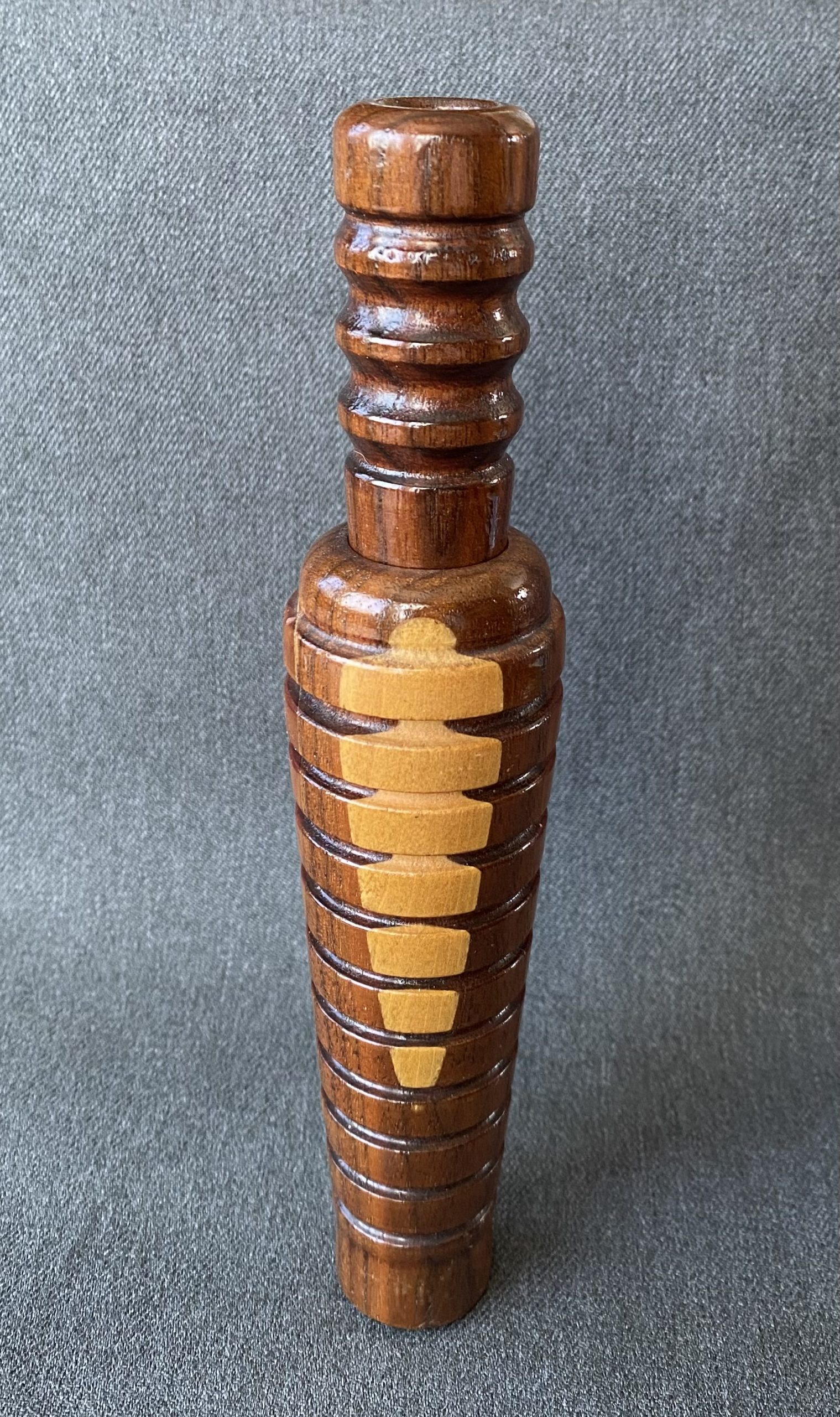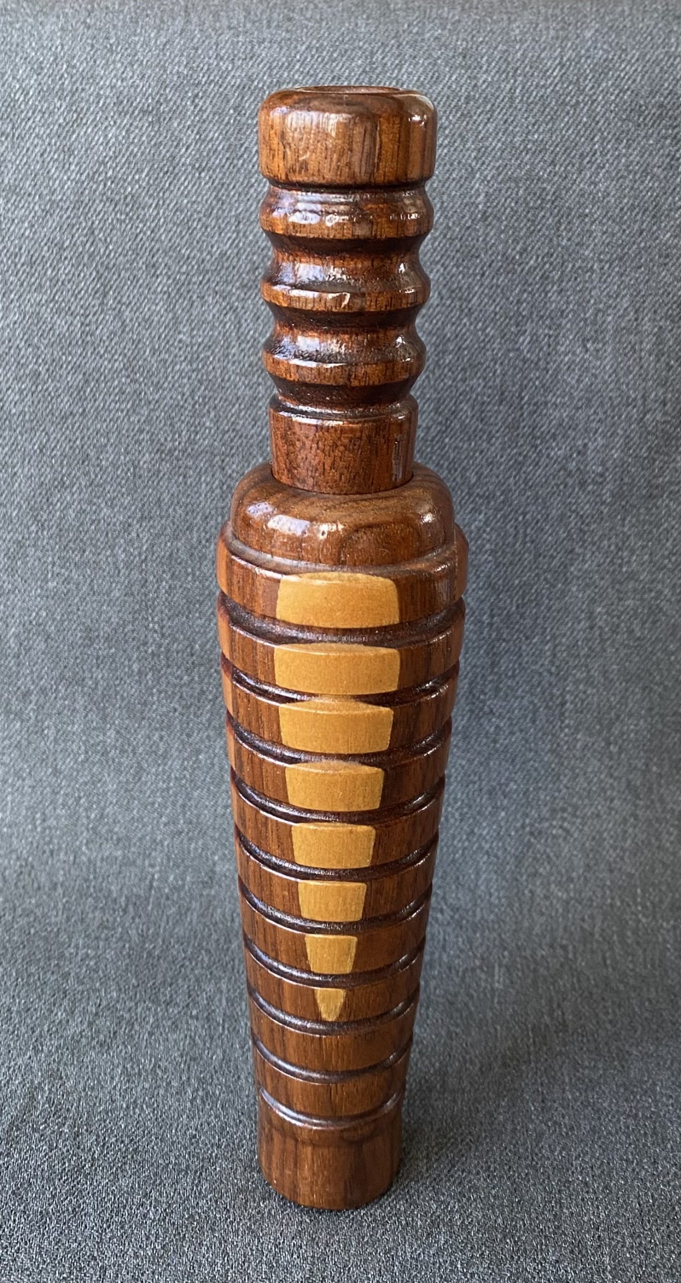 This is a very nice two tone laminated call from James Palmer Pratt. Very finely turned and ringed on both barrel and stopper. The call is Louisiana style and has a black plastic reed.