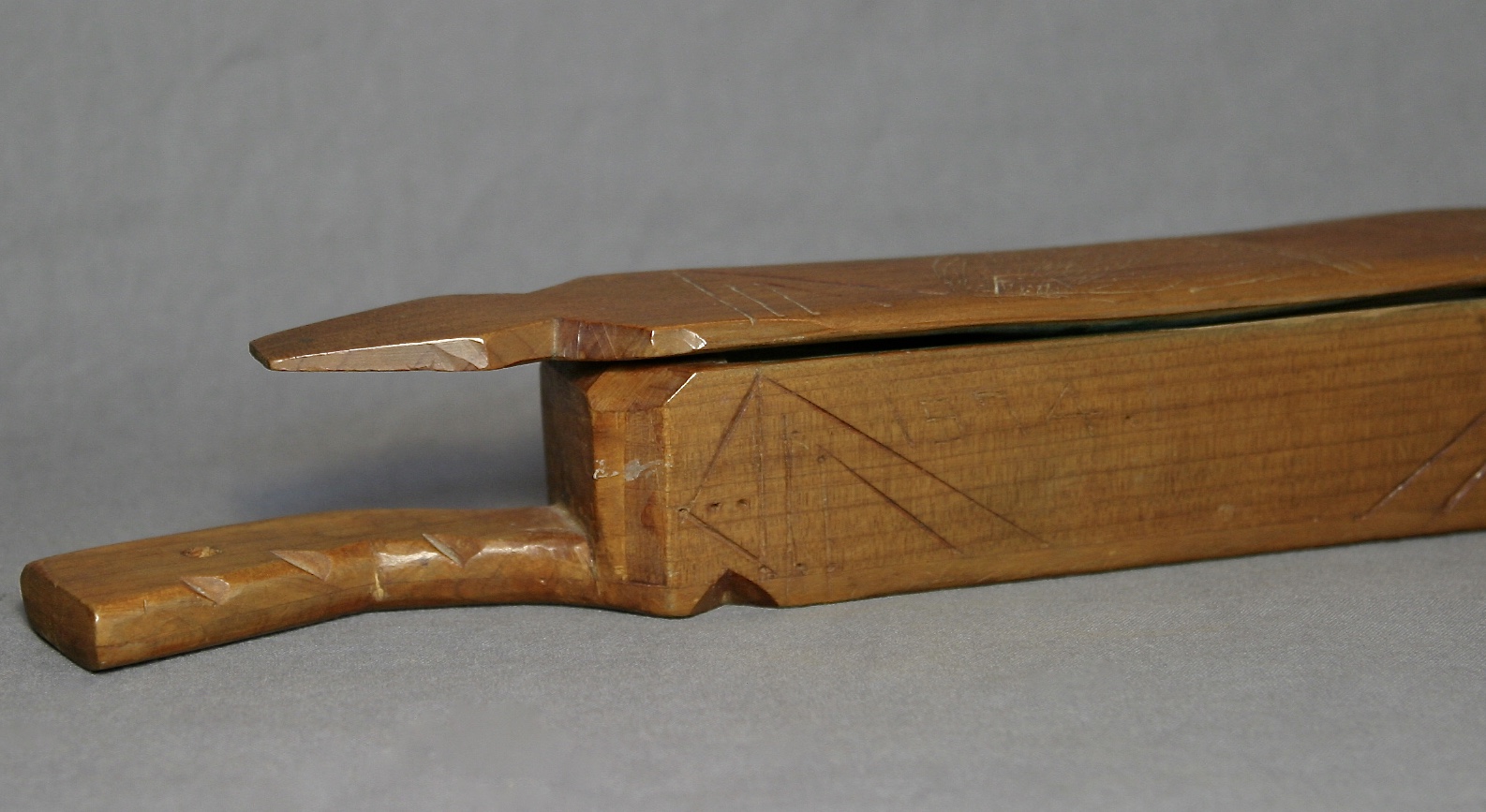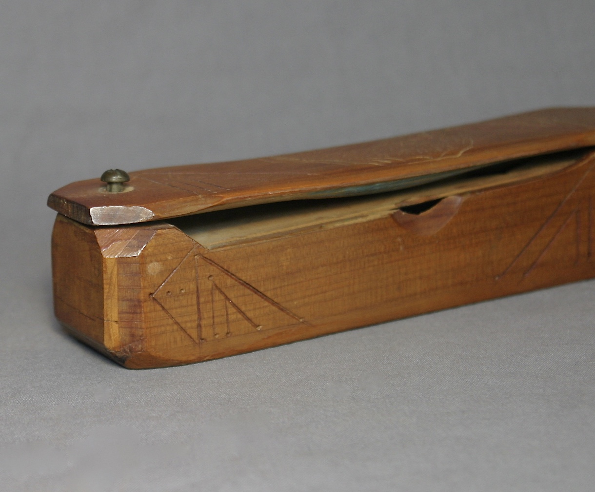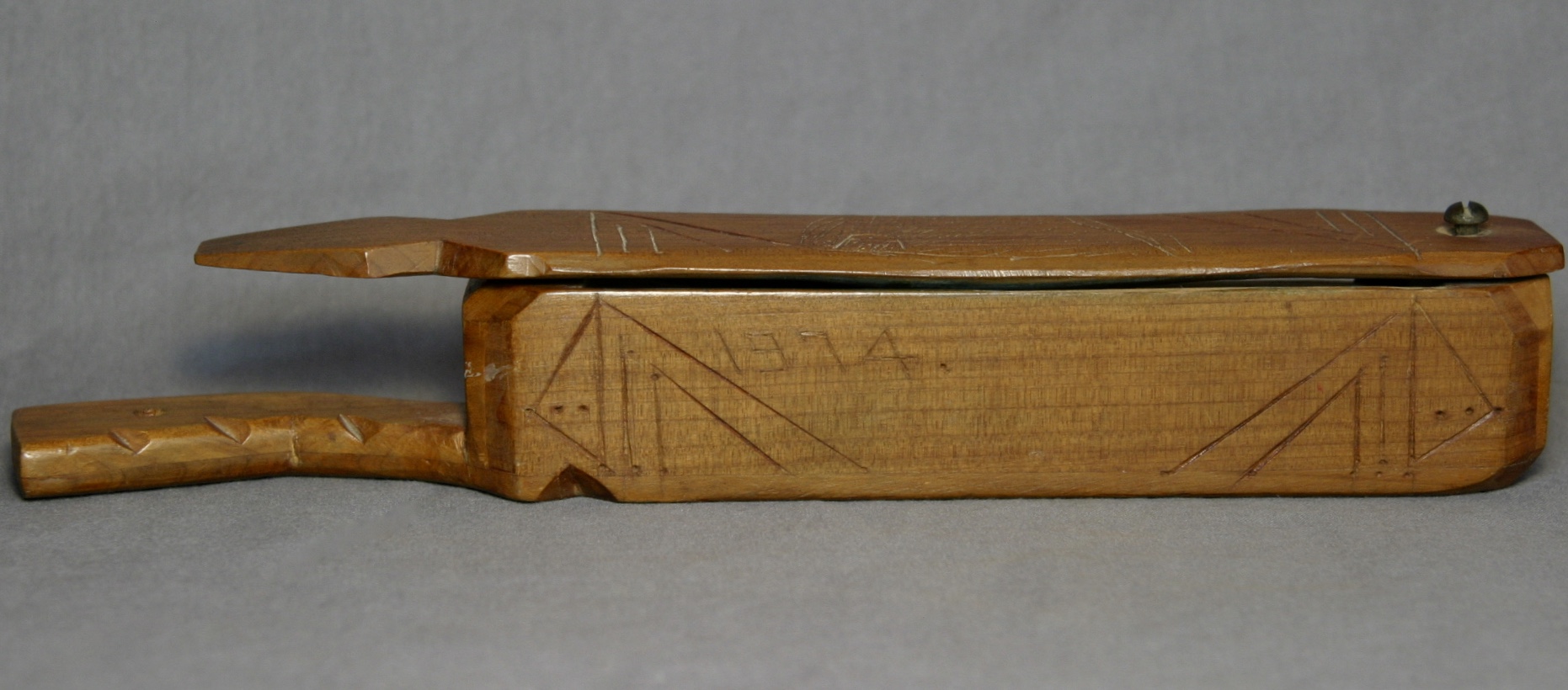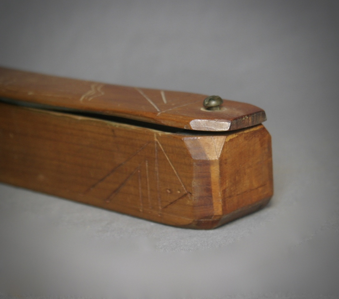 This is a wonderful carved call from Robert Thatcher. He made very few of these unique calls with a soundboard inside. The call has geometric designs carved into the sides and top, as well as the soundboard.