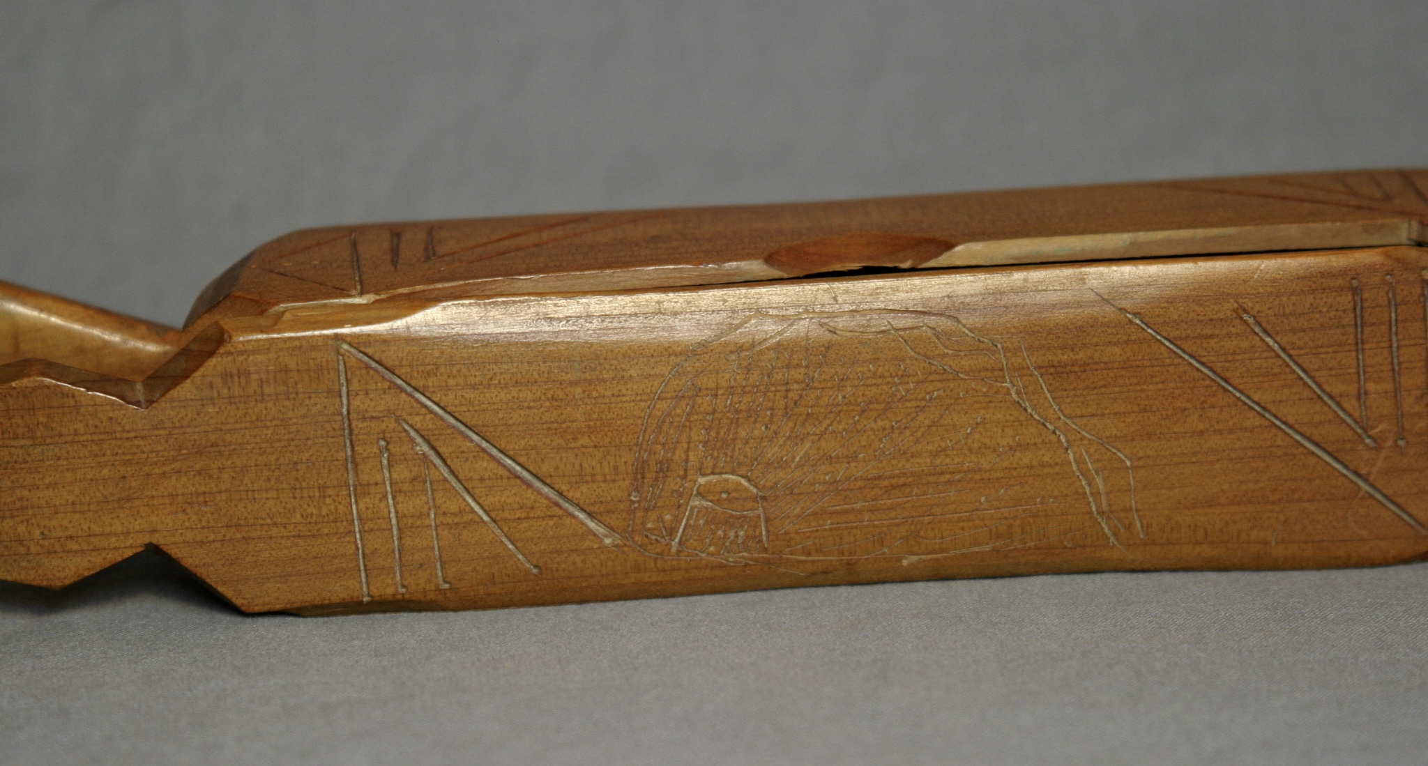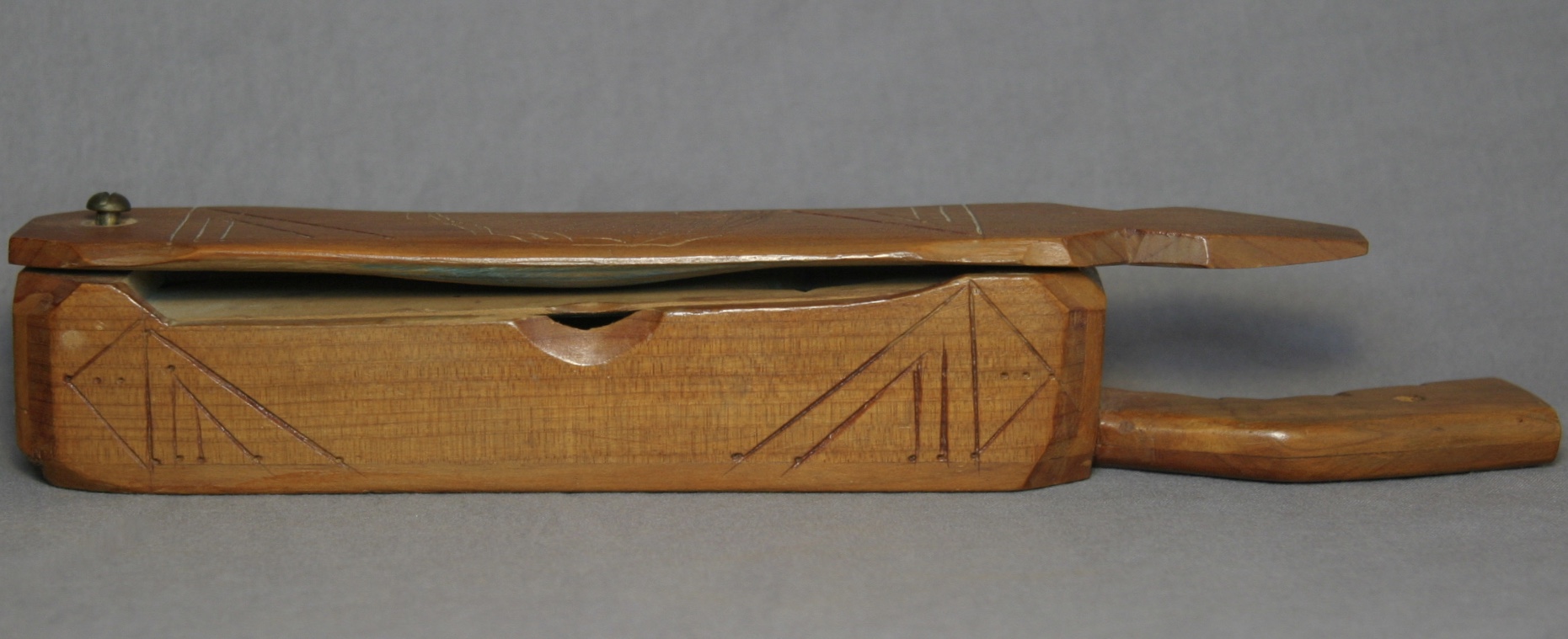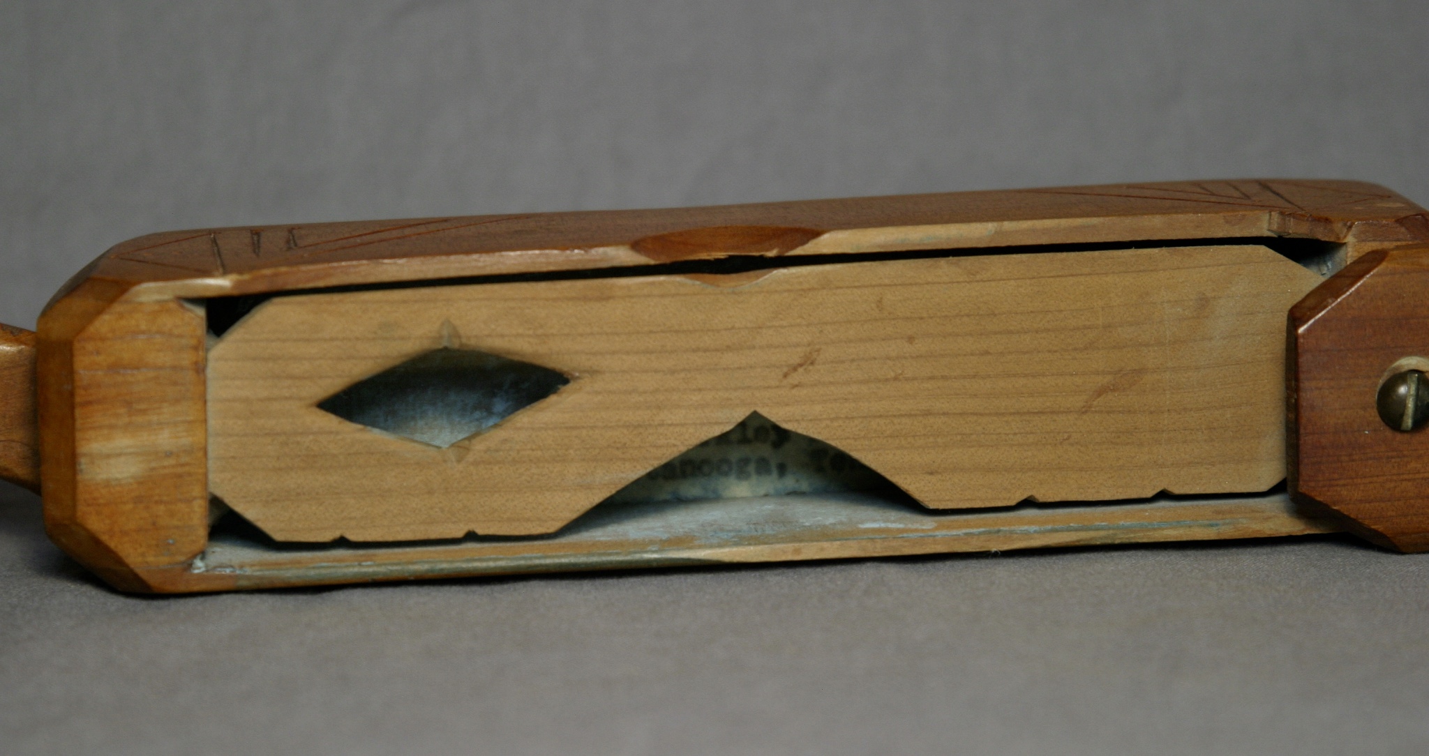 This is a wonderful carved call from Robert Thatcher. He made very few of these unique calls with a soundboard inside. The call has geometric designs carved into the sides and top, as well as the soundboard.