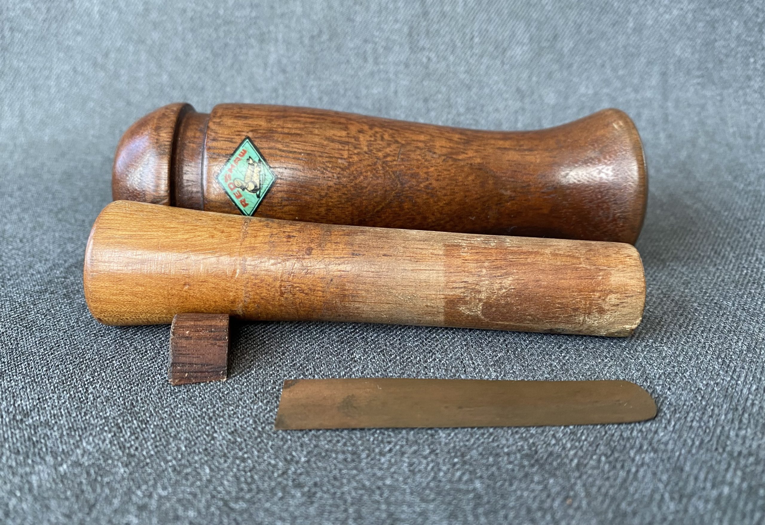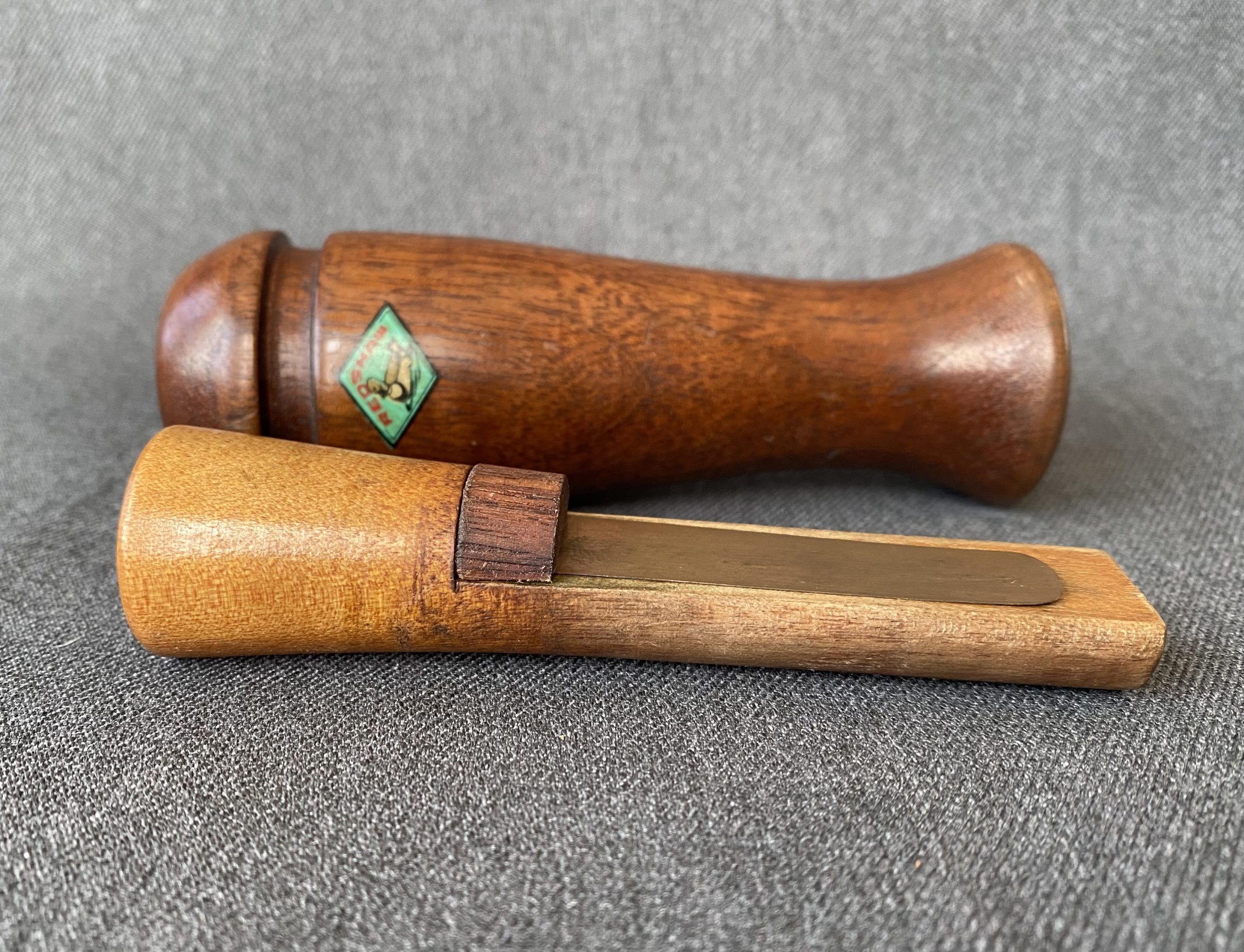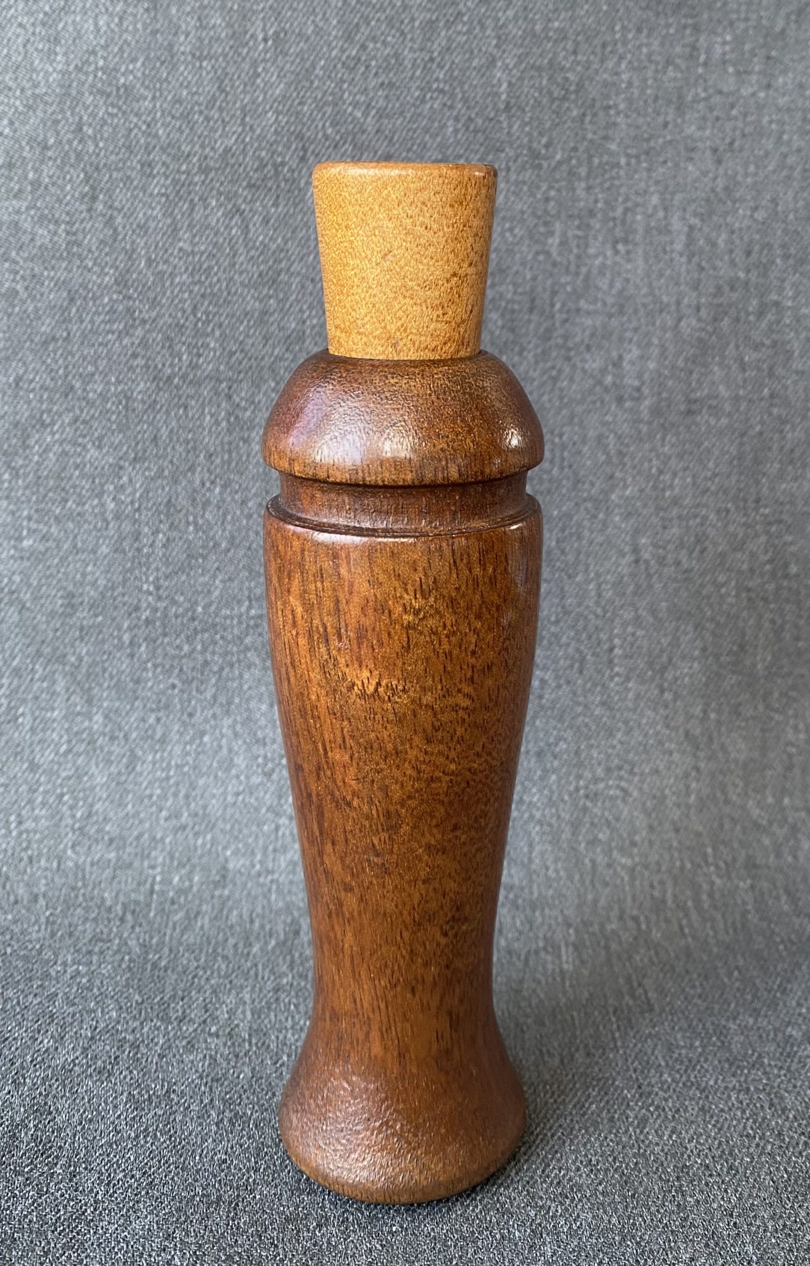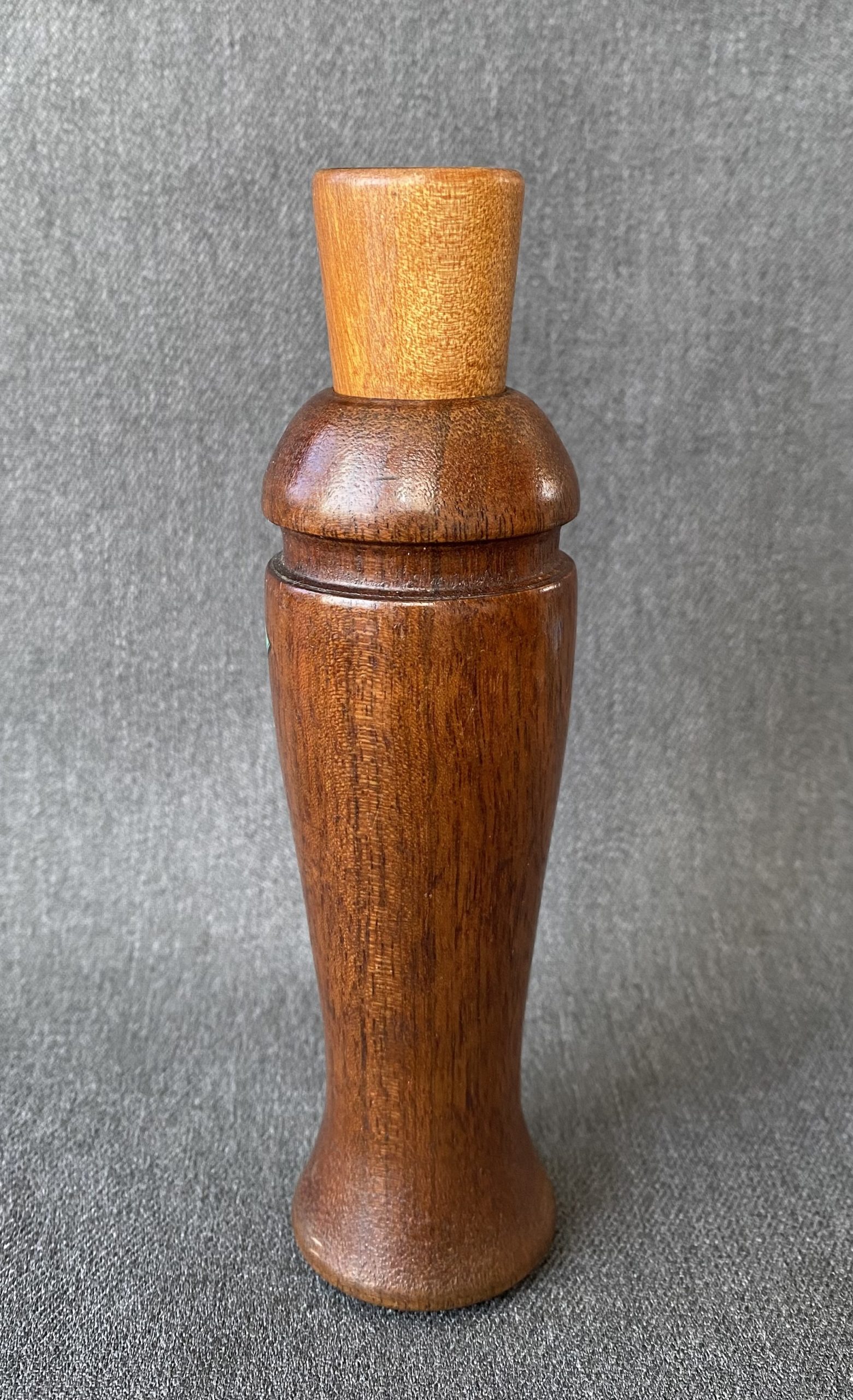 A nicely turned call from Irvin Redshaw. The call is Reelfoot style and has a copper reed. The barrel has it’s original water label.