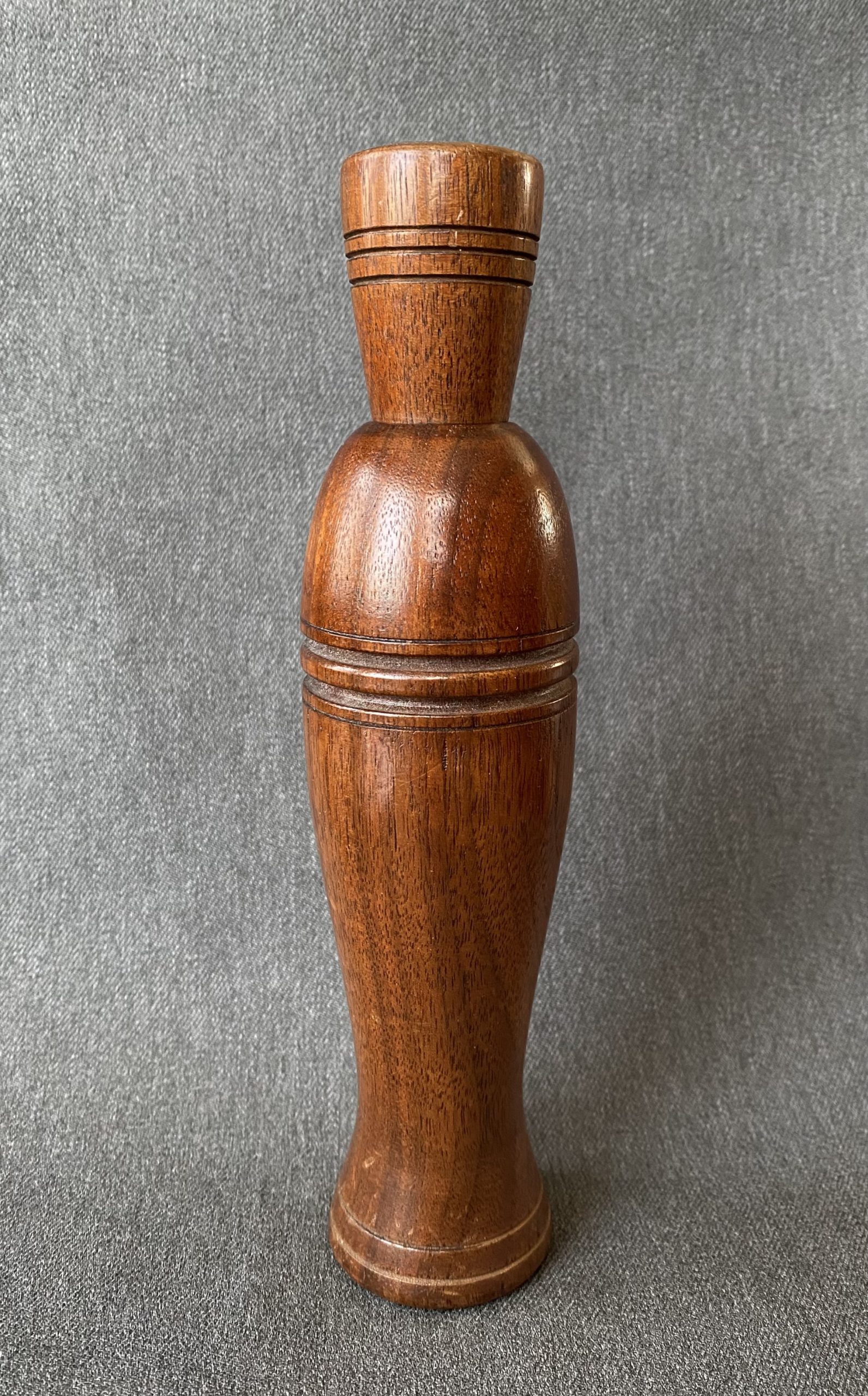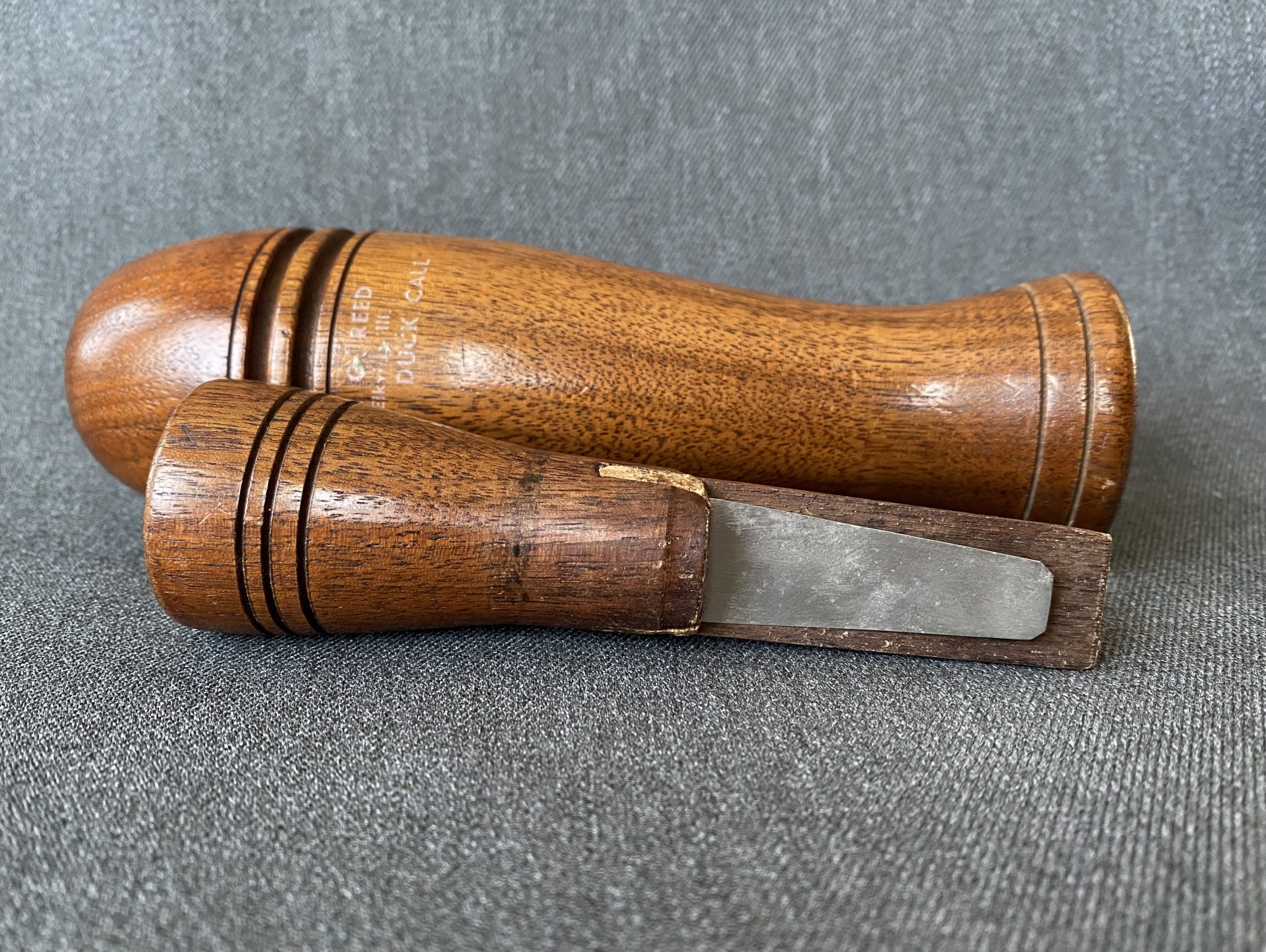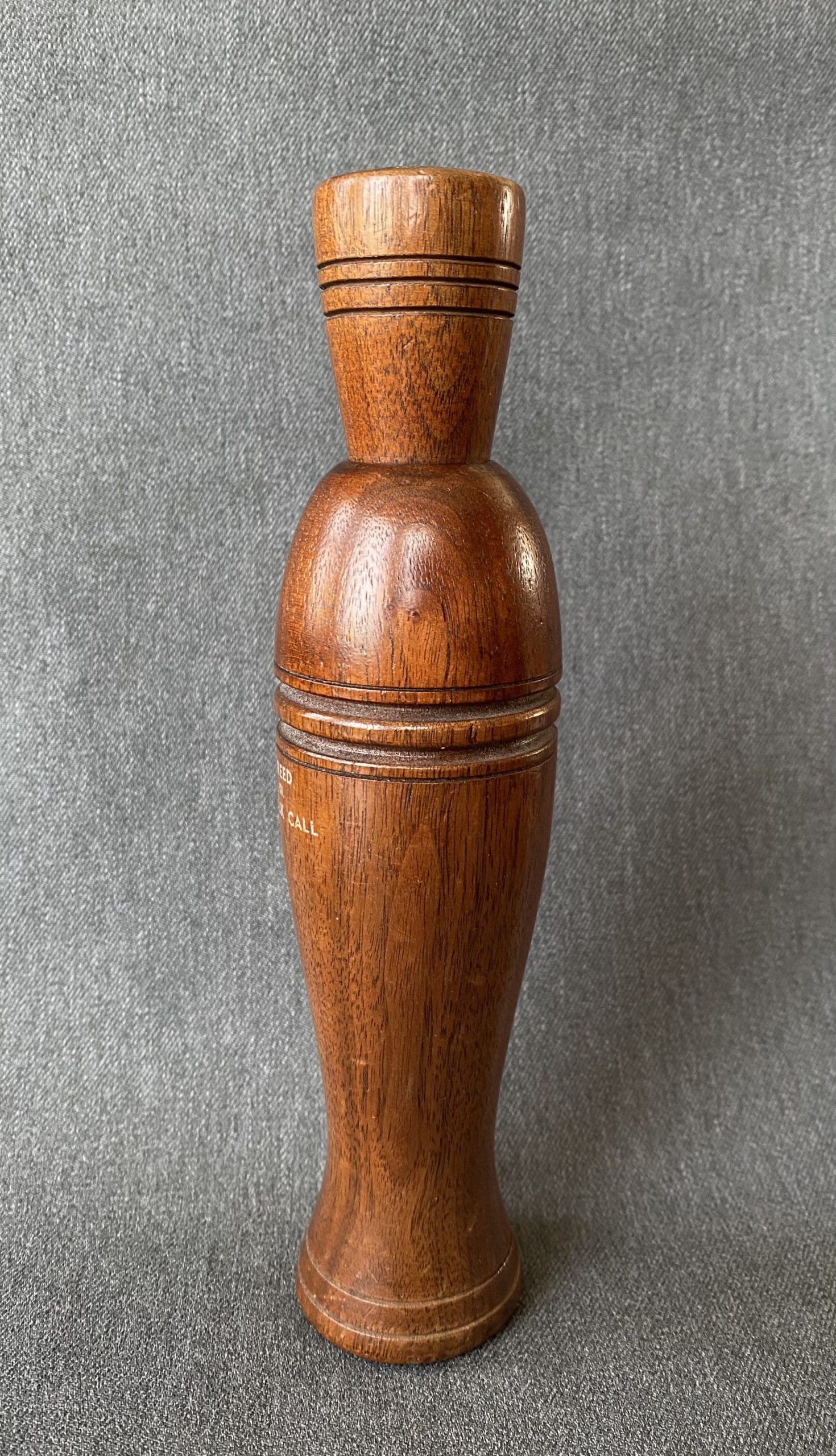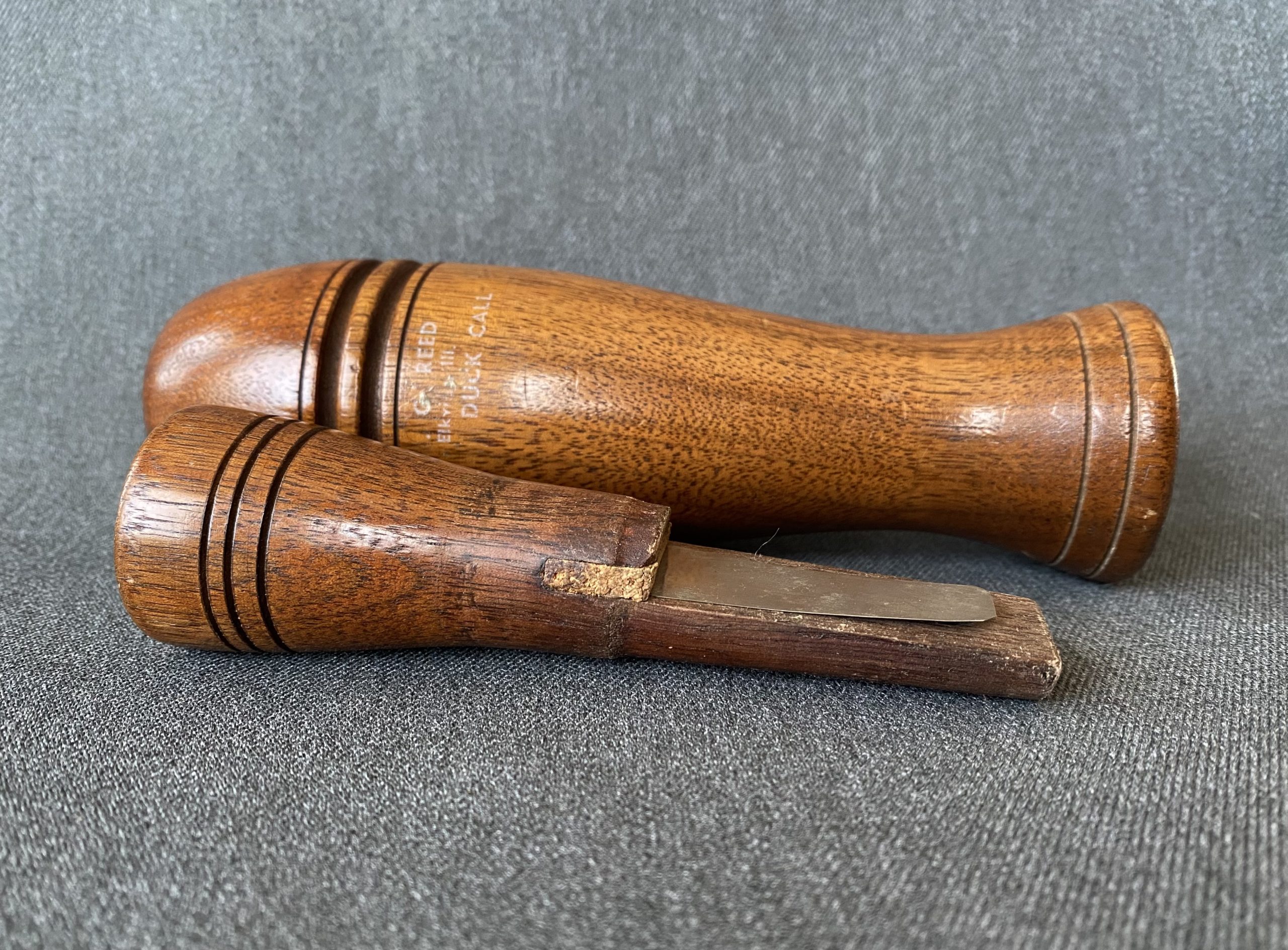 A nice, large call from Jerry Reed. The call is Arkansas style and a German silver reed. The water label is slightly rubbed off, it still reads, . G. Reed, Elkville, Ill. Duck Call