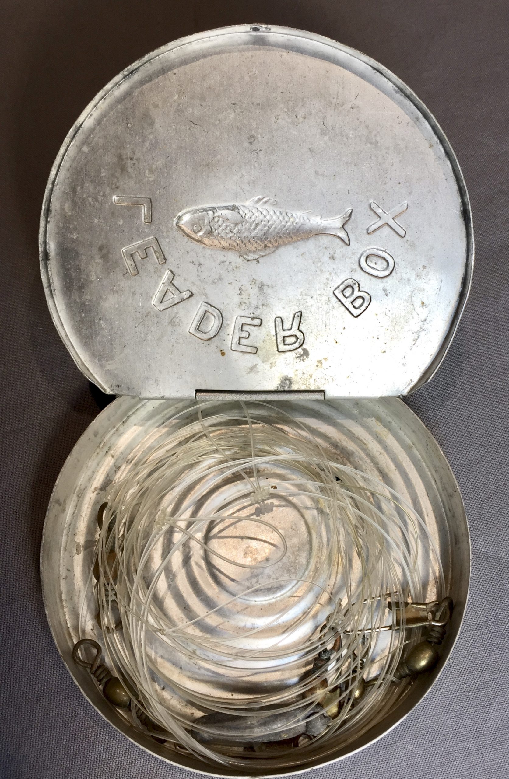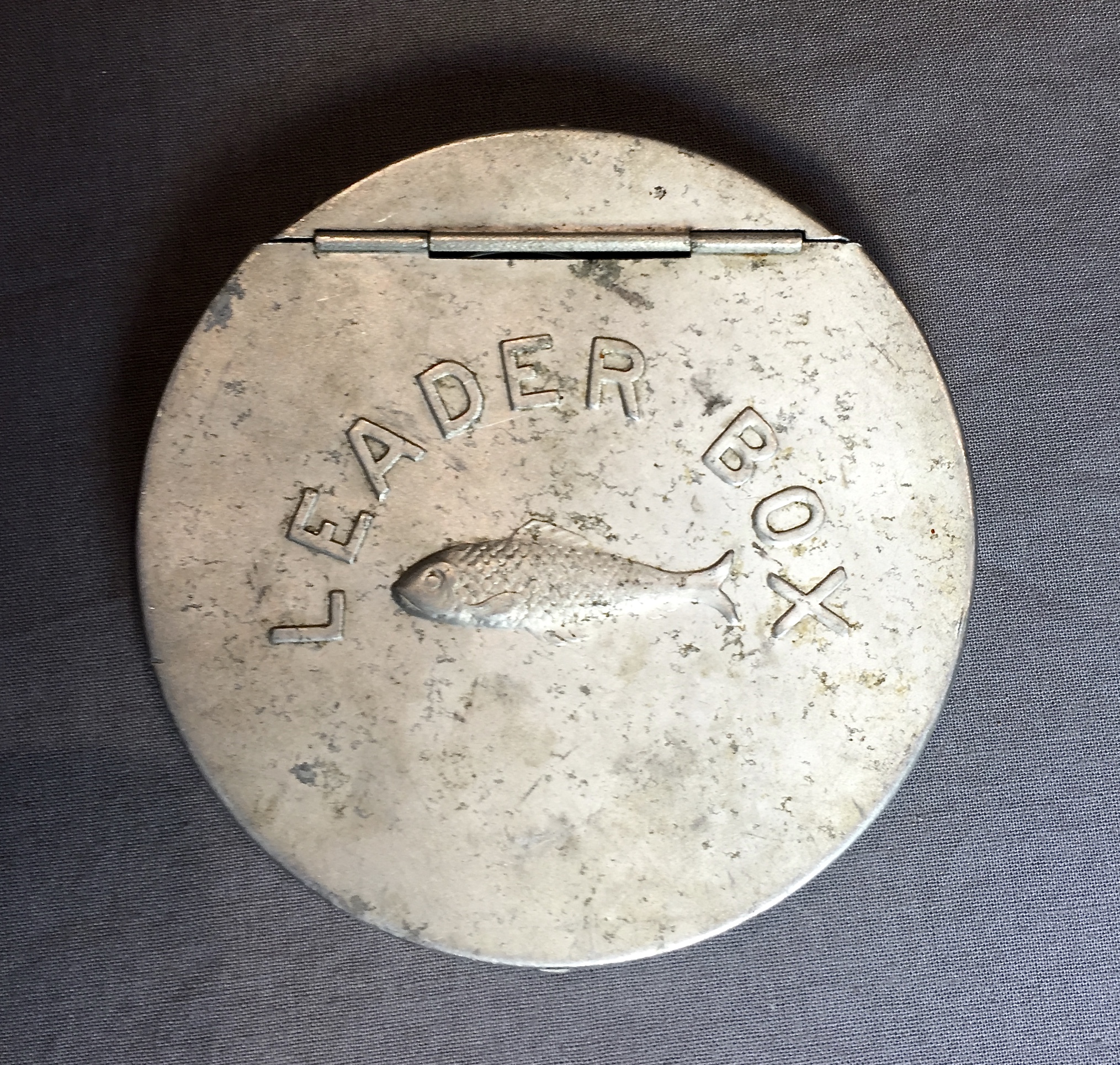 This is an old, round leader box of unknown origin in fair condition