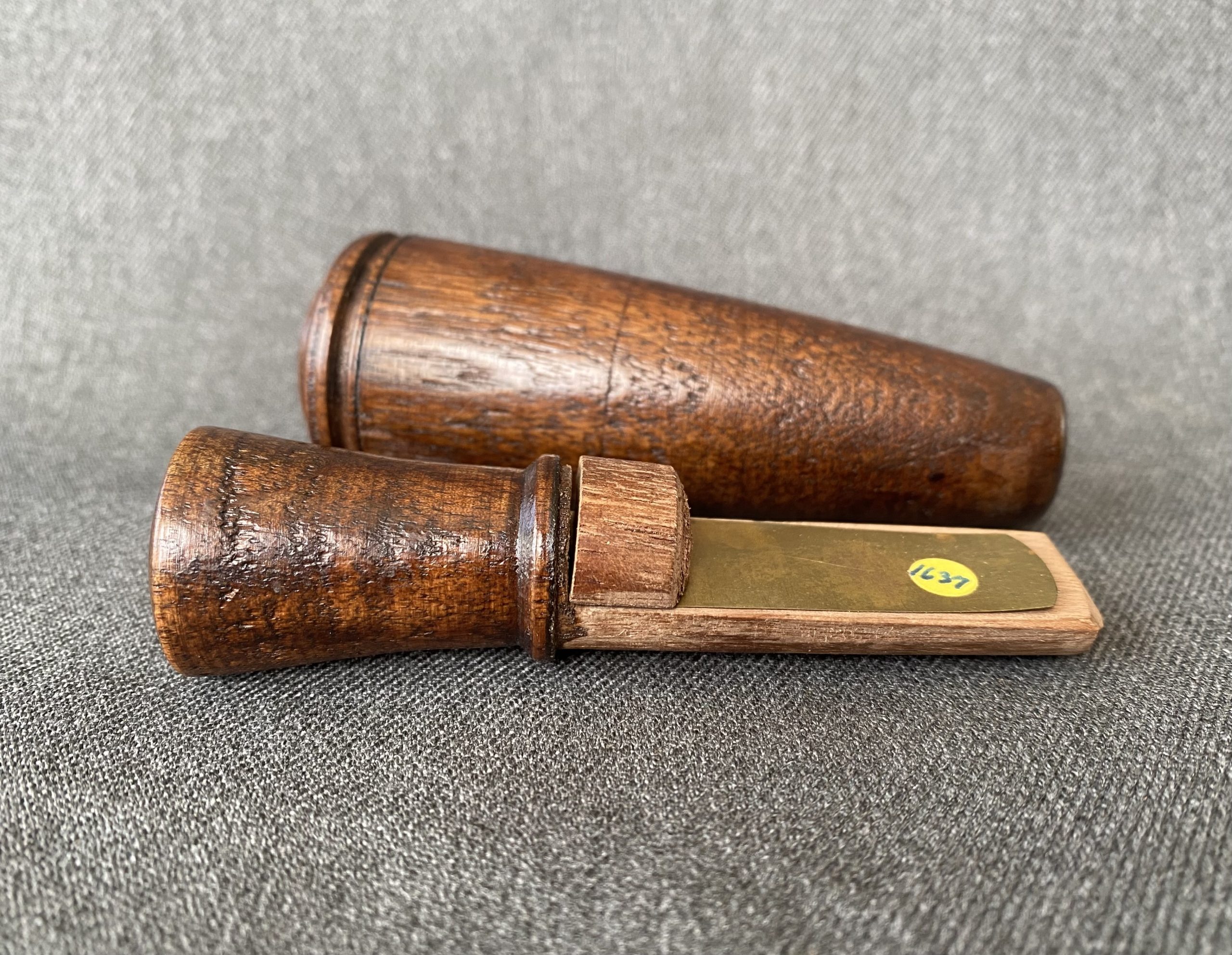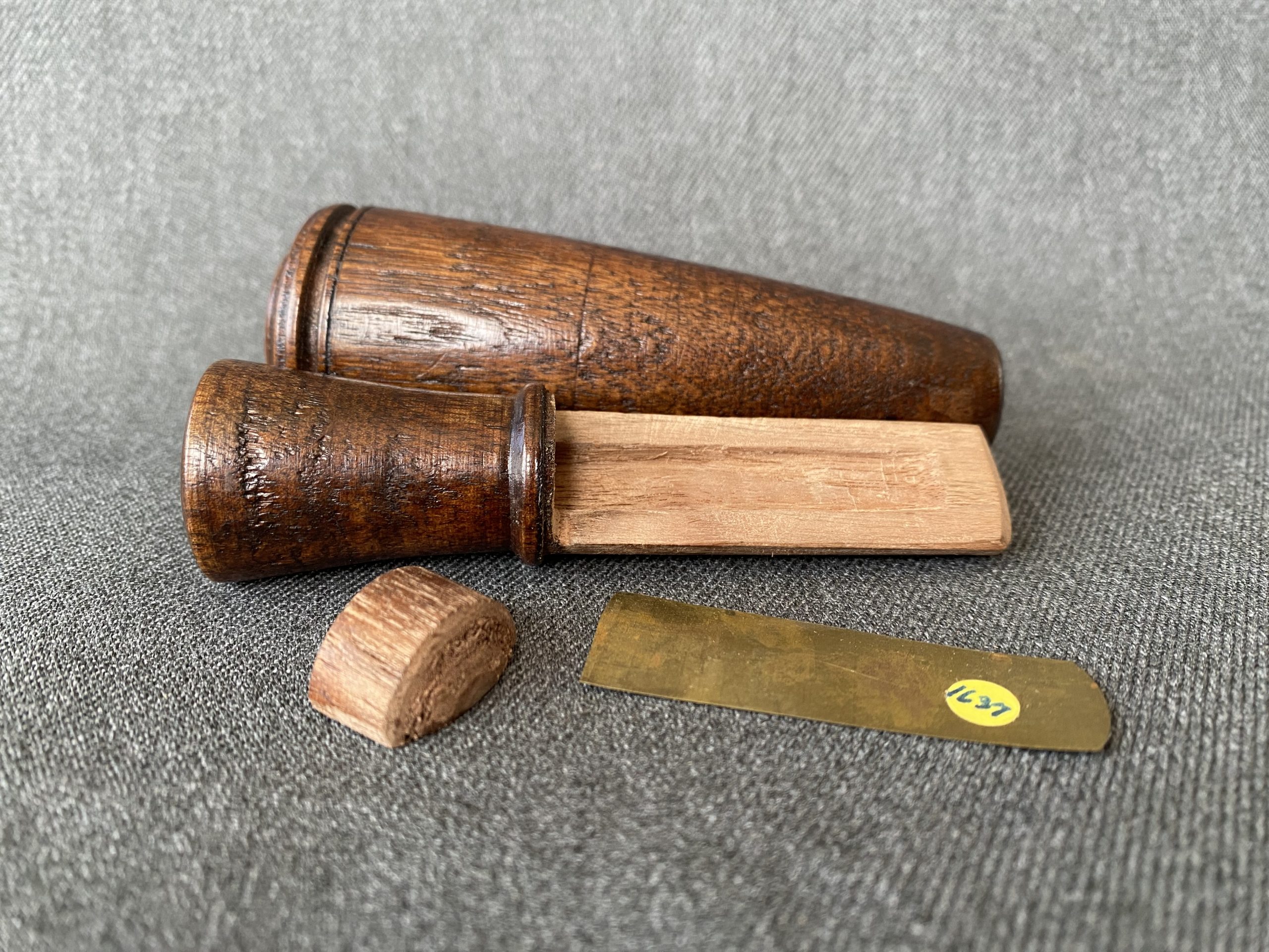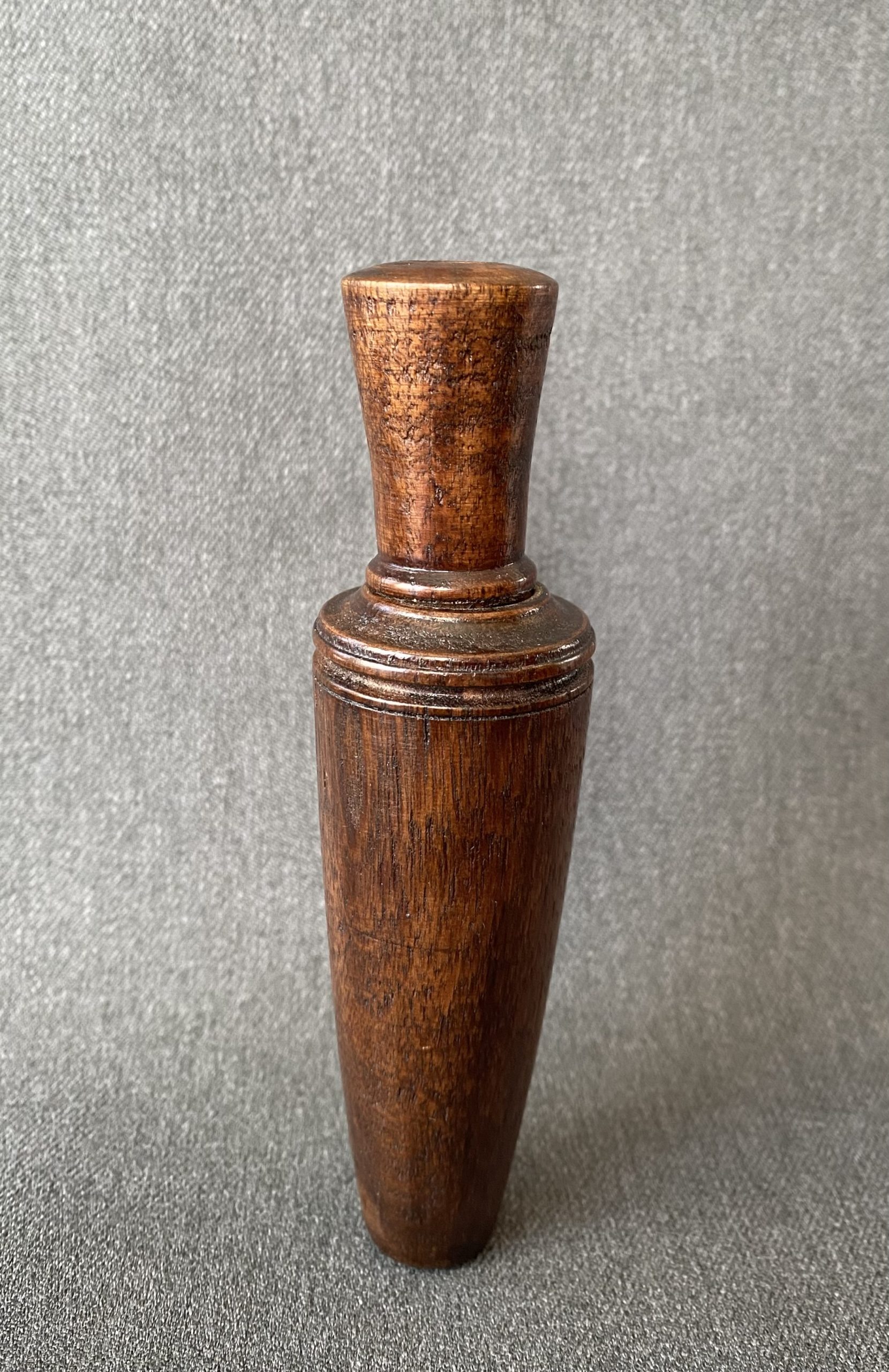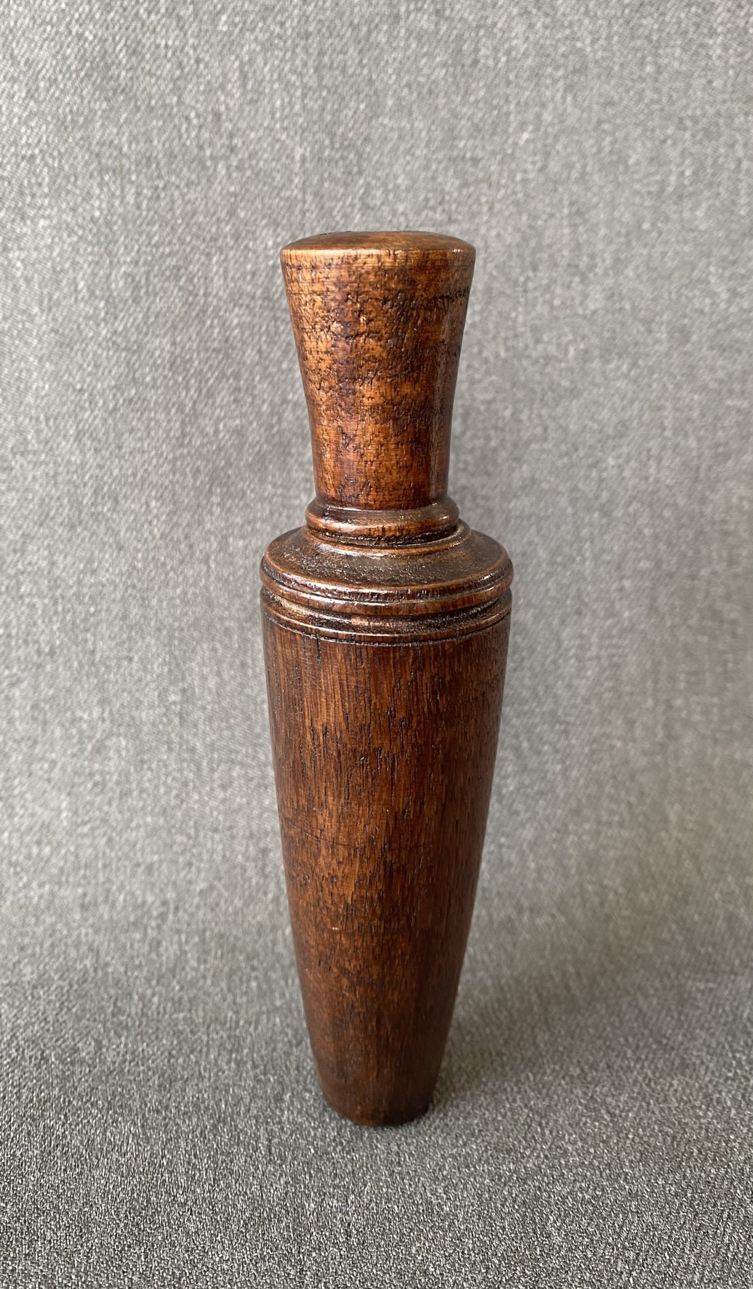 A nice, rare call from Newt Rule. This is a light, small call with a brass reed. It has a delicate turned lanyard groove at the top of the barrel.