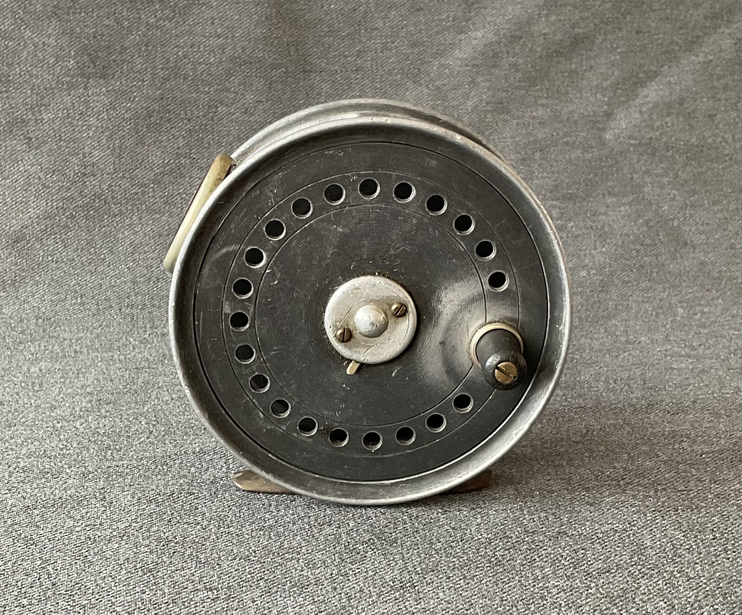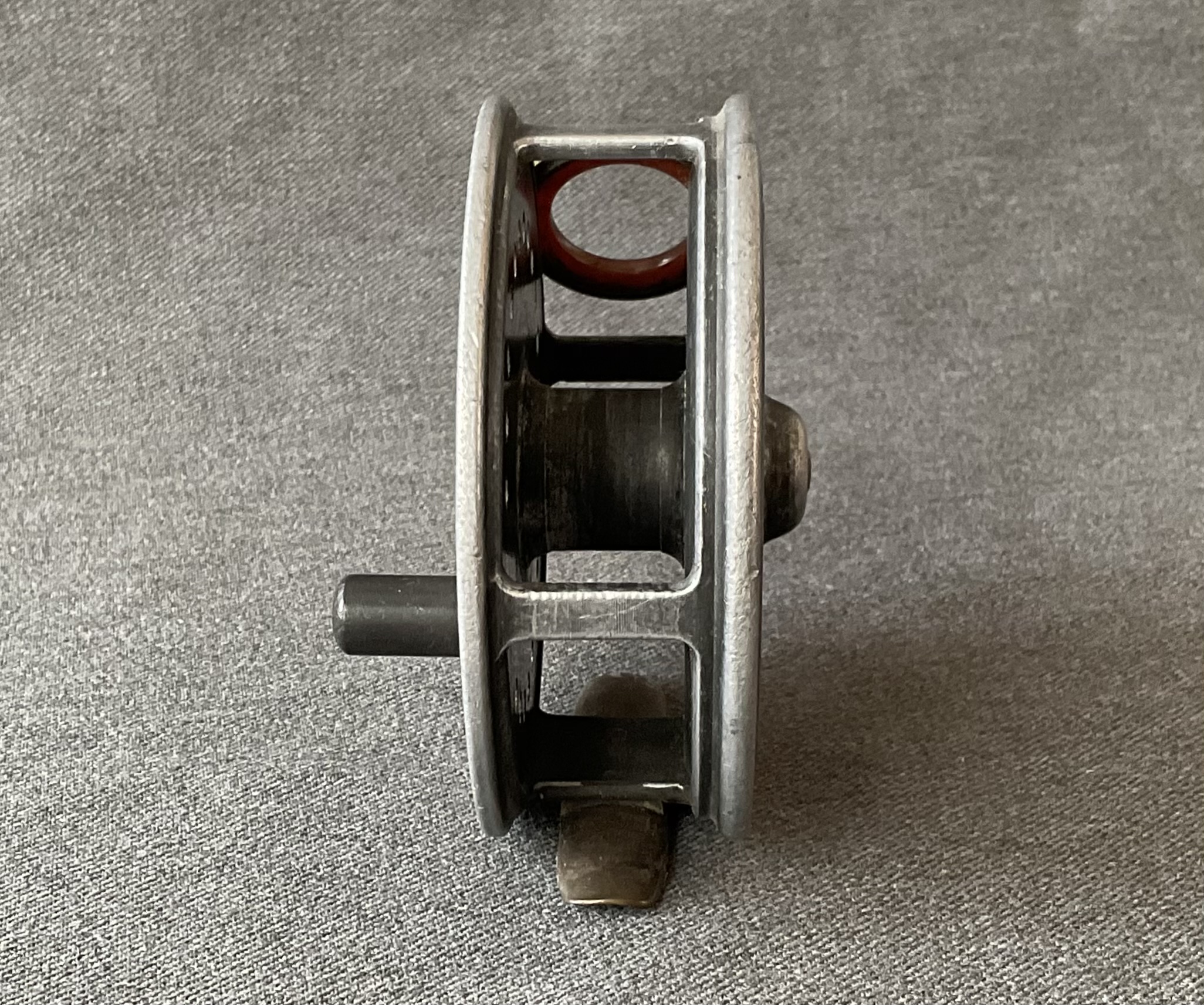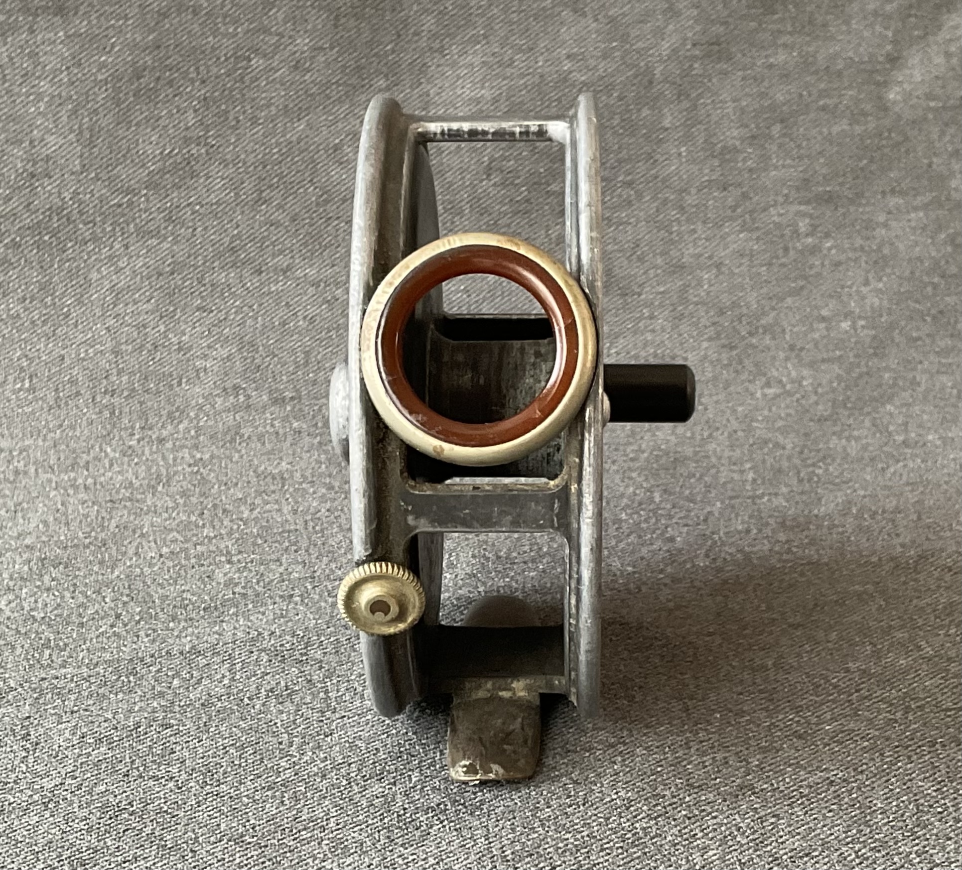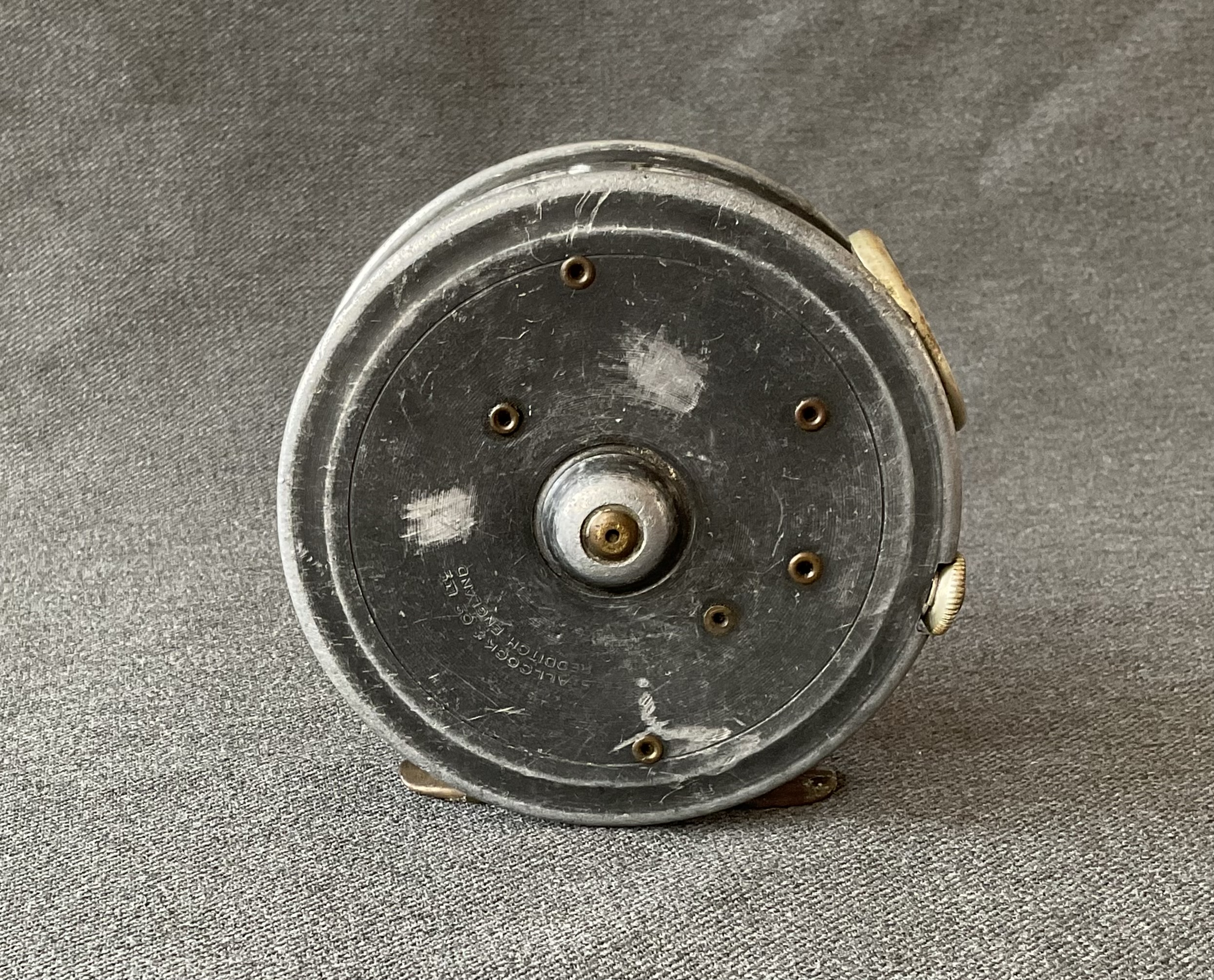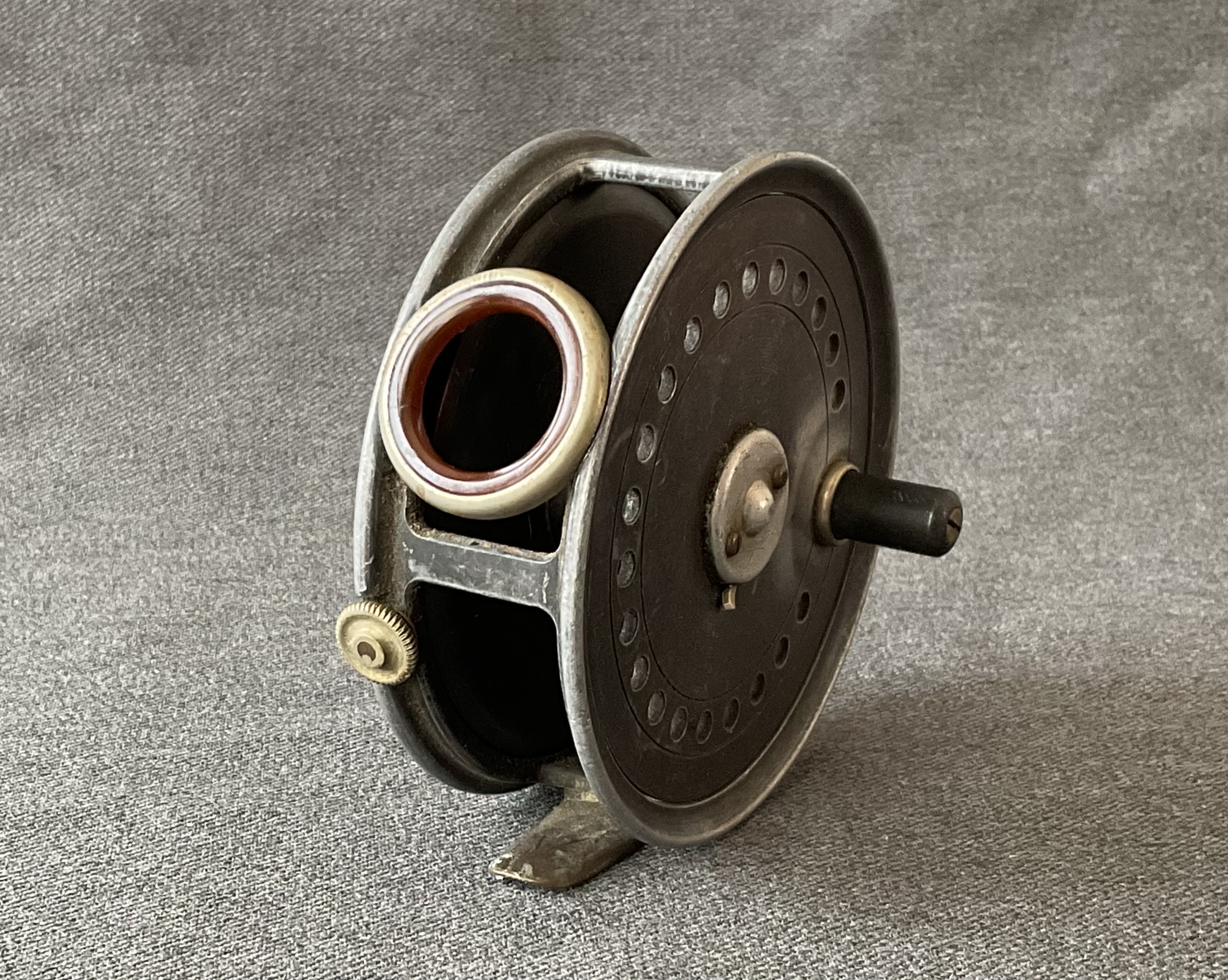 A nice fly reel from Allcock & Co Ltd The reel has an agate guide and a brass foot.