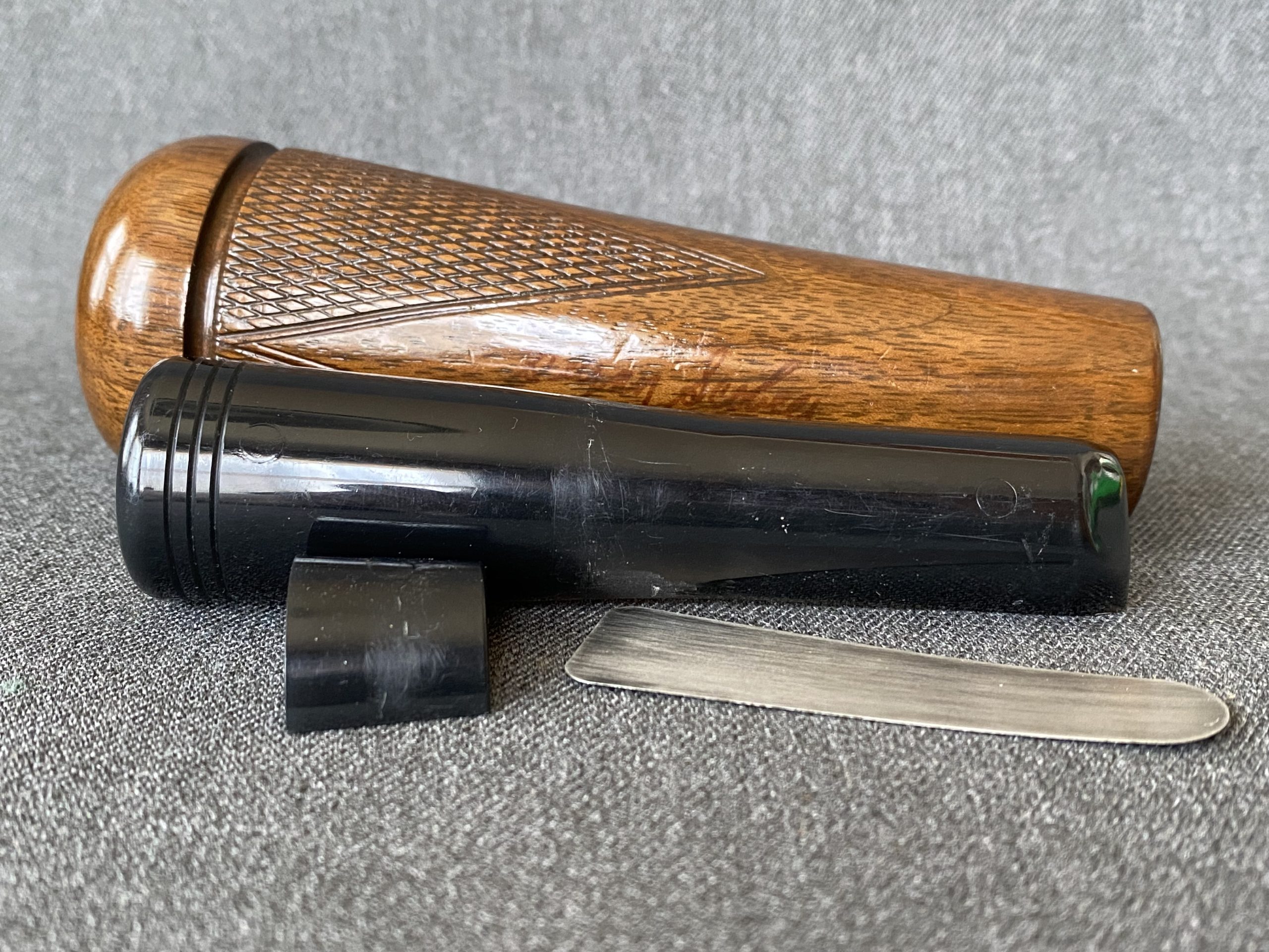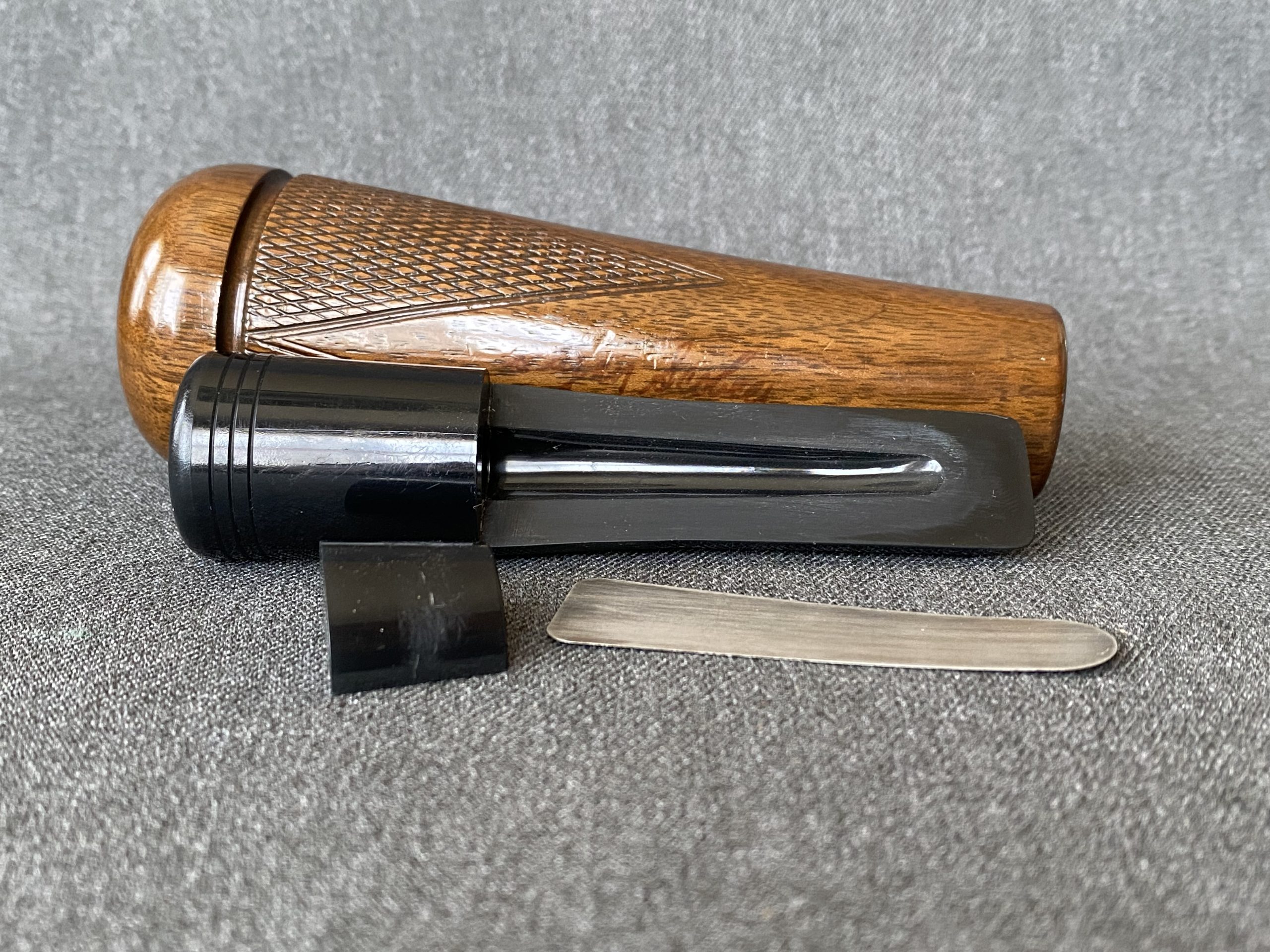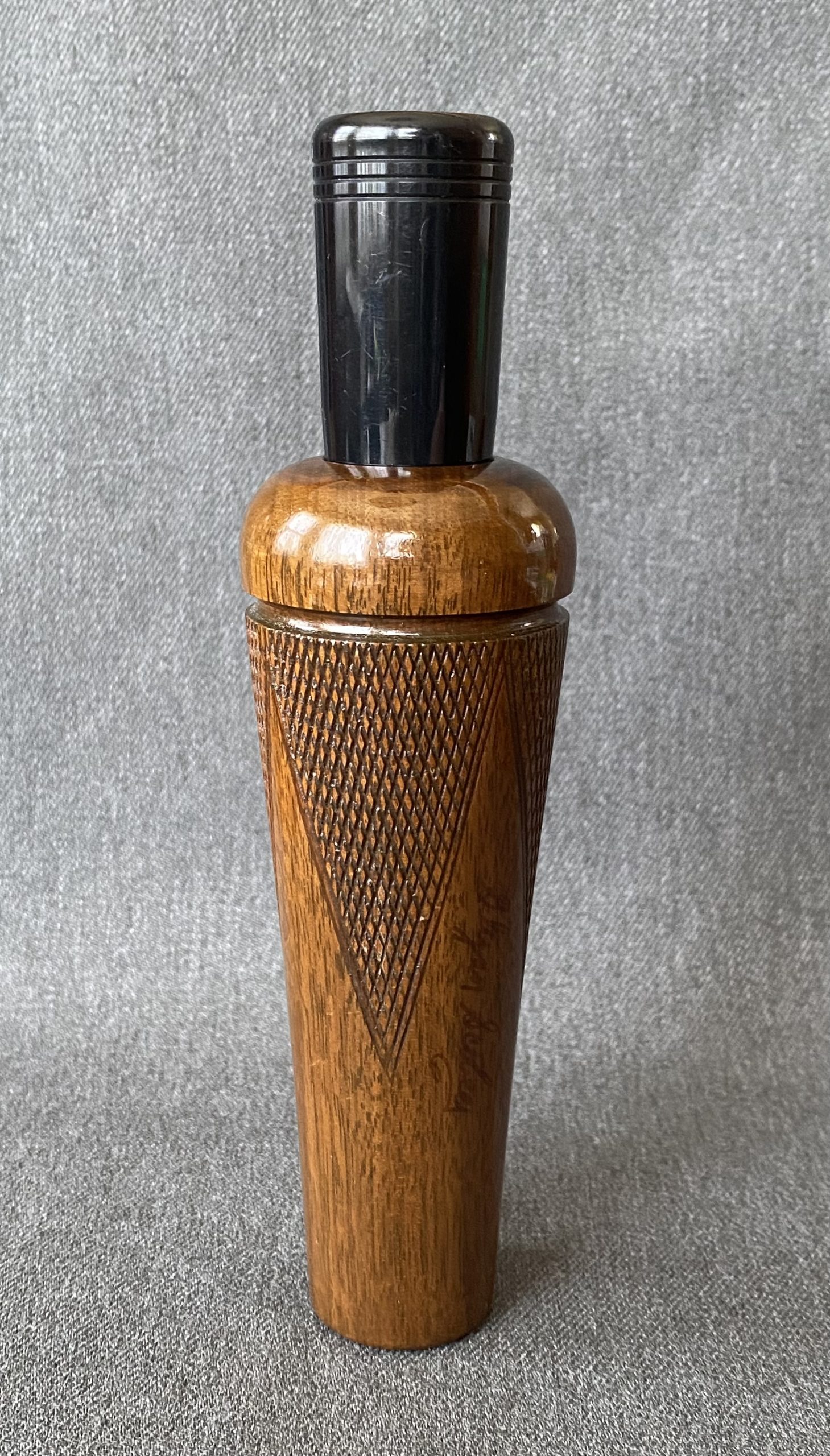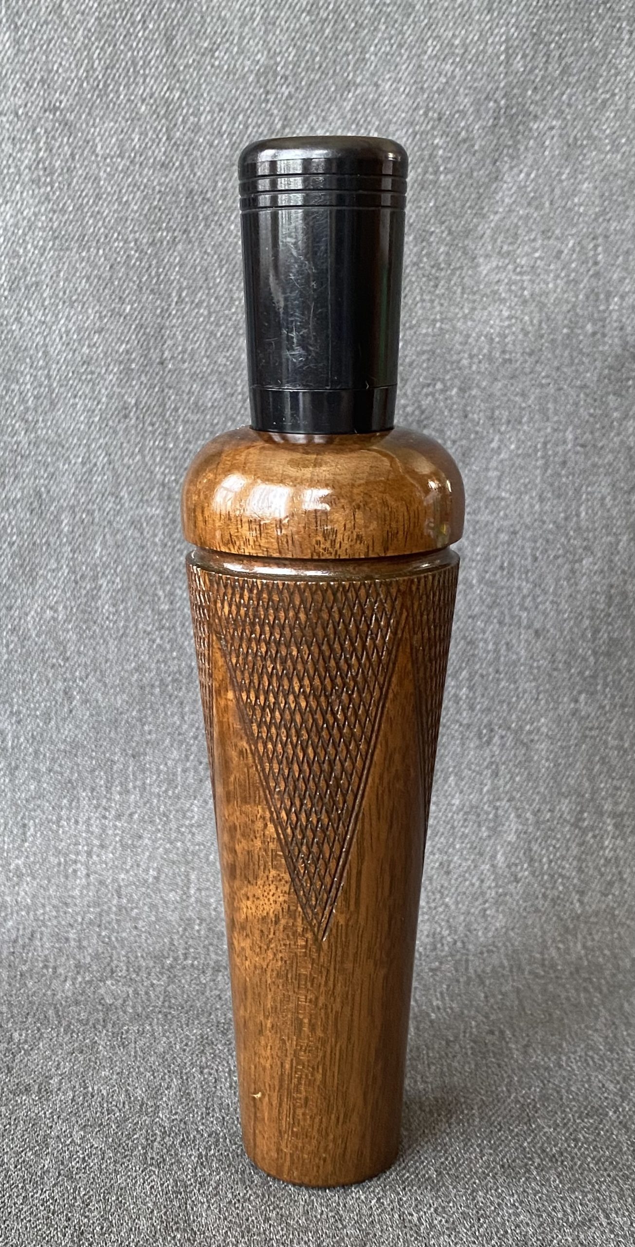 This is a beautiful four panel checkered call from Glynn Scobey. The call is Reelfoot style with a silver reed. It has a walnut barrel and a black plastic stopper.