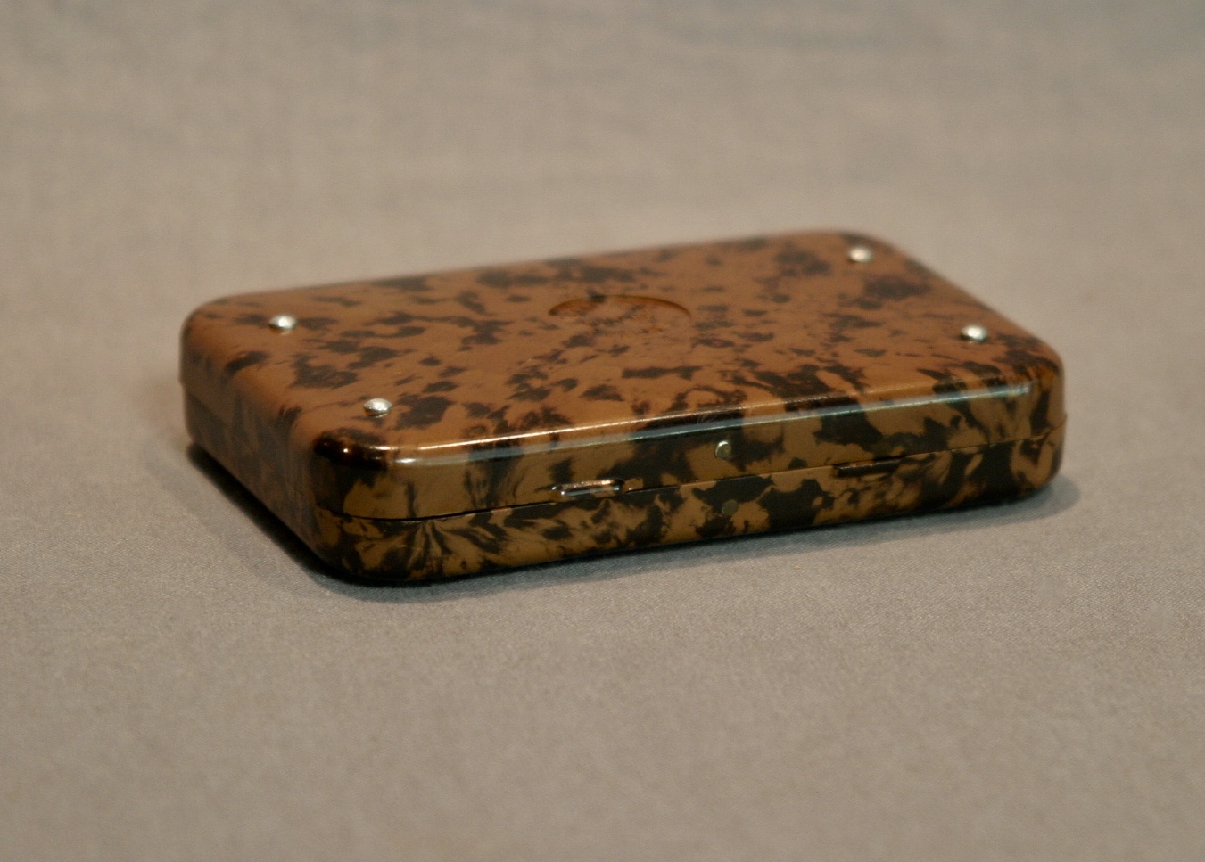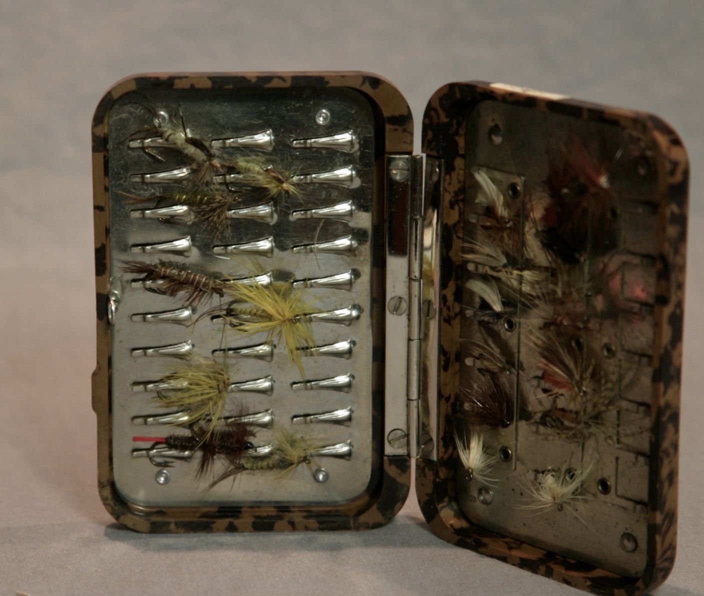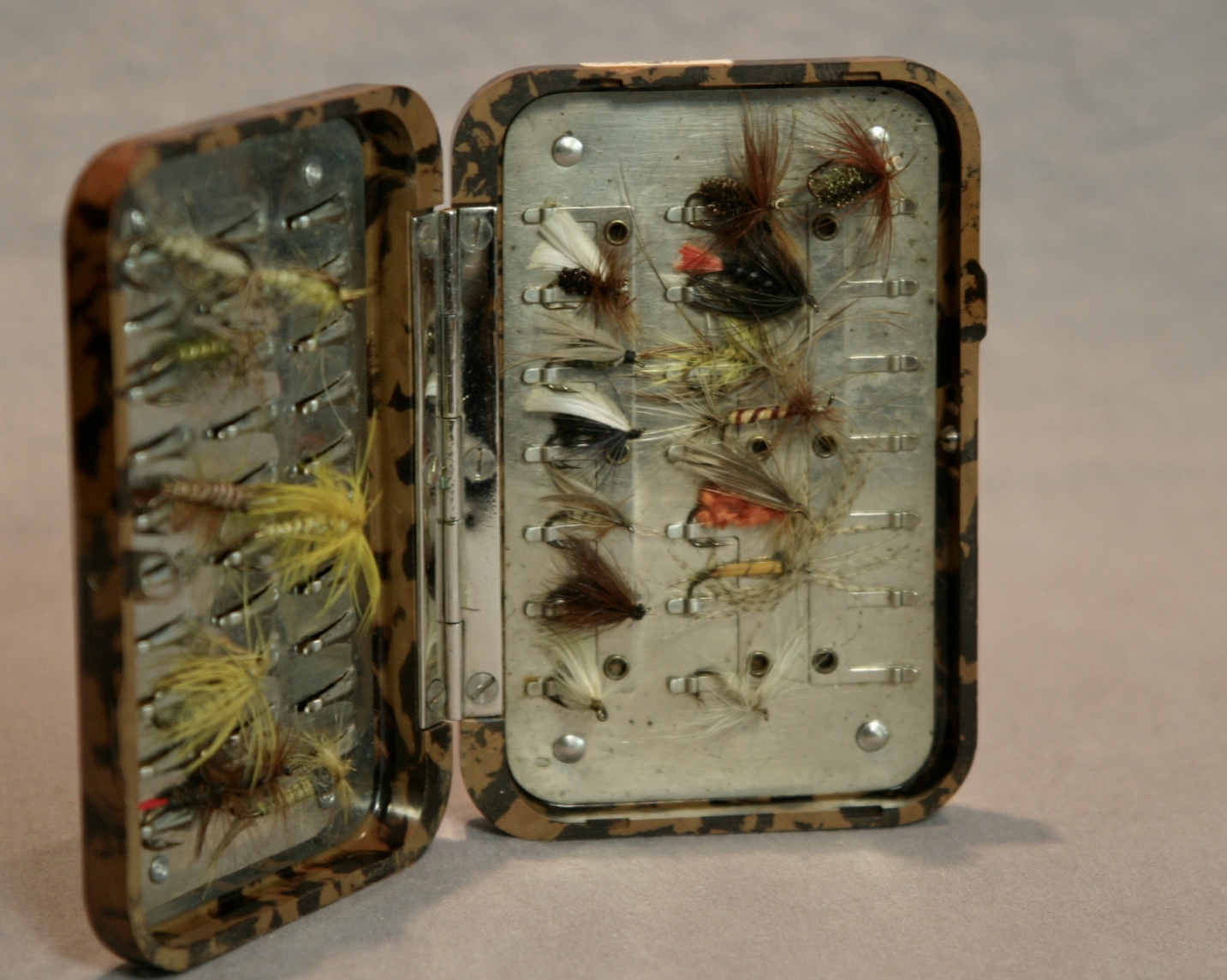 A small neroda fly box from Hardy Bros in nice condition! The box has silver clips with a couple dozen trout flies.