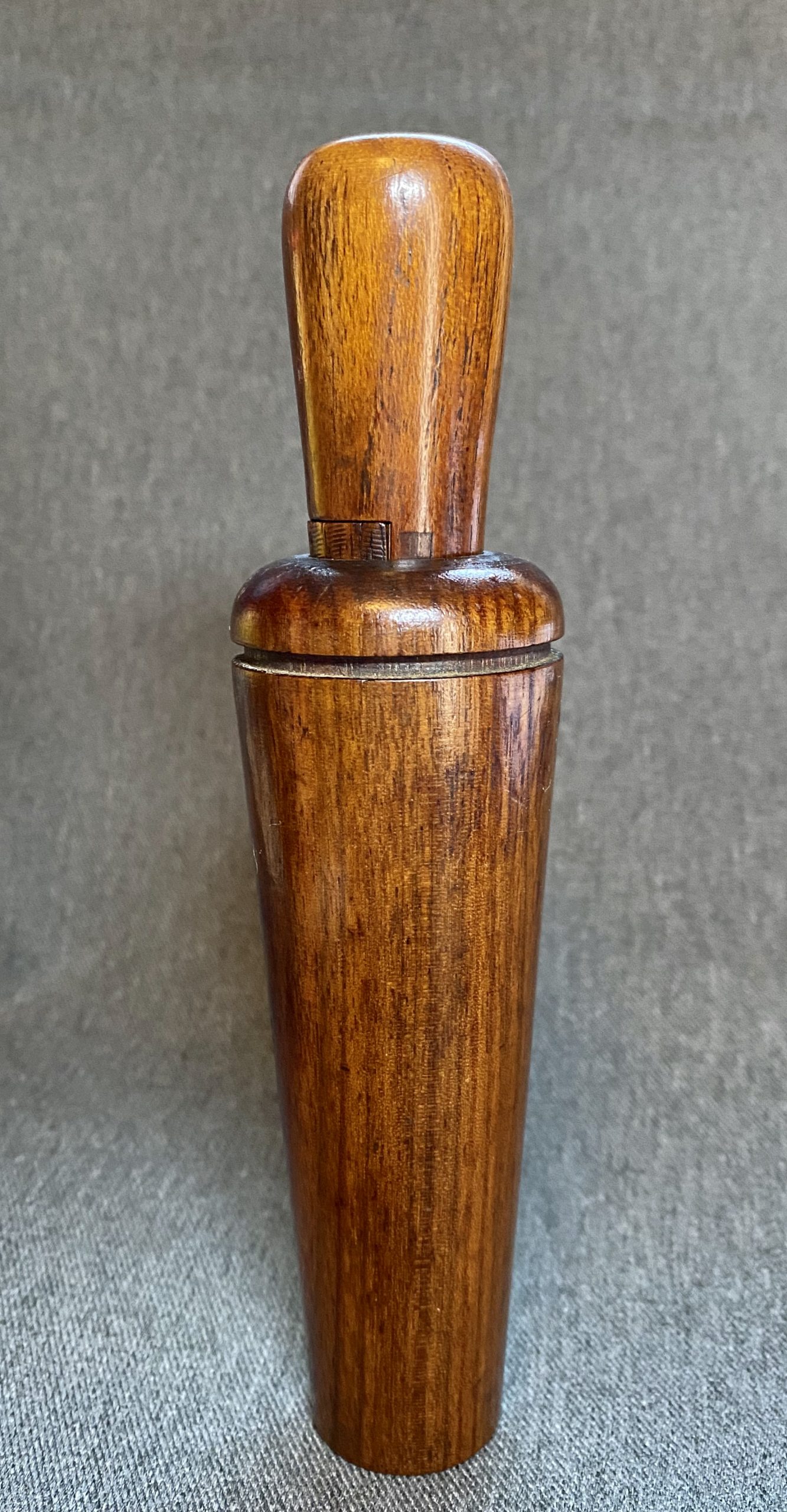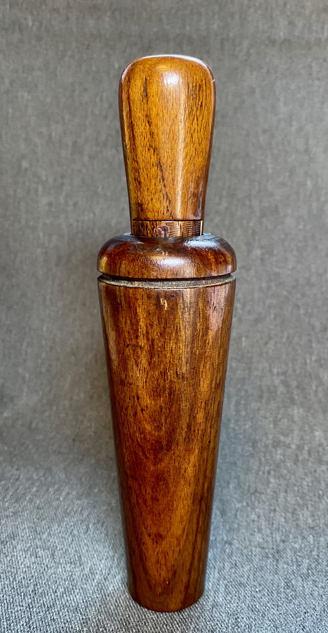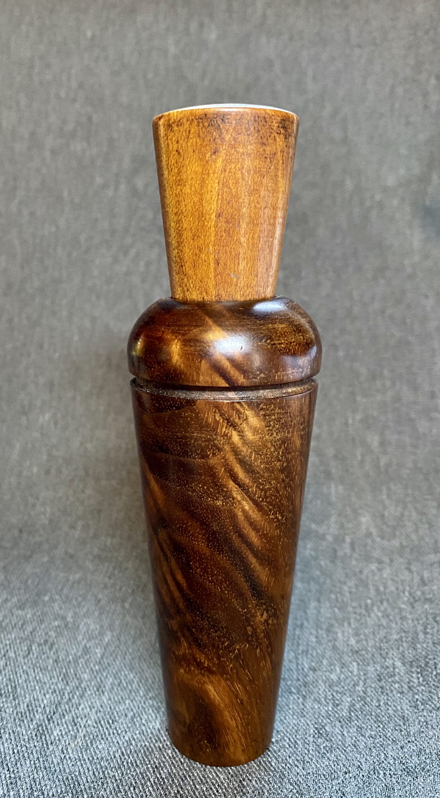 This is a beautiful burled walnut and maple call from E Stofer. The call is Reelfoot style with a maple and walnut stopper and a copper reed.
