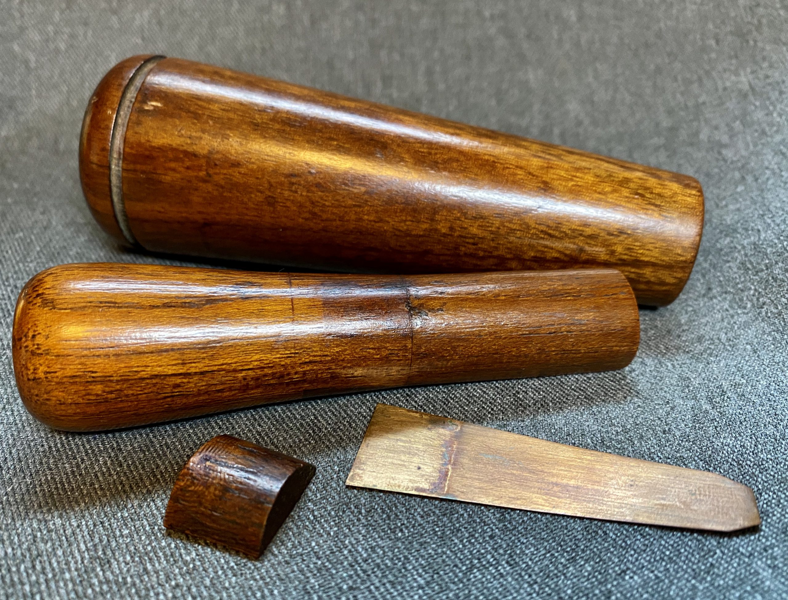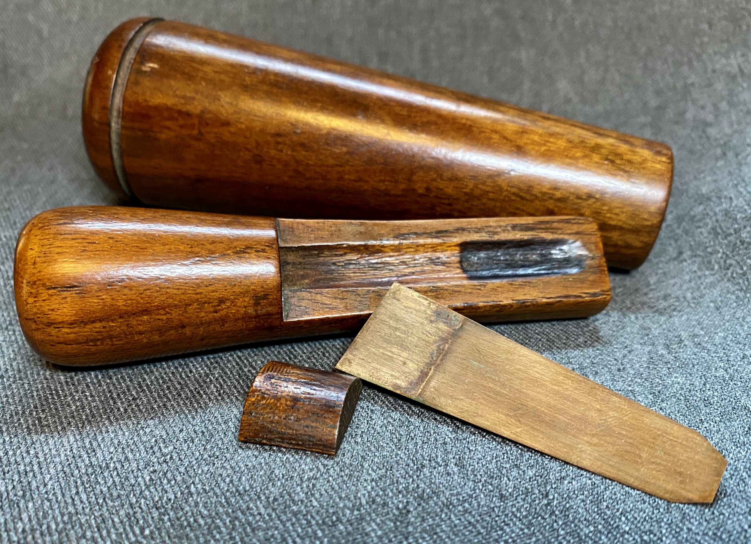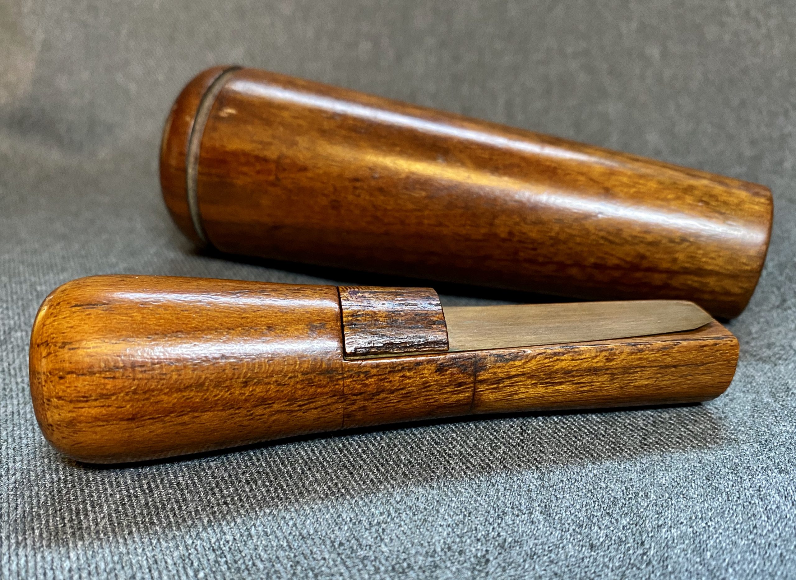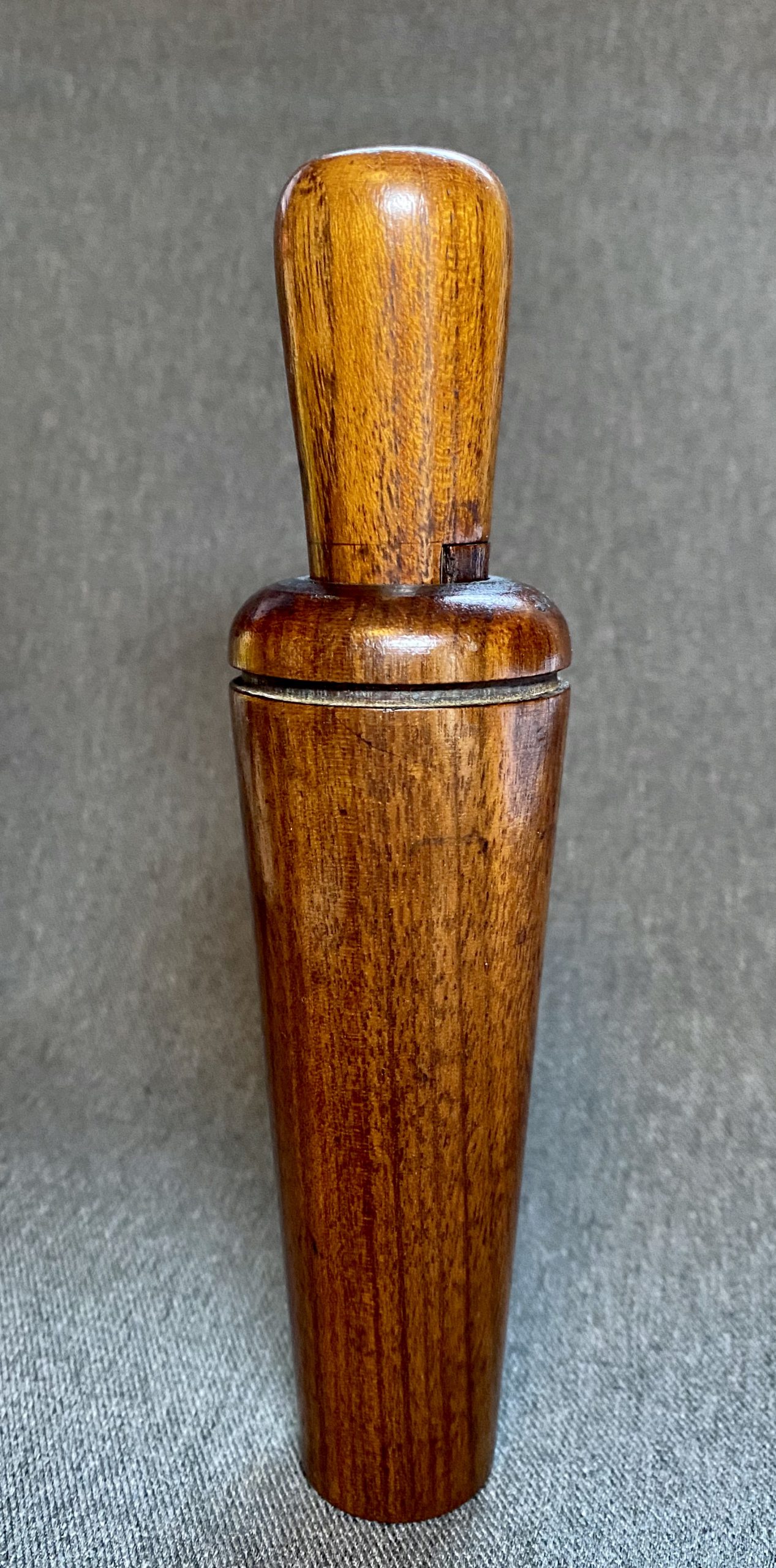 This is a beautiful burled walnut and maple call from E Stofer. The call is Reelfoot style with a maple and walnut stopper and a copper reed.
