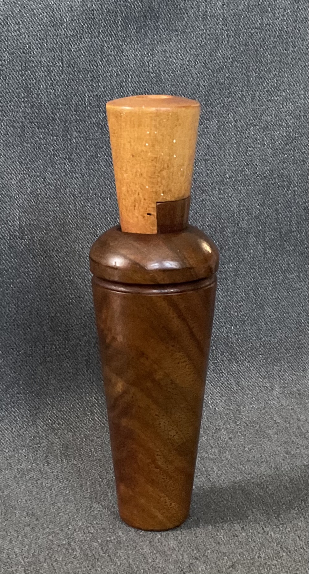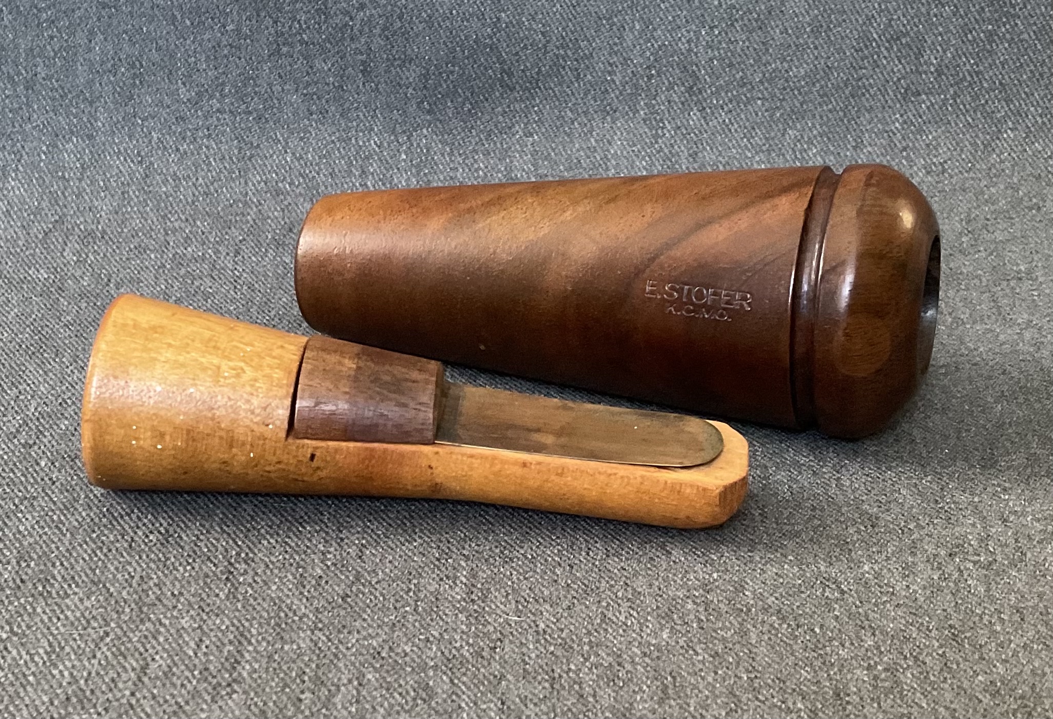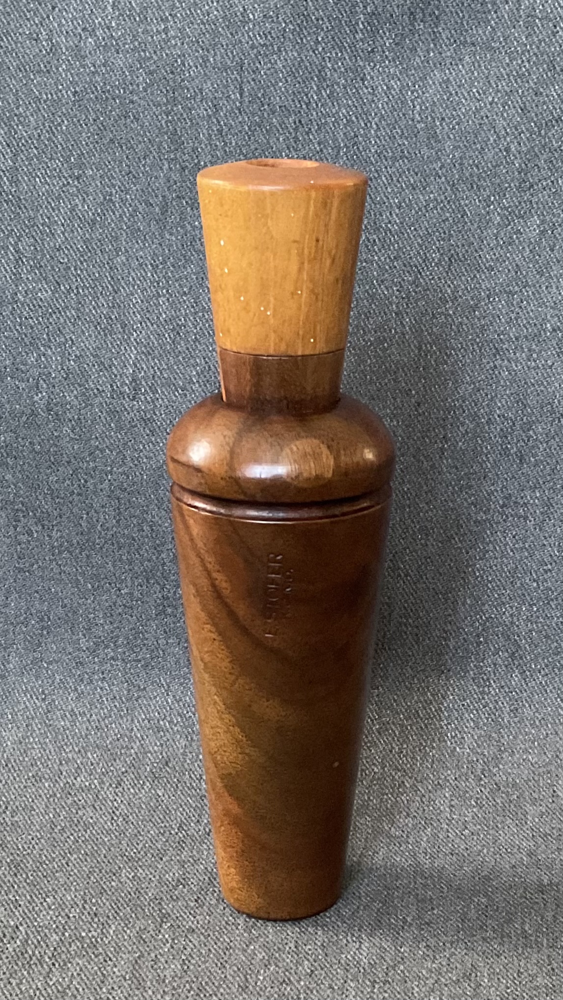 This is a beautiful rare walnut burl barrel call from E. Stofer. The call is Reelfoot style with a walnut burl barrel and maple stopper with a walnut wedge block.