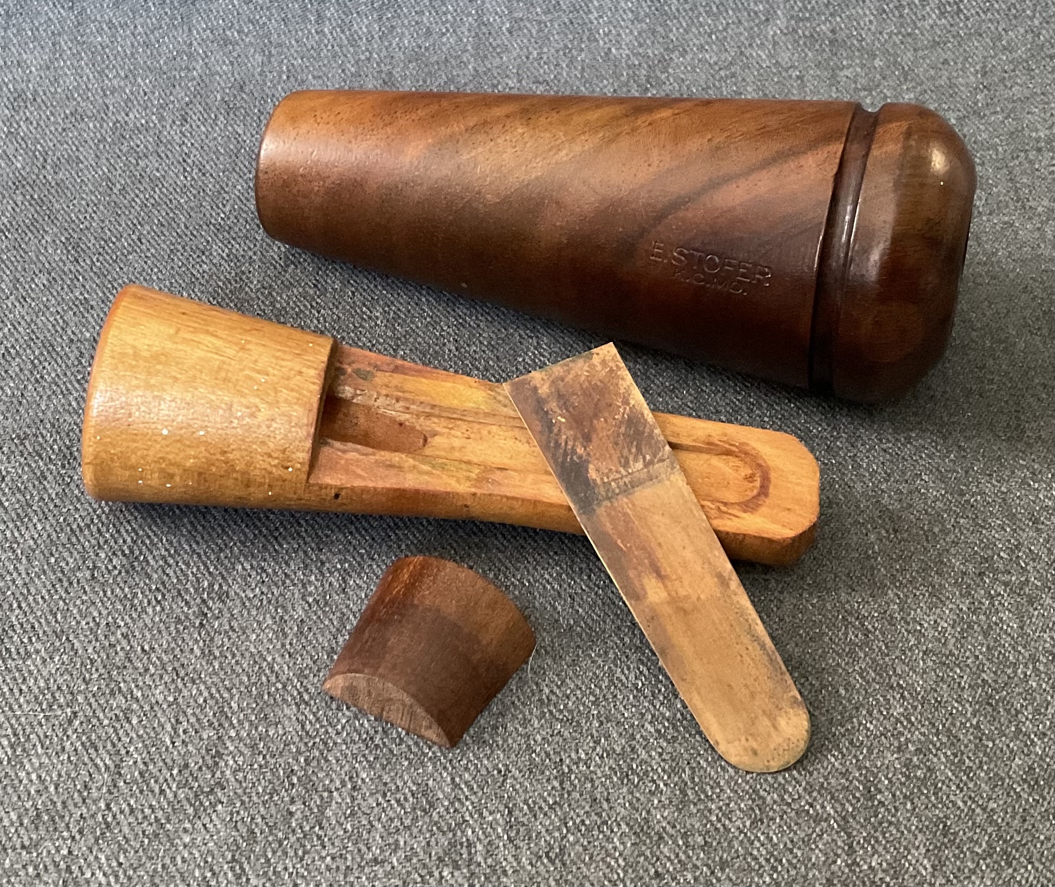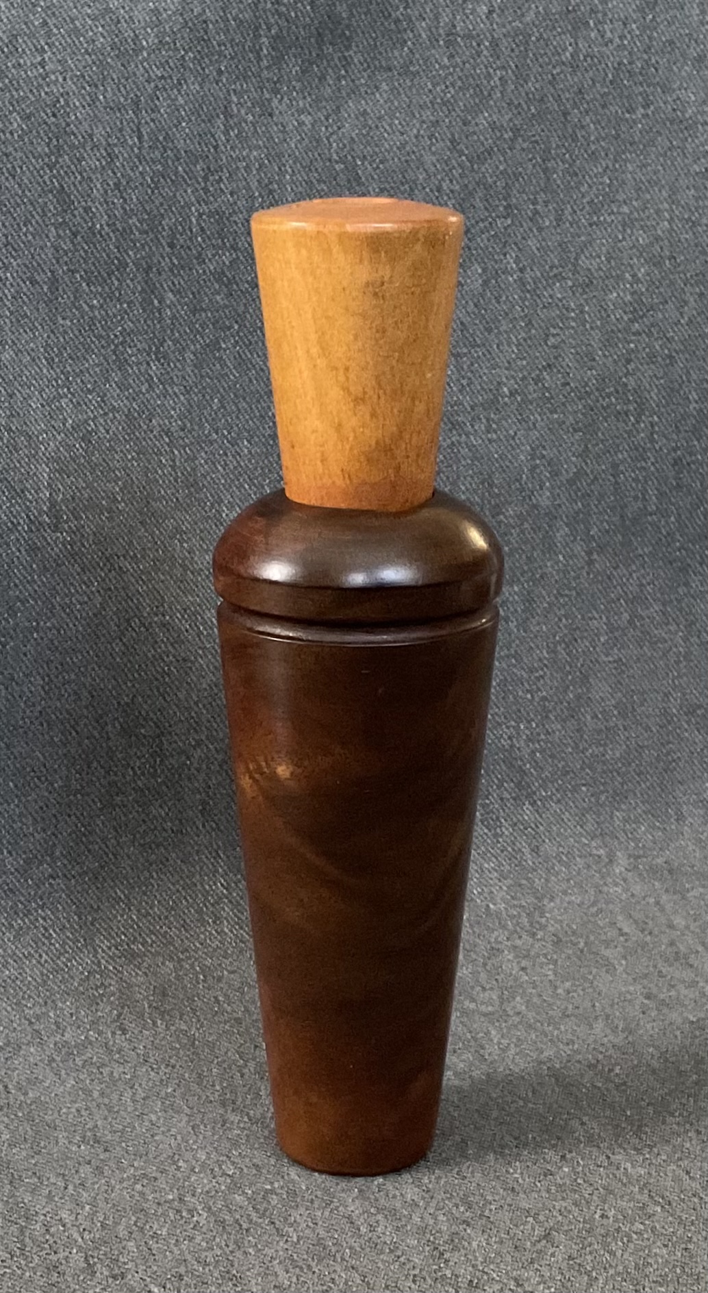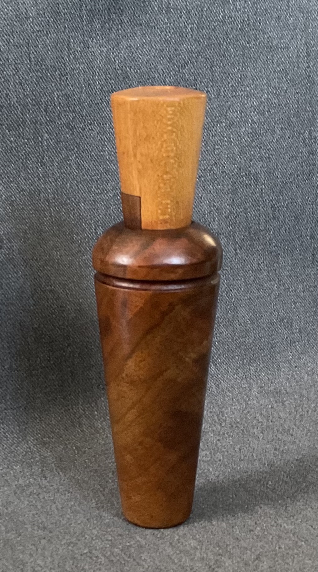 This is a beautiful rare walnut burl barrel call from E. Stofer. The call is Reelfoot style with a walnut burl barrel and maple stopper with a walnut wedge block.
