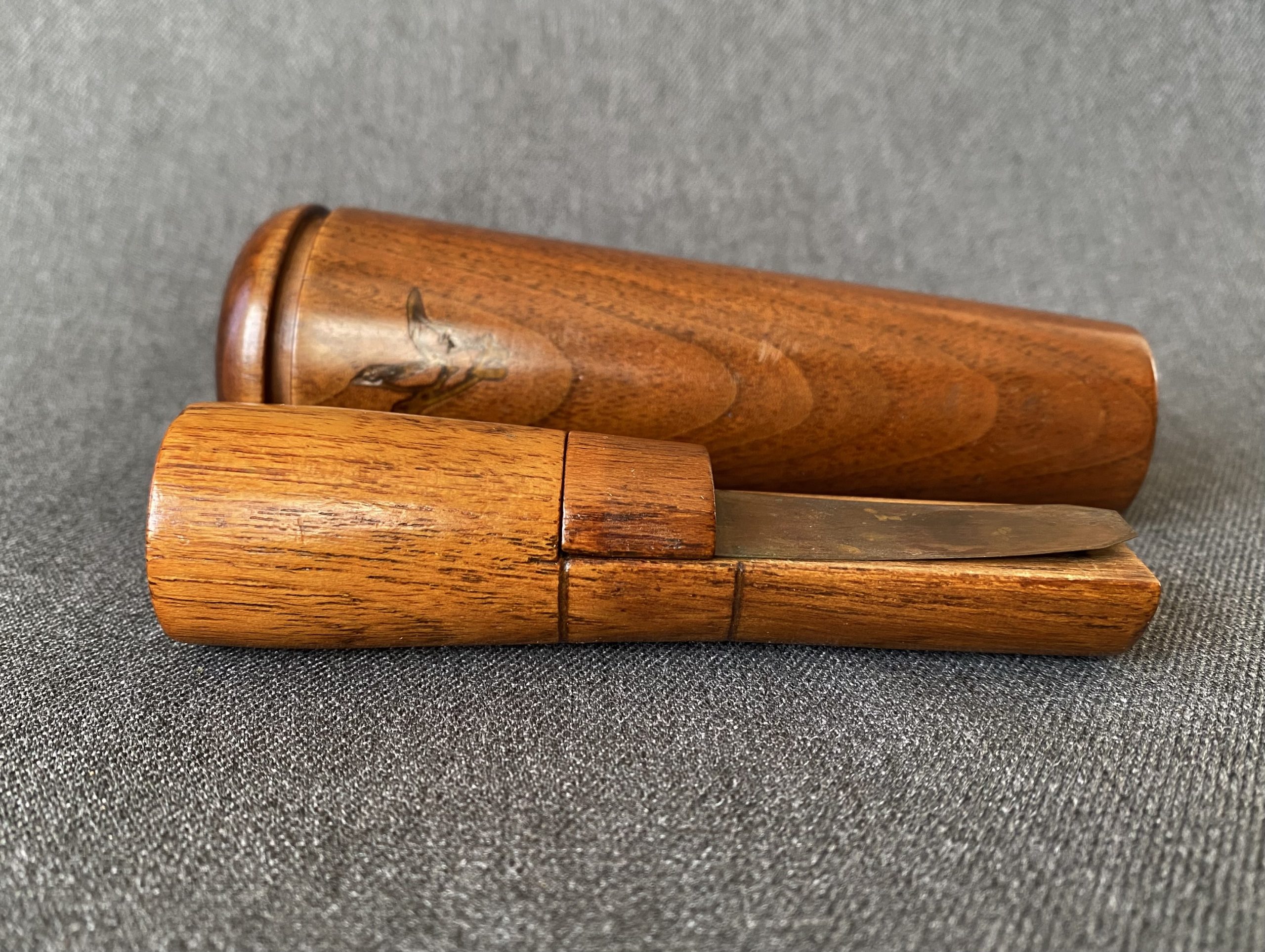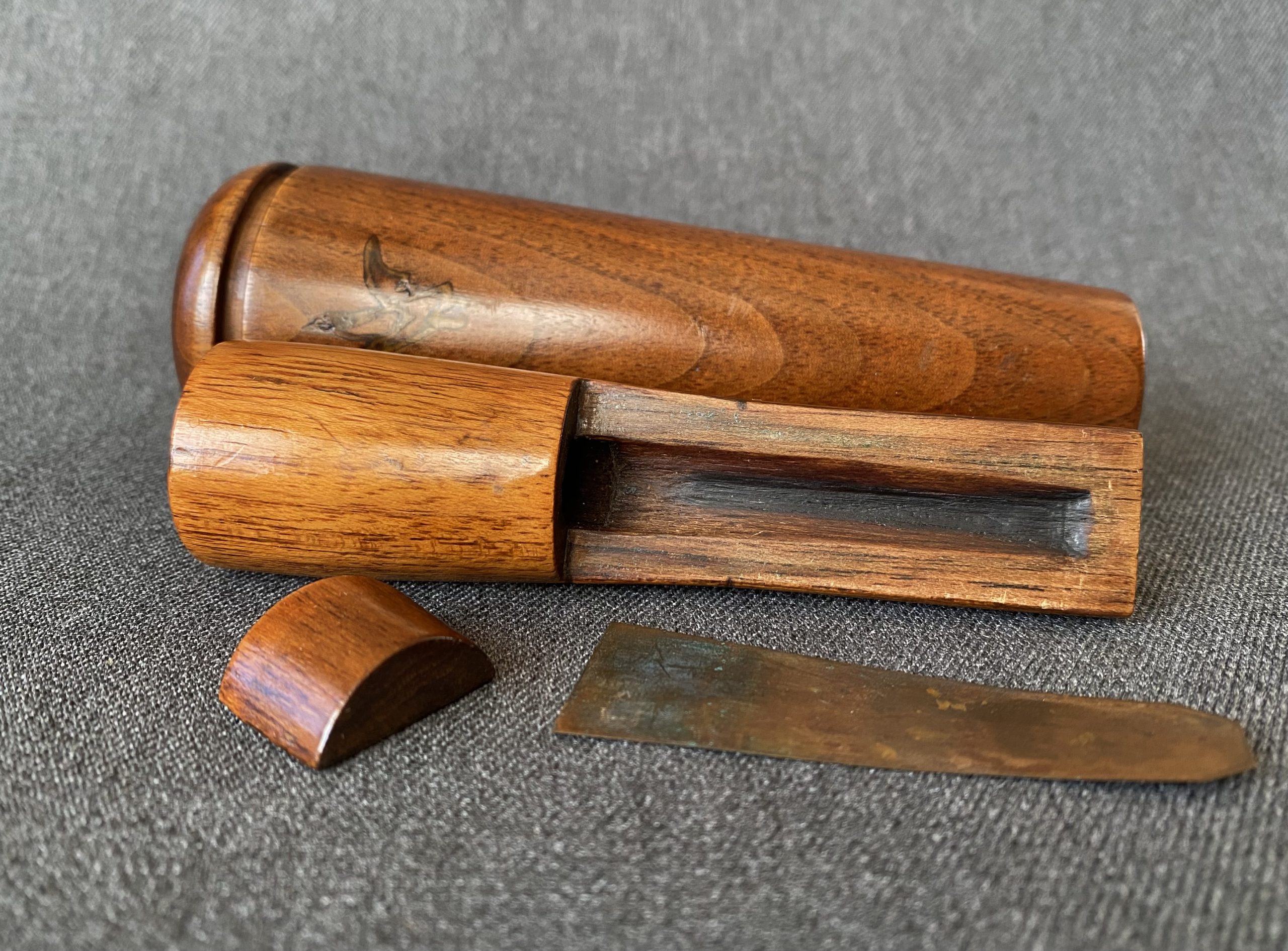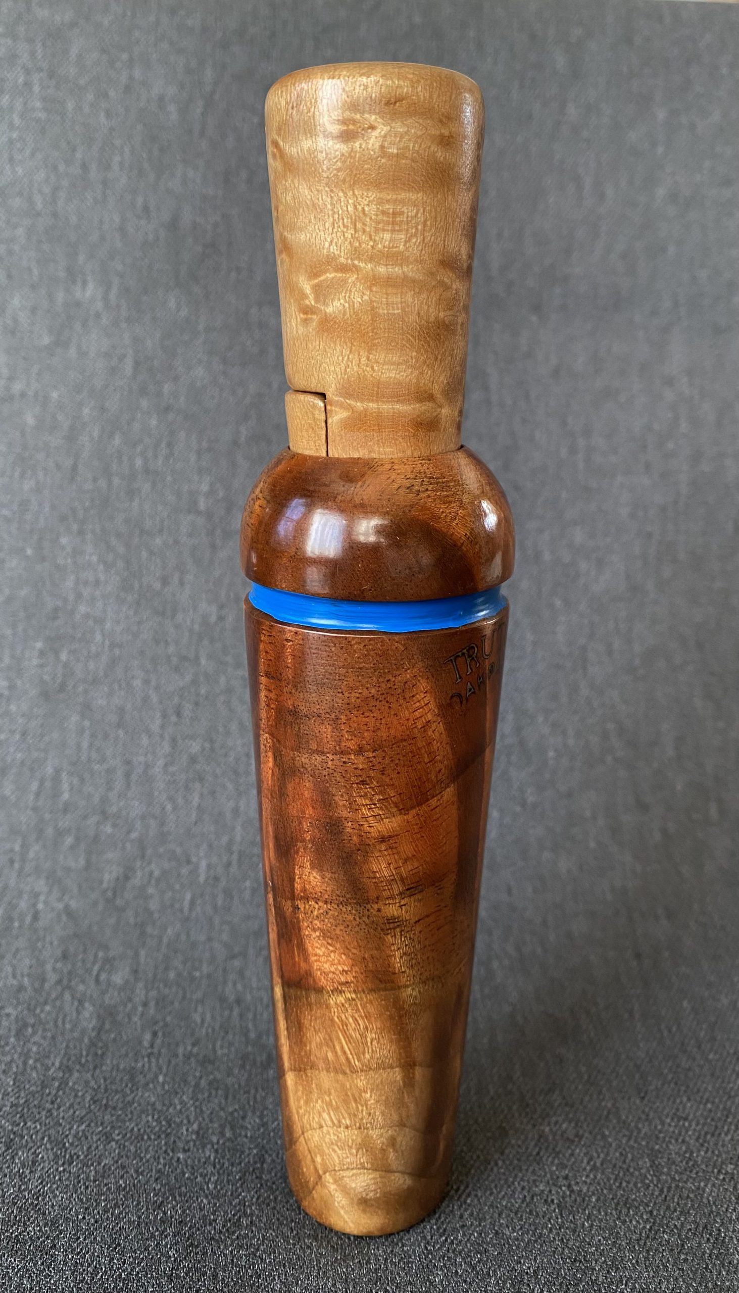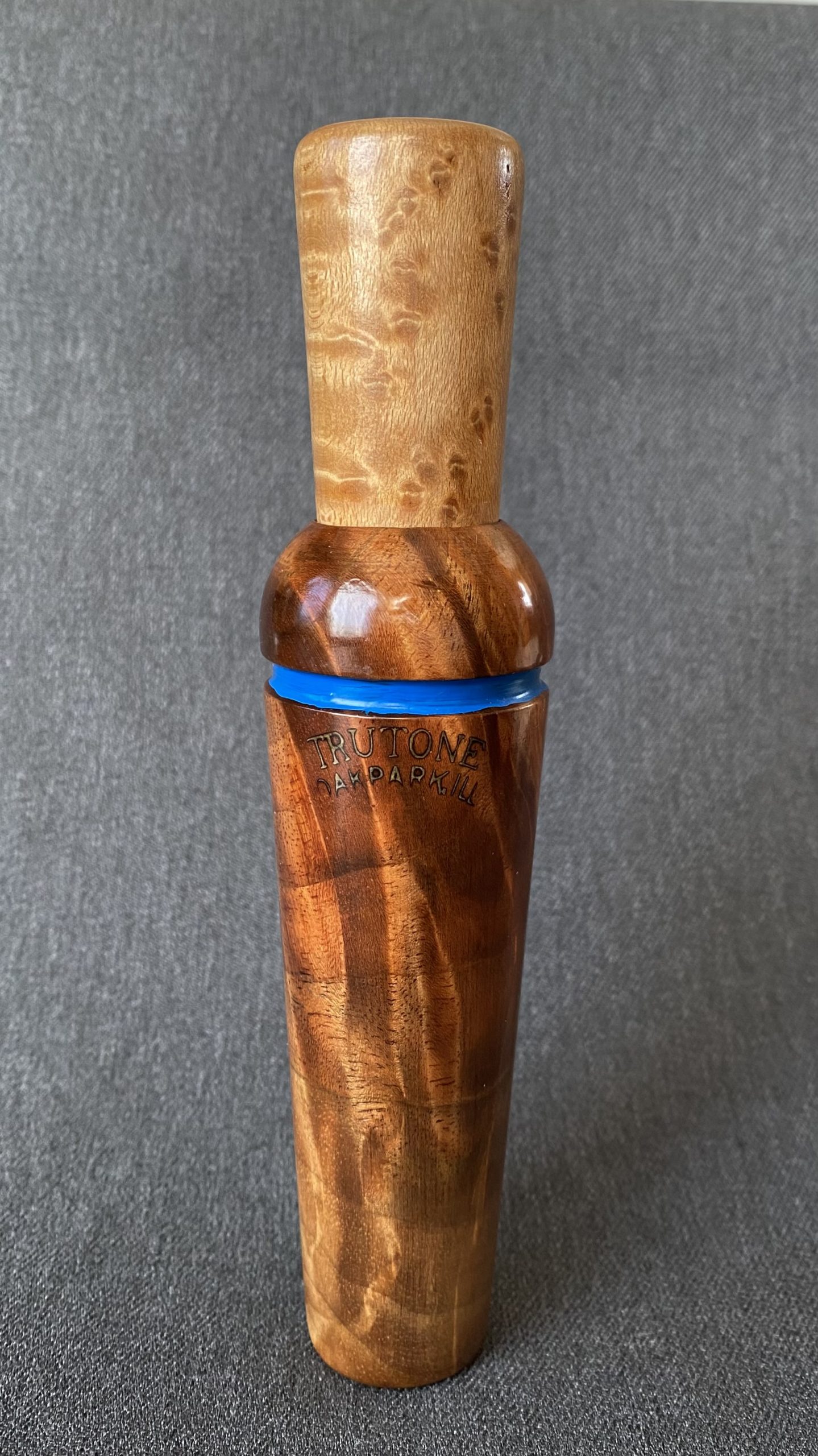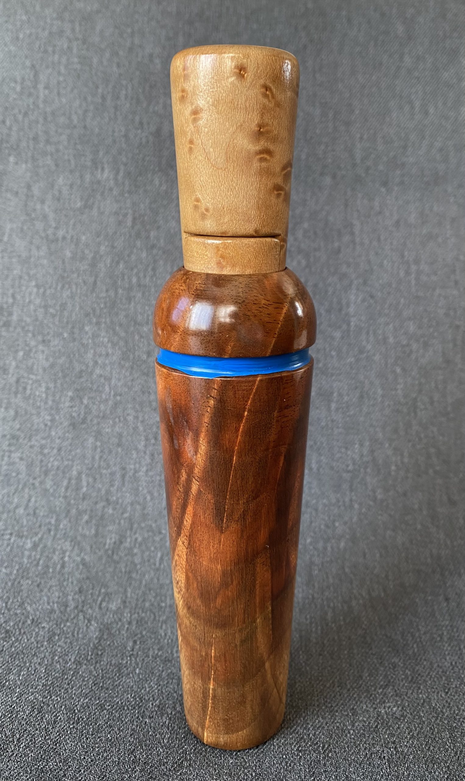 A very nice blue band call from Trutone. The call has a beautiful burled walnut barrel and birdseye maple stopper. It’s Reelfoot style with a copper reed.