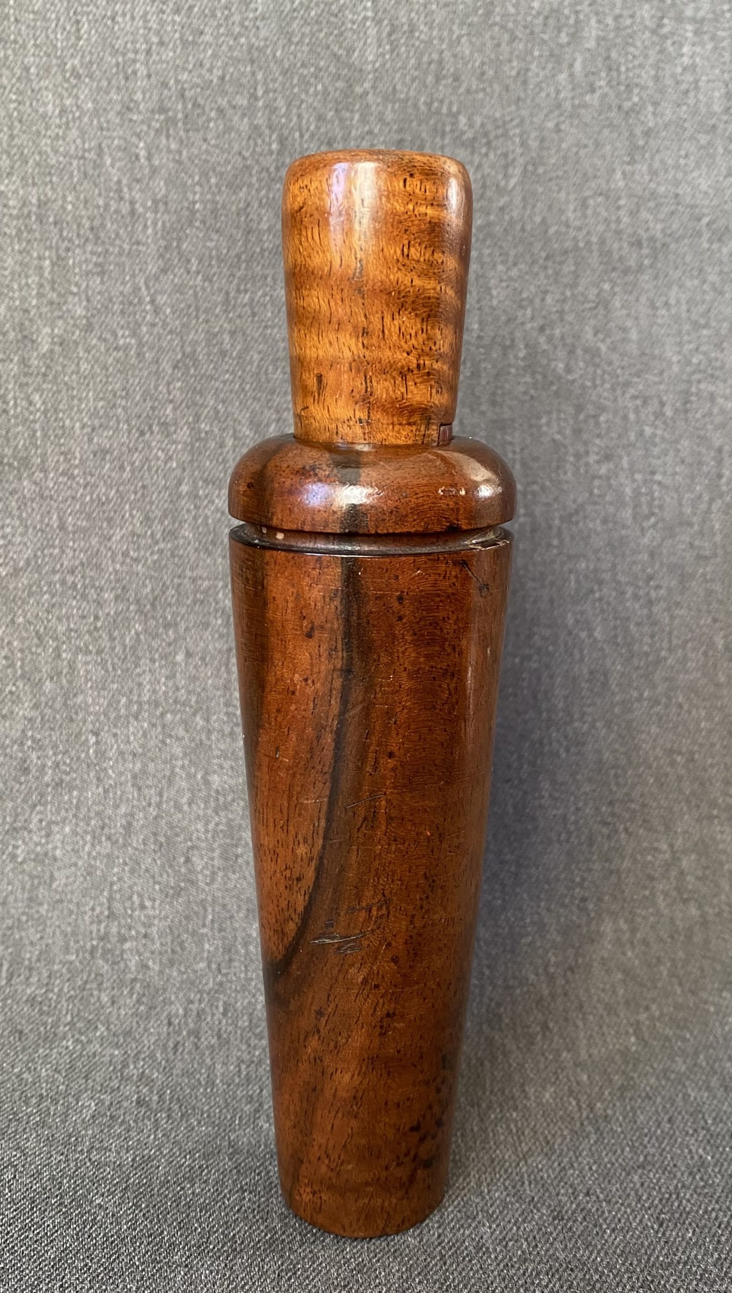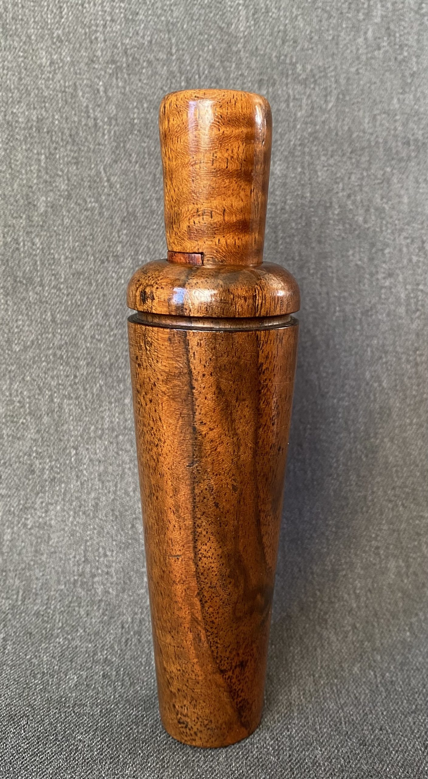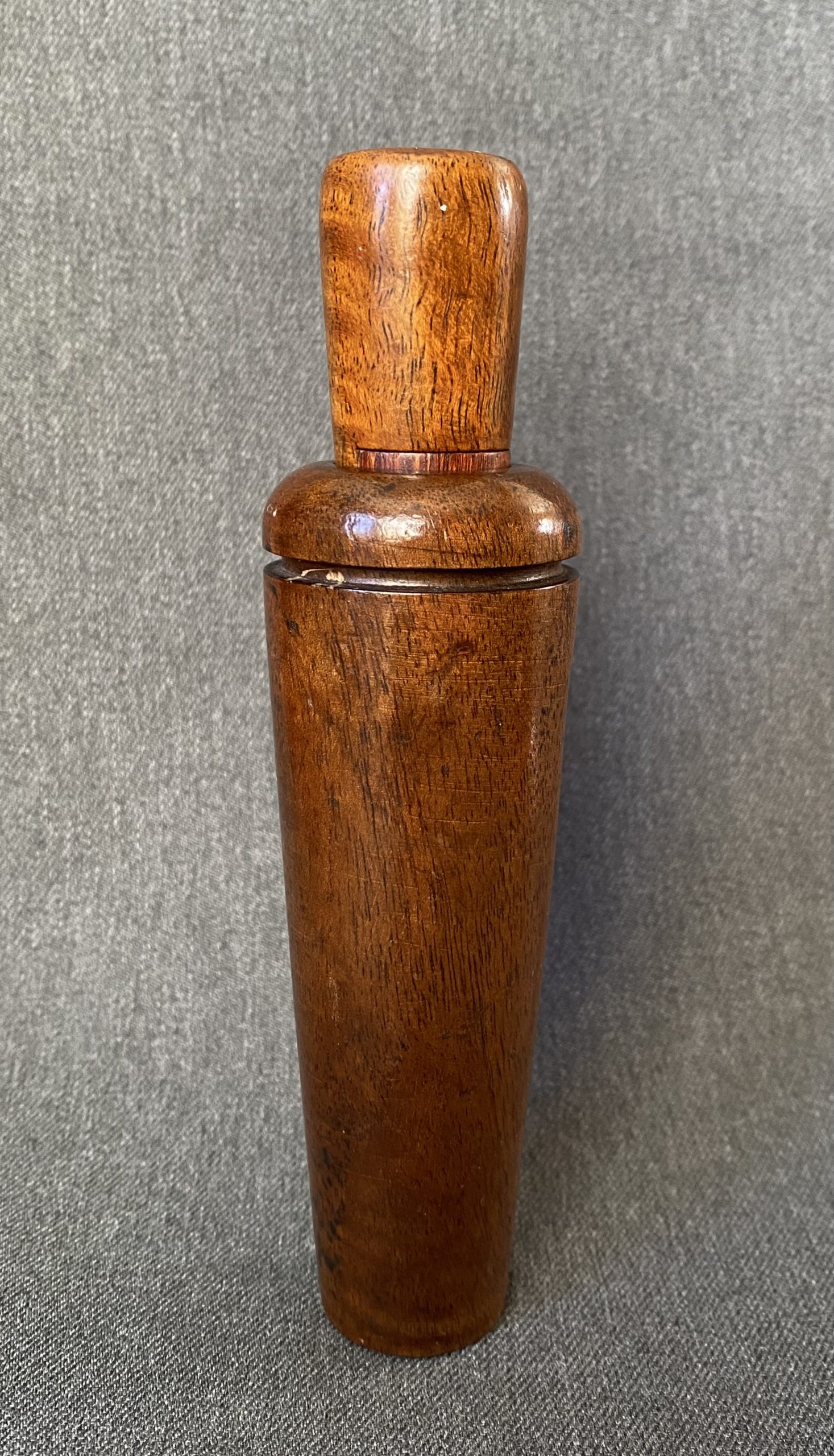 A nice old step drilled call from Tom Turpin. The call is Reelfoot style with a copper reed. The stopper is made from Tiger Walnut.