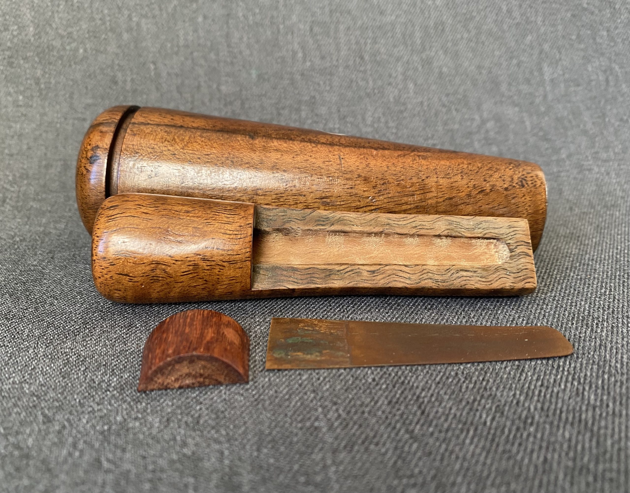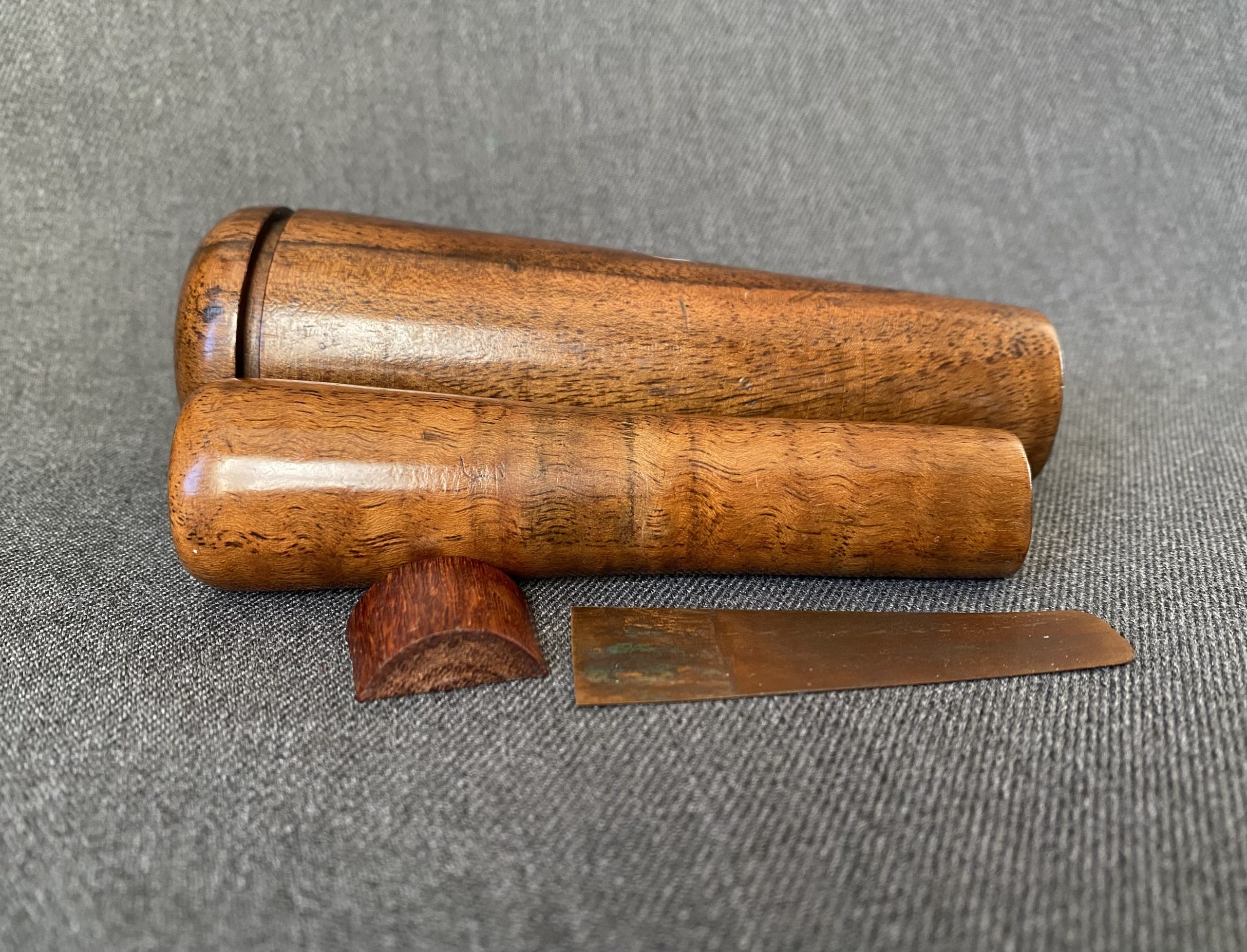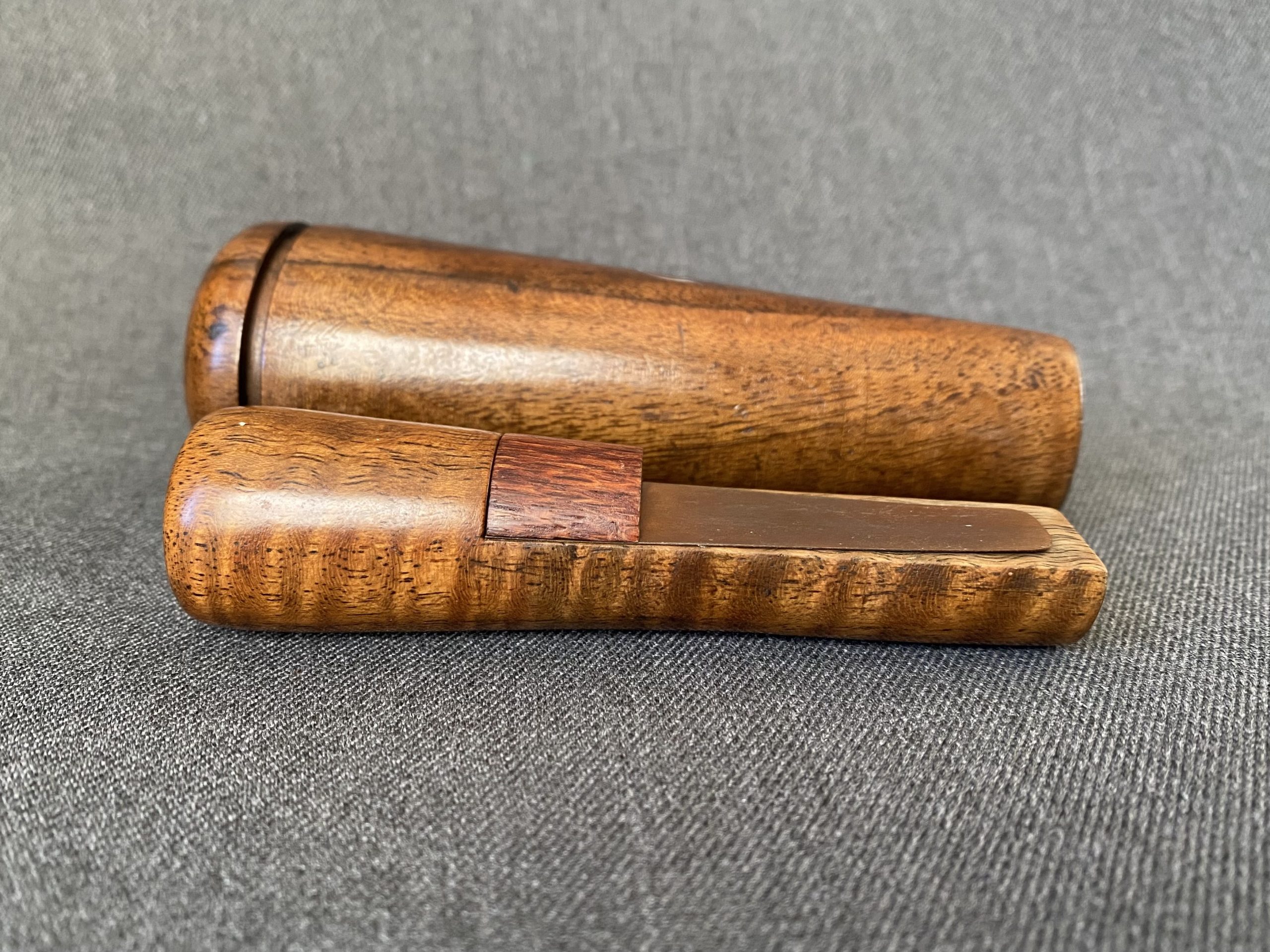 A nice old step drilled call from Tom Turpin. The call is Reelfoot style with a copper reed. The stopper is made from Tiger Walnut.