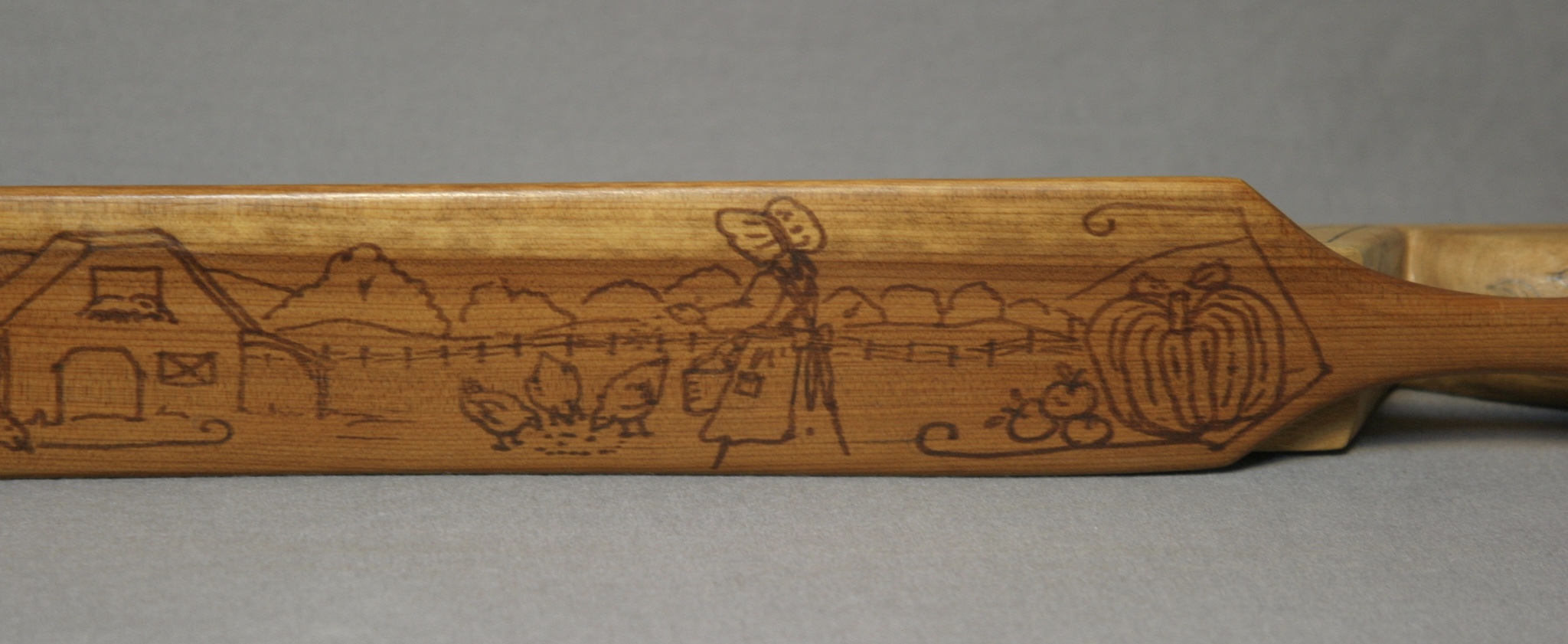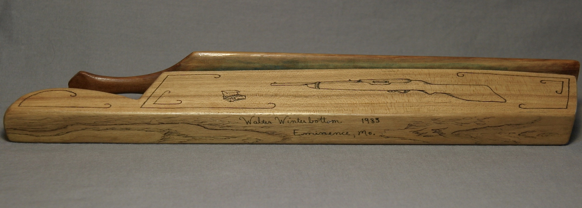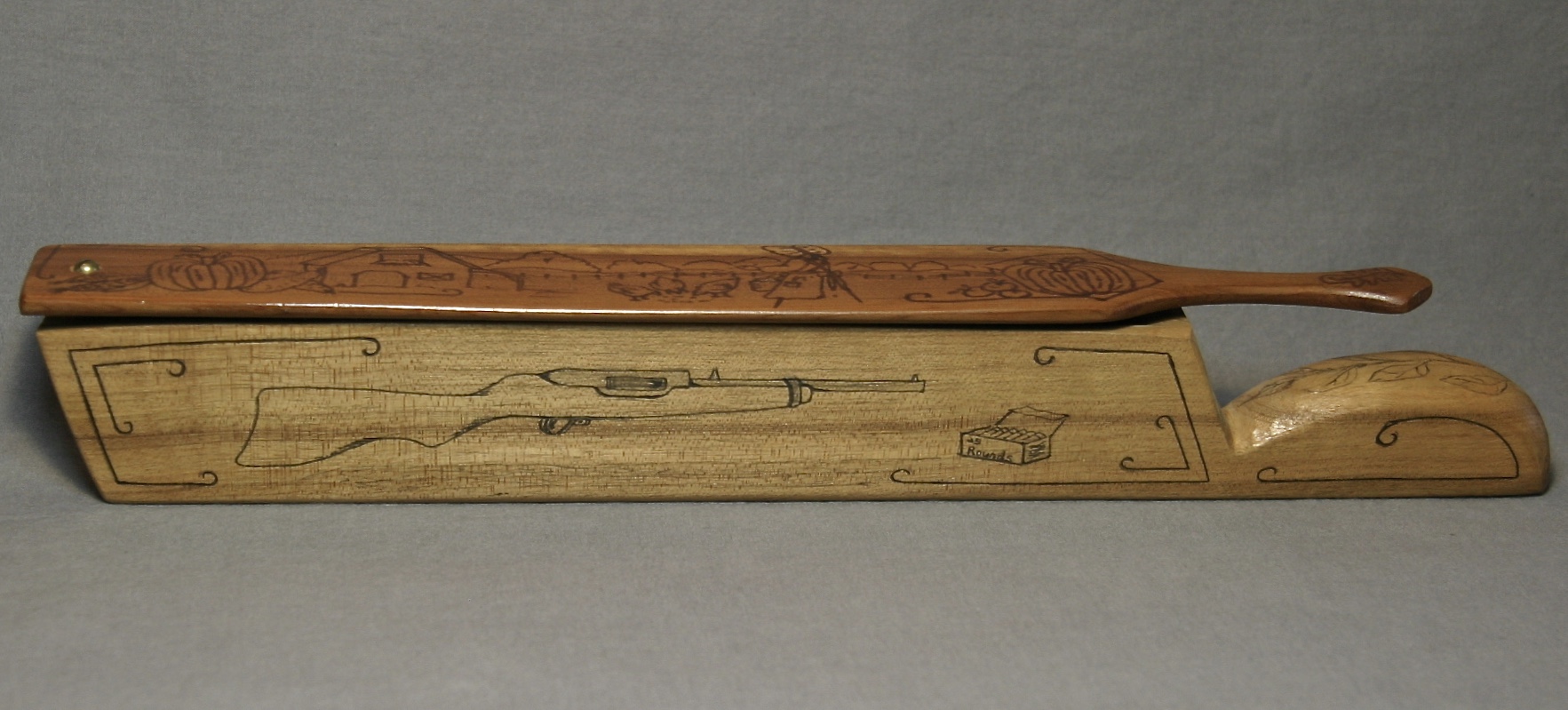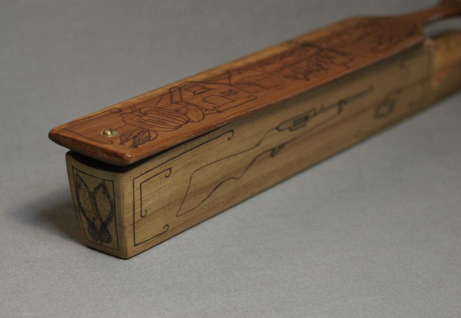 This is great, long fence post box call from Walter Winterbottom. There are drawings on all sides of the call, with the exception of the bottom which is signed by Winterbottom. The paddle features a woman in a bonnet throwing corn to chickens in the yard. Pumkins, corn, tomatoes, and gourds decorate each end of the top of the paddle. Each side of the box has a shot gun and box of shells. The ends and handle, seeds and leaves.