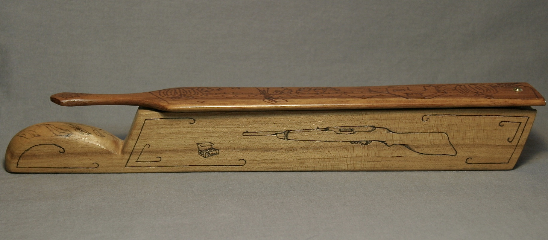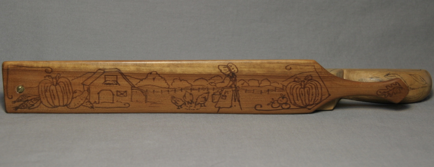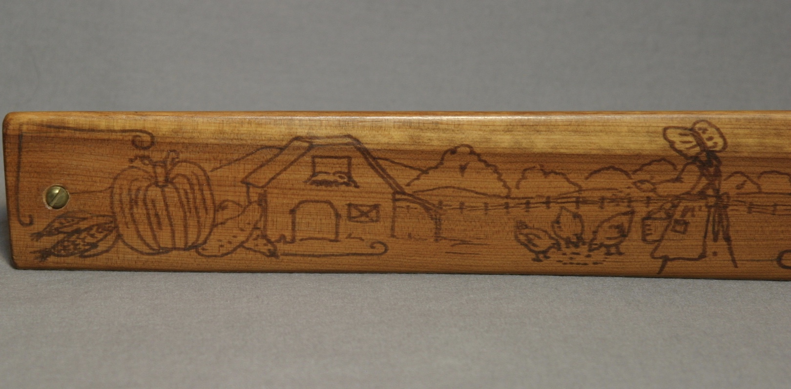 This is great, long fence post box call from Walter Winterbottom. There are drawings on all sides of the call, with the exception of the bottom which is signed by Winterbottom. The paddle features a woman in a bonnet throwing corn to chickens in the yard. Pumkins, corn, tomatoes, and gourds decorate each end of the top of the paddle. Each side of the box has a shot gun and box of shells. The ends and handle, seeds and leaves.