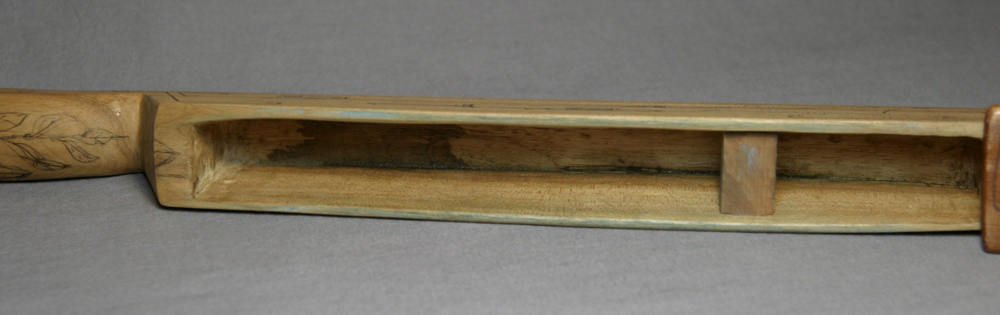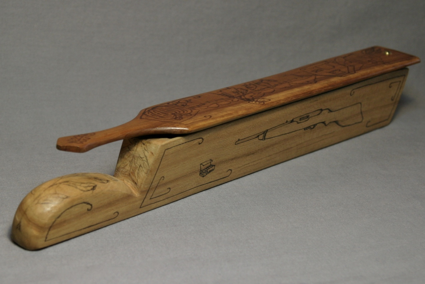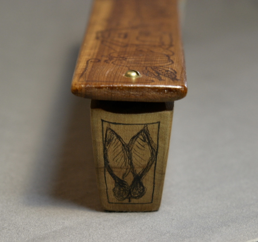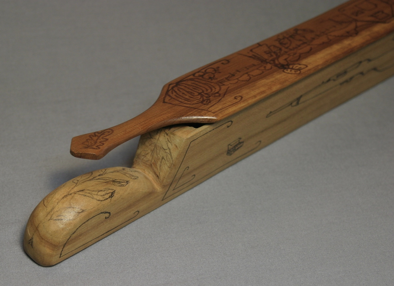 This is great, long fence post box call from Walter Winterbottom. There are drawings on all sides of the call, with the exception of the bottom which is signed by Winterbottom. The paddle features a woman in a bonnet throwing corn to chickens in the yard. Pumkins, corn, tomatoes, and gourds decorate each end of the top of the paddle. Each side of the box has a shot gun and box of shells. The ends and handle, seeds and leaves.